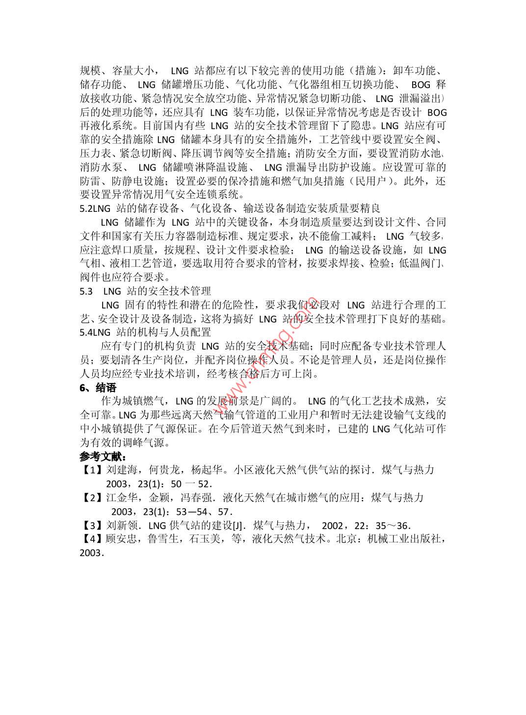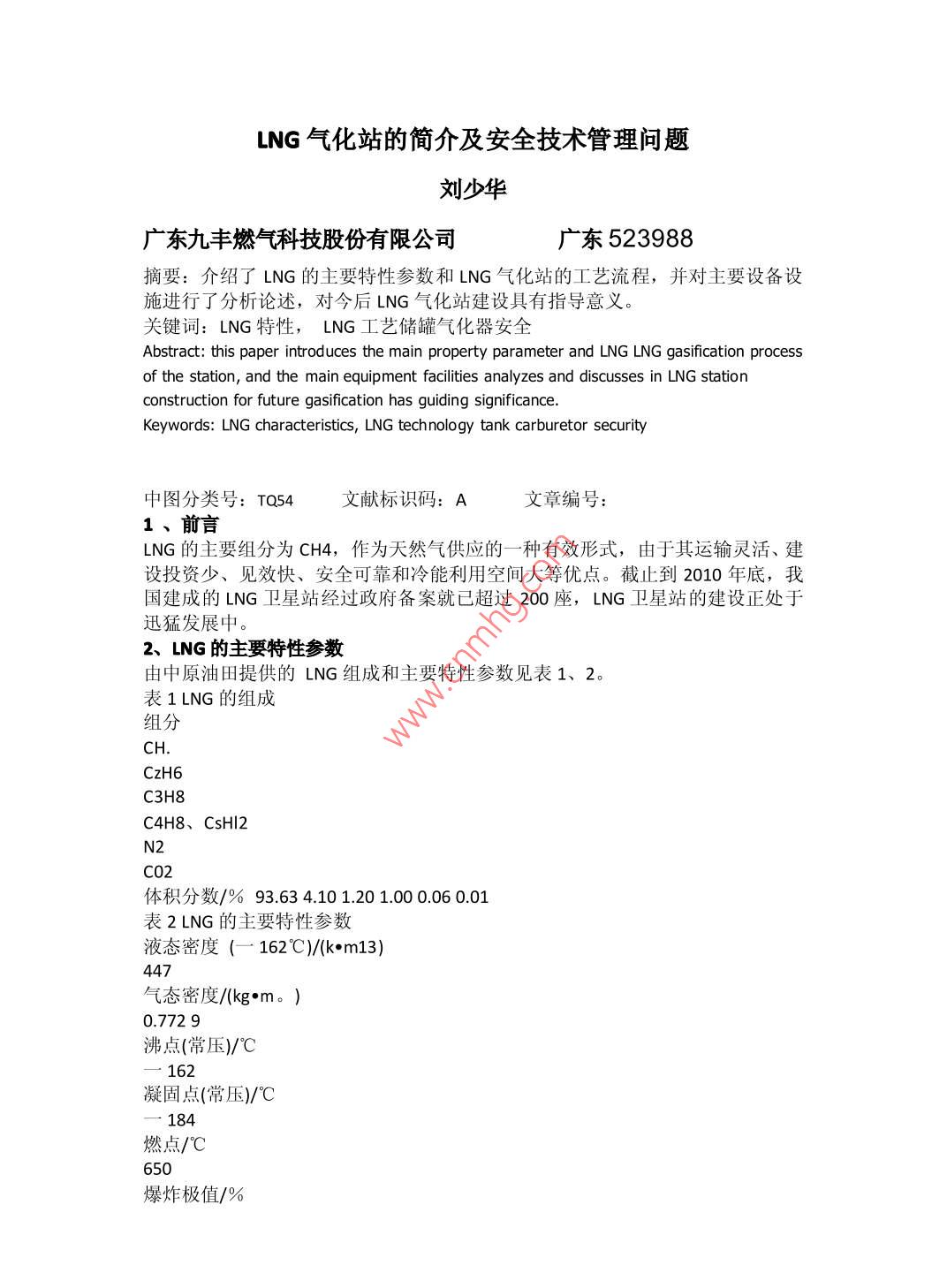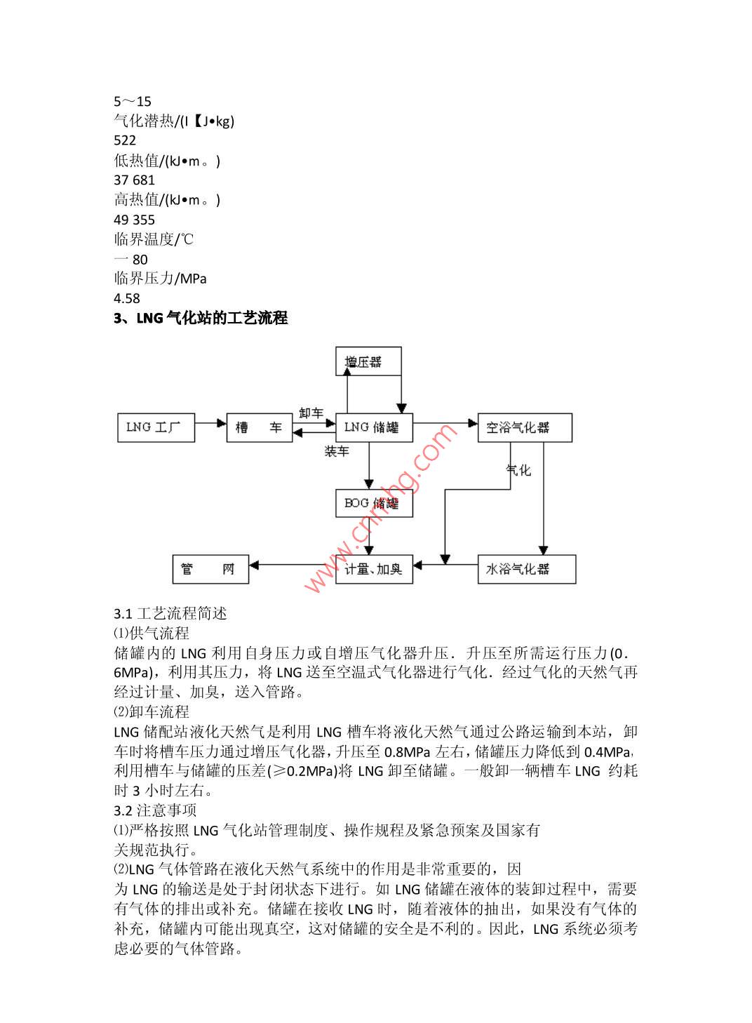 LNG氣化站的簡介及安全技術(shù)管理問題劉少華廣東九豐燃?xì)饪萍脊煞萦邢薰緩V東523988摘要:介紹了LNG的主要特性參數(shù)和LNG氣化站的工藝流程,并對主要設(shè)備設(shè)施進(jìn)行了分析論述,對今后LNG氣化站建設(shè)具有指導(dǎo)意義。關(guān)鍵詞: LNG 特性,LNG 工藝儲罐氣化器安全Abstract: this paper introduces the main property parameter and LNG LNG gasification processof the station, and the main equipment facilities analyzes and discusses in LNG stationconstruction for future gasification has guiding significance.Keywords: LNG characteristics, LNG technology tank carburetor security中圖分類號: TQ54文獻(xiàn)標(biāo)識碼: A文章編號:1、前言LNG的主要組分為CH4,作為天然氣供應(yīng)的一-種有效形式,由于其運輸靈活、建設(shè)投資少、見效快、安全可靠和冷能利用空間大等優(yōu)點。截止到2010年底,我國建成的LNG衛(wèi)星站經(jīng)過政府備案就已超過200座,LNG衛(wèi)星站的建設(shè)正處于迅猛發(fā)展中。2、LNG的主要特性參數(shù)由中原油田提供的LNG組成和主要特性參數(shù)見表1、2。表1LNG的組成組分CH.CzH6C3H8C4H8、CsHI2N2C02體積分?jǐn)?shù)/% 93.63 4.10 1.20 1.00 0.06 0.01表2LNG的主要特性參數(shù)液態(tài)密度(一162C)/(kom13)447氣態(tài)密度/(kg.m。)0.772 9沸點(常壓)/°C一162凝固點(常壓)/°C .燃點/C650爆炸極值/%5~ 15氣化潛熱/( [ J●kg)522低熱值/(kJom。)37 681高熱值/(kJ●m。)49 355臨界溫度/°C一80臨界壓力/MPa4.583、LNG氣化站的工藝流程增壓器.L卸車、LNG工廠H槽車4二LNG儲罐空浴氣化器裝車氣化BOG儲罐管網(wǎng)水浴氣化器3.1工藝流程簡述(1)供氣流程儲罐內(nèi)的LNG利用自身壓力或自增壓氣化器升壓.升壓至所需運行壓力(0.6MPa),利用其壓力,將LNG送至空溫式氣化器進(jìn)行氣化.經(jīng)過氣化的天然氣再經(jīng)過計量、加臭,送入管路。(2)卸車流程LNG儲配站液化天然氣是利用LNG槽車將液化天然氣通過公路運輸?shù)奖菊荆盾嚂r將槽車壓力通過增壓氣化器,升壓至0.8MPa左右,儲罐壓力降低到0.4MPa,利用槽車與儲罐的壓差(≥0.2MPa)將LNG卸至儲罐。一般卸一 輛槽車LNG約耗時3小時左右。3.2注意事項.(1)嚴(yán)格按照LNG氣化站管理制度、操作規(guī)程及緊急預(yù)案及國家有關(guān)規(guī)范執(zhí)行。(2)LNG氣體管路在液化天然氣系統(tǒng)中的作用是非常重要的,因為LNG的輸送是處于封閉狀態(tài)下進(jìn)行。如LNG儲罐在液體的裝卸過程中,需要有氣體的排出或補充。儲罐在接收LNG時,隨著液體的抽出,如果沒有氣體的補充,儲罐內(nèi)可能出現(xiàn)真空,這對儲罐的安全是不利的。因此,LNG系統(tǒng)必須考慮必要的氣體管路。(3)LNG管道要進(jìn)入運行(包括檢修后),必須要先做好冷卻過程,也就是常說的預(yù)冷過程。為了避免管路結(jié)構(gòu)損壞,預(yù)冷過程非常重要。如果LNG突然流入常溫管道,管道會迅速地收縮。管路的底部與沸騰的LNG直接接觸,而頂部相對較熱,因頂部的溫度相對較高,這種結(jié)果便是所謂的香蕉效應(yīng)。由于伸縮不一-致,可能引起管路、支撐和膨脹節(jié)的損壞。因此冷卻必須慢慢地進(jìn)行,首先用冷的蒸汽在管路中循環(huán),有時還需要用干燥氮氣吹掃管路,去除管路中殘留的水蒸氣,使管路達(dá)到一定溫度。-一般是在一95°C-- 118°C范圍內(nèi)方可輸送LNG。4、LNG 氣化站的主要設(shè)備LNG氣化站的主要設(shè)備有儲罐、氣化器和增壓器等。4.1儲罐儲罐容積根據(jù)用氣量、儲存天數(shù)、運輸距離和運輸工具等因素確定。儲罐主要分金屬儲罐和鋼筋}昆凝土儲罐2類。目前我國現(xiàn)有LNG氣化站常用的儲罐為立式LNG儲罐,儲罐的隔熱方式有真空粉末隔熱、正壓堆積隔熱和高真空多層隔熱3種類型。現(xiàn)在國內(nèi)大多采用50 m。和100m。的圓簡型雙金屬真空粉末隔熱型儲罐八,LNG日蒸發(fā)率一般小于等于總儲量的0.3%。儲罐內(nèi)簡及管道的材質(zhì)0Crl8Ni9奧氏體不銹鋼,外筒選用優(yōu)質(zhì)碳素鋼16MnR壓力容器用鋼板,內(nèi)簡內(nèi)直徑為3000mm,外筒內(nèi)直徑為3450mm,夾層填充珠光砂并抽真空。100 m。儲罐技術(shù)特性參數(shù)見表3。表3-1儲罐技術(shù)特性參數(shù)4.2LNG氣化器LNG的氣化應(yīng)滿足當(dāng)?shù)氐臍夂驐l件及工藝要求,可選用的氣化器有加熱式氣化器和環(huán)境式氣化器。加熱式氣化器的氣化熱源為蒸汽或熱水等。現(xiàn)通常采用的加熱式氣化器是水浴式氣化器。環(huán)境式氣化器采用自然環(huán)境的熱源,如大氣、海水或地?zé)崴,F(xiàn)通常采用的環(huán)境式氣化器是空溫式氣化器。冬季環(huán)境溫度較低時,即當(dāng)空溫式氣化器出口天然氣溫度低于5"C時,則需要在空溫式氣化器后串聯(lián)加熱式氣化器加熱天然氣。空溫式氣化器和加熱式氣化器的選型,應(yīng)根據(jù)高峰小時用氣量和氣化器的氣化能力來確定。4.3增壓器當(dāng)儲罐內(nèi)的低溫液體向外排出時,儲罐內(nèi)的壓力會逐漸下降。為了保持儲罐內(nèi)的壓力穩(wěn)定,必須對儲罐進(jìn)行增壓。低溫容器的增壓系統(tǒng)主要有低溫泵增壓系統(tǒng)、外部氣源增壓系統(tǒng)和自增壓系統(tǒng)。低溫泵增壓系統(tǒng)是在排液口設(shè)置低溫泵,利用泵的機械功使低溫液體增壓,并向氣化器輸液。但低溫泵要求外部安裝條件比較嚴(yán)格,不適于小型供氣系統(tǒng)。外部氣源增壓系統(tǒng)