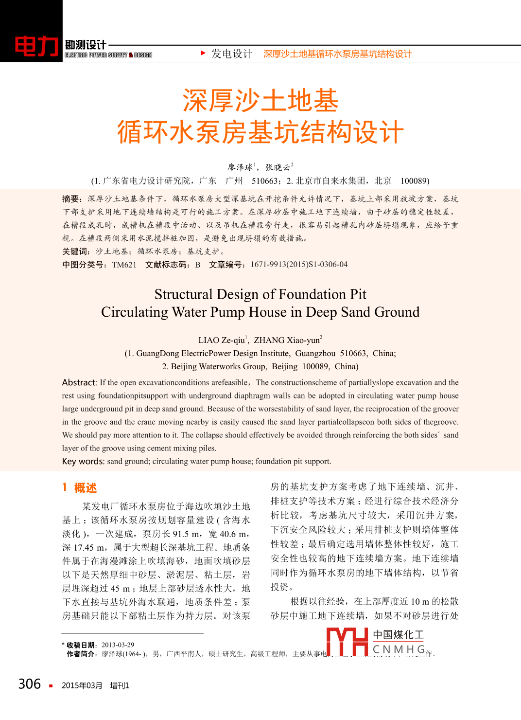 電力勘測設(shè)計BEUBTRB POOEB SURMEY 8 DESIHN>發(fā)電設(shè)計 深厚沙土地基循環(huán)水泵房基坑結(jié)構(gòu)設(shè)計深厚沙土地基循環(huán)水泵房基坑結(jié)構(gòu)設(shè)計廖澤球',張曉云”(1.廣東省電力設(shè)計研究院,廣東廣 州510663; 2. 北京市自來水集團(tuán),北京100089)摘要:深厚沙土地基條件下,循環(huán)水泵房大型深基坑在開挖條件允許情況下,基坑上部采用放坡方案,基坑下部支護(hù)采用地下連續(xù)墻結(jié)構(gòu)是可行的施工方案。在深厚砂層中施工地下連續(xù)墻,由于砂層的穩(wěn)定性較差,在槽段成孔時,成槽機(jī)在槽段中活動、以及吊機(jī)在槽段旁行走,很容易引起槽孔內(nèi)砂層坍塌現(xiàn)象,應(yīng)給予重視。在槽段兩側(cè)采用水泥攪拌樁加固,是避免出現(xiàn)坍塌的有效措施。關(guān)鍵詞:沙土地基;循環(huán)水泵房;基坑支護(hù)。中圖分類號: TM621文獻(xiàn)標(biāo)志碼: B文章編號: 1671-9913(2015)S1-0306-04Structural Design of Foundation PitCirculating Water Pump House in Deep Sand GroundLIAO Ze-qiu', ZHANG Xiao-yun2(1. GuangDong ElectricPower Design Institute, Guangzhou 510663, China;2. Beijing Waterworks Group, Beijing 100089, China)Abstract: If the open excavationconditions arefeasible, The constructionscheme of partiallyslope excavation and therest using foundationpitsupport with underground diaphragm walls can be adopted in circulating water pump houselarge underground pit in deep sand ground. Because of the worsestability of sand layer, the reciprocation of the grooverin the groove and the crane moving nearby is easily caused the sand layer parialollapseon both sides of thegroove.We should pay more attention to it. The collapse should effectively be avoided through reinforcing the both sides' sandlayer of the groove using cement mixing piles.Key words: sand ground; circulating water pump house; foundation pit support.1概述房的基坑支護(hù)方案考慮了地下連續(xù)墻、沉井、某發(fā)電廠循環(huán)水泵房位于海邊吹填沙土地排樁支護(hù)等技術(shù)方案;經(jīng)進(jìn)行綜合技術(shù)經(jīng)濟(jì)分基上;該循環(huán)水泵房按規(guī)劃容量建設(shè)(含海水析比較,考慮基坑尺寸較大,采用沉井方案,淡化),- -次建成,泵房長91.5m, 寬40.6 m,下沉安全風(fēng)險較大;采用排樁支護(hù)則墻體整體.深17.45m,屬于大型超長深基坑工程。地質(zhì)條性較差;最后確定選用墻體整體性較好,施工件屬于在海漫灘涂上吹填海砂,地面吹填砂層安全性也較高的地下連續(xù)墻方案。地下連續(xù)墻以下是天然厚細(xì)中砂層、淤泥層、粘土層,巖.同時作為循環(huán)水泵房的地下墻體結(jié)構(gòu),以節(jié)省層埋深超過45 m;地層上部砂層透水性大,地投資。下水直接與基坑外海水聯(lián)通,地質(zhì)條件差;泵根據(jù)以往經(jīng)驗,在上部厚度近10 m的松散房基礎(chǔ)只能以下部粘土層作為持力層。對該泵砂層中施工地下連續(xù)墻,如果不對砂層進(jìn)行處中國煤化工*收稿日期: 2013-03-29作者簡介:廖澤球(1964-), 男,廣西平南人,碩士研究生,高級工程師,主要從事電.MYHCNMH G作。306. 2015年03月 增刊1> 發(fā)電設(shè)計 深厚沙土地基循環(huán)水泵房基坑結(jié)構(gòu)設(shè)計勘測設(shè)計電力EEGOHOE POMER SUBMEY & DGS0F0理,在地下連續(xù)墻成槽時,容易造成塌孔現(xiàn)象;低壓縮性,平均厚度3.43 m。而且由于地表土層承載力較低,地下連續(xù)墻施淤泥⑤:屬高壓縮性、低強(qiáng)度、高靈敏工過程中,成槽機(jī)和鋼筋籠吊機(jī)的重力壓載作度地基土,平均厚度3.59 m。用,也會加重槽孔坍塌。塌孔問題不但影響施淤泥質(zhì)粘土⑤13:呈飽和、流塑狀態(tài),屬工安全,還會造成混凝土嚴(yán)重超灌;超灌的混高壓縮性、低強(qiáng)度地基土,平均厚度2.98 m。凝士在泵房地下墻體施工時需要鑿除,增加施粘土四:呈飽和、軟塑狀態(tài),屬高壓縮工麻煩。為了解決塌孔問題,經(jīng)深入分析研究,性土層,平均厚度3.30 m。決定采用在槽段兩側(cè)砂層范圍各施工一-排水泥粘土④μ2:呈飽和、可塑狀態(tài),強(qiáng)度較高、攪拌樁對槽段進(jìn)行護(hù)壁;同時根據(jù)成槽機(jī)和鋼中等壓縮性土層,平均厚度9.10 m。筋籠吊機(jī)的履帶行走位置,在履帶位置下也設(shè)從地質(zhì)資料可看出,地基上部有超過10 m置一排水泥攪拌樁,減少施工機(jī)械對砂層的附的細(xì)砂層,該砂層對地下連續(xù)墻的成槽施工是加壓力,減少對槽段產(chǎn)生的側(cè)向壓力,從而避非常不利的,必須采取措施進(jìn)行處理。免槽段側(cè)向塌孔。上述技術(shù)方案采用理正基坑軟件進(jìn)行結(jié)構(gòu)3泵房下部結(jié)構(gòu)布置計算,該泵房地下連續(xù)墻施工過程中沒有出現(xiàn)循環(huán)水泵房為露天布置型式,泵房長91.5 m,塌孔現(xiàn)象,結(jié)構(gòu)安全。實踐證明,采用上述技寬40.6m,深17.45 m,地下墻體采用地下連續(xù)術(shù)方案取得了效果。墻結(jié)構(gòu)方案,地下連續(xù)墻厚1.0 m。循環(huán)水泵房2地質(zhì)條件設(shè)計室外地面標(biāo)高7.6m,泵房(進(jìn)水間)底板循環(huán)水泵房所在場地原地貌為風(fēng)成海積砂標(biāo)高一9.85 m,位于四粘土層,地下連續(xù)墻地,地面標(biāo)高在一1.0~ 2.0 m之間(1956年黃墻底標(biāo)高一19.20m,以?、?2粘土層作海高程系)。經(jīng)人工吹填后,場地平坦,地面標(biāo)為持力層,地下連續(xù)墻進(jìn)入持力層9.35m?;咴?.6m左右??觾?nèi)設(sh