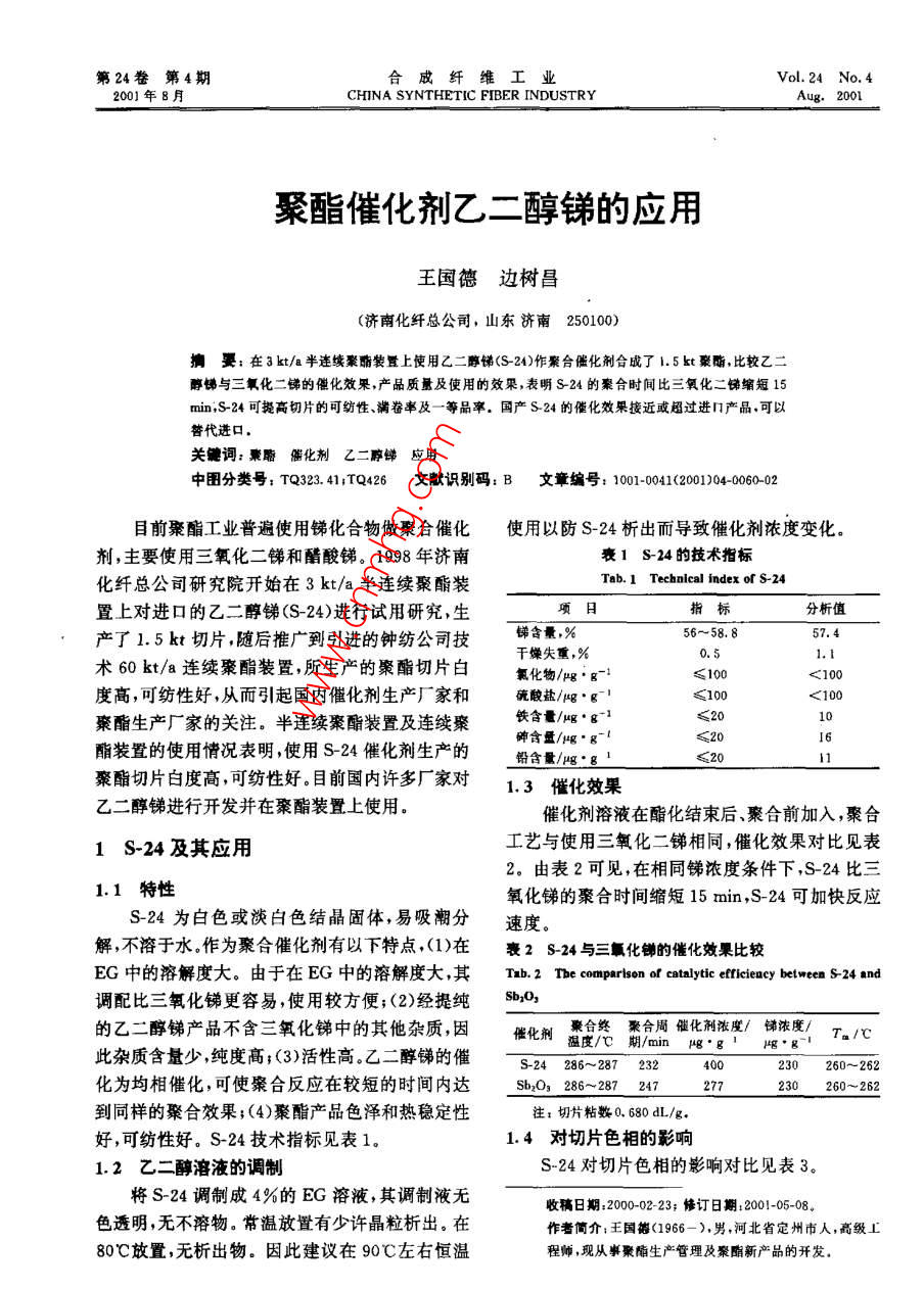 第24卷第4期合成纖維工業(yè)Vol 24 No 42001年8月CHINA SYNTHETIC FIBER INDUSTRY聚酯催化劑乙二醇銻的應用王國德邊樹昌濟南化纖總公司,山東濟南250100摘:在3kt/a半連續(xù)聚酯裝置上使用乙二醇悌(s24)作案合催化劑合成了1.5k聚酯,比較乙二醇錦與三氧化二銻的催化效果,產(chǎn)品質(zhì)量及使用的效果,表明S24的聚合時間比三氧化二銻縮短15minS-24可提高切片的可紡性、滿卷率及一等品率.國產(chǎn)S24的催化效果接近或超過進冂產(chǎn)品,可以替代進口關詞:秉踏催化劑乙二醇銻應用中圖分類號:TQ323.41;TQ426文獻識別碼:B文章編號:1001-0041(201)04006002目前聚酯工業(yè)普遍使用銻化合物做聚合催化使用以防S24析出而導致催化劑濃度變化。產(chǎn)了.5k切片隨后推廣到引進的鐘紡公司技合八山Mk技術指標劑,主要使用三氧化二銻和醋酸銻。1998年濟南衰1S24化纖總公司研究院開始在3kt/a半連續(xù)聚酯裝alcal index of S-24置上對進口的乙二醇銻(S24)進行試用研究,生指標分析值57.4術60kt/a連續(xù)聚酯裝置,所生產(chǎn)的聚酯切片白干燥失重,%氯化物/四g·g-1<100度高,可紡性好,從而引起國內(nèi)催化劑生產(chǎn)廠家和碳險鹽置酯裝置的使用情況表明,使用S24催化劑生產(chǎn)的砷含量/{g·g鉛含量/g11聚酯切片白度高,可紡性好目前國內(nèi)許多廠家對1,3催化效果乙二醇銻進行開發(fā)并在聚酯裝置上使用。催化劑溶液在酯化結束后聚合前加入,聚合1S-24及其應用工藝與使用三氧化二銻相同,催化效果對比見表2。由表2可見,在相同銻濃度條件下,S-24比三1.1特性氧化銻的聚合時間縮短15min,S-24可加快反應s24為白色或淡白色結晶固體,易吸潮分速度。解,不溶于水作為聚合催化劑有以下特點,(1)在襄2s24與三氧化鉚的催化效果比較EG中的溶解度大。由于在EG中的溶解度大,其Tab.,2 The comparison of catalytic efficiency between S24and調(diào)配比三氧化銻更容易,使用較方便;(2)經(jīng)提純0的乙二醇銻產(chǎn)品不含三氧化銻中的其他雜質(zhì),因催化劑聚合終聚合周催化劑濃度/銻濃度/Ta/℃此雜質(zhì)含量少,純度高;(3)活性高。乙二醇銻的催溫度/℃期/ mn Fg·gl嶇·g-24286~287232化為均相催化,可使聚合反應在較短的時間內(nèi)達SbO,286-2837247277230260-262到同樣的聚合效果;(4)聚酯產(chǎn)品色澤和熱穩(wěn)定性注:切片粘數(shù)0.680dL/g好,可紡性好。S24技術指標見表1。1.4對切片色相的影響1.2乙二醇溶液的調(diào)制S24對切片色相的影響對比見表3。將S24調(diào)制成4%的EG溶液,其調(diào)制液無收稿日期:20002-23;修訂日期:2001-05-08。色透明,無不溶物。常溫放置有少許晶粒析出。在作者簡介;王國(1966-),男河北省定州市人,高級工80℃放置,無析出物。因此建議在90℃左右恒溫程師,現(xiàn)從事聚酯生產(chǎn)管理及聚酯新產(chǎn)品的開發(fā)第4期王國德等.聚酯催化劑乙二醇銻的應用613s-24與三氧化錦對切片色相的影響變4S24技術指標Tab. 3 The effects of S-24 and sb O on chlpTab 4 Technical inde of S-14催化劑催化劑濃度/銻濃度/[]/色相銻,干燥失量/廠家%重,%氯化物硫酸鹽鐵s-242300.68052.81.8進口57.41.1<100<102300,68052.02.3正茂57.30.595968巨星57.90.5<100<10081010由表3可見:在相同銻濃度條件下,用S24華亞55.0天達57.70.45<100<100<1010切片的色相L值提高,b值下降,切片色相改善福港57.50.8<50<100715穩(wěn)定劑對S24的影響南寧56.7以磷酸三甲酯(TMP)作穩(wěn)定劑,加入100變5S24的使用效果比較g/gTMP后,S-24的催化性能下降聚合時間Tab. 5 The comparison of S-24 performance由未加TMP的225min延長至232min,產(chǎn)品常規(guī)指標無明顯差異,但初始熱分解溫度由331C廠家催化劑/銻/,合周八)/81提高至343℃,可見TMP的加入導致S24的催正茂402302240.67850.33.6化性能下降,但可增加切片的熱穩(wěn)定性0.68252.12.41.6S24對切片可紡性的影響天達4002302390.67652.82.8生產(chǎn)中使用S-24后切片的可紡性提高滿卷福灘400南寧400率提高5%,一級品率提高3%。注:1)正茂產(chǎn)品使用同期裝置狀況下用S24切片L2S24的國內(nèi)開發(fā)狀況49.8,b=2.9;2)福港產(chǎn)品使用同期裝置狀況下切片L=78,1,b=目前國內(nèi)至少有6家生產(chǎn)廠開發(fā)并生產(chǎn)S3.7同期用三氧化悌切片L=76.4,b=4124,其中無錫正茂化工廠,大連巨星公司,南寧銻3)各切片熔點均為260~262℃,聚合終溫287℃,調(diào)制品廠生產(chǎn)的S24均已在萬噸級裝置上使用。成都液外觀透明華亞公司生產(chǎn)的S2在儀征化纖公司小試,其應3結語用效果與進口S-24相近,活性比醋酸銻高28%各廠家的S-24技術指標見表4S-24在間歇聚合S-24的應用效果優(yōu)于三氧化二銻,目前國內(nèi)裝置上的使用情況見表5由表5可知,各家S24S24產(chǎn)品可以替代進口產(chǎn)品S24的應用有待推產(chǎn)品的EG調(diào)制液均無色透明,在EG中的溶解性能良好,與進口S24無明顯差異;催化效果均s-24的應用條件有待進一步優(yōu)化,如最佳調(diào)接近或超過進口產(chǎn)品;切片質(zhì)量達到試用進口S制濃度及調(diào)制溫度、最佳使用濃度及加入時機s24水平。因此可以認為國產(chǎn)S-24可以替代進口24對聚酯產(chǎn)品質(zhì)量的影響特別是對紡絲性能及產(chǎn)品切片結晶性的影響有待進一步探索。ANTIMONY GLYCOLOXIDE CATALYST APPLIEDIN PET PRODUCTIONWang Deguo, Bian Shuchang(Jinan Chemical Fiber Co., Jinan 250100)Abstract: Antimony glycoloxide(S-24)was applied in 3 kt/a semi-batch Pet plant as a polymerization catalyst andwas compared with Sb2O, in catalytic efficien