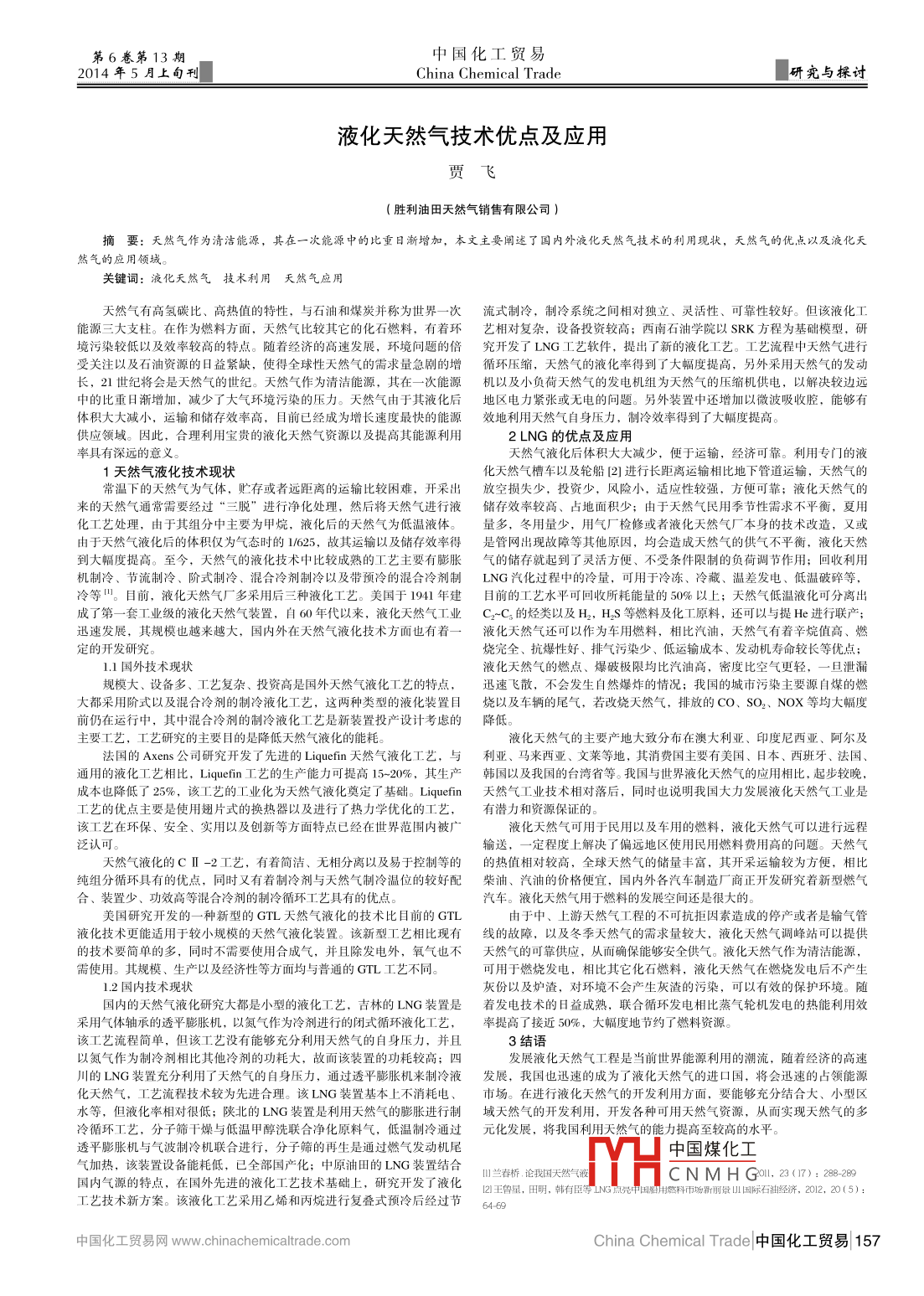第6卷第13期中國化工貿(mào)易2014年5月上旬刊China chemical trad研究與探討液化天然氣技術(shù)優(yōu)點(diǎn)及應(yīng)用(勝利油田天然氣銷售有限公司)摘要:天然氣作為清潔能源,其在一次能源中的比重日漸増加,夲文主要闡述了國內(nèi)外液化天然氣技術(shù)的利用現(xiàn)狀,天然氣的優(yōu)點(diǎn)以及液化天然氣的應(yīng)用領(lǐng)域關(guān)鍵詞:液化天然氣技術(shù)利用天然氣應(yīng)用天然氣有高氫碳比、高熱值的特性,與石油和煤炭并稱為世界一次流式制冷,制冷系統(tǒng)之間相對(duì)獨(dú)立、靈活性、可靠性較好。但該液化工能源三大支柱。在作為燃料方面,天然氣比較其它的化石燃料,有著環(huán)藝相對(duì)復(fù)雜,設(shè)備投資較高;西南石油學(xué)院以SRK方程為基礎(chǔ)模型,研境污染較低以及效率較高的特點(diǎn)。隨著經(jīng)濟(jì)的高速發(fā)展,環(huán)境問題的倍究開發(fā)了LNG工藝軟件,提岀了新的液化工藝。工藝流程中天然氣進(jìn)行受關(guān)注以及石油資源的日益緊缺,使得全球性天然氣的需求量急劇的增循環(huán)壓縮,天然氣的液化率得到了大幅度提高,另外氵氣的發(fā)動(dòng)長,21世紀(jì)將會(huì)是天然氣的世紀(jì)。天然氣作為清潔能源,其在一次能源機(jī)以及小負(fù)荷天然氣的發(fā)電機(jī)組為天然氣的壓縮機(jī)供電,以解決較邊遠(yuǎn)中的比重日漸增加,減少了大氣環(huán)境污染的壓力。天然氣由于其液化后地區(qū)電力緊張或無電的問題。另外裝置中還增加以微波吸收腔,能夠有體積大大減小,運(yùn)輸和儲(chǔ)存效率髙,目前已經(jīng)成為增長速度最快的能源效地利用天然氣自身壓力,制冷效率得到了大幅度提高供應(yīng)領(lǐng)域。因此,合理利用寶貴的液化天然氣資源以及提高其能源利用2LNG的優(yōu)點(diǎn)及應(yīng)用率具有深遠(yuǎn)的意義。天然氣液化后體積大大減少,便于運(yùn)輸,經(jīng)濟(jì)可靠。利用專門的液1天然氣液化技術(shù)現(xiàn)狀化天然氣槽車以及輪船(2]進(jìn)行長距離運(yùn)輸相比地下管道運(yùn)輸,天然氣的常溫下的天然氣為氣體,貯存或者遠(yuǎn)距離的運(yùn)輸比較困難,開采出放空損失少,投資少,風(fēng)險(xiǎn)小,適應(yīng)性較強(qiáng),方便可靠;液化天然氣的來的天然氣通常需要經(jīng)過¨三脫”進(jìn)行凈化處理,然后將天然氣進(jìn)行液儲(chǔ)存效率較高、占地面積少;由于天然氣民用季節(jié)性需求不平衡,夏用化工藝處理,由于其組分中主要為甲烷,液化后的天然氣為低溫液體。量多,冬用量少,用氣廠檢修或者液化天然氣廠本身的技術(shù)改造,又或由于天然氣液化后的體積僅為氣態(tài)時(shí)的1陌625,故其運(yùn)輸以及儲(chǔ)存效率得是管網(wǎng)出現(xiàn)故障等其他原因,均會(huì)造成天然氣的供氣不平衡,液化天然到大幅度提高。至今,天然氣的液化技術(shù)中比較成熟的工藝主要有膨脹氣的儲(chǔ)存就起到了靈活方便、不受條件限制的負(fù)荷調(diào)節(jié)作用;回收利用機(jī)制冷、節(jié)流制冷、階式制冷、混合冷劑制冷以及帶預(yù)冷的混合冷劑制?LNG汽化過程中的冷量,可用于冷凍、冷藏、溫差發(fā)電、低溫破碎等,冷等。目前,液化天然氣廠多采用后三種液化工藝。美國于1941年建目前的工藝水平可回收所耗能量的50%以上;天然氣低溫液化可分離出成了第一套工業(yè)級(jí)的液化天然氣裝置,自60年代以來,液化天然氣工業(yè)C2-Cs的烴類以及H2,HS等燃料及化工原料,還可以與提He進(jìn)行聯(lián)產(chǎn);迅速發(fā)展,其規(guī)模也越來越大,囻內(nèi)外在天然氣液化技術(shù)方面也有著一液化天然氣還可以作為車用燃料,相比汽油,天然氣有著辛烷值高、燃定的開發(fā)研究。燒完全、抗爆性好、排氣污染少、低運(yùn)輸成本、發(fā)動(dòng)機(jī)壽命較長等優(yōu)點(diǎn)1.1國外技術(shù)現(xiàn)狀液化天然氣的燃點(diǎn)、爆破極限均比汽油高,密度比空氣更輕,一旦泄漏規(guī)模大、設(shè)備多、工藝復(fù)雜、投資髙是國外天然氣液化工藝的特點(diǎn),迅速飛散,不會(huì)發(fā)生自然爆炸的情況;我國的城市污染主要源自煤的燃大都采用階式以及混合冷劑的制冷液化工藝,這兩種類型的液化裝置目燒以及車輛的尾氣,若改燒天然氣,排放的CO、SO2、NOX等均大幅度前仍在運(yùn)行中,其中混合冷劑的制冷液化工藝是新裝置投產(chǎn)設(shè)計(jì)考慮的降低。主要工藝,工藝研究的主要目的是降低天然氣液化的能耗。液化天然氣的主要產(chǎn)地大致分布在澳大利亞、印度尼西亞、阿爾及法國的 Axens公司研究開發(fā)了先進(jìn)的 Liquefin天然氣液化工藝,與利亞、馬來西亞、文萊等地,其消費(fèi)國主要有美國、日本、西班牙、法國通用的液化工藝相比, Liquefin工藝的生產(chǎn)能力可提高15-20%,其生產(chǎn)韓國以及我國的臺(tái)灣省等。我國與世界液化天然氣的應(yīng)用相比,起步較晚成本也降低了25%,該工藝的工業(yè)化為天然氣液化奠定了基礎(chǔ)。 Liquefin天然氣工業(yè)技術(shù)相對(duì)落后,同時(shí)也說明我國大力發(fā)展液化天然氣工業(yè)是工藝的優(yōu)點(diǎn)主要是使用翅片式的換熱器以及進(jìn)行了熱力學(xué)優(yōu)化的工藝,有潛力和資源保證的該工藝在環(huán)保、安全、實(shí)用以及創(chuàng)新等方面特點(di