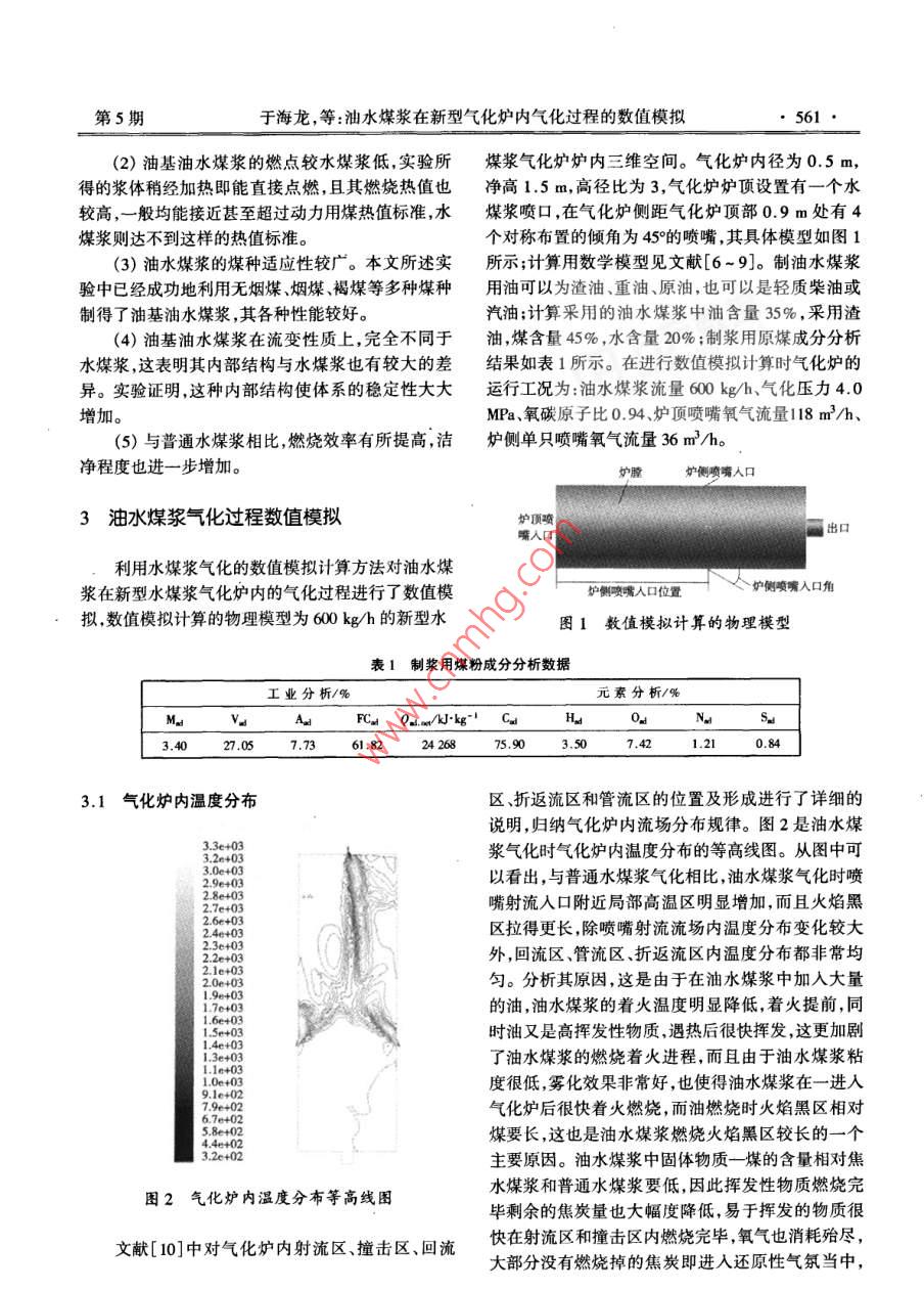 第22卷第5期熱能動(dòng)力工程Vol.22,No.52007年9月JOURNAL OF ENGINEERING FOR THERMAL ENERCY AND POWERSep. ,2007新能源動(dòng)力技術(shù) 子文章編號(hào):1001 - 20200)050 -0560-04油水煤漿在新型氣化爐內(nèi)氣化過程的數(shù)值模擬于海龍' ,劉建忠2(1.中原工學(xué)院能源與環(huán)境學(xué)院,河南鄭州450007;2.浙江大學(xué)能源潔凈利用與環(huán)境工程國(guó)家重點(diǎn)實(shí)驗(yàn)室,浙江杭州310027)摘要:在多噴嘴入口新型水煤漿氣化爐內(nèi)對(duì)油水煤漿燃料是一種加入不同量的水和少量分散劑、乳化劑(COW)的氣化過程進(jìn)行了數(shù)值模擬計(jì)算研究,分析了氣化爐的分散在燃料油中的煤的濃漿。與現(xiàn)行的取代燃內(nèi)的溫度分布、各種氣化產(chǎn)物濃度分布規(guī)律。數(shù)值模擬計(jì)算料,如油煤漿和水煤漿相比,油水煤漿的使用有以下結(jié)果證明,同濃度的油水謀漿氣化與普通水煤漿氣化相比,優(yōu)點(diǎn):(1)具有良好的燃燒效率,且對(duì)于鍋爐和噴嘴氣化爐內(nèi)平均溫度略有上升,碳轉(zhuǎn)化率提高1.81%.氣化爐都有較低的粘度;(2)作為工業(yè)燃料,燃燒效率高,出口粗煤氣中有效氣(C0+ H)含量提高10. 58%,CO2和微粒煤煙少,環(huán)境污染小;(3)顆粒遠(yuǎn)遠(yuǎn)小于油煤漿H20濃度大幅下降,水分解率大大提高,氣化效果明顯優(yōu)于和水煤漿中煤的顆粒粒度,這--特性使油水煤漿不普通水煤漿。僅可以直接用于燃油鍋爐,而且能夠替代柴油機(jī)用關(guān)鍵詞:油水煤漿;氣化;氣化爐;數(shù)值模擬柴油;(4)是適用于通過噴嘴霧化的懸浮液一乳化中圖分類號(hào):TQ534文獻(xiàn)標(biāo)識(shí)碼:A混合物,在燃燒過程中能產(chǎn)生微爆炸和水-汽,這些效應(yīng)結(jié)合在一起使油水煤漿成為高熱值燃料;(5)引言可擴(kuò)大煙煤種使用范圍,采用揮發(fā)分較低的無煙煤由于受到德士古水煤漿氣化技術(shù)專利的制約,等;(6)由于燃料油的加入,比水煤漿具有較低的燃國(guó)內(nèi)如采用水煤漿為原料利用德士古爐進(jìn)行氣化,點(diǎn)。都要為德士古公司支付昂貴的專利費(fèi)。要改變這一狀況,解決問題的良好途徑就是利用現(xiàn)有的氣化技2目前國(guó)內(nèi)油水煤漿開發(fā) 現(xiàn)狀及特點(diǎn)術(shù)尋求不同原料的氣化。筆者對(duì)有關(guān)這方面技術(shù)的國(guó)內(nèi)外資料和文獻(xiàn)進(jìn)行了研究和分析后認(rèn)為,油水CoW由油、水、煤3種成分和少量添加劑經(jīng)過煤漿氣化技術(shù)是目前非常有發(fā)展前景的技術(shù)之一。物理加工處理而成。根據(jù)煤漿外相成分,可將油水因此,油水煤漿的氣化技術(shù)在社會(huì)生產(chǎn)中具有一定煤漿分為油基油水煤漿與水基油水煤漿兩種,兩者的現(xiàn)實(shí)意義。的煤含量一般都在35% ~ 50%,水的含量不低于15%。目前,有資料顯示,油水煤漿與油煤漿以及水1油水煤漿的性能煤漿相比,具有易點(diǎn)燃、熱值高、節(jié)省用油、粘度低等優(yōu)點(diǎn)[1-5]。而且由于其內(nèi)相為煤和另-一種液體,其近年來,人們又開始著眼于一種新型煤漿一穩(wěn)定性機(jī)理有所變化,穩(wěn)定因素也有所增加。由于油水煤漿技術(shù)(COW)的研究,因?yàn)樗茉? -定程度受技術(shù)水平的限制,我國(guó)在油水煤漿技術(shù)方面的研上改善煤炭的品質(zhì)。這種油、煤、水三元混合燃料是究現(xiàn)大多集中在油基油水煤漿上,其特點(diǎn)如下:加拿大人0. Trass 和G. Papach ristodou lou提出的,(1)油基CoW燃料為屈服假塑性流體,對(duì)于鍋國(guó)內(nèi)對(duì)這方面的研究是近幾年來才開始的"。爐和噴嘴都有較低的粘度;這種煤漿燃料同樣具有用燃料油、細(xì)磨煤粉和水組成的新型三元混合剪切降粘性質(zhì),此外這種漿體的粘度明顯地低于水燃料作為未來的一種潔凈燃料前景看好。這合成煤漿和油煤漿;收稿日期:2006-12-30;修訂日期:2007-03-30基金項(xiàng)目:國(guó)家重點(diǎn)基礎(chǔ)研究發(fā)展規(guī)劃基金資助項(xiàng)目20021770)作者簡(jiǎn)介:于海龍(1975- ),男,吉林人,中原工學(xué)院副教授,博士.第5期于海龍,等:油水煤漿在新型氣化爐內(nèi)氣化過程的數(shù)值模擬●561●(2)油基油水煤漿的燃點(diǎn)較水煤漿低,實(shí)驗(yàn)所煤漿氣化爐爐內(nèi)三維空間。氣化爐內(nèi)徑為0.5 m, .得的漿體稍經(jīng)加熱即能直接點(diǎn)燃,且其燃燒熱值也凈高1.5 m,高徑比為3,氣化爐爐頂設(shè)置有一個(gè)水較高,一般均能接近甚至超過動(dòng)力用煤熱值標(biāo)準(zhǔn),水煤漿噴口,在氣化爐側(cè)距氣化爐頂部0.9 m處有4煤漿則達(dá)不到這樣的熱值標(biāo)準(zhǔn)。個(gè)對(duì)稱布置的傾角為459的噴嘴,其具體模型如圖1(3)油水煤漿的煤種適應(yīng)性較廣。本文所述實(shí)所示;計(jì)算用數(shù)學(xué)模型見文獻(xiàn)[6~9]。制油水煤漿驗(yàn)中已經(jīng)成功地利用無煙煤、煙煤、褐煤等多種煤種用油可以為渣油、重油、原油,也可以是輕質(zhì)柴油或制得了油基油水煤漿,其各種性能較好。汽油;計(jì)算采用的油水煤漿中油含量35%,采用渣(4)油基油水煤漿在流變性質(zhì)上,完全不同于油,煤含量45%,水含量20%;制漿用原煤成分分析水煤漿,這表明其內(nèi)部結(jié)構(gòu)與水煤漿也有較大的差結(jié)果如表1所示。在進(jìn)行數(shù)值模擬計(jì)算時(shí)氣化爐的異。實(shí)驗(yàn)證明,這種