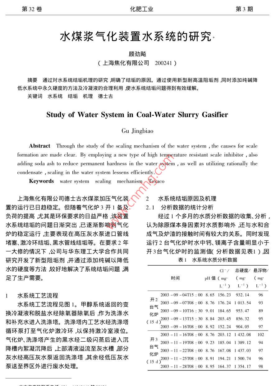 第32卷化肥工業(yè)第3期水煤漿氣化裝置水系統(tǒng)的研究顧勁飚(上海焦化有限公司200241)摘要通過對水系統(tǒng)結(jié)垢機理的研究明確了結(jié)垢旳原因。通過使用新型耐髙溫阻垢劑冋時添加純堿降低水系統(tǒng)中永久硬度的方法及冷凝液的合理利用使水系統(tǒng)結(jié)垢問題得到有效緩解關鍵詞水系統(tǒng)結(jié)垢機理德士古Study of Water System in Coal-Water Slurry GasifierGu jingbiaoAbstract Through the study of the scaling mechanism of the water system the causes for scaleformation are made clear. By employing a new type of high temperature resistant scale inhibitor, alsoadding soda ash to reduce permanent hardness in the water system, as well as utilizing rationally theKeywords water system scaling mechanism Texaco上海焦化有限公司德士古水煤漿加壓氣化裝2水系統(tǒng)結(jié)垢原因及機理置的運行已日趨穩(wěn)定。但隨著氣化爐3開1備及2.1分析數(shù)據(jù)的統(tǒng)計分析負荷的提高尤其是環(huán)保要求的日益嚴格,該裝置經(jīng)過1個多月的水質(zhì)分析數(shù)據(jù)的收集、分析水系統(tǒng)結(jié)垢的問題日漸突出,已逐漸影響到氣化認為除原煤本身因素對水質(zhì)影響外還與水和合爐的穩(wěn)定運行主要表現(xiàn)在高壓灰水泵進口管線成氣及爐渣的接觸時間有較大的關系。同時發(fā)現(xiàn)堵塞、激冷環(huán)結(jié)垢、黑水管線結(jié)垢等。在要求2年運行2臺氣化爐時水中鈣、鎂離子含量明顯小于大修的情況下,公司與華東理工大學合作共同開3臺氣化爐時的監(jiān)測值分析數(shù)據(jù)見表1)因研究開發(fā)了新型阻垢劑并通過添加純堿以降低表1水系統(tǒng)水質(zhì)分析數(shù)據(jù)水的硬度等方法較好地解決了系統(tǒng)結(jié)垢問題滿Cl/總硬度/懸浮物足了生產(chǎn)需要。時間(mg mg水系統(tǒng)工藝流程2003-09-04T15:008.65156.23932.1496開2水系統(tǒng)工藝流程見圖1。甲醇系統(tǒng)返回的變200307T8:008.76176.241013.5493臺氣換冷凝液和脫鹽水經(jīng)除氧器除氧后作為洗滌水北為2003-09-1016:309.01184.65953.47和補充水進入洗滌塔。洗滌塔內(nèi)工藝水經(jīng)洗滌塔(5d)2003-09-1315:308.84203.458563295循環(huán)泵打至氣化爐激冷環(huán),以保持激冷室液位2003-09-16T08:008.92152.24904.05972003-11-16T08:008.76203.121432.08102氣化爐洗滌塔產(chǎn)生的黑水經(jīng)二級閃蒸后進入沉開32003-11-19T8:009.23185.041389.1294降槽內(nèi)絮凝沉降后上部清液溢流至灰水槽部分2003-11-22108:008.76167灰水經(jīng)高壓灰水泵返回洗滌塔其余經(jīng)低壓灰水(15d)003-11-25108:008.91194.211500.7496泵送至界區(qū)外進行廢水處理2003-11-28T08:008.95164.371354.1798第32卷化肥工業(yè)第3期冷凝液脫鹽水低壓蒸汽合成氣去甲醇冷卻水洗滌塔蒸水g真空閃燕分洗滌塔循環(huán)泵水累凝劑加阻垢劑處去界外去壓濾機低壓灰水泵高壓灰水泵圖1水系統(tǒng)工藝流程圖此認定水中硬度的變化取決于水的循環(huán)量與系統(tǒng)定結(jié)果見圖2、圖3。保留容積即接觸時間、停留時間)之比。2.2合成氣中CO2的高溫水溶液熱力學平衡數(shù)NaC]2.7%據(jù)的測試NaCl=0%000284062壓力/Pa圖3不同壓力下CO,在含鹽和度/°C甲烷氣體的水中溶解度圖2常壓下CO2氣體在水中的溶解度相平衡數(shù)據(jù)表明在氣相中CO2的體積分數(shù)在高壓相平衡裝置中對合成氣中CO2與水大于4%時碳酸鈣一般不會形成鈣離子呈溶解第32卷化肥工業(yè)第3期亦有沉淀抑制作用;當液相中的CO,濃度與氣相子在高濃度時煤灰對碳酸鈣沉積的影響主要發(fā)體積分數(shù)相當時在密閉系統(tǒng)中,氣相分壓隨溫度生在初期1min內(nèi)此時pH值急劇降低。在80上升呈較好的線性關系即CO2始終以飽和狀態(tài)℃時煤灰對碳酸鈣結(jié)晶的影響較大其影響同樣存在溶解度隨壓力增加而增大,與氣相中CO2主要發(fā)生在沉淀的開始階段。由此可見煤灰與的分壓呈正比鈣離子的共沉積過程主要在開始階段進行共沉由此可見激冷室前洗滌水過濾器和激冷環(huán)積時間小于10min。這同樣證明當氣相中CO體沉積物堵塞的原因主要在于系統(tǒng)氣相中CO濃度積分數(shù)降低時黑水系統(tǒng)中的沉積物極易形成。的顯著降低水中CO2隨之逸出在高硬度情況下由CO2水解平衡產(chǎn)生的CO32形成碳酸鈣與懸浮3解決水系統(tǒng)結(jié)垢的方法物共沉積所致研究開發(fā)出新型耐高溫阻垢劑CHQ-1。2.3碳酸鈣與懸浮物共沉積過程的研究根據(jù)阻垢劑晶格彎曲及分散的機理我們自在實驗室中進行了不同條件下的碳酸鈣與煤行研究、開發(fā)了含有羧基、硫酸基等的丙酸系共聚灰共沉積的實驗。實驗在密閉容器中進行值物即CHQ-1型耐高溫阻垢劑并對該型阻垢劑僅以 Nahco3調(diào)節(jié),鈣離子質(zhì)量濃度分別為180、進行了性能測定。300、540mg/L,碳酸氫根質(zhì)量濃度為628mg/L(1)試驗樣品cHQ-1A和CHQ-1B(40℃廂和329mg/(80℃)實驗結(jié)果見圖4、5(2)試驗方法①阻垢性能加碳酸鈣晶種將500mL1%藥劑注入高壓釜中在80℃、1MPa條件下加熱2h待冷卻后配制成1mg/mL溶液按使用劑量50、70mg/L投加試驗溶液分別模擬硬水+無鈣煤灰A(阻垢率91.1%~93.1%)和Ⅸ阻垢率91.2%~93.2%)②分散性能(30min透光率)A:6%~48%B#3%~47%。時間/in③高溫阻垢性能圖440℃下起始鈣離子濃度為300mg/L的在230~240℃、3MPa條件下按①步驟測碳酸鈣沉積曲線([HCO3]=628mg/L.)定結(jié)果阻垢性能A為65%~67%B為67%69%證實該阻垢劑有較強