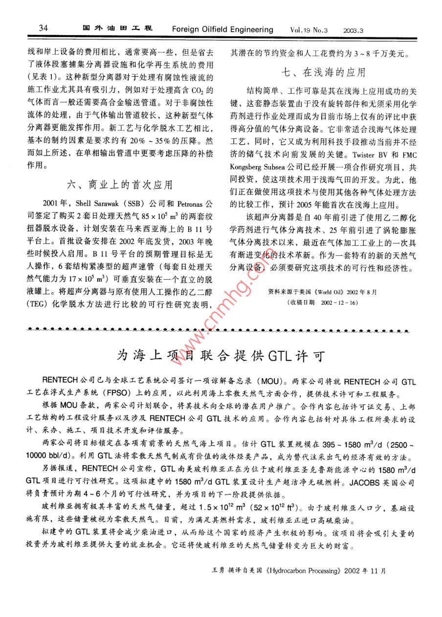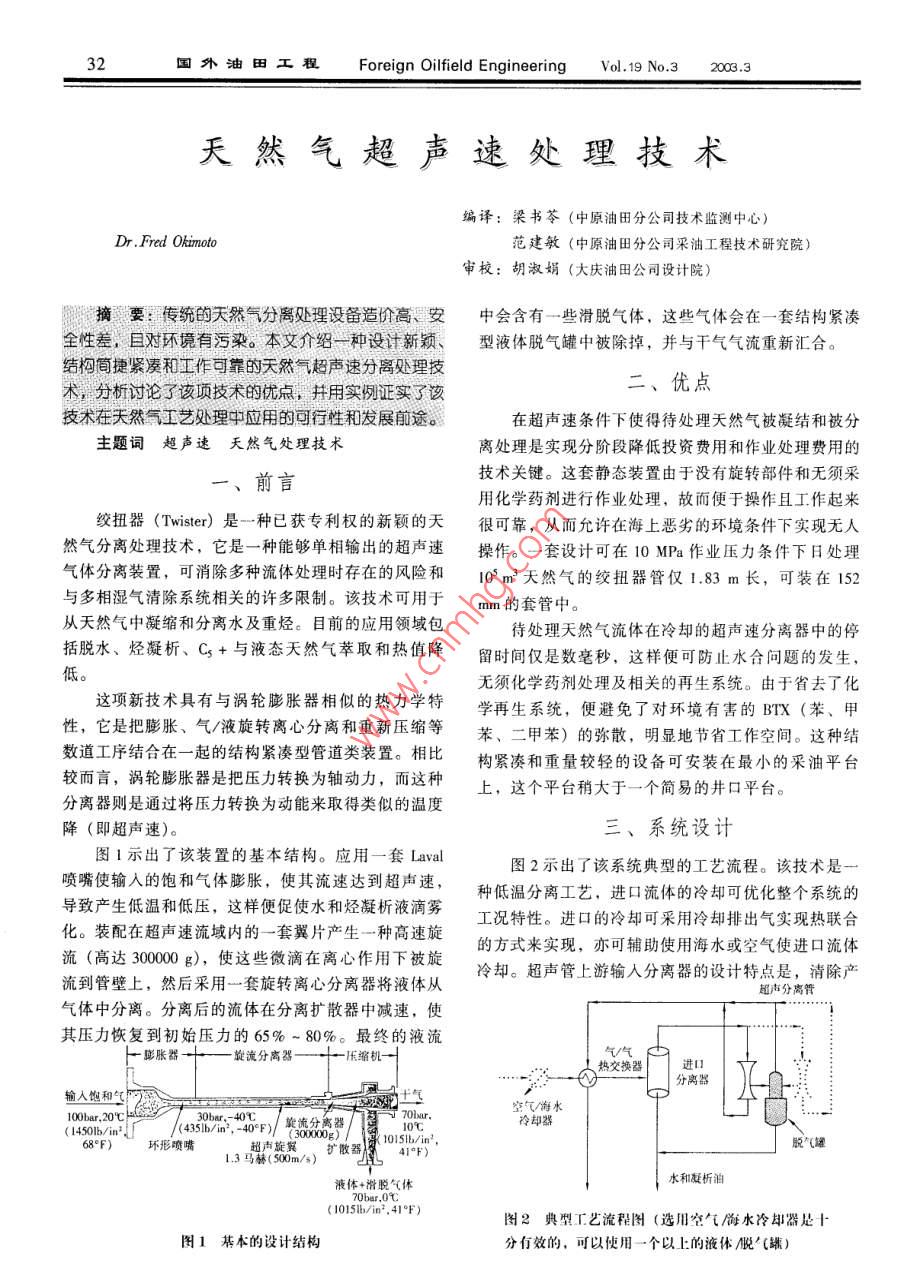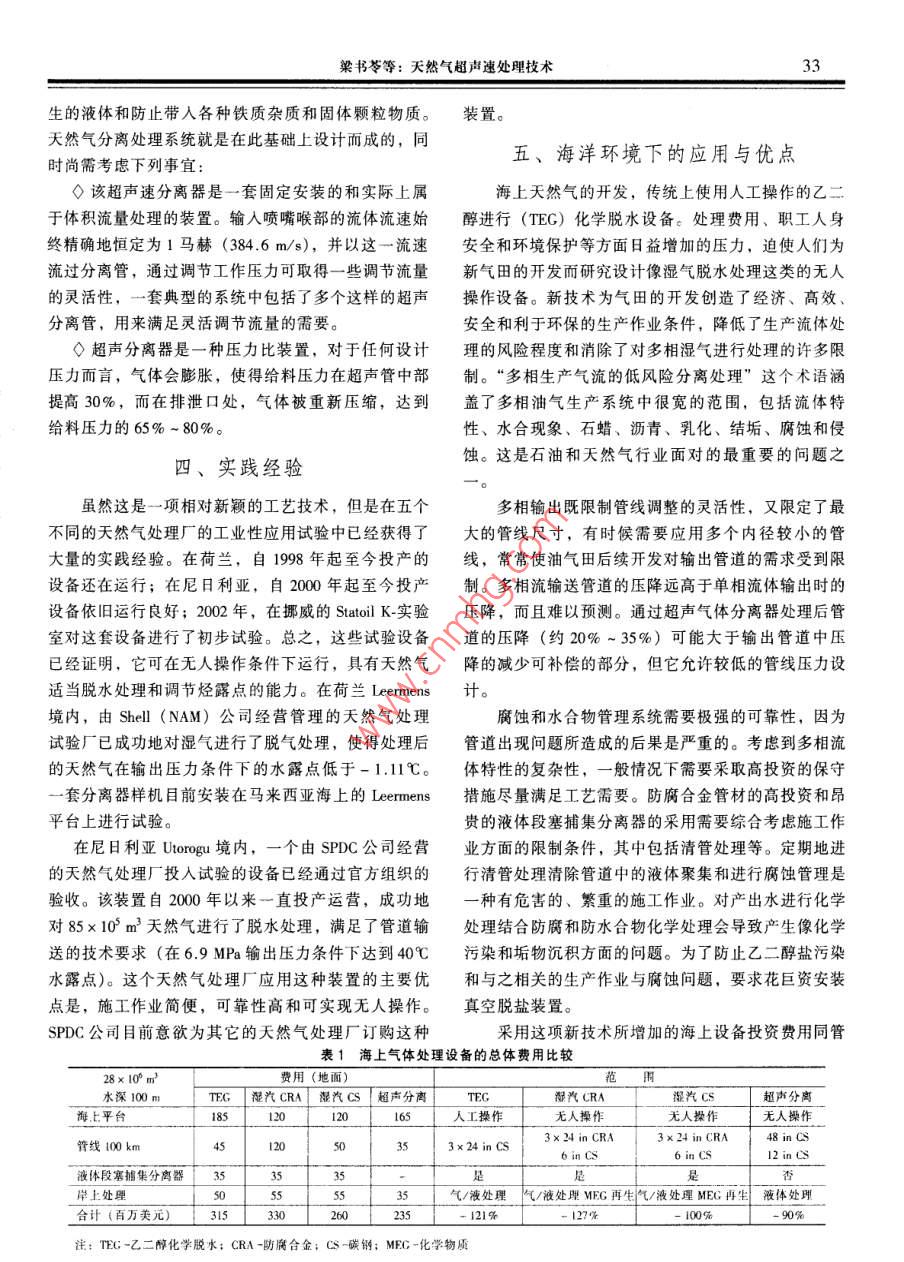 32國(guó)外油田工翟 Foreign Oilfield Engineering Vol.19No.3208.3天然氣超聲速處理技術(shù)編譯:梁書苓(中原油田分公司技術(shù)監(jiān)測(cè)中心)Dr, Fred okimot范建敏(中原油田分公司采油工程技術(shù)研究院)審校:胡淑娟(大慶油田公司設(shè)計(jì)院)摘要:傳統(tǒng)的天然氣分離處理設(shè)備造價(jià)高、安中會(huì)含有一些滑脫氣體,這些氣體會(huì)在一套結(jié)構(gòu)緊湊全性差,對(duì)環(huán)有污染。本文介紹—種設(shè)計(jì)新穎、型液體脫氣罐中被除掉,并與干氣氣流重新匯合。結(jié)構(gòu)簡(jiǎn)捷緊湊和工作可靠的天然氣超聲速分離處理技術(shù),分析討論了該項(xiàng)技術(shù)的優(yōu)點(diǎn),并用實(shí)例證實(shí)了該、優(yōu)點(diǎn)技術(shù)在天然氣工藝處理中應(yīng)用的可行性和發(fā)展前途在超聲速條件下使得待處理天然氣被凝結(jié)和被分主題詞超聲速天然氣處理技術(shù)離處理是實(shí)現(xiàn)分階段降低投資費(fèi)用和作業(yè)處理費(fèi)用的、前言技術(shù)關(guān)鍵。這套靜態(tài)裝置由于沒有旋轉(zhuǎn)部件和無須采用化學(xué)藥劑進(jìn)行作業(yè)處理,故而便于操作且工作起來紋扭器( Twister)是一種已獲專利權(quán)的新穎的天很可靠,從而允許在海上惡劣的環(huán)境條件下實(shí)現(xiàn)無人然氣分離處理技術(shù),它是一種能夠單相輸出的超聲速操作。一套設(shè)計(jì)可在10MP作業(yè)壓力條件下日處理氣體分離裝置,可消除多種流體處理時(shí)存在的風(fēng)險(xiǎn)和105m3天然氣的絞扭器管僅1.83m長(zhǎng),可裝在152與多相濕氣清除系統(tǒng)相關(guān)的許多限制。該技術(shù)可用于m的套管中從天然氣中凝縮和分離水及重?zé)N。目前的應(yīng)用領(lǐng)域包待處理天然氣流體在冷卻的超聲速分離器中的停括脫水、烴凝析、C+與液態(tài)天然氣萃取和熱值降留時(shí)間僅是數(shù)亳秒,這樣便可防止水合問題的發(fā)生,無須化學(xué)藥劑處理及相關(guān)的再生系統(tǒng)。由于省去了化這項(xiàng)新技術(shù)具有與渦輪膨脹器相似的熱力學(xué)特學(xué)再生系統(tǒng),便避免了對(duì)環(huán)境有害的BX(苯、甲性,它是把膨脹、氣/液旋轉(zhuǎn)離心分離和重新壓縮等苯、二甲苯)的彌散,明顯地節(jié)省工作空間。這種結(jié)數(shù)道工序結(jié)合在一起的結(jié)構(gòu)緊湊型管道類裝置。相比構(gòu)緊湊和重量較輕的設(shè)備可安裝在最小的采油平臺(tái)較而言,渦輪膨脹器是把壓力轉(zhuǎn)換為軸動(dòng)力,而這種上,這個(gè)平臺(tái)稍大于一個(gè)簡(jiǎn)易的井口平臺(tái)。分離器則是通過將壓力轉(zhuǎn)換為動(dòng)能來取得類似的溫度降(即超聲速)。、系統(tǒng)設(shè)計(jì)圖1示出了該裝置的基本結(jié)構(gòu)。應(yīng)用一套Lawl圖2示出了該系統(tǒng)典型的工藝流程。該技術(shù)是一噴嘴使輸入的飽和氣體膨脹,使其流速達(dá)到超聲速,種低溫分離工藝,進(jìn)口流體的冷卻可優(yōu)化整個(gè)系統(tǒng)的導(dǎo)致產(chǎn)生低溫和低壓,這樣便促使水和烴凝析液滴霧化。裝配在超聲速流域內(nèi)的一套翼片產(chǎn)生一種高速旋工況特性。進(jìn)口的冷卻可采用冷卻排出氣實(shí)現(xiàn)熱聯(lián)合流(高達(dá)30000g0),使這些微滴在離心作用下被旋的方式來實(shí)現(xiàn),亦可輔助使用海水或空氣使進(jìn)口流體流到管壁上,然后采用一套旋轉(zhuǎn)離心分離器將液體從冷卻。超聲管上游輸入分離器的設(shè)計(jì)特點(diǎn)是,清除產(chǎn)超聲分離管氣體中分離。分離后的流體在分離擴(kuò)散器中減速,使其壓力恢復(fù)到初始?jí)毫Φ?5%~80%。最終的液流彭脹器旋流分離器壓縮機(jī)熱交換器輸入飽和空氣/海水(1450b/mn24(435b/in2,-40°冷卻器(30000環(huán)形噴嘴13馬赫(90m)擴(kuò)散器液體+滑脫氣體水和凝析泊(105l/in2,41°F)圖2典型工藝流程圖(選用空氣水冷卻器是十圖1基本的設(shè)計(jì)結(jié)構(gòu)分有效的,可以使用一個(gè)以上的液體脫罐)梁書苓等:天然氣超聲速處理技術(shù)33生的液體和防止帶入各種鐵質(zhì)雜質(zhì)和固體顆粒物質(zhì)。裝置。天然氣分離處理系統(tǒng)就是在此基礎(chǔ)上設(shè)計(jì)而成的,同時(shí)尚需考慮下列事宜五、海洋環(huán)境下的應(yīng)用與優(yōu)點(diǎn)◇該超聲速分離器是一套固定安裝的和實(shí)際上屬海上天然氣的開發(fā),傳統(tǒng)上使用人工操作的乙于體積流量處理的裝置。輸噴嘴喉部的流體流速始醇進(jìn)行(TEG)化學(xué)脫水設(shè)備。處理費(fèi)用、職工人身終精確地恒定為1馬赫(384.6m/s),并以這一流速安全和環(huán)境保護(hù)等方面日益增加的壓力,迫使人們?yōu)榱鬟^分離管,通過調(diào)節(jié)工作壓力可取得一些調(diào)節(jié)流量新氣田的開發(fā)而研究設(shè)計(jì)像濕氣脫水處理這類的無人的靈活性,一套典型的系統(tǒng)中包括了多個(gè)這樣的超聲操作設(shè)備。新技術(shù)為氣田的開發(fā)創(chuàng)造了經(jīng)濟(jì)、高效分離管,用來滿足靈活調(diào)節(jié)流量的需要。安全和利于環(huán)保的生產(chǎn)作業(yè)條件,降低了生產(chǎn)流體處◇超聲分離器是一種壓力比裝置,對(duì)于任何設(shè)計(jì)理的風(fēng)險(xiǎn)程度和消除了對(duì)多相濕氣進(jìn)行處理的許多限壓力而言,氣體會(huì)膨脹,使得給料壓力在