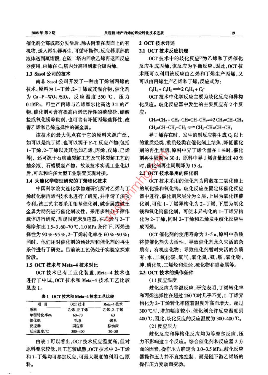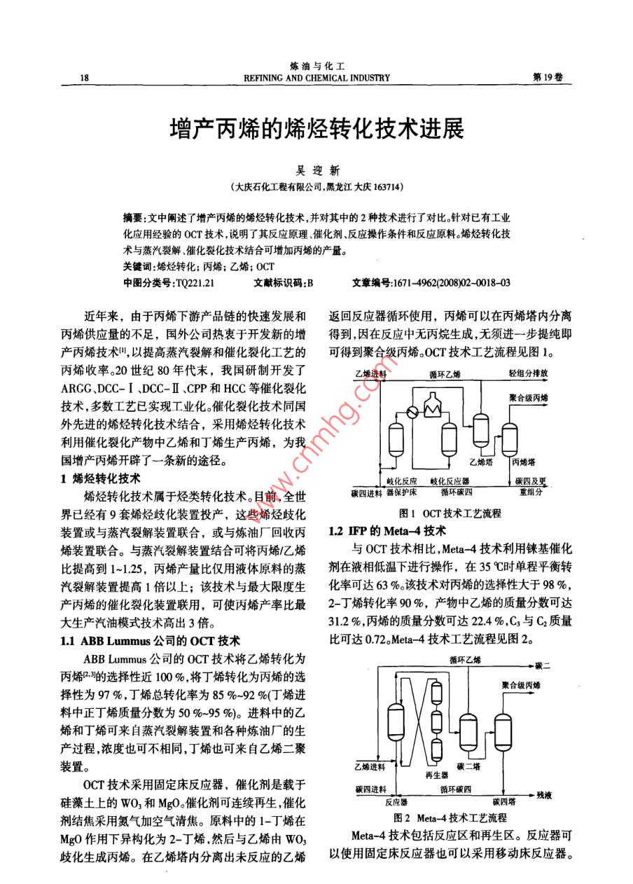 煉油與化工18REFINING AND CHEMICAL INDUSTRY第19卷增產(chǎn)丙烯的烯烴轉(zhuǎn)化技術(shù)進(jìn)展吳迎新(大慶石化工程有限公司,黑龍江大慶163714)摘要:文中闡述了增產(chǎn)丙烯的烯烴轉(zhuǎn)化技術(shù),并對其中的2種技術(shù)進(jìn)行了對比。針對已有工業(yè)化應(yīng)用經(jīng)驗(yàn)的OCT技術(shù),說明了其反應(yīng)原理.催化劑、反應(yīng)操作條件和反應(yīng)原料。烯烴轉(zhuǎn)化技術(shù)與蒸汽裂解、催化裂化技術(shù)結(jié)合可增加丙烯的產(chǎn)量。關(guān)鍵詞:烯烴轉(zhuǎn)化;丙烯;乙烯; OCT中團(tuán)分類號:TQ221.21文獻(xiàn)標(biāo)識(shí)碼:B文章編號:1671- 4962008)020018-03近年來,由于丙烯下游產(chǎn)品鏈的快速發(fā)展和返回反應(yīng)器循環(huán)使用,丙烯可以在丙烯塔內(nèi)分離丙烯供應(yīng)量的不足,國外公司熱衷于開發(fā)新的增得到,因在反應(yīng)中無丙烷生成,無須進(jìn)-步提純即產(chǎn)丙烯技術(shù)",以提高蒸汽裂解和催化裂化工藝的可得到聚合級丙烯.OCT技術(shù)工藝流程見圖1。丙烯收率。20世紀(jì)80年代末,我國研制開發(fā)了乙烯進(jìn)料循環(huán)乙烯輕組分排放ARGG .DCC- I ,DCC-I、CPP和HCC等催化裂化聚合級丙烯技術(shù),多數(shù)工藝已實(shí)現(xiàn)工業(yè)化。催化裂化技術(shù)同國外先進(jìn)的烯烴轉(zhuǎn)化技術(shù)結(jié)合,采用烯烴轉(zhuǎn)化技術(shù)利用催化裂化產(chǎn)物中乙烯和丁烯生產(chǎn)丙烯,為我090.國增產(chǎn)丙烯開辟了- -條新的途徑。| 丙烯塔1烯烴轉(zhuǎn)化技術(shù)岐化反應(yīng)岐化反應(yīng)器碳四及更烯烴轉(zhuǎn)化技術(shù)屬于烴類轉(zhuǎn)化技術(shù)。目前,全世碳四進(jìn)料器保護(hù)床循環(huán)碳四重組分界已經(jīng)有9套烯烴歧化裝置投產(chǎn),這些烯烴歧化圖1 OCT 技術(shù)工藝流程裝置或與蒸汽裂解裝置聯(lián)合,或與煉油廠回收丙1.2IFP的Meta4技術(shù)烯裝置聯(lián)合。與蒸汽裂解裝置結(jié)合可將丙烯/乙烯與OCT技術(shù)相比, Meta -4技術(shù)利用錸基催化比提高到1~1.25,丙烯產(chǎn)量比僅用液體原料的蒸劑在液相低溫下進(jìn)行操作,在35 C時(shí)單程平衡轉(zhuǎn)汽裂解裝置提高1倍以上;該技術(shù)與最大限度生化率可達(dá)63 %。該技術(shù)對丙烯的選擇性大于98 %,產(chǎn)丙烯的催化裂化裝置聯(lián)用,可使丙烯產(chǎn)率比最2-丁烯轉(zhuǎn)化率90%,產(chǎn)物中乙烯的質(zhì)量分?jǐn)?shù)可達(dá)大生產(chǎn)汽油模式技術(shù)高出3倍。31.2 %,丙烯的質(zhì)量分?jǐn)?shù)可達(dá)22.4%,C3與C2質(zhì)量1.1 ABB Lummus公司的OCT技術(shù)比可達(dá)0.72oMeta- 4技術(shù)工藝流程見圖2。ABBLummus公司的OCT技術(shù)將乙烯轉(zhuǎn)化為碳二丙烯B-3的選擇性近100 % ,將丁烯轉(zhuǎn)化為丙烯的選聚合級丙爝擇性為97 %,丁烯總轉(zhuǎn)化率為85 %~92 %(丁烯進(jìn)料中正丁烯質(zhì)量分?jǐn)?shù)為50%~95 %)。進(jìn)料中的乙烯和丁烯可來自蒸汽裂解裝置和各種煉油廠的生產(chǎn)過程,濃度也可不相同,丁烯也可來自乙烯二聚裝置。碳二塔再生器OCT技術(shù)采用固定床反應(yīng)器,催化劑是載于碳四進(jìn)料硅藻土上的WO,和Mg0。催化劑可連續(xù)再生,催化反應(yīng)器堿四塔+殘液劑結(jié)焦采用氮?dú)饧涌諝馇褰?。原料中?-丁烯在圖2 Meta- 4技術(shù)工藝流程Mg0作用下異構(gòu)化為2-丁烯,然后與乙烯由WO3Meta- 4技術(shù)包括反應(yīng)區(qū)和再生區(qū)。反應(yīng)器可歧化生成丙烯。在乙烯塔內(nèi)分離出未反應(yīng)的乙烯以使用固定床反應(yīng)器也可以采用移動(dòng)床反應(yīng)器。2008年第2期吳迎新增產(chǎn)丙烯的烯烴轉(zhuǎn)化技術(shù)進(jìn)展19催化劑全部或部分失活后,除去附著在表面上的有2 0CT技術(shù)詳述機(jī)物,送人再生器再生,可循環(huán)操作。反應(yīng)器頂部的2.1 OCT技術(shù)反應(yīng)機(jī)理液體送到蒸餾段,在碳二塔內(nèi)回收乙烯再返回反應(yīng)OCT技術(shù)中的歧化反應(yīng)P為乙烯和丁烯催化器使用。丙烯在C4塔內(nèi)分離得到聚合級丙烯。反應(yīng)生成丙烯,該反應(yīng)為平衡反應(yīng)。因此,0CT技13 Sasol公司的技術(shù)術(shù)既可以利用該反應(yīng)由乙烯和丁烯生產(chǎn)丙烯,又南非Sasol公司開發(fā)了一種由丁烯制丙烯的可以由丙烯生產(chǎn)乙烯和丁烯。反應(yīng)式為:技術(shù)。原料為1-丁烯.2-丁烯或其混合物,催化劑CH4+ CAHs= =2 CH6+ C;*為Cs-P-WO3 /SiO2, 反應(yīng)溫度550 C,壓力OCT技術(shù)中化學(xué)反應(yīng)主要為歧化反應(yīng)和異構(gòu)0.1MPa,可生產(chǎn)丙烯與乙烯摩爾比高達(dá)3:1的產(chǎn)化反應(yīng)。歧化反應(yīng)器中發(fā)生的主要反應(yīng)有2個(gè)反物。催化劑可含有提高丙烯選擇性的磷酸鹽、硼酸應(yīng):鹽或氧化鎂等助劑,也可含有降低丙烯選擇性、改CH=CH2 + CH- CH=CH _CHz=2 CH2=CH -CHs善乙烯和己烯選擇性的堿金屬。CH=CH-CH-CH3 =CH3 -CH=CH-CH3該技術(shù)的最大優(yōu)點(diǎn)在于它的原料來源廣泛,異丁烯存在時(shí),發(fā)生的副反應(yīng)將生成Cs以上如可以是純丁烯,也可以源于F-T反應(yīng)產(chǎn)物(包括的重質(zhì)烴類,重質(zhì)烴類在催化劑上結(jié)焦,降低催化1-丁烯、2-丁烯以及其他如乙烯、丙烯、戊烯、己烯劑的再生周期。原料中異丁烯含量在1 %時(shí),催化等),還可源于石腦油裂解工藝及氣體裂解工藝的劑再生周期為30d