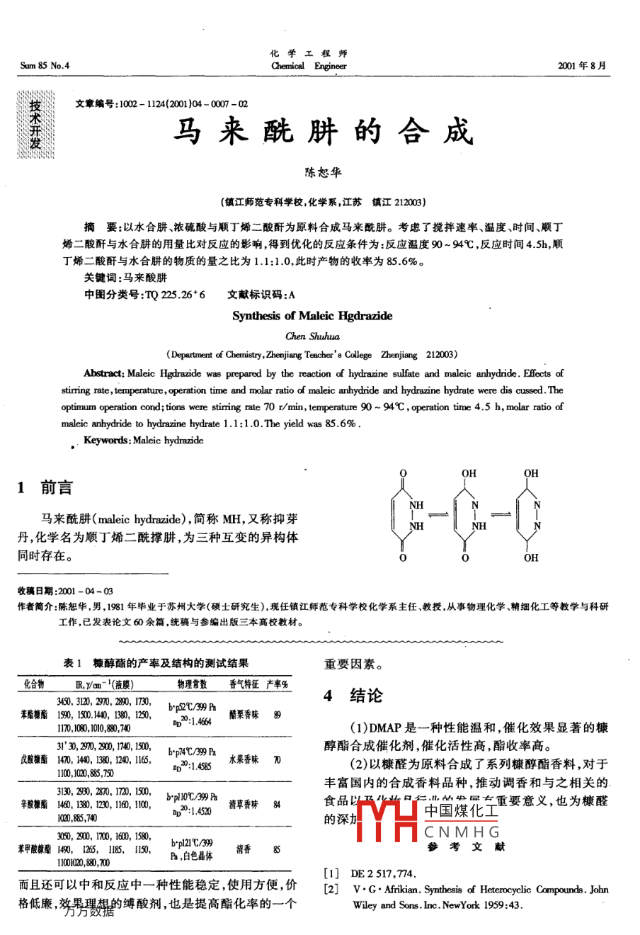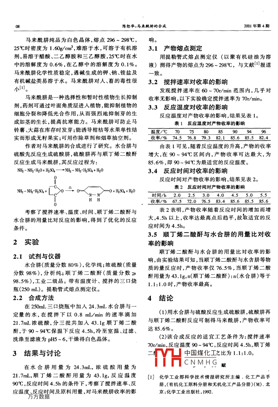 化學(xué)工程師Sum 85 No.4Chemical Engineer2001年8月文章編號:1002 - 1124(2001)04- 00070 -02馬來酰肼的合成陳恕華(鎮(zhèn)江師范??茖W(xué)校,化學(xué)系,江蘇鎮(zhèn)江 212003)摘要:以水 合肼、濃硫酸與順丁烯二酸酐為原料合成馬來酰肼??紤]了攪拌速率、溫度、時間、順丁烯二酸酐與水合肼的用量比對反應(yīng)的影響,得到優(yōu)化的反應(yīng)條件為:反應(yīng)溫度90~94C,反應(yīng)時間4.5h,順丁烯二酸酐與水合肼的物質(zhì)的量之比為1.1:1.0,此時產(chǎn)物的收率為85.6%。關(guān)鍵詞:馬來酸肼中圖分類號:TQ 225.26+*6文獻標(biāo)識碼:ASynthesis of Maleic HgdrazideChen Shuhua(Depertment of Chemistry , Zhenjiang Teacher' 8 College Zhenjiang 212003)Abstract: Maleic Hgdrazide was prepared by the reaction of hydrazine sulfate and maleic anhydnide. Fffects ofstining rate, temperature, operation time and molar ratio of maleic anhydnide and hydrazine hydrate were dis cused. Theoptimum operation cond; tions were stiring rate 70 r/ min, temperature 90 ~ 94C , operation time 4.5 h, molar ratio ofmaleic anbydride to hydrazine hydrate 1.1:1.0. The yield was 85.6% .Keywords: Maleic hydrazide0OH)H1前言NH馬來酰肼( maleic hydrazide) ,簡稱MH,又稱抑芽丹,化學(xué)名為順丁烯二酰撐肼,為三種互變的異構(gòu)體同時存在。收稿日期:2001 -04-03作者簡介:陳恕華.男,1981年畢業(yè)于蘇州大學(xué)(碩士研究生),現(xiàn)任鎮(zhèn)江師范??茖W(xué)?;瘜W(xué)系主任、教授,從事物理化學(xué)、精細化工等教學(xué)與科研工作,已發(fā)表論文60余篇,統(tǒng)稨與參編出版三本高校教材。表1糠醇酯的產(chǎn) 率及結(jié)構(gòu)的測試結(jié)果重要因素。化合物R.,/(m~ (液膜)物理常數(shù)香氣特征產(chǎn)事%3450, 3120, 2970, 2890 1730,bp27399 h醋栗香味894結(jié)論苯酯糠酯190 10.00 1380, 1250,ng2?:1.466410101010000(1)DMAP是一種性能溫和,催化效果顯著的糠3I' 30, 2970, 2000 1740, 100醉酯合成催化劑,催化活性高,酯收率高。戊酸糠脂140, 140,0 1380, 1240, 1165bp49/399 Pa水果香味D(2)以糠醛為原料合成了系列糠醇酯香料,對于n2:1.4545101.05,70豐富國內(nèi)的合成香料品種,推動調(diào)香和與之相關(guān)的.3130, 2930,0 2870, 1720, 100,0bp1l10:99 Rh清草香昧84車重要意義,也為糠醛辛酸糠脂1460, 1380, 1230, 110,0 10,0y2:1.420中國煤化工的深力3050, 290 170 100 1580,b:p121(C/399YHCNMHG苯甲酸糠酯1490,, 1255, 118, 150A ,白色晶體清香85參考文獻1120000[1] DE2517,774.而且還可以中和反應(yīng)中- -種性能穩(wěn)定使用方便,價.[2]V. G●Afrikian. Synthesis of Heterocyelic Compounds. John格低廉,效界理想的縛酸劑,也是提高酯化率的一個Wiley and Sons. Ine. NewYork 1959:43.)8陳恕華:馬來酰肼的合咸2001年第4期馬來酰肼純品為白色晶體,熔點296~ 298C,響。25C時密度為1.60g/cm3 ,難溶于水,可溶于有機溶3.1 產(chǎn)物熔點測定劑,易溶于醋酸、二乙醇胺和三乙醇胺,25C時在水用提勒管式熔點測定儀(以聚有機硅油為溶中的溶解度為0.6%,在乙醇中的溶解度為0.1%。.液)測得產(chǎn)物的熔點為296 ~ 298C,與文獻[1]報道馬來酰肼化學(xué)性質(zhì)穩(wěn)定,遇堿生成的鉀、鈉、銨鹽及一致。.有機堿鹽類易溶于水。馬來酰肼對人、畜的毒性很3.2攪拌速率對收率的影響小。發(fā)現(xiàn)攪拌速率在60~ 70r/min范圍內(nèi),幾乎對馬來酰肼是一種選擇性和暫時性植物生長抑制收率無影響,以下實驗確定攪拌速率為70r/min。劑,藥劑可通過葉面角質(zhì)層進人植物,能抑制植物的3.3反應(yīng)溫 度對收率的影響細胞分裂和降低光合作用,從而強烈地抑制芽的生反應(yīng)溫度對產(chǎn)物收率的影響,結(jié)果見表1。成如莖的生長,提高抗寒能力。馬來酰肼可防止馬表1反應(yīng)溫度對產(chǎn) 物收率的影響鈴薯、大蒜在庫存時發(fā)芽;能誘導(dǎo)柑桔等水果單性結(jié)溫度/C 70758085909496實而形成無籽果實;可用作除草劑和煙草抽空劑。收率/%74.5 76.879.382.185.685.582.4作者對馬來酰肼的合成進行了研究。水合肼與由表1可見,隨著反應(yīng)溫度的升高,產(chǎn)物的收率硫酸先反應(yīng)生成硫酸肼,硫酸肼再與順丁烯二酸酐增大,在90~ 94C區(qū)間內(nèi),產(chǎn)物收率可達最大,為反應(yīng)生成馬來酰肼,其反應(yīng)過程為:85.6%,即90~94C為最適宜的反應(yīng)溫度。Nh-. NH'"H2O+ SO4一→NH- NH2*HSO4+ H203.4 反應(yīng)時間對收率的影響0反應(yīng)時間對產(chǎn)物收率的影響,結(jié)果見表2。表2反應(yīng)時間對產(chǎn) 物收率的影響NH- NH"H2S04+-0+ H2S04+ H20N-Y時間/h 2.0 2.5 3.0 4.04.5 5.05.5收率/% 67.5 72.0 76.5 83.4 85.685.585.6考察了攪拌速率、溫度、時間、順丁烯二酸酐與表2表明,產(chǎn)物收率隨著反應(yīng)時間的增加而增水合肼的用量比對反應(yīng)的影響,得到了優(yōu)化的反應(yīng).大,4.5h以上,收率達最高點后趨平,故取適宜的反條件。應(yīng)時間為4.5h。3.5順丁烯二酸酐與水合肼的用量比對收2實驗率的影響順丁烯二酸酐與水合肼的用量比對收率的影2.1試劑與儀器水合肼(質(zhì)量分數(shù)80%),化學(xué)純;濃硫酸(質(zhì)量響,由實驗結(jié)果可知,當(dāng)順丁烯二酸酐與水含肼等物質(zhì)的量反應(yīng)時,產(chǎn)物收率僅76.5%,當(dāng)順丁烯二酸分數(shù)98%),分析純;順丁烯二酸酐(質(zhì)量分數(shù)≥酐用量為43.1g, n(順丁烯二酸酐):n(水合肼)等于98.5%),工業(yè)二級品。帶有溫度計、攪拌的三口燒1.1:1.0時,產(chǎn)物收率最高。瓶(250 mL)。提勒管式熔點測定儀。2.2合成方法4結(jié)論在250m