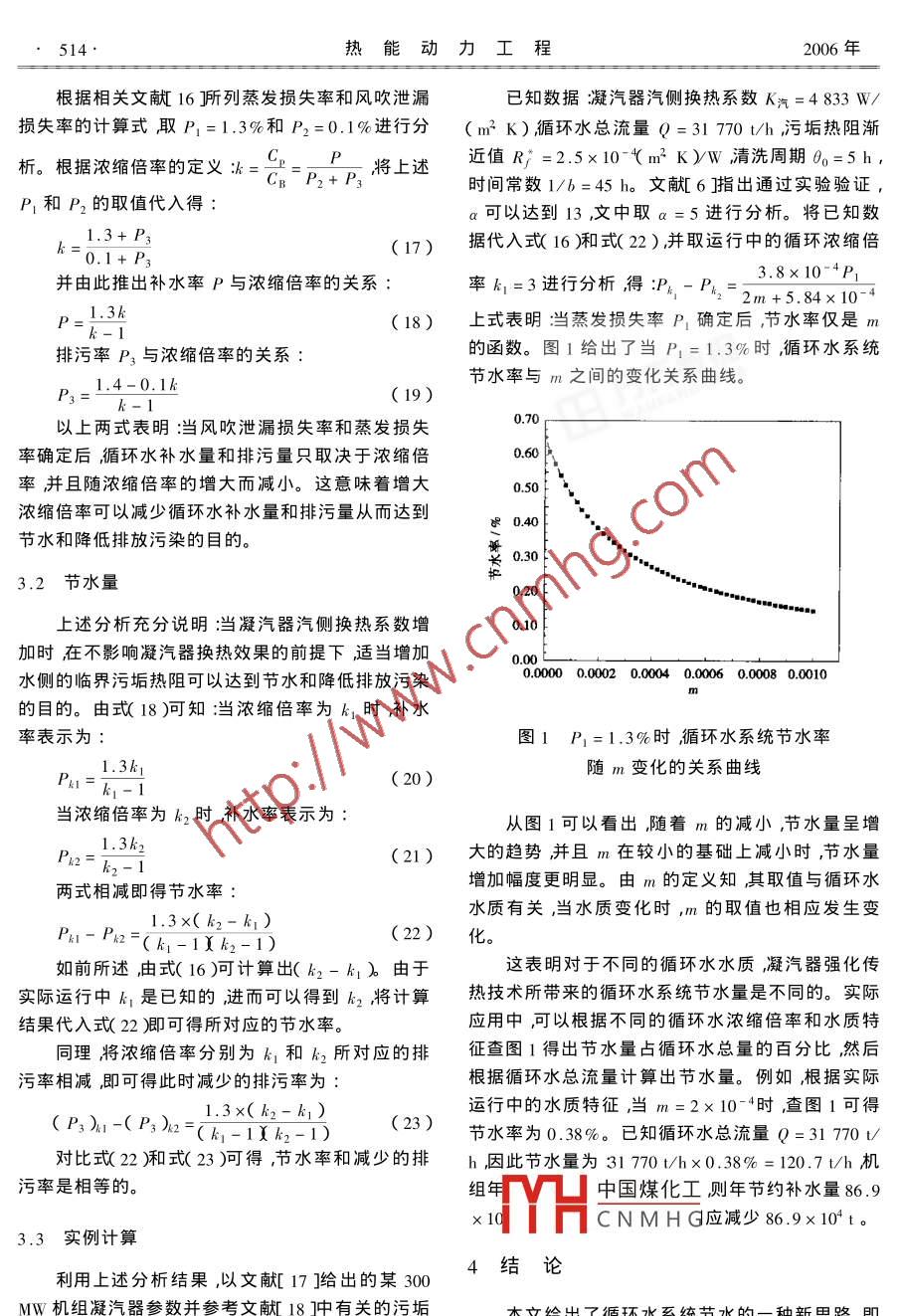 第21卷第5期能力程Vol.21 ,No.52006年9月JOURNAL OF ENGINEERING FOR THERMAL ENERGY AND POWERSep. , 2006文章編號:1001 - 2060( 2006 )05 - 0512 -04基于凝汽器強化傳熱技術的循環(huán)水系統(tǒng)節(jié)水研究王偉,孫奉仲高明,王凱(山東大學能源與動力工程學院,山東濟南250061 )摘要:從提高凝汽器換熱系數(shù)出發(fā) ,在保證真空不變的前由于冷卻水在循環(huán)利用過程中水分不斷蒸發(fā),提下引出臨界污垢熱阻的概念通過分析臨界污垢熱阻和水中難溶鹽離子濃度不斷增加,逐漸達到過飽和狀循環(huán)濃縮倍率的關系將強化傳熱和循環(huán)水節(jié)水問題結合起態(tài)從水中析出成垢11%。污垢熱阻的存在導致凝汽來研究并通過實例計算出相應的節(jié)水量。研究表明在凝器換熱系數(shù)降低。如果采用強化傳熱技術彌補由于汽器真空和其它換熱條件不變時增大凝汽器換熱管汽側換污垢熱阻的存在而減小的換熱系數(shù),則可保證凝汽熱系數(shù)可以增大臨界污垢熱阻,從而提高循環(huán)水的濃縮倍器的總換熱系數(shù)不變。如將能夠實現(xiàn)滴狀冷凝的換率達到循環(huán)水系統(tǒng)節(jié)水的目的并且?guī)砜捎^的節(jié)水效益和環(huán)保效益。文中分析了某300MW機組凝汽器采用強化熱管應用于凝汽器可大幅度提高管外換熱系數(shù)達傳熱管后汽側換熱系數(shù)顯著增大在達到原設計真空下,該到提高凝汽器總換熱系數(shù)的目的[7-10。因此在換機組每年因此可以節(jié)水約86.9x 10*t。熱效果不變的前提下強化換熱管所允許的污垢熱關鍵詞循環(huán)水系統(tǒng)節(jié)水凝汽器強化傳熱;臨界污垢阻肯定大于普通換熱管。這意味著,前者對循環(huán)水熱阻濃縮倍率水質的要求比后者低,此時可適當提高前者所對應的循環(huán)水濃縮倍率,達到節(jié)約循環(huán)水的目的。由于中圖分類號:TK124.7 TK212.2文獻標識碼:A循環(huán)水補水量減少,用于水質處理的藥劑量相應減1引言少,同時為維持循環(huán)水系統(tǒng)總流量不變系統(tǒng)排污量也相應減少。這樣,就從節(jié)能的角度不僅實現(xiàn)了節(jié)火力發(fā)電廠是耗能和耗水大戶,隨著能源意識水的目的還降低了藥劑處理費用減小了污水排放和節(jié)水環(huán)保意識的增強,人們已經開展了電站節(jié)能對環(huán)境造成的污染達到一舉數(shù)得的效果。和節(jié)水工作的研究[1-2]并且都在各自的領域取得本文基于上述思路把節(jié)能和節(jié)水的研究工作統(tǒng)了顯著成效。一起 來。電站中的節(jié)能工作開展的比較早人們嘗試使用各種方法提高換熱系數(shù),如新型換熱管件的引入2臨界污垢熱阻及其影響因素和各種強化換熱管的使用[3-6]。值得一提的是,目前電站普遍使用的凝汽器換熱管其汽側換熱方式2.1定義為膜狀冷凝然而現(xiàn)在國內外已有關于凝汽器換熱在汽輪機排汽參數(shù)和凝汽器結構一定以及抽氣管珠狀冷凝的研究[7-9],并將此項技術應用于實際設備正常工作的前提下,凝汽器達到規(guī)定的真空度運行汽側換熱系數(shù)將提高5~ 10倍10]。這樣凝汽所允許的水側污垢熱阻的最大值定義為臨界污垢熱器即使在相對較差的換熱條件下也可以維持規(guī)定的阻,記為Re。水側污垢熱阻超過該值時凝汽器真真空度。如機組夏季運行時凝汽器入口的循環(huán)水空將低于規(guī)定值。溫度比較高導致凝汽器真空度下降,-般情況下,清潔的凝汽器一般能滿足真空的要求,隨著運.現(xiàn)場通過增大循環(huán)水流量來維持凝汽器中一定的真行時間的增加水側污垢逐漸增加換熱管的換熱效空度這不僅增加了系統(tǒng)水耗而且也增加了循環(huán)水果降中國煤化工降低。當水側污垢增泵電耗,大大提高了運行成本。如果將強化換熱管大到|Y片CNMH G可以滿足要求但如果.引入凝汽器就可以在運行成本基本不變的情況下再增加真空就達不到規(guī)定值。保證凝汽器規(guī)定的真空度。收稿日期2006 -02-27 ;修訂日期2006 -05 -24作者簡介王保插_ ),女,山東聊城人山東大學碩士研究生現(xiàn)在山東電力研究院工作.第5期王偉等基于凝汽器強化傳熱技術的循環(huán)水系統(tǒng)節(jié)水研究513.2.2臨界污垢熱阻與汽側換熱系數(shù)的關系為討論汽側換熱系數(shù)與水側污垢熱阻之間的關Cp~ P2+ P3系,認為凝汽器換熱管汽側是潔凈的。凝汽器總換其中:Q- _循環(huán)冷卻水總流量(假定為常數(shù)),/h;熱系數(shù)表達式可表示為:p-補水率,即:補充水量占循環(huán)水總流量的百分K°Kσ+Kx+°+Rf(1)數(shù),%;P-蒸發(fā)損失率,即:單位時間的蒸發(fā)損失占循環(huán)水總流量的百分數(shù),% ;P,- -風吹泄漏損失水側污垢熱阻增大到臨界污垢熱阻時的凝汽器率即:單位時間的風吹泄漏損失量占循環(huán)水總流量總換熱系數(shù)定義為臨界換熱系數(shù),記為K。其物理的百分數(shù),%;Pz--排污率,即:排污水量占循環(huán)水意義為:在汽輪機排汽參數(shù)和凝汽器結構一定以及總流量的百分數(shù),% ;Cg- 補充水的鹽濃度;C,- -循抽氣設備正常工作的前提下,只要凝汽器換熱管的環(huán)水的鹽濃度;k-濃縮倍率??倱Q熱系數(shù)大于該臨界值凝汽器真空就可以滿足Rj隨水質的變化而變化[14] ,在其它條件不變.規(guī)定值的要求。臨界換熱系數(shù)的表達式為:時,且把R/看成濃縮倍率的函數(shù)并忽略循環(huán)水水(2)質對時間常數(shù)