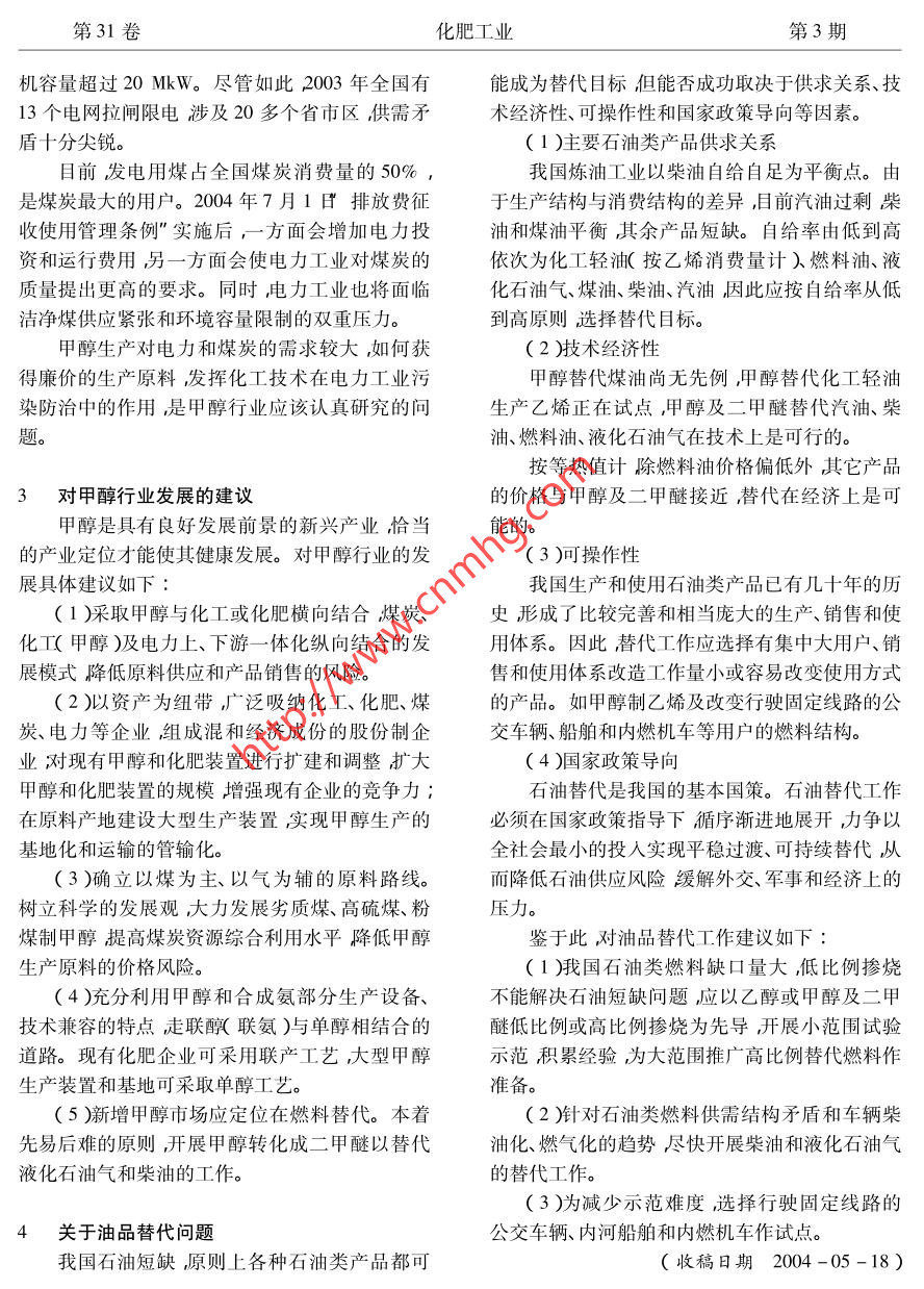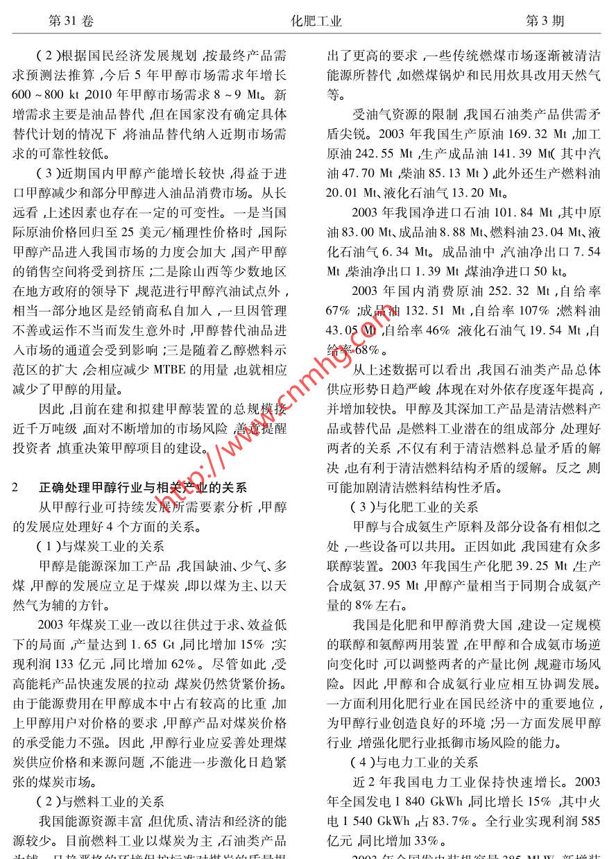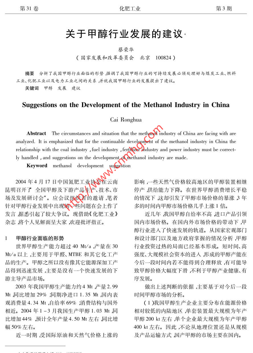 第31卷化肥工業(yè)第3期關(guān)于甲醇行業(yè)發(fā)展的建議.蔡榮華(國(guó)家發(fā)展和改革委員會(huì) 北京100824 )摘要分析了我國(guó)甲醇行業(yè)面臨的形勢(shì) 強(qiáng)調(diào)了我國(guó)甲醇行業(yè)的可持續(xù)發(fā)展必須處理好與煤炭工業(yè)、燃料工業(yè)、化肥工業(yè)以及電力工業(yè)之間的關(guān)系并就我國(guó)甲醇行業(yè)的發(fā)展提出了建議。關(guān)鍵詞甲醇發(fā)展建議Suggestions on the Development of the Methanol Industry in ChinaCai RonghuaAbstract The circumstances and situation that the methanol industry of China are facing with areanalyzed. It is emphasized that for the continuable development of the methanol industry in China therelationship with the coal industry , fuel industry , fertilizer industry and power industry must be correct-ly handled , and suggestions on the development of methanol industry are made.Keyword methanol development suggestion2004年4月17日中國(guó)氮肥工業(yè)協(xié)會(huì)在云南影響一些天然氣價(jià)格較高地區(qū)的甲醇裝置相繼昆明召開了”全國(guó)甲醇及下游產(chǎn)品生產(chǎn)、技術(shù)、市停產(chǎn)供給能力下降。在世界甲醇消費(fèi)增長(zhǎng)平穩(wěn)場(chǎng)及發(fā)展研討會(huì)”。應(yīng)會(huì)議組織者的邀請(qǐng)筆者的情況下這卻引發(fā)了甲醇市場(chǎng)價(jià)格的暴漲3年針對(duì)甲醇行業(yè)發(fā)展中出現(xiàn)的一些問題在會(huì)上作了多的時(shí)間內(nèi)甲醇市場(chǎng)價(jià)格幾乎上漲1倍。發(fā)言據(jù)悉引起了較大爭(zhēng)議?,F(xiàn)借助《化肥工業(yè)》近幾年我國(guó)甲醇自給率不高進(jìn)口產(chǎn)品引領(lǐng)雜志將個(gè)人見解面呈大家歡迎批評(píng)指正。國(guó)內(nèi)市場(chǎng)價(jià)格。在國(guó)內(nèi)外市場(chǎng)價(jià)格的帶動(dòng)下甲醇行業(yè)進(jìn)入了快速發(fā)展的軌道。從國(guó)家宏觀部門甲醇行業(yè)面臨的形勢(shì)和設(shè)計(jì)部門以及地方政府掌握的情況分析,甲醇世界甲醇生產(chǎn)能力超過40 Mt/a產(chǎn)量在30行業(yè)投資過熱的局面已經(jīng)基本形成。短時(shí)間、高M(jìn)t/a以上,主要用于甲醛、MTBE和其它化工產(chǎn)強(qiáng)度、大規(guī)模社會(huì)資本的進(jìn)入形成的甲醇產(chǎn)能在品的生產(chǎn)。甲醇之所以沒有像其它能源深加工產(chǎn)今后- .段時(shí)間內(nèi)若不能得到合理釋放有可能導(dǎo)品得到迅速發(fā)展,主要是沒有一一個(gè)快速發(fā)展的下致甲醇價(jià)格大幅度下滑不利于甲醇產(chǎn)業(yè)健康、有游主導(dǎo)產(chǎn)品市場(chǎng)。序發(fā)展。2003年我國(guó)甲醇生產(chǎn)能力約4 Mt產(chǎn)量2. 99做出.上述判斷的依據(jù),主要基于對(duì)今后一段Mt同比增加29% ;洞期凈進(jìn)口1.35 Mt ,國(guó)內(nèi)表時(shí)間甲醇市場(chǎng)的分析。觀消費(fèi)量4.34Mt,自給率69%消費(fèi)結(jié)構(gòu)與國(guó)外(1)我國(guó)甲醇生產(chǎn)企業(yè)主要分布在能源價(jià)格相近。2004 年1 -3月我國(guó)生產(chǎn)甲醇1.03 Mt同相對(duì)較低的內(nèi)陸地區(qū),單套裝置最大規(guī)模為年產(chǎn)比增加44%預(yù)計(jì)全年產(chǎn)量4. 50 Mt左右同比增甲醇200kt左右單個(gè)企業(yè)最大規(guī)模為年產(chǎn)甲醇幅50%左右。400 kt左右。因此,不論從地理位置還是從規(guī)模近一時(shí)期受國(guó)際原油和天然氣價(jià)格上漲的及產(chǎn)品運(yùn)輸方式國(guó)產(chǎn)甲醇的市場(chǎng)主要在國(guó)內(nèi)。*本文作者的聯(lián)系電話010 - 68502583第31卷化肥工業(yè)第3期(2)根據(jù)國(guó)民經(jīng)濟(jì)發(fā)展規(guī)劃按最終產(chǎn)品需出了更高的要求一些傳統(tǒng)燃煤市場(chǎng)逐漸被清潔求預(yù)測(cè)法推算今后5年甲醇市場(chǎng)需求年增長(zhǎng)能源所替代如燃煤鍋爐和民用炊具改用天然氣600 ~800 kt 2010年甲醇市場(chǎng)需求8~9 Mt。新等。增需求主要是油品替代但在國(guó)家沒有確定具體受油氣資源的限制我國(guó)石油類產(chǎn)品供需矛替代計(jì)劃的情況下將油品替代納人近期市場(chǎng)需盾尖銳。2003 年我國(guó)生產(chǎn)原油169.32 Mt ,加工求的可靠性較低。原油242.55 Mt 生產(chǎn)成品油141.39 M(其中汽( 3 )近期國(guó)內(nèi)甲醇產(chǎn)能增長(zhǎng)較快得益于進(jìn)油47.70 Mt柴油85. 13 Mt )此外還生產(chǎn)燃料油口甲醇減少和部分甲醇進(jìn)人油品消費(fèi)市場(chǎng)。從長(zhǎng)20.01 Mt、 液化石油氣13. 20 Mt。遠(yuǎn)看上述因素也存在一-定的可變性。--是當(dāng)國(guó)2003年我國(guó)凈進(jìn)口石油101.84 Mt ,其中原際原油價(jià)格回歸至25美元/桶理性價(jià)格時(shí),國(guó)際油83.00Mt、成品油8.88Mt、燃料油23.04Mt、液甲醇產(chǎn)品進(jìn)人我國(guó)市場(chǎng)的力度會(huì)加大國(guó)產(chǎn)甲醇化石油氣6.34 Mt。成品油中汽油凈出口7. 54的銷售空間將受到擠壓二是除山西等少數(shù)地區(qū)Mt柴油凈出口1.39 Mt煤油凈進(jìn)口50 kt。在地方政府的領(lǐng)導(dǎo)下規(guī)范進(jìn)行甲醇汽油試點(diǎn)外,2003年國(guó)內(nèi)消費(fèi)原油252.32Mt,自給率相當(dāng)--.部分地區(qū)是經(jīng)銷商私自加入,一旦因管理67% ;成品油132.51 Mt ,自給率107% ;燃料油不善或運(yùn)作不當(dāng)而發(fā)生意外時(shí),甲醇替代油品進(jìn)43.05 Mt ,自給率46%液化石油氣19.54 Mt ,自人市場(chǎng)的通道會(huì)