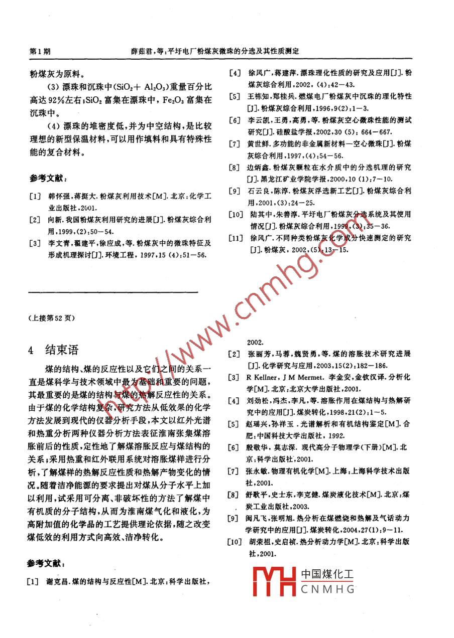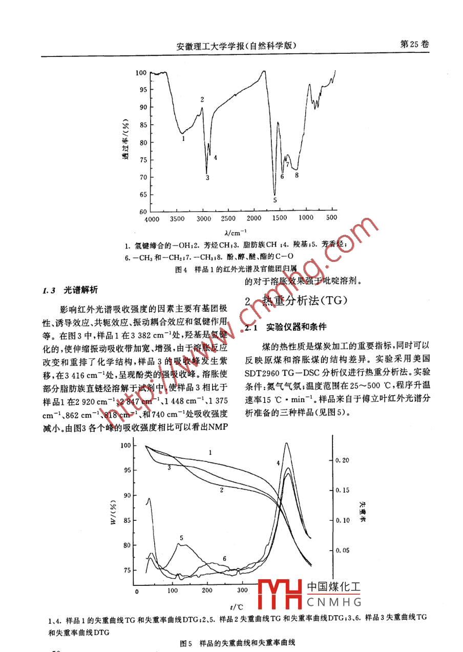 第25卷第1期安徽理工大學學報(自然科學版)Vol 25 No. 12005年3月Journal of Anhui University of Science and Technology(Natural Science)ar.2005溶脹煤的紅外光譜及熱重分析研究劉先建1,范肖南,武建軍2,武成利3,張中良3(1.安礅理工大學材料科學與工程系,安徽淮南232001;2.中國礦業(yè)大學化工學院,江蘇徐州221008;3.安徽理工大學化學工程系,安徽淮南232001)摘要:煤是由多種有機高分子化合物和礦物質(zhì)組成的復雜混合物,而煤結(jié)構(gòu)的研究內(nèi)容主要是針對煤中的有機物質(zhì)化學結(jié)構(gòu)的研究。煤的化學結(jié)構(gòu)決定了其多種反應性,所以煤化學結(jié)構(gòu)的研究一直都是煤結(jié)枃研究中的重要的研究課題。而煤的溶脹冇法能夠提供較多關于煤的化學結(jié)枃消息,用傅立葉紅外光譜法,熱重分析法兩種手役對去灰煤樣、酒精和蒸餾水洗靜吡啶溶脹煤樣和NMP二次溶脹煤樣進行化學結(jié)構(gòu)與熱解性質(zhì)的分析,表征煤溶脹前后結(jié)構(gòu)與熱解反應性質(zhì)的變化情況,定性地認識煤的溶脹反應過程。采用熱重和紅外光譜法聯(lián)用分析NMP二次溶脹煤樣,依據(jù)紅外光譜了解熱解過程中產(chǎn)物。這些工作有助于對淮南地區(qū)煤化學結(jié)構(gòu)和熱解反應性的研究。關鍵詞:溶脹煤;傅立葉變換紅外光譜;熱重分析;熱重一變換紅外光譜分析中圖分類號:O657文獻標識碼:A文章編號:1672-1098(2005)01-004805Study on Swelling Coal by Using IR and Thermal AnalysisLIU Xian-jian', FAN Xiao-nan, WU jian-jun, WU cheng-liZHANG Zhong-liang(l. Dept. of Material Science and Engineering, Anhui University of Science and Technology, Huainan Anhui 23201, China2. School of Chemical Engineering and Technology, China University of mining and Technology, Xuzhou Jiangsu 221008China: 3. Dept. of Chemical Engineering, Anhui University of Science and Technology, Huainan Anhui 232001, ChinAbstract The reactivity of coal is determined by its structure, and the structure information of coal canbe obtained through the swelling of coal. The chemical structure and pyrolysis reactivity of coal areanalyzed. The changes of structure and the pyrolysis reactivity before and after swelling are respectivelycharacterized. The process of swelling reaction is recognized qualitatively by FTIR, TG, TG-FTIR.This will contribute to the research of the structure and reactivity of coal in the area of huainan.Key words: swelling coal + FTIR; TG analysis TG-FTIR analysis引言去除后,煤中的大分子結(jié)構(gòu)發(fā)生重排,形成較強的πx鍵,而小分子相與網(wǎng)絡結(jié)構(gòu)相連的物理和化學煤的溶脹是煤的一種重要性質(zhì),它是利用煤所力明顯減弱,煤結(jié)構(gòu)的自由能降低。溶脹可用于煤具有的供氫和受氫能力,在親電和親核試劑作用的化學結(jié)構(gòu)煤的熱解和加氫液化反應研究中對下,打破小分子相和結(jié)構(gòu)單元間的弱鍵,使煤樣的于研究煤的結(jié)構(gòu)提高焦油產(chǎn)率和煤炭液化、轉(zhuǎn)化體積膨脹,結(jié)構(gòu)改變和重排。煤的溶脹反應過程是效右邶斗雷的地忌音不可逆的,其中非共價鍵的斷裂是主要特征。溶劑紅中國煤化工,本實驗以傅立葉開(TG)和熱重反CNMHG收稿日期:2004-11-08作者簡介劉先建(1979一),男,江蘇南通人,在讀碩士,研究方向:煤的化學結(jié)構(gòu)研究。方數(shù)據(jù)第1期劉先建,等:溶脹煤的紅外光譜及熱重分析研究應器一紅外光譜聯(lián)用分析(TGA-FTIR)三種手1傅立葉紅外光譜分析(FTIR)段對溶脹煤進行分析,希望得到溶脹前后煤的紅外光譜及熱性質(zhì)變化的消息,以進一步增進對煤化學1.1樣品制備結(jié)構(gòu)的認識。以下是國外研究者提出的煤的化學和物理結(jié)構(gòu)模型。煤樣采自淮南張集礦區(qū),粉碎至過200目篩,OH SH經(jīng)酸處理去灰。對去灰的煤樣命名為樣品1,進行吡HCChG啶溶劑的溶脹實驗,命名用酒精和蒸餾水洗凈溶脹后的煤樣為樣品2,在充氮的干燥箱中干燥,再次用OHNHzN一甲基-2-吡咯烷酮(NMP)對樣品2進行溶CHeCHH所5脹,去除溶劑后在充氮的干燥箱中干燥4h得到樣品3,冷卻后保持在充氮的干燥器中備用1.2FTIR光譜分析用KBr壓片法,稱取1.5mg煤樣和300mg干燥后的KBr,一起放入磨樣機內(nèi),研磨30min使之HC充分混合。KBr壓片在WS70-1型紅外線快速干燥器中干燥2h,在 Bruker- Tensor37紅外光譜分析儀上進行,波數(shù)范圍從400cm-1到4000cm-1圖1化學結(jié)構(gòu)模型( Wiser模型)分辨率為4cm-1,樣品掃描次數(shù)為64次,以獲得高質(zhì)量的紅外光譜圖,扣除水蒸汽峰和大氣的影響。環(huán)(見圖3、圖4)小分子化學鍵圖2物理結(jié)構(gòu)模型(兩相模型)l0075100035003000250020oH中國煤化工CNMHG1.樣品1;2.樣品2;3樣品3圖3三種樣品的紅外光譜圖49安徽理工大學學報(自然科學版)第25卷03850640003500300025002000150010005001.氫鍵締合的一OH;2.芳烴CH;3.脂肪族CH;4.羧基;5.芳香烴;6.-CH3和一CH2;7.一CH2;8.酚、醇、醚、酯的C-O圖4樣品1的紅外光譜及官能團歸屬的對于溶脹效果強于吡啶溶劑1.3光譜解析影響紅外光譜吸收強度的因素主要有基團極2熱重分析法(TG)性、誘導效應共軛效應、振動耦合效應和氫鍵作用等。在圖3中,樣品1在3382cm處,羥基是氫鍵2.1實驗儀器和條件化的,使伸縮振動吸收帶加寬、增強,由于溶脹反應煤的熱性質(zhì)是煤炭加工的重要指標,同時可以改變和重排了化學結(jié)構(gòu),樣品3的吸收峰發(fā)生紫反映原煤和溶脹煤的結(jié)構(gòu)差異。實驗采用美國移,在3416cm-處,呈現(xiàn)酚