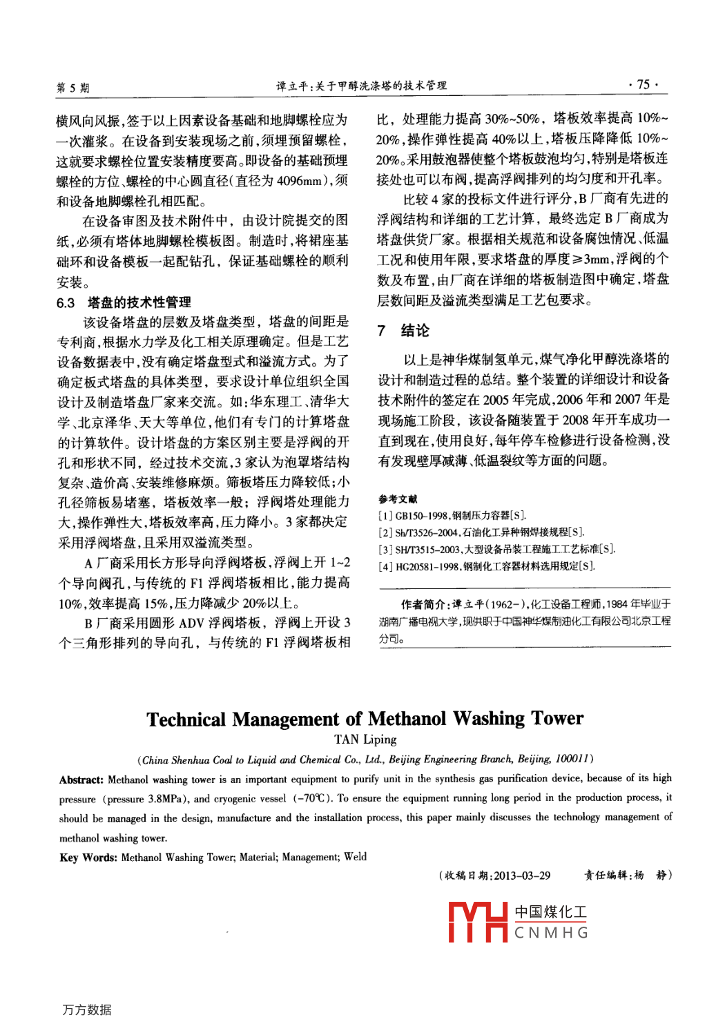 關于甲醇洗滌塔的技術管理