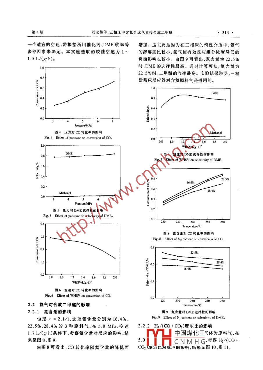 2004年第33卷第4期PE'TROHEMICAL TECHNOLOGY三相床中含氮合成氣直接合成二甲醚劉宏偉,劉殿華,應(yīng)衛(wèi)勇(華東理工大學(xué)化學(xué)工程系,上海200237)擴(kuò)要]在情性介質(zhì)機(jī)械攪拌三相床反應(yīng)器中研究含氮合成氣直接合成二甲醚的工藝使用混合型雙功能催化劑,粒徑為015-018m實(shí)驗(yàn)結(jié)果表明,較佳的實(shí)驗(yàn)條件為:溫度240-260℃壓力70MPa空速10-1.5L/(gh)。以獲得的三相床宏觀動(dòng)力學(xué)方程為基礎(chǔ)依據(jù)不同氮含量時(shí)的宏觀動(dòng)力學(xué)反應(yīng)速率常數(shù)的計(jì)算結(jié)果,證實(shí)以各組分選度表示的三相床宏觀動(dòng)力學(xué)模型適用于含氮合成氣合成二甲醚的動(dòng)力學(xué)計(jì)算關(guān)鍵詞]二甲醚;三相床反應(yīng)器;含氮合成氣;宏觀動(dòng)力學(xué);催化;雙功能催化劑[文章編號(hào)]10008142004)04031105中圖分類(lèi)號(hào)]TQ223.24文獻(xiàn)標(biāo)識(shí)碼]A二甲醚(DME是一種重要的化工產(chǎn)品和清潔司;CO2,純度99%,上海吳涇化工總廠;N2,純?nèi)剂?。二甲醚的十六烷值?可替代柴油作為車(chē)度9999%,上海比歐西氣體工業(yè)有限公司。惰性用燃料排氣污染少,也可替代液化石油氣作民用燃液相熱載體:上海菲達(dá)工貿(mào)有限公司和橋分公司,每料。此外由于其沸點(diǎn)低、汽化熱大、對(duì)環(huán)境無(wú)污染、毒次實(shí)驗(yàn)用量為300ml性低,又可廣泛用于制冷劑、氣霧劑。二甲醚還是精1.2裝置細(xì)化工領(lǐng)域良好的烷基化劑12),也可用于制取烯烴。三相床合成二甲醚實(shí)驗(yàn)流程圖見(jiàn)圖1。原料氣二甲醚的生產(chǎn)方法主要有甲醇脫水法和合成氣的流量由質(zhì)量流量計(jì)控制尾氣由皂膜流量計(jì)計(jì)量。直接合成法。直接合成法是將甲醇合成催化劑與甲反應(yīng)溫度由智能溫控儀控制;反應(yīng)壓力由反應(yīng)器前醇脫水催化劑混合,使合成甲醇、甲醇脫水及一氧化的減壓穩(wěn)壓閥和反應(yīng)器后的背壓閥共同控制。反應(yīng)碳變換反應(yīng)同時(shí)進(jìn)行,其優(yōu)點(diǎn)是能及時(shí)將甲醇轉(zhuǎn)化器為500ml磁力攪拌高壓反應(yīng)釜。催化劑用含H2成二甲醚打破了甲醇合成過(guò)程中熱力學(xué)平衡的限體積分?jǐn)?shù)5%的N2氣進(jìn)行還原活化,升溫速率小于制,使CO的轉(zhuǎn)化率更高,但是甲醇合成與脫水兩個(gè)0.5℃/min,并在180℃恒溫10h,在230℃恒溫5串聯(lián)的反應(yīng)均是強(qiáng)放熱反應(yīng)及時(shí)移走反應(yīng)熱防止h,然后在實(shí)驗(yàn)溫度切換原料氣進(jìn)行反應(yīng)。催化劑過(guò)熱失活變得特別重要。三相淤漿床反應(yīng)器由于存在大量導(dǎo)熱性能好、熱容大的惰性液相載體,(FID)(TCD)便于及時(shí)移出反應(yīng)熱并維持反應(yīng)器恒溫,因而用三Mass flow geuge相淤漿床合成二甲醚成為近幾年研究的熱點(diǎn)3-7天然氣空氣催化氧化及以煤為原料制得的半水煤氣是含氮合成氣,天然氣空氣催化氧化由于減少了空分Slurry reactor裝置而大幅度降低了合成氣的成本。為了減少含氮Soap flow gauge原料氣的循環(huán)壓縮功,需要較高的單程轉(zhuǎn)化率8,未Thermometer轉(zhuǎn)化的OO,F2可用于燃?xì)廨啓C(jī)發(fā)電。圖1三相床合成二甲醚實(shí)驗(yàn)流程圖本工作探討三相淤漿床中含氮合成氣直接合成二Fig 1 Schematic diAgram of experimental apparatus甲醚的工藝條件研究原料氣中氮含量對(duì)反應(yīng)的影響。with slurry reactor.1.3分析方法實(shí)驗(yàn)部分原料氣及尾氣中的無(wú)機(jī)氣體由中國(guó)科學(xué)院天樂(lè)1.1原料精密科學(xué)儀器有限公司生產(chǎn)的GC900B型熱導(dǎo)檢測(cè)催化劑:商用混合型催化劑,西南化工研究院提供(甲醇合成催化劑與甲醇脫水催化劑粒度為0,15收稿期117「峰改瑾日期1m0401-020.18mm,按質(zhì)量比1/混合,催化劑總質(zhì)量為10作者YH中國(guó)煤化工市人博土生,電話01g)。原料氣:H2,純度99,9%,上?;ぱ芯吭?CNMHG聯(lián)系人:應(yīng)衛(wèi)勇,電CO,純度99.82%,上海雷磁創(chuàng)益儀器儀表有限公薔金項(xiàng)目]上海市重點(diǎn)學(xué)科建設(shè)項(xiàng)目資助石油化工312PETROCHEMICAL TECHNOLOGY004年第33卷氣相色譜儀在線分析,色譜柱為T(mén)DX01,柱長(zhǎng)2m,氬氣為載氣;尾氣中的有機(jī)物由中國(guó)科學(xué)院天樂(lè)精密科學(xué)儀器有限公司生產(chǎn)的GC900A型氫火焰離子化檢測(cè)氣相色譜儀在線分析,色譜柱為GDX-401,柱長(zhǎng)2m,氮?dú)鉃檩d氣。產(chǎn)物中除二甲醚、甲醇外其它有機(jī)物很少,在計(jì)算時(shí)可忽略。2結(jié)果與討論合成氣一步法制二甲醚的主要反應(yīng)有CO+2H2←CH3OH圖2溫度對(duì)CO轉(zhuǎn)化率的影響O2+ 3H2 PCH3 OH+HoFig 2 Effect of temperature on conversion of CoCH3OH←CH3OCH+H2OCO+CopCo t H,2CO+4H2 OCH3+ R2OO轉(zhuǎn)化率、產(chǎn)物的選擇性及二甲醚的收率由式(7)~式(11)進(jìn)行計(jì)算。Inout)/ninx(7)圖3溫度對(duì)選擇性的影響YDME=NinI oin XooSp(11)Fig- 3 Effect of temperature on selectivity of DME2.1工藝條件的考察該反應(yīng)體系是總化學(xué)計(jì)量數(shù)減少的反應(yīng)。從圖2.1.1反應(yīng)溫度的影響4可清楚看出,增加壓力對(duì)提高CO轉(zhuǎn)化率有利。采用氮含量(體積分?jǐn)?shù),下同)為34.98%、H2/由圖5可看出,DME的選擇性與甲醇的選擇性均隨(CO+CO2)摩爾比(r)為2.1/1的原料氣,在7.0壓力的增