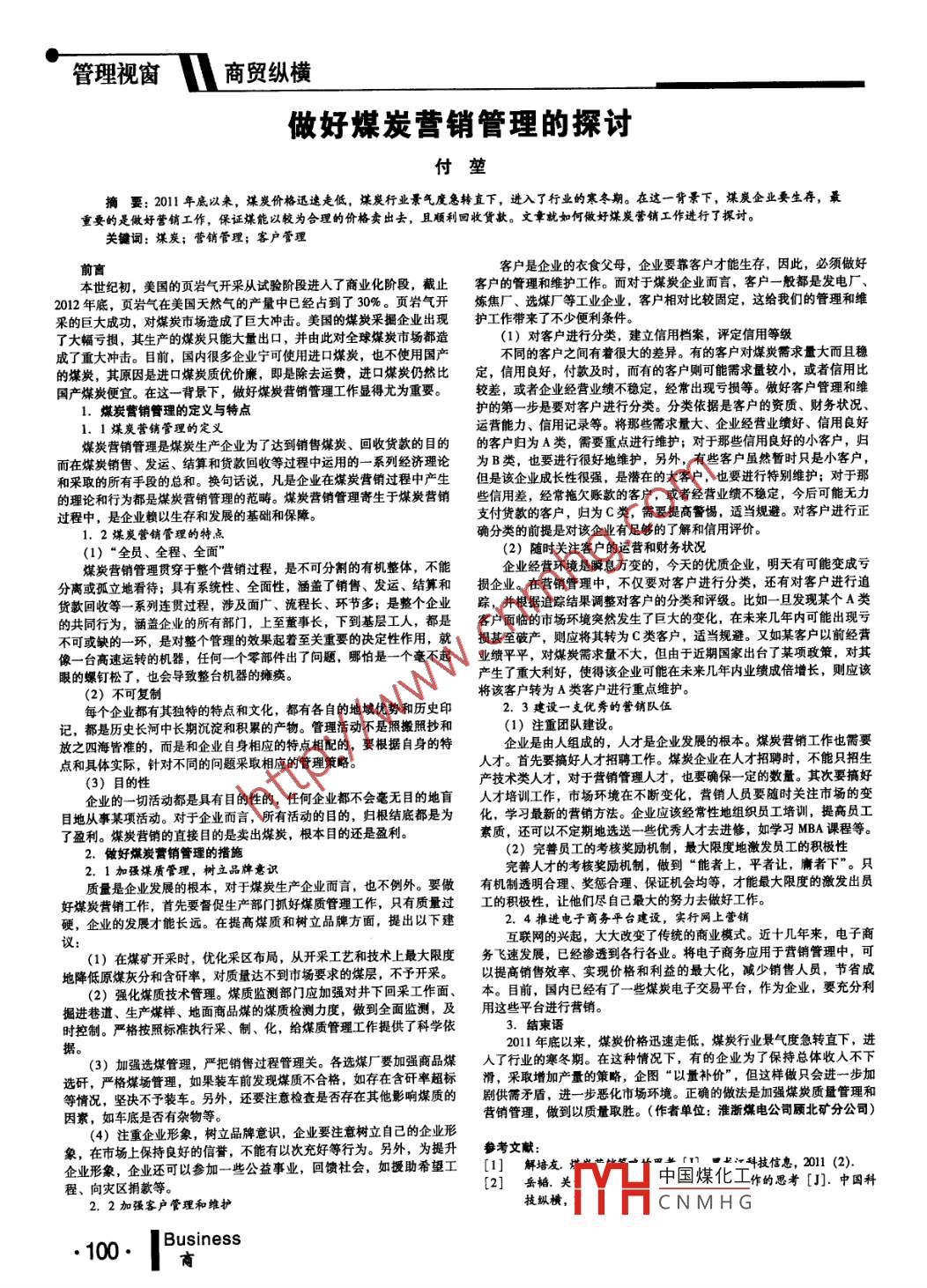 管理視窗商貿(mào)縱橫做好媒炭營銷管理的探討付堃摘要:2011年底以來,煤炭價格迅速走低,煤炭行業(yè)景氣度急轉(zhuǎn)直下,進入了行業(yè)的寒冬期。在這一背景下,煤炭企業(yè)要生存,最重要的是做妤營銷工作,保證煤能以較為合理的價格賣出去,且順利回收貨款。文章就如何做好煤炭營銷工作進行了探討。關(guān)鑣詞:煤炭;營銷管理;客戶管理前宮客戶是企業(yè)的衣食父母,企業(yè)要靠客戶才能生存,因此,必須做好本世紀(jì)初,美國的頁巖氣開采從試驗階段進入了商業(yè)化階段,截止客戶的管理和維護工作。而對于煤炭企業(yè)而言,客戶一般都是發(fā)電廠、2012年底,頁巖氣在美國天然氣的產(chǎn)量中已經(jīng)占到了30%。頁巖氣開煉焦廠、選煤廠等工業(yè)企業(yè),客戶相對比較固定,這給我們的管理和維采的巨大成功,對煤炭市場造成了巨大沖擊。美國的煤炭采掘企業(yè)出現(xiàn)護工作帶來了不少便利條件。了大幅虧損,其生產(chǎn)的煤炭只能大量出口,并由此對全球煤炭市場都造(1)對客戶進行分類,建立信用檔案,評定信用等級成了重大沖擊。目前,國內(nèi)很多企業(yè)寧可使用進口煤炭,也不使用國產(chǎn)不同的客戶之間有著很大的差異。有的客戶對煤炭需求量大而且穩(wěn)的煤炭,其原因是進口煤炭質(zhì)優(yōu)價廉,即是除去運費,進口煤炭仍然比定,信用良好,付款及時,而有的客戶則可能需求量較小,或者信用比國產(chǎn)煤炭便宜。在這一背景下,做好煤炭營銷管理工作顯得尤為重要。較差,或者企業(yè)經(jīng)營業(yè)績不穩(wěn)定,經(jīng)常出現(xiàn)虧損等。做好客戶管理和維1.煤炭營銷管理的定義與特點護的第一步是要對客戶進行分類。分類依據(jù)是客戶的資質(zhì)、財務(wù)狀況1.l1煤炭營鋪管理的定義運營能力、信用記錄等。將那些需求量大、企業(yè)經(jīng)營業(yè)績好、信用良好煤炭營銷管理是煤炭生產(chǎn)企業(yè)為了達到銷售煤炭、回收貨款的目的的客戶歸為A類,需要重點進行維護;對于那些信用良好的小客戶,歸而在煤炭銷售、發(fā)運、結(jié)算和貨款回收等過程中運用的一系列經(jīng)濟理論為B類,也要進行很好地維護,另外,有些客戶雖然暫時只是小客戶,和采取的所有手段的總和。換句話說,凡是企業(yè)在煤炭營銷過程中產(chǎn)生但是該企業(yè)成長性很強,是潛在的大客戶,也要進行特別維護;對于那的理論和行為都是煤炭營銷管理的范疇。煤炭營銷管理寄生于煤炭營銷些信用差,經(jīng)常拖欠賬款的客戶,或者經(jīng)營業(yè)績不穩(wěn)定,今后可能無力過程中,是企業(yè)賴以生存和發(fā)展的基礎(chǔ)和保障。支付貨款的客戶,歸為C類,需要提高警惕,適當(dāng)規(guī)避。對客戶進行正1.2煤炭營銷管理的特點確分類的前提是對該企業(yè)有足夠的了解和信用評價。(1)“全員、全程、全面”(2)隨時關(guān)注客戶的運營和財務(wù)狀況煤炭營銷管理貫穿于整個營銷過程,是不可分割的有機整體,不能企業(yè)經(jīng)營環(huán)境是瞬息萬變的,今天的優(yōu)質(zhì)企業(yè),明天有可能變成虧分離或孤立地看待;具有系統(tǒng)性、全面性,涵蓋了銷售、發(fā)運、結(jié)算和損企業(yè)。在營銷管理中,不僅要對客戶進行分類,還有對客戶進行迫貨款回收等一系列連貫過程,涉及面廣、流程長、環(huán)節(jié)多;是整個企業(yè)蹤,并根據(jù)迫蹤結(jié)果調(diào)整對客戶的分類和評級。比如一旦發(fā)現(xiàn)某個A類的共同行為,涵蓋企業(yè)的所有部門,上至董事長,下到基層工人,都是客戶面臨的市場環(huán)境突然發(fā)生了巨大的變化,在未來幾年內(nèi)可能出現(xiàn)虧不可或缺的一環(huán),是對整個管理的效果起著至關(guān)重要的決定性作用,就損甚至破產(chǎn),則應(yīng)將其轉(zhuǎn)為C類客戶,適當(dāng)規(guī)避。又如某客戶以前經(jīng)營像一臺高速運轉(zhuǎn)的機器,任何一個零部件出了問題,哪怕是一個毫不起業(yè)績平平,對煤炭需求量不大,但由于近期國家出臺了某項政策,對其眼的螺釘松了,也會導(dǎo)致整臺機器的癱瘓。產(chǎn)生了重大利好,使得該企業(yè)可能在未來幾年內(nèi)業(yè)績成倍增長,則應(yīng)該(2)不可復(fù)制將該客戶轉(zhuǎn)為A類客戶進行重點維護。每個企業(yè)都有其獨特的特點和文化,都有各自的地域優(yōu)勢和歷史印2.3建設(shè)一支優(yōu)秀的營銷隊伍記,都是歷史長河中長期沉淀和積累的產(chǎn)物。管理活動不是照搬照抄和(1)注重團隊建設(shè)。放之四海皆準(zhǔn)的,而是和企業(yè)自身相應(yīng)的特點相配的,要根據(jù)自身的特企業(yè)是由人組成的,人才是企業(yè)發(fā)展的根本。煤炭營銷工作也需要點和具體實際,針對不同的問題采取相應(yīng)的管理策略。人才。首先要搞好人才招聘工作。煤炭企業(yè)在人才招聘時,不能只招生(3)目的性產(chǎn)技術(shù)類人才,對于營銷管理人才,也要確保一定的數(shù)量。其次要搞好企業(yè)的一切活動都是具有目的性的,任何企業(yè)都不會毫無目的地盲人才培訓(xùn)工作,市場環(huán)境在不斷變化,營銷人員要隨時關(guān)注市場的變目地從事某項活動。對于企業(yè)而言,所有活動的目的,歸根結(jié)底都是為化,學(xué)習(xí)最新的營銷方法。企業(yè)應(yīng)該經(jīng)常性地組織員工培訓(xùn),提高員工了