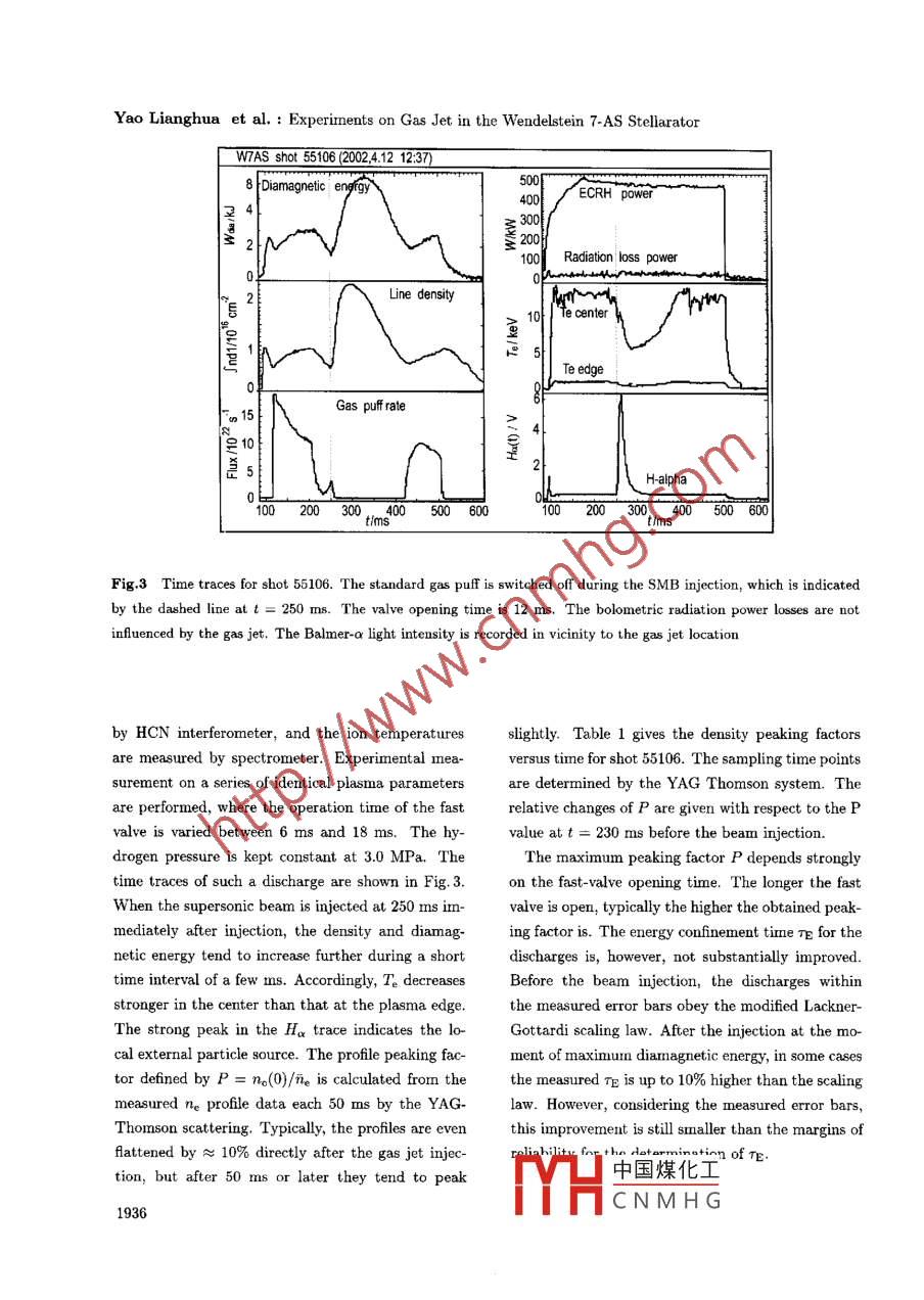 Plasma Science Technology, Vol 5, No 5(2003)Experiments on Gas Jet in the Wendelstein 7-as Stellarator*Yao lianghua(姚良驊)1, J. Baldzuhn21 Southwestern Institute of Physics, Chengdu 610041, China0+ AMax-Planck Institut fuer Plasma physik, EURATOM Ass, 17491 GreifswaldGermanyAbstract Wendelstein 7-AS(W7-AS)pertains to an advanced helical stellarator. A new fu-elling method, the supersonic molecular beam injection(SMBI, named Gas Jet in Germany)system was installed in W7-AS in May 2001 as a cooperation research item co-supported by theNational Nature Science Foundation of China and the Max -Planck Institute of Plasma PhysicsGarching, Germany. The experiments of the gas jet with hydrogen or deuterium on W7-AS wereimplemented. The experimental results exhibit the following features such as high fuelling ef-ficiency, stable high-density plasmas and reduction of the recycling fluxes from the vessel wallduring injection. These crucial points show that the new fuelling method can be applied to longand stable discharges.Keywords: gas jet(Supersonic Molecular Beam) injection, wendelstein 7-AS stellarator,fuellingPACs:52.50G,52.55.H1 Introductioncooperation research co-supported by the NationalNature Science foundation of china and the maxOn the 19th IAEA Fusion Energy ConferencePlanck Institute of Plasma Physics, Garching, Ger(Lyon, France, 14 N 19 October 2002), Prof. Fmany, a new fuelling method, the supersonic molecWagner said(l:"After nearly 14 years with 56953gas jet indischarges, W7-AS has been suspended from opera- many)systern 2) had been applied to W7-AS in Maytion.The device is now mothballed. The develop- 2001. The experiments of the gas jet with hydrogenment of the Wendelstein stellarator line will go on or deuterium on W7-AS have been implemented forwith the w7-X device. The major goals of W7-ASare to test the modular coil concept, to demonstratethe effectiveness of the first steps toward an opti- 2 Magnetic confinement andmized stellarator design, and to develop an exhaustheating system of W7-ASconcept based on the nat ural island chain which firmsup the plasma boundary. W7-AS has contributed toW7-As pertains to an advanced helical stellaratorareasof stellarator and fusion researchwith a major radius of 2 m and a plasma radius inTwo years before the W7-AS was mothballed. a the range of 0.11 m to 0. 18The project supported by the National Nature Science Foune中國(guó)煤化工1005060 and the ChinaNuclear Industry Science Foundation( No. 94C03033)YHCNMHGYao Lianghua et al.: Experiments on Gas Jet in the Wendelstein 7-AS Stellaratormoula" corner coiltriangularplatelliot cal planeLasma tr Midal lichI ccilFig 1 Magnetic confinement coil system and limiters of W7-ASstructure of w7-As with limiters is shown as inThe orientation of gas jet injection(GJI)systemFig 1. W7-AS is a flexible system comprising 45 is on the sectorof M5 with a toroidal angle of-254omodular cojich produce both toroidal and and a poloidal angle of-28.poloidal field components with [=2 and l=3 injection system. The valve used for producing gasdominant poloidal components. An additional sejet is a fast gas valve(type series 99, General Valveof toroidal field coils enables change of rotational Corp, Fairfield, USA)with a Laval nozzle orificetransform. Five separately operated modular coilsof 0. 1 mm diameter, which is installed on a rect-at the corners of the pentagon-like shaped system angular port of the vacuum vessel, as shown in Figwith a n=5 toroidal symmetry allow variation of 2. No skimmer is used in front of the orifice. Thethe toroidal mirror ratio. The plasma position can distance between the nozzle and the edge plasma isbe changed with vertical field coils, and an ohmic about 108 cm, which is two and a half times longersystem was used to modify rotational transform, to than the distance for the beam injection in HL-1Mstudy current-driven instabilities, or to compensatetokamak. To maintain a low background pressurethe bootstrap current. Five pairs of in-vessel controljet injection, a turbo-molecular pumpcoil(top-bottom) being allowed to change the Bspacity 31/sec) is installed half-way be-field spectrum, were used to vary the edge island size tween the plasma and the fast valve. To protect thealong with its connection length employed for diver- fast valve against stray magnetic fields from W7-AStor operationcoil system, a 5 mm thick shield of tempered steelPlasma heating of W7-AS was done with ECRHype ST33)is applied around it. Beside the fast(70 GHz, 140 GHz, 2.4 MW absorbed power, NBI valve, a standard video camera(type Panasonic GP2.8 MW absorbed power, in the last phase with KS162HDE)is installed on the common flange withall-co or all-ctr orientation), and ICRH(up to 1 Mw the fast valve, the camera looks in parallel to theheating conditions.For the experiments the gas pressures between 0.5MPa and 5 MPa are applied and the working gas is3 Arrangement of gas jet injechydrogen or deuterium. The pulse duration of thetion system in W7-AS中國(guó)煤化工nd 40 ms. A system ofors IsCNMHG1934Plasma Science Technology, Vol5, No 5(2003)W7 AS AdvanTharrosCXRTO GHz ECRHSof-x Rosendal angia -cW7-AS plasmaMach shock froneNone of silenceNozzle fast valveFig 2 Heating and diagnostics system of W7-AS as well as the poloidal cross section of W7-AS and GJI systemdistributed around W7-AS. The nearest one of themDischarges with pure ECR heating are performedis located about 50 cm away from the beam injection to compare the property of the gas jet feeding withort, looking on the inner vessel wallthe standard gas puff. The discharges are startedwith a standard gas puff, which is switched off fo4 Experimental result150 ms to feed the plasma exclusively with GJI. InThe video frames show a well-defined bright areapuff is switched on again. During the discharges, thewith a diameter of a 6 cm during GJI on the plasma profiles of electrosurface, indicating a good location of the injected measured by Thomson scattering and ECE