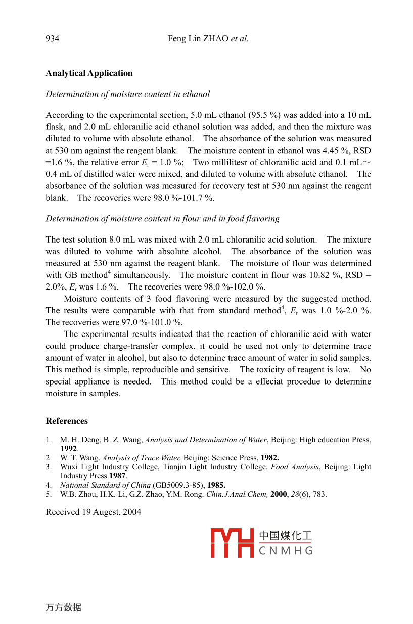 Chinese Chemical Letters Vol. 16, No.7, pp 931-934, 2005931http://www.imm.ac.cn/jourmalccl.htmlSpectrophotometric Study on the Interaction of Water withChloranilic Acid and its A nalytical ApplicationFeng Lin ZHAO'*, Xi Lan FENG, Xue Jing LIU, Na LI', Ke An LI' .1 Department of Chemistry, Peking University, Beijing 1008712 Vocational-Technical Teachers College, Henan 4530033 Experimental Center of Zaozhuang Teachers Collge, Shandong 277160A bstract: The reaction between chloranilic acid and water in alcohol was studiedspectrophotometrically. The conditions of reaction were investigated in detail. The stablepurple complex with an absorption wavelength at 530 nm was produced from the reaction betweenchloranilic acid and water. As a method for determination of H2O, Beer's law was obeyed in rangeof 0-6.0 % or 0-8.0 % (V/V) with the detection limit of 0.13 %. The relative standard deviation(RSD) was less than 2 %,The proposed method has been applied to determination of traceamount of water in ethanol, flour and food flavoring, respectively.The recoveries of water insamples were 97~ 102 %.Key words : Water, chloranilic acid, charge-transfer reaction, spectrophotometry.The determination of water is routine analytical requirement in chemical industry andfood industry.To measure moisture in chemical products, Karl Fischer method(GB-6283-86) is usually employed as a reference method in China and many othercountries'-. The method has several limitations: it is time-taking; the reagents areexpensive; Karl Fisher reagent needs to be calibrated daily. In order to improve theaccuracy of titration, dead-stop endpoint method of potentiometric titration is usuallyused. However, the method is less sensitive and reagents are toxic. Furthermore, theoperation procedure is complicated.To determine the moisture in food industry,oven-drying method and azeotropic distillation are often usedThese methods aretime-consuming and the reagent of benzene or toluene is toxic.Chloranilic acid is an electron-deficient agent (electron acceptor) and can react withelectron-rich agent (electron donor) to form charge-transfer complex. For example, itCL,OH20HH2O:+H20;.中國煤化工I0^~COTHCNMHG"E-mail: zf@chem.pku.edu.cn932Feng Lin ZHAO et al.can react with electron donor medicines to determine pharmaceutics .Water is anelectron-rich compound and can react with chloranilic acid to form a purple complex.The charge transfer reaction is shown to happen between chloranilic acid and water.This paper discussed the charge-transfer reaction between chloranilic acid and water.ExperimentalChloranilic acid(chemical purity, Beijing Chemical Factory, China) of 0.0200 mol/Lsolution in absolute ethanol, methanol, n-propyl alcohol, n-butyl alcohol, n-heptanol and1-hexanol, etc. (Analytical grade, Beijing Chemical Factory, China). All the alcoholswere dehydrated in laboratory before using.A Shimadzu Model UV-265 double-beam spectrophotometer with 1 cm cell (Kyoto,Japan), HHS- 2-NI constant temperature water-bath (Beijing Jingwei Science InstrumentFactory), KQ3200E ultrasonic washing appliance (Kunshan,China).A certain amount of sample solution containing water was pipetted into a 10 mLvolumetric flask, 2.00 mL chloranilic acid solution was added and the solution wasdiluted to volume with anhydrous solvent and mixed thoroughly. The flask was placedat room temperature for 10 min. The absorbance of the solution was measured at 530nm against the reagent blank prepared in the same way simultaneously.Solid sample of 1.5~ 2 g was weighed and put into a conical flask with a stopper,and 30 mL absolute alcohol was added. The mixture was then ultrasonically extractedfor 40 min. The supernatant was collected. Then 20.0 mL absolute alcohol was addedinto the conical flask and the mixture was ultrasonically extracted for 20 min. Thesupernatant was collected and mixed with the first collection. The collection wasdistilled to near dry and the distillate was used for determination.Results and DiscussionA certain amount of chloranilic acid was weighed and dissolved in water, methanol,absolute ethanol, 2-propanol, heptanol, dimethyl sulfoxide, ethyl acetate, methylmethacrylate, acetone and dioxane, respectively. Corresponding solvents were used asblank. The absorption spectra are presented in Figure 1. Solvent has a significanteffect on absorption spectrum of chloranilic acid. Amax and absorbance of chloranilicacid changes with solvent used for dissolving chloranilic acid. As the polarity ofsolvent (dielectric constant ε ) increases, the λ max value shifted to longer wavelength todifferent degrees.The absorption curves of chloranilic acid-water complexes in methanol, absolutealcohol, 1-propanol, 2-propanol, 1-butanol, 1-heptanol, 1-hexanol, dioxane, acetone andethyl acetate were recorded, respectively. The results showed that polarity of solventaffected λmax and absorbance value of chlc中國煤化工eIn solventwith higher polarity, the absorbance sens-water complexbecame higher. In alcohol solvents, the absMHCNMHGacidwasat440nm, Amax of chloranilic acid-water complex moved to a longer wavelength at 530 nmwith a shift of 90 nm. In acetone, ethyl acetate and dioxane, the absorbance sensitivitySpectrophotometric Study on the Interaction of Water933with Chloranilic Acidwas low and the maximum absorbance wavelength moved to shorter wavelength. Itmay be that the drawing electron effect of carbonyl group in acetone and ethyl acetatereduced electron supplement capability of solvents. In this experiment, absoluteethanol was used as solvent and the absorbance of chloranilic acid-water complex wasmeasured at 530 nm.According to the experimental procedure, the absorbance of complex wasdetermined at 18-65C. The results indicated that the reaction speed of chloranilic acidwith water was not influenced by temperature.The absorbance of complex reachedmaximum in 10 min and kept unchanged in 3 h.Ten aliquots of distilled water were tested in ethanol solvent to evaluaterepeatab