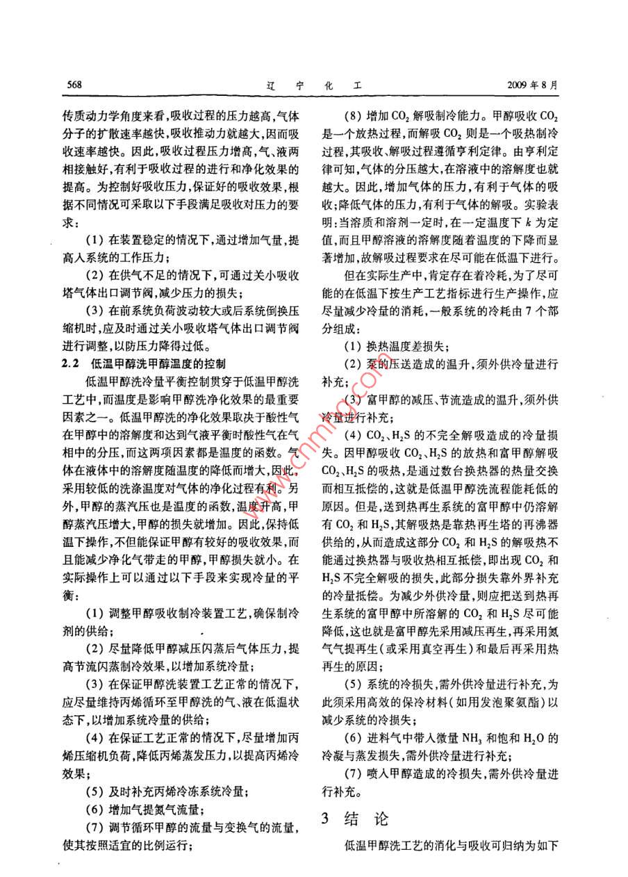 第38卷第8期Vol 382009年8月Liaoning Chemical Industry低溫甲醇洗穩(wěn)定運行的關鍵因素探討李波,闞世廣,謝會云(山東兗礦國宏化工有限公司,山東鄒城273500摘要:介紹了低溫甲醇洗的基本原理與工藝控制討論了如何在低溫甲醇洗過程中通過調(diào)整壓力和溫度來達到脫除酸性氣體的目的關鍵詞:煤化工;低溫甲醇洗;酸性氣體;凈化中圖分類號:TQ530文獻標識碼:A文章編號:1004-0935(20008-0567-03低溫甲醇洗工藝( Rectisol process)是德國魯下k為定值,而且甲醇溶液的溶解度隨溫度的下奇(Irgi)公司開發(fā)的,采用物理吸收酸性氣體的降而顯著增加,故吸收過程要求在盡可能低的壓種凈化工藝。該工藝使用冷甲醇作為酸性氣體力下進行。性氣體溶解度極大的物理特性,同時分段選擇性2工藝控制地吸收原料氣中的H2S和CO2以及各種有機硫在甲醇凈化工藝中,溫度和壓力對甲醇洗的等雜質(zhì)。在以渣油和煤為原料的大型合成甲醇裝選擇性具有非常重要的影響。隨著溫度降低,置上,大多采用這種凈化工藝。此外,該工藝還廣CO2、H2S以及別的易溶氣體在甲醇中的溶解度泛應用于合成氨羥基合成、工業(yè)制氫、城市煤氣系數(shù)增長很快,且分壓越高增長越快,而H2、N2和天然氣脫硫等生產(chǎn)裝置的凈化工藝中。目前,等變化不大。因此,隨著溫度的降低,甲醇對酸性國內(nèi)外已有百余套大中型工業(yè)化裝置的酸性氣體組分的選擇性大大提高。故此法適宜于在低溫下脫除采用該凈化工藝。操作,且盡量使酸性氣體的分壓增高。在運行過1基本原理程中,壓力是相對穩(wěn)定的,低溫甲醇洗的效果主要受循環(huán)量和溫度的影響。低溫甲醇洗工藝用冷甲醇作為吸收溶劑,利2.1低溫甲醇洗操作壓力的控制用高壓低溫下酸性氣體在甲醇中溶解度比較大的壓力水平在物理吸收中是一個關鍵因素,在特性脫除原料氣中的酸性氣體(主要是CO2和決定全系統(tǒng)的壓力水平時高壓無疑對吸收有利,H2S)。低溫甲醇洗的物理吸收過程遵循亨利定低壓有利于CO2及H2S在甲醇中的解析,因此低律。亨利定律的內(nèi)容為:在恒溫和平衡條件下溫甲醇洗工藝充分施展了壓力變化這一手段來促種氣體在溶液中的溶解度和該氣體的平衡壓力成進吸收和解析。其工藝手段采用了分段吸收和分正比。其數(shù)字表達式為段解析,使其貫穿于吸收與再生的主要技術思想按照不同的壓力水平去分段吸收和解析,以達到式中:k亨利常數(shù);一平衡時氣體在溶液中的摩爾分數(shù)。工藝要求。由享利定律可知,氣體的分壓越大,其在溶液根據(jù)享利定律,在一定溫度下氣體在液體里中的溶解度也就越大,所以增加氣體的壓力有利的溶解度和該氣體的平衡分壓成正比。另外,從于氣體的吸收,降低氣體的壓力有利于氣體的解析。試驗表明當溶質(zhì)和溶劑一定時,在一定溫度收蘅日期:20090325作者簡介:李波(1978-),男,工程師。568寧化00年8月傳質(zhì)動力學角度來看,吸收過程的壓力越高,氣體(8)增加CO2解吸制冷能力。甲醇吸收CO2分子的擴散速率越快,吸收推動力就越大,因而吸是一個放熱過程,而解吸CO2則是一個吸熱制冷收速率越快。因此,吸收過程壓力增髙,氣、液兩過程,其吸收、解吸過程遵循亨利定律。由亨利定相接觸好,有利于吸收過程的進行和凈化效果的律可知,氣體的分壓越大在溶液中的溶解度也就提高。為控制好吸收壓力保證好的吸收效果根越大。因此,增加氣體的壓力,有利于氣體的吸據(jù)不同情況可采取以下手段滿足吸收對壓力的要收;降低氣體的壓力,有利于氣體的解吸。實驗表求明:當溶質(zhì)和溶劑一定時,在一定溫度下k為定(1)在裝置穩(wěn)定的情況下,通過增加氣量,提值,而且甲醇溶液的溶解度隨著溫度的下降而顯高入系統(tǒng)的工作壓力;著增加,故解吸過程要求在盡可能在低溫下進行。2)在供氣不足的情況下,可通過關小吸收但在實際生產(chǎn)中,肯定存在著冷耗,為了盡可塔氣體出口調(diào)節(jié)閥,減少壓力的損失;能的在低溫下按生產(chǎn)工藝指標進行生產(chǎn)操作,應(3)在前系統(tǒng)負荷波動較大或后系統(tǒng)倒換壓盡量減少冷量的消耗,一般系統(tǒng)的冷耗由7個部縮機時,應及時通過關小吸收塔氣體出口調(diào)節(jié)閥分組成:進行調(diào)整,以防壓力降得過低。(1)換熱溫度差損失;2.2低溫甲醇洗甲醇溫度的控制(2)泵的壓送造成的溫升,須外供冷量進行低溫甲醇洗冷量平衡控制貫穿于低溫甲醇洗補充;工藝中,而溫度是影響甲醇洗凈化效果的最重要(3)富甲醇的減壓、節(jié)流造成的溫升,須外供因素之一。低溫甲醇洗的凈化效果取決于酸性氣冷量進行補充在甲醇中的溶解度和達到氣液平衡時酸性氣在氣(4)CO2、H2S的不完全解吸造成的冷量損相中的分壓,而這兩項因素都是溫度的函數(shù)。氣失。因甲醇吸收CO2、H2S的放熱和富甲醇解吸體在液體中的溶解度隨溫度的降低而增大,因此,CO2、H2S的吸熱,是通過數(shù)臺換熱器的熱量交換采用較低的洗滌溫度對氣體的凈化過程有利。另而相互抵償?shù)?這就是低溫甲醇洗流程能耗低的外,甲醇的蒸汽壓也是溫度的函數(shù),溫度升高,甲原因。但是,送到熱再生系統(tǒng)的富甲醇中仍溶解醇蒸汽壓增大,甲醇的損失就增加。因此保持低有CO2和H2S,其解吸熱是靠熱再生塔的再沸器溫下操作,不但能保證甲醇有較好的吸收效果,而供給的,從而造成這部分CO2和