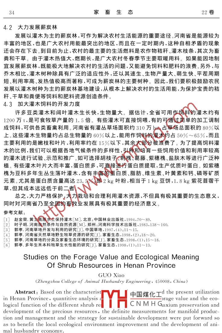 家畜生態(tài)2001.22(3):31- -34ECOLOGY OF DOMESTIC ANIMAL河南省灌木資源的飼用價(jià)值與生態(tài)意義郭孝(鄭州牧業(yè)高等??茖W(xué)校,河南鄭州450008)摘要:在研究河南省灌木資源的特點(diǎn)和利用現(xiàn)狀的基礎(chǔ)上,對不同灌木的飼用價(jià)值以及生態(tài)價(jià)值進(jìn)行定量化分析與研究,為飼料灌木資源的多樣性經(jīng)營和可持續(xù)性發(fā)展提出具體措施,以便最大限度地保護(hù)和開發(fā)這一寶貴的飼料資源,為改善當(dāng)?shù)厣鷳B(tài)環(huán)境和振興畜牧業(yè)經(jīng)濟(jì)服務(wù)。關(guān)鍵詞:灌木資源;生態(tài)意義;飼用價(jià)值;可持續(xù)發(fā)展中圖分類號:TS811.5文獻(xiàn)標(biāo)識碼:A文章編號:1004- 5228(2001 )030031-04河南省位于我國由溫帶向亞熱帶過渡地帶,水熱資源良好,光照充足,適宜灌木生長。豐富的灌木資源在當(dāng)?shù)囟嘧兊臍夂驐l件下形成典型的灌木植被,在水平地帶和垂直地帶上廣闊分布。這些灌木在當(dāng)?shù)鼐哂袠O其重要的經(jīng)濟(jì)和生態(tài)意義。-方面,它們具有強(qiáng)大的根系以及極強(qiáng)的適應(yīng)性,在各種嚴(yán)酷的環(huán)境下都能繁殖與生長,能有效減輕水土流失和風(fēng)沙干旱等自然災(zāi)害,改善生態(tài)環(huán)境和農(nóng)牧業(yè)生產(chǎn)條件;另一方面,一些灌木的枝葉營養(yǎng)價(jià)值高、適口性好、適宜用作家畜飼料??墒?由于人們受傳統(tǒng)觀念的影響,寶貴的灌木資源得不到合理利用,許多地方亂砍亂罰現(xiàn)象嚴(yán)重,極大地影響到當(dāng)?shù)厣鷳B(tài)環(huán)境。本文就結(jié)合河南省灌木的利用現(xiàn)狀,探討該生物資源的合理利用措施。1自然條件及地理概況河南省為我國第-農(nóng)業(yè)大省,人口9 000萬,位居全國第一位。土地總面積1 670萬hm' ,其中灌叢面積約為400 萬hm'。年均溫13.6~15. 1C,1月份平均溫度為1.5C(最低溫度為一20C),7月份平均溫度為27. 5C(最高溫度為40C),≥10C的活動積溫為. 4 700~5 000C;全年降水量為600~1 200 mm,主要集中在6、7、8三月內(nèi),約占65%;全年日照時(shí)數(shù)為2 000~2 600 h,無霜期為230 d;土壤類型主要有:棕壤土、褐土、黃棕壤土、潮土、鹽堿土、砂姜黑土、水稻土;土壤質(zhì)地主要為:輕壤、中壤、重壤及粘土;草地植被主要有:闊葉林、灌叢、草甸及沼澤。2灌木資源的種類及其價(jià)值河南省灌木資源極其豐富,類型多樣。根據(jù)它們的生活型特點(diǎn)、飼用價(jià)值和生態(tài)價(jià)值的多樣性,可分為以下五類:中國煤化工2.1灌木豆科 .YHCNMHG河南省共有灌木豆科21種,代表種有:藉子稍、紫穗槐、綠葉胡枝子、短梗胡枝子、苦豆子、洋槐。它們主要分布在豫西黃土丘陵及豫北太行山區(qū),在中山和低山區(qū)帶能形成地帶性灌叢植被。這些植物根系發(fā)達(dá),根冠比約為1 : 2.3~2. 6,莖葉比約為4~6.4 : 1,收稿日期: 2000-10-08作者簡介:郭孝(1964-),男,碩士,副教授。32家畜生態(tài)22卷水土保持性能好,抗旱能力極強(qiáng)。另外它的枝葉飼用價(jià)值也高,粗蛋白含量為12. 0%~ .20.24%,鈣含量為1. 35%~3.19%,磷的含量為0. 13%~0.35%,維生素及氨基酸較為豐富,家畜適口性好。雖然也有一些灌木因體內(nèi)含有生物堿等有毒物質(zhì)及有害的鉤、刺等附屬物,生長期內(nèi)不被家畜所喜食,但加工成干草或青貯飼料,毒害大大降低,可為家畜飼用。2.2 半灌木豆科河南省共有半灌木23種,代表種有:中華胡枝子、達(dá)呼里胡枝子、蘇木蘭、馬棘、波氏木蘭、野皂角等等。半灌木豆科主要分散分布在豫南山地、豫西丘陵及黃淮海平原,在闊葉林下也有分布;在淺山丘陵區(qū)往往能形成穩(wěn)定的灌叢,并充當(dāng)建群種。這些植物根系分布廣,抗旱、抗熱、 抗貧瘠能力強(qiáng),能充分利用6~8月份的雨水快速生長,有很強(qiáng)的水土保持能力;根冠比約為1 : 1.8~2. 0,莖葉比約為3~5.5 : 1;半灌木豆科粗蛋白含量約為10%~25.5% ,鈣的含量為1. 14%~1.88%,磷的含量為0.16%~1. 15%,由于大多數(shù)植物粗纖維含量高,有害的苦味生物堿也多,除胡枝子有較高的飼用價(jià)值及少數(shù)灌木新鮮時(shí)被個(gè)別畜種采食外,大多數(shù)植物家畜不喜食??偟膩碚f,這類灌木品質(zhì)很低,生態(tài)價(jià)值遠(yuǎn)高于經(jīng)濟(jì)價(jià)值。2.3半灌木蒿類在河南灌叢植被中數(shù)量不多,約11種。飼料價(jià)值不高,主要種有:茵陳蒿、鐵桿蒿、毛蓮蒿等等。半灌木蒿類在豫東及黃淮海平原分散分布,在退耕地能形成植被。另外,在豫北、豫西及豫南的下坡地的灌叢草場中起優(yōu)勢種或伴生種的作用。這類草大都是直根系,根系分布面小,植株地上部分越冬枯死后,根系仍保持活力,所以有一定的水土保持能力,但不及豆類灌木及半灌木。它們的飼用特點(diǎn)是:這類草營養(yǎng)價(jià)值偏低,粗蛋白含量約為10%左右,鈣磷含量分別約為0.75%~1. 16%、0.11%~0. 16%。另外,在生長的初期,植株逐漸散發(fā)出臭味,體內(nèi)逐漸增加帶苦味的生物堿,到生長旺期時(shí),生物堿含量最高,氣味最濃,家畜不愿意采食,只是在春季萌發(fā)和秋霜后,適口性略有提高。2.4 闊葉灌木河南省的闊葉灌木多為中旱生、中生灌木。中旱生灌木主要分布于豫西丘陵及豫北太行山區(qū),能形成連續(xù)性的地域性植被。中生灌木主要分布于豫西南伏牛山和桐柏山。另外還有少數(shù)濕生灌木分布在豫南