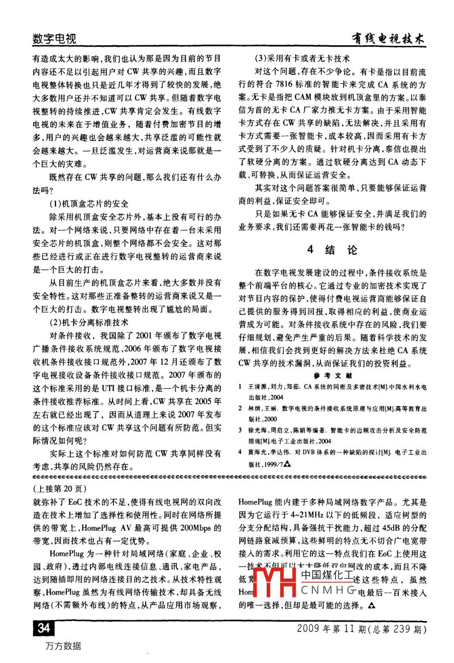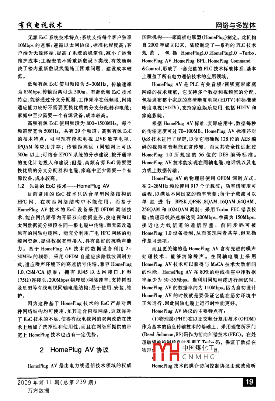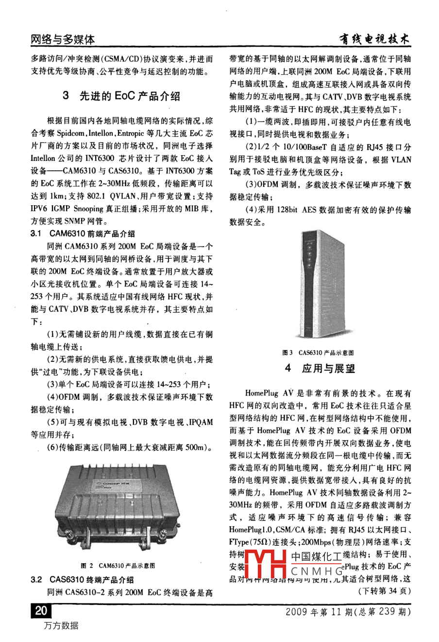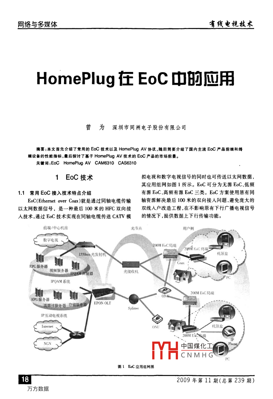 網(wǎng)絡(luò)與多媒體有線電視技術(shù)HomePlug在Eoc山的叵用曾為深圳市同洲電子股份有限公司摘要:本文首先介紹了常用的EoC技術(shù)以及 HomePlug Av協(xié)議,隨后簡要介紹了國內(nèi)主流EoC產(chǎn)品前端和終端設(shè)備的性能指標(biāo),最后探討了基于 Home Plug Av技術(shù)的EoC產(chǎn)品的市場前景。關(guān)鍵詞: Eoc HomePlug AV CAM6310cAs63101EoC技術(shù)擬電視和數(shù)字電視信號(hào)的同時(shí)也可傳送以太網(wǎng)數(shù)據(jù),其應(yīng)用組網(wǎng)如圖1所示。EoC可分為無源EoC、低頻1.1常用EoC接入技術(shù)特點(diǎn)介紹有源EoC、高頻有源EoC三類。EoC方案使用原有同EoC( Ethernet over Coax)就是通過同軸電纜傳輸軸資源解決最后100米的雙向接入問題,避免龐大的以太網(wǎng)數(shù)據(jù)信號(hào),是一種最后100米的HFC雙向接雙線人戶改造工程,在不影響原有下行廣播電視信號(hào)入技術(shù),通過EoC技術(shù)實(shí)現(xiàn)在同軸電纜傳送CATv模的情況下,提供數(shù)據(jù)上下行傳輸功能。前端/中心機(jī)房光節(jié)點(diǎn)用戶側(cè)數(shù)字電視200MEC局編pnhE終1550m光發(fā)射機(jī)機(jī)頂盒FPG服務(wù)器視頻服務(wù)器光接收機(jī)IPQAM系統(tǒng)200MEoC局端FPG服務(wù)器!直體服務(wù)器存結(jié)服務(wù)EPON OLTIP互動(dòng)電視系統(tǒng)中國煤化工CNMHG圖1EoC應(yīng)用組網(wǎng)圖2009年第11期(總第239期有線電視技術(shù)網(wǎng)絡(luò)與多媒體無源EoC系統(tǒng)技術(shù)特點(diǎn):系統(tǒng)支持每個(gè)客戶獨(dú)享國際機(jī)構(gòu)——家庭插電聯(lián)盟( HomePlug)制定。此機(jī)構(gòu)10Mbps的速率;遵循以太網(wǎng)協(xié)議,標(biāo)準(zhǔn)化程度高;客自2000年成立以來,陸續(xù)制定了一系列的PLC技術(shù)戶端為無源終端提高了系統(tǒng)的穩(wěn)定性,減小了運(yùn)營規(guī)范,包括 Home Plug.0、 HomePlug1.0- Turbo、維護(hù)成本;工程安裝不需重新敷設(shè)5類線有效地解 Home Plug AV, HomePlug BPL、 HomePlug Command決了樓內(nèi)重新敷設(shè)線纜施工困難問題,建設(shè)成本較& Control,形成了一套完整的PLC技術(shù)標(biāo)準(zhǔn)體系,基本低上覆蓋了所有電力通信技術(shù)的應(yīng)用領(lǐng)域。低頻有源EoC使用頻段為5~30MHz,傳輸速率Home Plug AV是PLC有關(guān)音頻/視頻寬帶家庭為85Mbps,傳輸距離可達(dá)500m。有源低頻EoC技術(shù)網(wǎng)絡(luò)的技術(shù)規(guī)范,它支持多個(gè)數(shù)據(jù)和視頻流的分配特點(diǎn):能夠通過分支分配器,工作頻率在低頻段,網(wǎng)絡(luò)包括遍布整個(gè)家庭的高清晰度電視(HDTV)和標(biāo)準(zhǔn)清適應(yīng)能力較好不需要更換優(yōu)質(zhì)的分支分配器和電纜;晰度電視(SDTV),支持家庭娛樂應(yīng)用,包括HDTV和家庭中至少需要一個(gè)有源設(shè)備,成本較高。家庭影院。高頻有源EoC使用頻段為800~1500MHz,每個(gè)根據(jù) HomePlug AV標(biāo)準(zhǔn),實(shí)際應(yīng)用中,數(shù)據(jù)每秒頻道帶寬為50MHz,共有29個(gè)頻道;高頻有源EoC的傳輸速度可過70-100MB。 HomePlug AV標(biāo)準(zhǔn)還對(duì)的技術(shù)特點(diǎn):可與現(xiàn)有模擬電視、DVB數(shù)字電視、QoS技術(shù)進(jìn)行了規(guī)定,以便它能確保128位的AES編IPQAM等應(yīng)用并存;傳輸距離遠(yuǎn)(同軸網(wǎng)上可達(dá)碼的視頻和音頻能正常傳輸。而且其安全性遠(yuǎn)超過500m以上;可結(jié)合EPON系統(tǒng)的分步建設(shè),按開通率 HomePlug1.0所規(guī)定的56位的DES編碼標(biāo)準(zhǔn)。的變化計(jì)劃投入和建設(shè);但是,高頻有源EoC需要更 Home Plug AⅤ技術(shù)能實(shí)現(xiàn)在同軸電纜、電話線以及電換優(yōu)質(zhì)的分支分配器和電纜,家庭中至少需要一個(gè)有力線上數(shù)據(jù)傳輸。源設(shè)備,成本較高HomePlug A的物理層使用OFDM調(diào)制方式,12先進(jìn)的EoC技術(shù)— HomePlug Av在2~28MHz頻段使用917個(gè)子載波;功率譜密度可目前常用的EoC技術(shù)只適合星型網(wǎng)絡(luò)結(jié)構(gòu)的編程,以滿足不同國家的頻率管制;每個(gè)子載波可以HFC網(wǎng),在樹型網(wǎng)絡(luò)結(jié)構(gòu)中不能使用。而基于單獨(dú)進(jìn)行 BPSK QPSK、8QAM、6QAM、64QAMHome Plug AⅤ技術(shù)的EoC設(shè)備采用OFDM調(diào)制技256QAM和1024QAM調(diào)制;采用 Turbo FEc錯(cuò)誤校術(shù),能在回傳頻帶內(nèi)開展雙向數(shù)據(jù)業(yè)務(wù),使電視和以驗(yàn);物理層線路速率達(dá)到200Mbps,凈荷為150Mbps太網(wǎng)數(shù)據(jù)流分頻段在同一根電纜中傳輸,而無需改造接近電力線信道的通信容量;前同步碼可被原有的同軸電纜網(wǎng),能充分利用廣電HFC網(wǎng)絡(luò)的電 HomePlug1.0設(shè)備檢測,從而實(shí)現(xiàn)兩者共存,但互操纜網(wǎng)資源,提供數(shù)據(jù)寬帶接入,具有良好的抗噪聲能作是可選項(xiàng)。力?;?Home Plug AⅤ技術(shù)的數(shù)據(jù)設(shè)備利用2~而且更關(guān)鍵的是 Home Plug A含有先進(jìn)的噪聲30MH的頻帶,采用oFDM自適應(yīng)多路載波調(diào)制方處理技術(shù),能夠消除噪聲。在同軸電纜上采用式,適應(yīng)噪聲環(huán)境下的高速信號(hào)傳輸,兼容 Home Plug HomePl嗎gAⅤ技術(shù)可以獲得與MoCA技術(shù)大致相同1.0, CSM/CA標(biāo)準(zhǔn);擁有R45以太網(wǎng)接口、F型的性能。 HomePlug AⅤ在80%的電線插座中凈數(shù)據(jù)(759)連接頭;200Mbps(物理層)網(wǎng)絡(luò)速率;支持樹