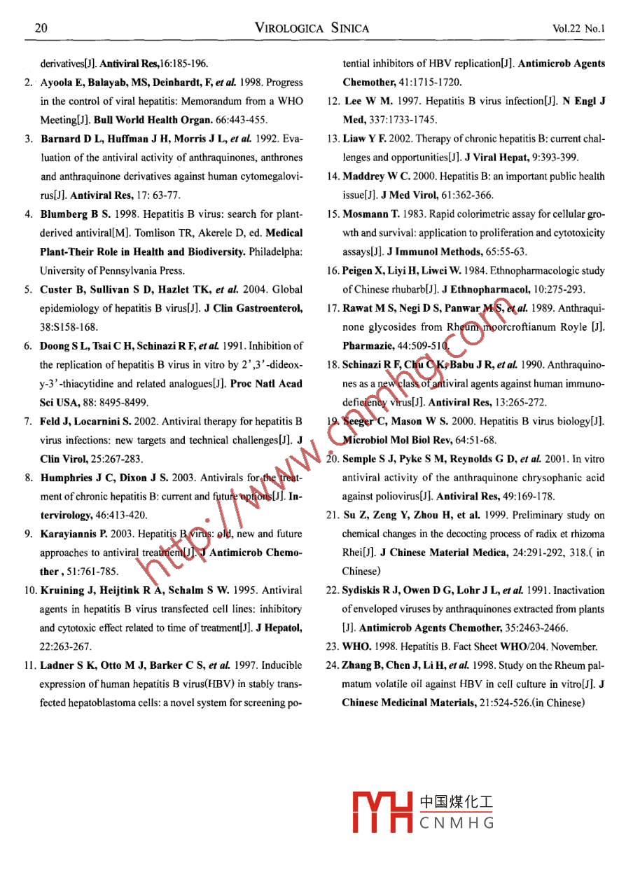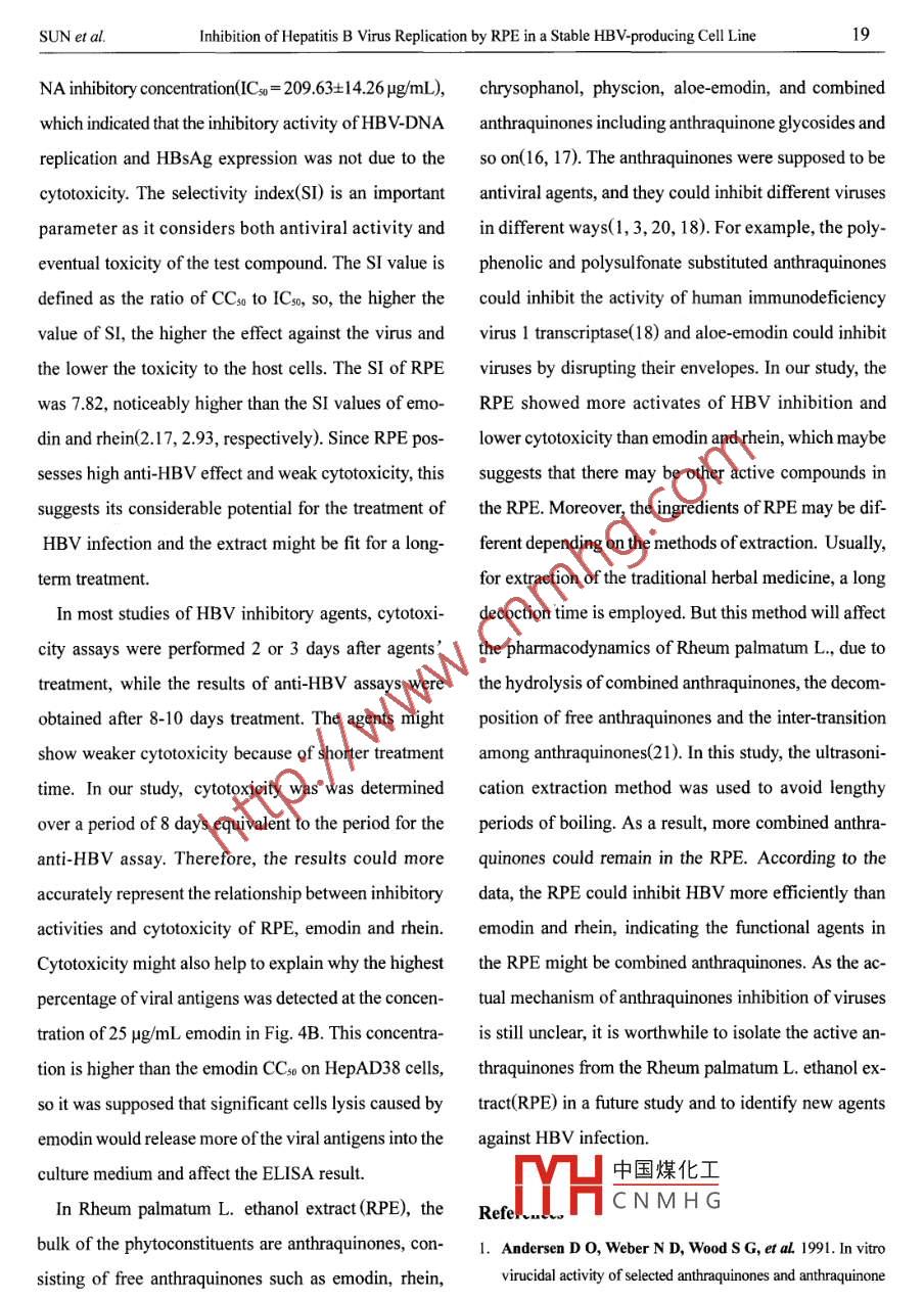 VIROLOGICA SINICA Feb 2007, 22(1): 14-20CLC number: R373 Document code:A Article ID: 1003-5125(2007)01-0014-07Inhibition of Hepatitis B Virus Replication by Rheum palmatum L. EthanolExtract in a Stable HBv-producing Cell LineYan sUN, Li-jun Ll2. 3, Jing Lr, Zhi LI**(1. College ofLife Sciences, Shaanxi Normal University, Xi'an, Shannxi, 710062; 2. Bioengineering Institute, JimeiUniversity, Xiamen, Fujian, 361021; 3. Department of Applied Biology and Chemical Technology, The Hong KongPolytechnic University, Hung Hom, Hong Kong: 4. Department of Infection Disease, Xiangfan Central HospitalXiangfan, Hubei, 441021; 5. The Institute of Molecular Biology, The University of Hong Kong.Abstract: Hepatitis B virus(HBV)infection is a severe health problem in the world. However, there isstill not a satisfactory therapeutic strategy for the HBV infection. To search for new anti-HBV agents withhigher efficacy and less side-effects, the inhibitory activities of traditional Chinese medicine rheumpalmatum L ethanol extract(RPE)against HBV replication were investigated in this study. Quantitativereal-time polymerase chain reaction( PCR) was employed to analyze the inhibitory activity of RPe againstHBV-DNA replication in a stable HBV-producing cell line Hep AD38; the expression levels of HBVsurface antigen (HBsAg) and e antigen (HBeAg) were also determined by enzyme linked immunosorbentassay (ELISA)after RPE treatment. RPE could dose-dependently inhibit the production of HBV-DNAand HBsAg. The concentration of 50% inhibition(ICso)was calculated at 209.63, 252.53 ug/mL, respetively. However, its inhibitory activity against HBeAg expression was slight even at high concentrationsRPE had a weak cytotoxic effect on HepAD38 cells( CCso=1 640 Hg/mL) and the selectivity index(si)was calculated at 7.82: Compared with two anthraquinone derivatives emodin and rhein, rPe showedhigher ability of anti- HBV and weaker cytotoxicity. So Rheum palmatum L. might possess other functional agents which could effectively inhibit hBv-DNA replication and HBsAg expression. Furtherpurification of the active agents, identification and modification of their structures to improve the efficacyand decrease the cytotoxicity are requiredKey words: Hepatitis B virus(HBV); Antiviral; Rheum palmatum L ethanol extract (RPE); HepAD38Hepatitis B is an infectious disease of the liver caused 350 million people are chronic carriers of HBV( 23, 2by Hepatitis B virus(HBV). Globally, about two billion 19, 5). These carriers are at high risk for developmentpeople have been infected by HBV and approximately of中國煤化 Eluding liver cirrhosis,CNMHGReceived:200605-31, Accepted:2006-07-06Equally contributing authorC呀芳?xì)uthor.le82930845.862353-mail:lizhi@snnu.edu.cnSUN et alInhibition of Hepatitis B Virus Replication by RPE in a Stable HBV-producing Cell Lineliver failure and hepatocellular carcinoma(HcC)and the commercial anthraquinone derivatives emodin andmore than one million carriers die from these diseases rhein which are derived from rheumeach year(23, 2). In China, the prevalence of HBV infection is very severe, with an estimated 120 millie1. Materials and methodschronically infected carriers, up to 12 million suffering 1.1 Preparation of herbal plant extract and anthrafrom chronic hepatitis B(5)uinone solutionsInterferon and lamivudine are the mainly acceptable The herbal plant Rheum palmatum L was purchasedantiviral drugs for inhibition of HBV replication( 14, 8). from a herbal materials supply house and verified.OneBoth of drugs can induce virological and biochemical kilogram of dried, ground rhizome was macerated inremission in the treatment of chromic hepatitis B, but 1 000 mL 95% ethanol. After incubation overnight, thetheir clinical chromic hepatitis B, but their clinical sample was subjected to ultrasonication for 30benefit is somewhat limited due to viral mutation, cost, minutes, followed by centrifugation. The residue wasfrequent adverse effects(7)and the likelihood of re- extracted twice, then the supernatant solutions werelapse after the termination of treatment. Moreover, only mixed, filtered, concentrated and lyophilized to give aabout 20% of patients benefit from combination therapy dark brown powder. The dried extract was re-resolvedwith interferon and lamivudine( 13, 9). So, the need to in dulbecco,s modified Eagle's medium(DmEmidentify effective anti- HBV agents is still urgently Gibco BRL) with 0.2%dimethyl sulfoxide(DMSOrequired. The herbal plant Rheum palmatum L is a tradi- Sigma, St. Louis, MO) to the appropriate concentra-tional Chinese medicine which is widely distributedtions. Emodin(1, 3, 8-trihydroxy-6-methylanthraquinonemainland China and which has a long history to treating CisHnoOs)and rhein (1, 8-dihydroxy-9, 10-anthraquino-gastroenteritic and viral diseases(4). Rheum palmatum ne-3-carboxylic acid, Cus HsO,)(Fig. 1. ) were purchasedL. contains several anthraquinone derivatives, which from Sigma Chemical Company and dissolved inhave showed activities against some viruses including ves DMEM with 0. 2% DMSO to the appropriate concentraicular stomatitis virus, herpes simplex virus types l and tions. The resulting solutions were used in the following2, parainfluenza, vaccinia virus, human cytomegalovi- analysisrus and poliovirus(22, 1, 3, 20). It was also reported that 1.2 Cells cultureRheum palmatum L. volatile oil could inhibit HBVThe Hepad3 8 is a human hepatocellular carantigens(HBsAg and HBeAg) expression(24). There- cinoma derivative cell line which can reproduce hepa-fore, it is supposed that Rheum palmatum L. might titis B viruses under control of tetracycline( 11). Hep-possess active agents which may inhibit many virusesHOHincluding HBV. In this study, we evaluated the cytotoxicity and the inhibitory activities of Rheum palmatum L.中國煤化工ethanol extract(rPE)against HBV-DNA replication andCNMHGHBV antigens expression in a stable HBV-producingFig 1 Chemical structure of emodin(R=OH, R-CH,)and rheince
