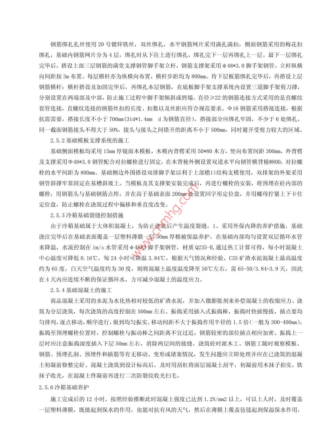 淺談空分冷箱基礎的施工控制中國化學工程第三建設有限公司摘要:本文闡述了冷箱基礎的施工工藝要求及質量控制要點,重點說明了冷箱基礎的外保內降裂縫控制的措施和監(jiān)控要點。關鍵詞:冷箱基礎;質量;控制中圖分類號:0213.1文獻標識碼:A文章編號:1.工程概況中煤榆橫煤化工空分裝置中有4個冷箱基礎,我單位施工2個冷箱基礎,其底板結構尺寸為22m*26m(長*寬,局部長度22m)、結構髙度3米,一次性混凝土澆筑高度2.6lm(局部吊模區(qū)域澆筑高度2.95m)?;A墊層以下處理采用膨脹土防水毯,墊層混凝土采用C10,基礎混凝土采用C35防水抗凍混凝土(防水等級P12、抗凍等級F200,加入微膨脹劑來補償混凝土的收縮應力。冷箱基礎采用單個基礎整體機械開挖,基礎以下防水毯及墊層先施工,然后再進行基礎的結構施工,最后進行回填施工。冷箱基礎施工過程中的質量控制1施工工藝流程土方開挖→防水毯施工→放線→墊層施工→鋼筋安裝(冷凝管埋設)→模板施工→預埋預留施工→混凝土澆筑→覆蓋養(yǎng)護→拆?!靥睢?.2基槽開挖基槽開挖時采用反鏟挖掘機對單個冷箱基礎土方整體開挖,現(xiàn)場地質主要為中粗砂巖土類結構,因現(xiàn)場全部為強夯地基,因此基礎坐落在天然地基上,基坑按照1:0.5進行放坡,基礎墊層底標高為-2.1m。機械開挖底標髙為-2.0m,預留100m厚基槽底土采取人工淸槽,嚴禁一次開挖至標高,不得擾動地基土。2.3膨脹土防水毯層施工基礎墊層以下防水采用膨脹土防水毯。防水毯鋪設前,先均勻的鋪設100cm的同防水毯配套的膨脹土顆粒(廠家配送),防水毯鋪設時由一邊向另一邊整體延伸鋪設,搭接處搭接長度不小于300m。為了便于以后基礎側邊防水毯搭接,在鋪設時基礎周邊預留的搭接區(qū)域要留出500mm余量,用于后期側邊防水毯的相互銜接。后在防水毯上放線,進行墊層及基礎的施工。2.4墊層的施工墊層厚度為100m,模板采用的是8cm×10cm方木立放,由于基礎尺寸較大,因此,現(xiàn)場墊層模板支設完畢后采取的是商品將混凝土泵送至模板內,攤平后用平板振動器振搗,然后表面壓光2.5基礎的施工2.5.1基礎鋼筋的施工鋼筋進場應有鋼筋岀廠質量證明書或試驗報告單,鋼筋表面或每捆(盤)鋼筋應有標志牌。鋼筋進場時,按爐(批)號及鋼筋直徑分批檢驗。同爐罐號、同規(guī)格、同直徑的鋼筋每60噸為一檢驗批量;如果次進場鋼筋不足一個批量,也應作一個批量進行檢驗?,F(xiàn)場所使用的鋼筋主要有Φ16、Φ22、Φ25以及作為拉鉤使用的Φ8鋼筋4種鋼筋綁扎扎絲使用20號鍍鋅鐵絲,雙絲綁扎,水平鋼筋網(wǎng)片采用滿扎滿扣,側面鋼筋采用的梅花扣綁扎,基礎內鋼筋網(wǎng)片分為4層,綁扎時從下往上進行綁扎,綁扎完下一層再綁扎上一層。最下一層綁扎完畢后,搭設上部三層鋼筋的滿堂支撐鋼管腳手架立杄,鋼筋支撐架采用φ48*3.0腳手架鋼管,立杄縱橫向間距按3m布置。每層橫杄亦為縱橫向布置,橫杄步距均為80omm。待下層板筋綁扎完畢后,再搭設上層鋼筋橫杄;橫杄搭設及加固完畢后,再綁扎夲層鋼筋,在底板腳手架攴撐系統(tǒng)內設置三道腳手架剪刀撐,分別設置在兩端部及中部,防止施工過程中腳手架傾斜或坍塌。直徑≥22的鋼筋連接方式采用的是直螺紋套管連接,直螺紋連接的鋼筋絲扣的長度、扣數(shù)以及絲距應符合規(guī)范要求。Φ16鋼筋采用搭接連接,根據(jù)抗震需要,搭接長度不小于700m(3ld*1.4md為鋼筋直徑),搭接部分應綁扎牢固,不少于6處綁扎,同一截面鋼筋接頭不得大于50%,接頭與接頭之間錯開的距離不小于500m,同時避開受剪力較大的區(qū)域。2.5.2基礎模板支撐系統(tǒng)的施工基礎側面模板均采用15ⅷ厚鏡面木模板,木模內背楞采用50*80木方,豎向布置間距30omm,外背楞及支撐采用Φ48*3.0鋼管配合對拉螺栓進行固定,在木背棱外側設置雙道水平向鋼管橫背棱@800,對拉螺栓的水平間距為800m?;A側邊外圍搭設雙排腳手架以利于上部檐口結構支模使用,雙排架的外架采用鋼管斜撐牢靠固定在基槽斜坡上。當模板及其支撐架安裝完成后,再進行螺栓的安裝,將預埋在砼內部的螺栓,用鋼筋頭與基礎鋼筋點焊,并在高于基礎表面200m處設置回字形定位盤,并用螺母擰緊上下卡住定位盤,防止螺栓在澆筑過程中偏移和垂直度改變。2.5.3冷箱基礎裂縫控制措施由于冷箱基礎屬于大體積混凝土,為防止?jié)仓螽a生溫度裂縫,1、采用外保內降的養(yǎng)護措施,基礎澆注完畢后在基礎表面覆蓋一層塑料薄膜一層5σm厚棉被保溫養(yǎng)護,在基礎內部均勻設置雙層循環(huán)水管來降溫,水流控制在lm/s水管采用φ48*3腳手架鋼管,材質Q235B,通過熱工計算可得,每小時混凝土中心溫度可降低0.16℃,每24小時可降溫3.84℃,根據(jù)天氣情況和經驗,C35礦渣水泥混凝土最髙溫度約為65度,白天空氣溫度約為30度,則將混凝土溫度溫度降至50℃左右,需65-50/3.84=3.9天,因此在4天內應連續(xù)不斷的保證循環(huán)水,方可減少混凝土的溫度應力2.5.4基礎混凝土的施工商品混凝土采用的水泥為水化熱相對較低的礦渣水泥,并加入微膨脹劑來補償混凝土的收縮應力。澆筑為分層澆筑,每次澆筑的高度控制在5ωm左右。振搗釆用插λ式振搗棒,振搗時快插慢拔,插點要均勻排列,逐點移動,順序進行,做到均勻振實。移動間距不大于振搗作用半徑的1.5倍(一般為300-400m),振搗至預埋螺栓位置時,控制螺栓與振動棒之間距離不宜過近,鋼筋較密