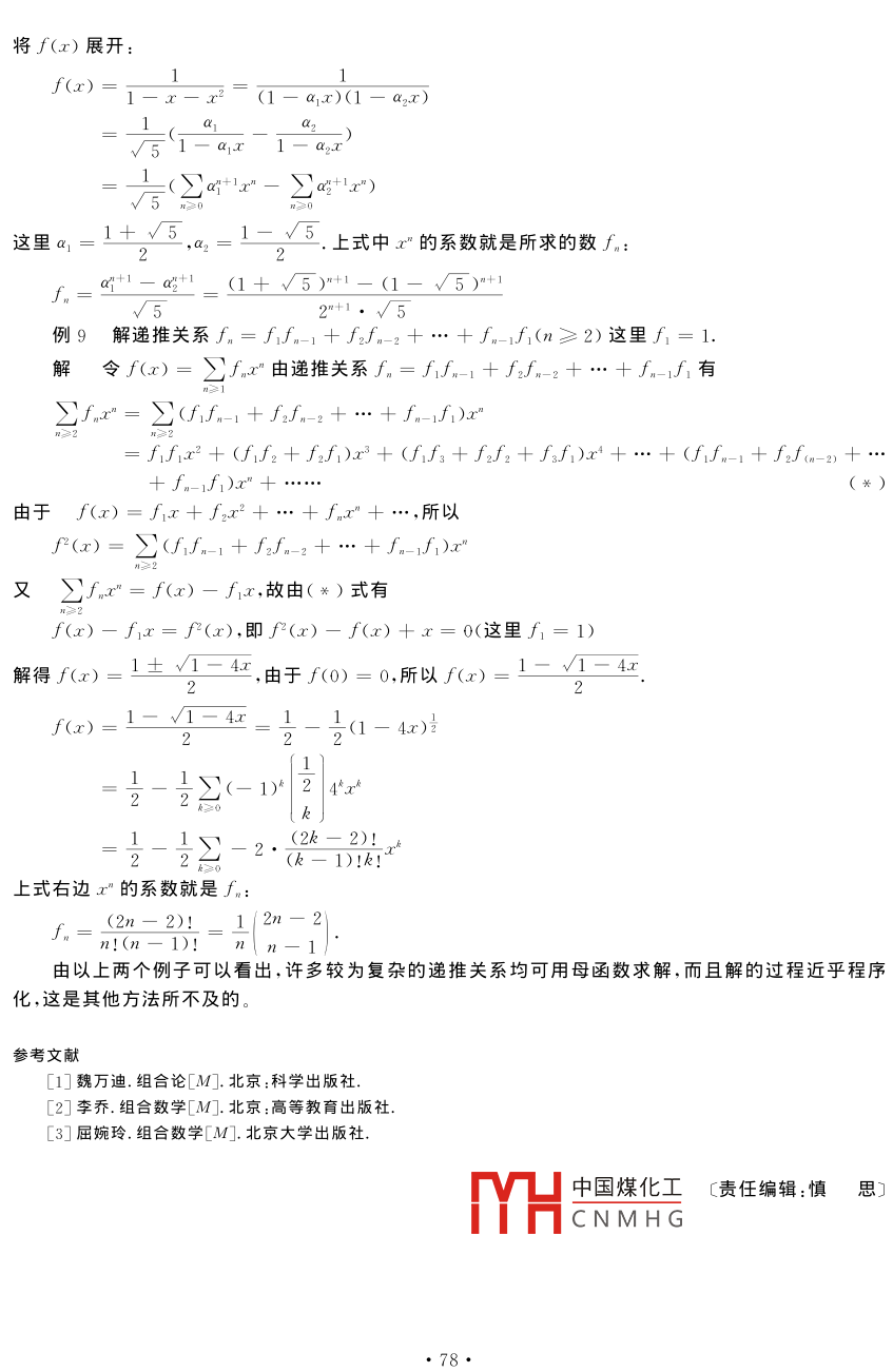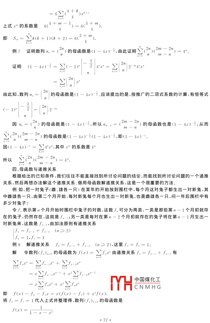 2003年6月湖北大學(xué)成人教育學(xué)院學(xué)報(bào)Jun.,2003第21卷第3期 Journal of Adult Education College of Hubei University Vol.21No.3母函的應(yīng)用戴想元(湖北大學(xué)數(shù)學(xué)與計(jì)算機(jī)科學(xué)學(xué)院,武漢,430062)【摘要】母函數(shù)是組合數(shù)學(xué)中用來(lái)研究有關(guān)問(wèn)題的重要工具。本文主要介紹怎樣利用母函數(shù)來(lái)計(jì)數(shù),解遞推關(guān)系以及求和?!娟P(guān)鍵詞】母函數(shù);計(jì)數(shù);解遞推關(guān)系;求和【中圖分類號(hào)】Q157【文獻(xiàn)標(biāo)識(shí)碼】A【文章編號(hào)】109-0444(2003)03-0073-06母函數(shù)的基本概念為了引入母函數(shù)的概念,初步認(rèn)識(shí)母函數(shù)與我們所討論的計(jì)數(shù)問(wèn)題是如何聯(lián)系在一起的,先來(lái)看個(gè)例子引例:求從n個(gè)元素a1a2中取r個(gè)元素的組合方式和組合數(shù)(簡(jiǎn)稱n元集的r-組合數(shù))解:考慮n個(gè)二項(xiàng)式1+a1x,1+a2x,…,1+anx乘積的展開(kāi)式中x(i=1,2,…,n)的系數(shù):(1+a1x)(1+a2x)…(1+ax)…(1+anx)1+(a1+a2+…+an)x+(a(2+…+aa+aa1+1…a;+r-1+2…an)x上式展式的特點(diǎn)1)x的系數(shù)是從n個(gè)元素中取r個(gè)元素的所有組合方式,取a1=a2an=1時(shí),x的系數(shù)就是n元素的的r一組合數(shù)(")2)上述結(jié)論不是偶然的,因每一個(gè)二項(xiàng)式1+a1x表明了元素a在從n個(gè)元素中取r個(gè)元素時(shí)的兩種狀態(tài):不取a,或者取a,當(dāng)用1去與其他二項(xiàng)式相乘時(shí),表示不取a;當(dāng)用ax去與其他二項(xiàng)式相乘時(shí),表示取了a;所以最后x的系數(shù)就是n元素的r-組合方式。當(dāng)a=1(i=1,2,…,n)時(shí),x的系數(shù)就是n元素的r—組合數(shù)3)當(dāng)只考慮計(jì)數(shù)時(shí),令a1=a2an=1,則有(1+x)于是組合數(shù)列{()}≥。就與母函數(shù)(1+x)相對(duì)應(yīng)定義設(shè)數(shù)列{ak}k≥0=(a,a1,…,ak,…)是一個(gè)無(wú)窮數(shù)列,則稱形式冪級(jí)數(shù)為數(shù)列(ak)k≥0的普通型母函數(shù),簡(jiǎn)稱為普母函數(shù)或母五稱形式冪級(jí)數(shù)中國(guó)煤化工(x)=a0+a1x+a2CNMHG為數(shù)列(ak)k≥的指數(shù)型母函數(shù),簡(jiǎn)稱指母函數(shù)收稿日期]2003-04-02作者簡(jiǎn)介]戴想元(1944—),男,湖北應(yīng)城人,湖北大學(xué)數(shù)學(xué)與計(jì)算機(jī)科學(xué)學(xué)院副教授定義中“形式冪級(jí)數(shù)”一語(yǔ),指的是撇開(kāi)了級(jí)數(shù)的收斂性問(wèn)題。而當(dāng)我們須對(duì)冪級(jí)數(shù)進(jìn)行微分或積分時(shí),則認(rèn)為該級(jí)數(shù)具有分析學(xué)中函數(shù)應(yīng)滿足的性質(zhì)。形式冪級(jí)數(shù)的代數(shù)運(yùn)算,即加、減和乘法都按多項(xiàng)式運(yùn)算法則進(jìn)行,而微分、積分則按數(shù)學(xué)分析中的算法則進(jìn)行二、母函數(shù)與排列組合基本公式Ⅰ,從n元集S={a1,a2,…,an}中取k個(gè)元的組合,其中限定元素a出現(xiàn)的次數(shù)之集為M(i=1,2,…,n)時(shí)的組合數(shù)記為c,則數(shù)列(ck)≥0的母函數(shù)是f(x)基本公式Ⅰ包含了許多特殊情況,如1°當(dāng)M1=MMn{0,1}時(shí),f(x)=(1+x)2°當(dāng)M1=M{0,1,2,…},f(x)=(1+x+x2+…)3°當(dāng)M1=M2=…=Mn={0,2,4,…},f(x)=(1+x2+x4+…)基本公式Ⅰ的一個(gè)等價(jià)命題是:把k個(gè)相同的球放入n個(gè)互不相同的盒子a1,a2,…,an中,要求盒子a,中放入m個(gè)球,其放法數(shù)的母函數(shù)是m(>x")對(duì)于我們要求的組合數(shù)c,如果能找到其對(duì)立的母函數(shù)f(x)=m(∑x),將這母函數(shù)展開(kāi)成f(x)=∑cx,則x的系數(shù)c就是我們要求的組合數(shù)例1求證n元集的k-可重組合數(shù)是(+k-1)k證明所謂n元集的k可重組合指的是從n元集s=(a1,a2,…,an}中選取的無(wú)序k元組(x1x2,…,x),這里x1,x2,…,xk∈S,它們可彼此相同,每個(gè)元素a,出現(xiàn)的次數(shù)集M1={0,1,2,…k)(依n元集的k一可重組合的的定義,這組合數(shù)的母函數(shù)是f(x)=(1+x+x2+…)將其展開(kāi)(1+x+x2+…)"=(n(-n-1)(-n-2)…(-n-t+1)(-1)2n(n+1)(n+2)…(+=1)所求n元集的k一可重組合數(shù)就是上面展開(kāi)式中x的系數(shù)(+k-1應(yīng)該強(qiáng)調(diào)的是,在求可以重復(fù)的組合數(shù)時(shí),常用函數(shù)=(1-x)”,今后可以把它的展開(kāi)式中國(guó)煤化工)x作為公式來(lái)用CNMHG例2求n元集S={a1,a2,…,an}的k一可重組合數(shù)c,要求a1,a2出現(xiàn)偶數(shù)次,其余元素出現(xiàn)奇數(shù)次解該問(wèn)題的母函數(shù)是f(x)=(1+)2(x+x3+x5+…)”-2+r-1k上式中x的系數(shù)就是ck2基本公式I,從n元集S={a1,a2,…,an}中取k個(gè)元的排列,其中限定元b出現(xiàn)的次數(shù)之集是M(i1,2,…,n),把這種排列的個(gè)數(shù)記為p,則數(shù)列()≥0的母函數(shù)是f(x)=∑x5k!=m(∑,)注:1°若M1=M2=…Mn={0,1,2,…},則f(x)=(1+2若M1=M2=Mn={0,2,4,…},則f(x)={1+2,+M1=M2=…=Mn={1,3,5,…},則f(x)=(x+,++…)=(對(duì)于我們要求的排列數(shù)p,如果能找到其對(duì)應(yīng)的母函數(shù)∫(x)=Ⅱ(、x),將這母函數(shù)展開(kāi)成f(x)=∑Pk1,則的系數(shù)內(nèi)就是我們要求的排列數(shù)例3求字母集{a,b,c,d}上含偶數(shù)個(gè)a的k元字的個(gè)數(shù)f解()≥。的母函數(shù)是(1+x++…)(1+x++(elr+ezr)的系數(shù)是=D(4+2)。例4用1,2,3,4這四個(gè)數(shù)字組成7位數(shù),要求1出現(xiàn)2次或3次,2出現(xiàn)偶數(shù)次,4出現(xiàn)奇數(shù)次,求這樣7位數(shù)的個(gè)數(shù)解此排