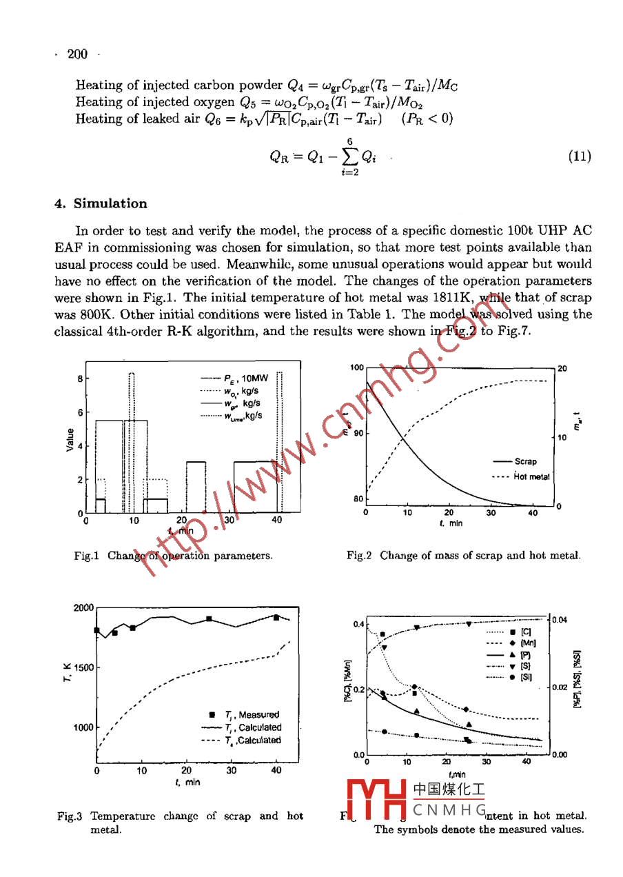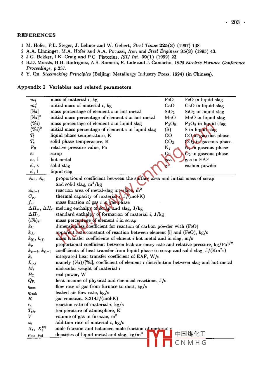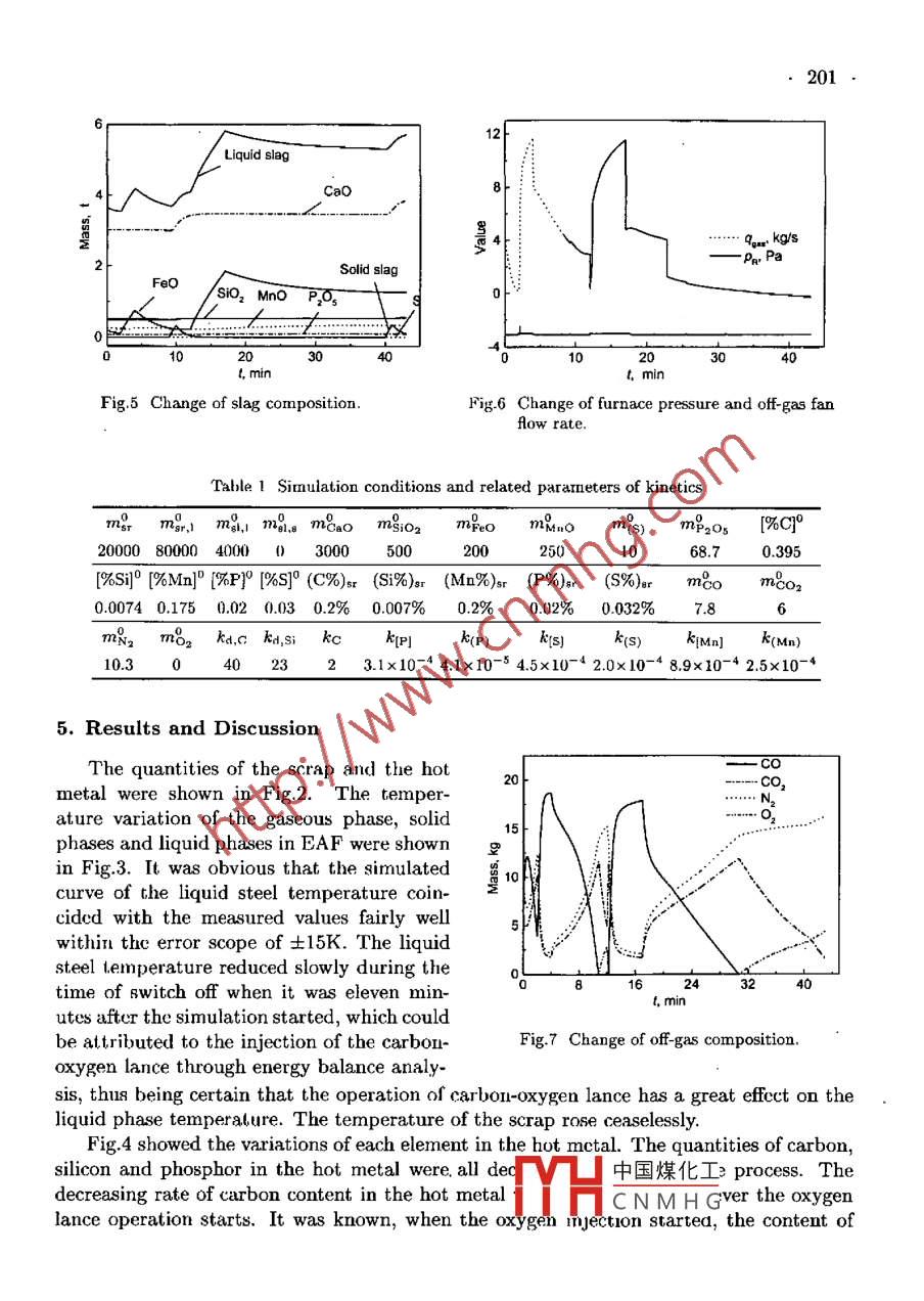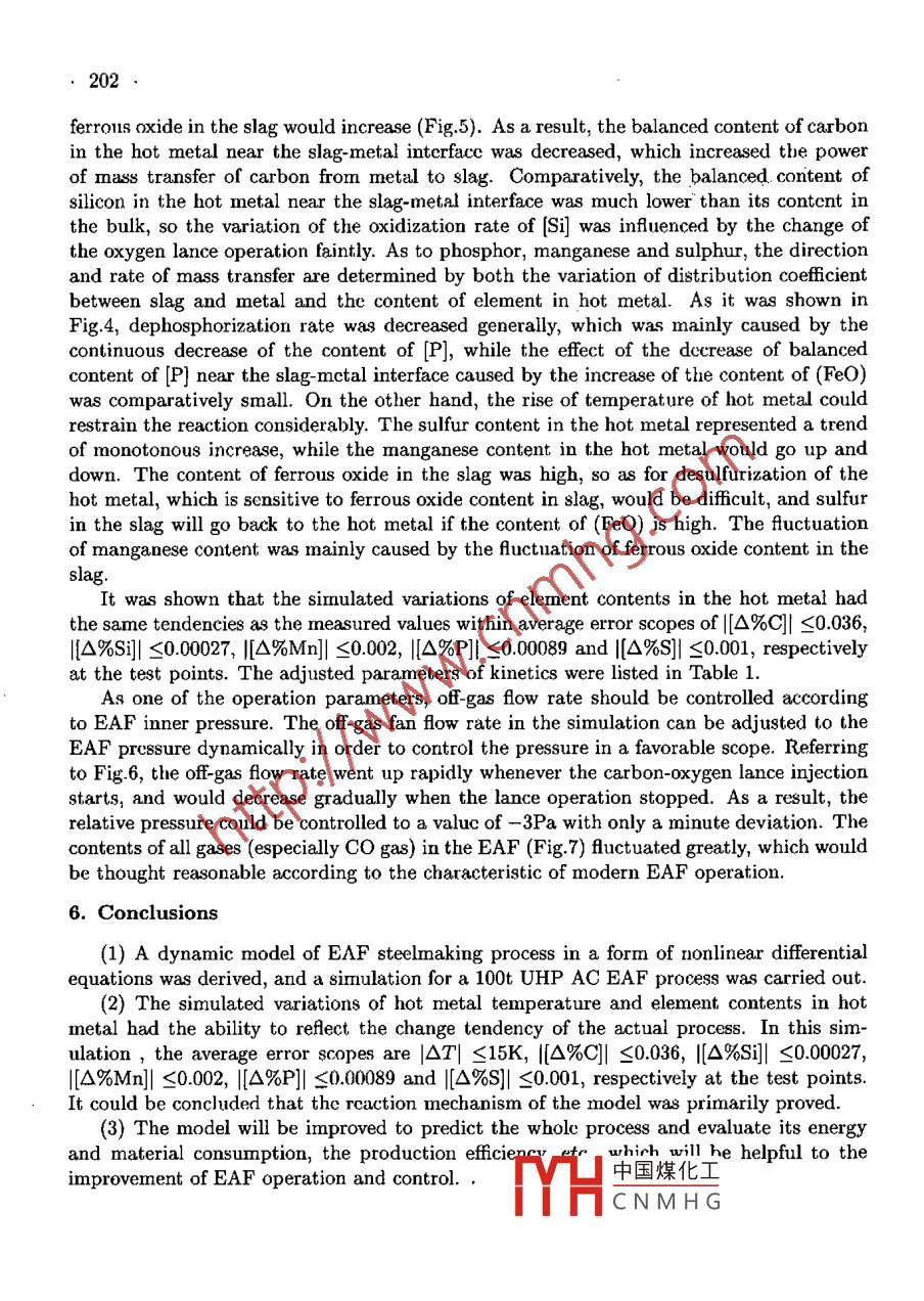 ACTA METALLURGICA SINICA {ENGLISH LETTERS)Vol. 16 No. 3 pp 197 203.June 2003DYNAMIC MODEL AND SIMULATION OF EAF STEELMAKINGPROCESSQ. Li and X. HongShanghai Enhanced Laboratory of Ferronetallurgry, Shanghai University, Shanghai 200072, ChinaManuscript received 27 May 2002; in revised form 23 September 2002Based on mass and energy balances and theories of therrmodynamics and kirne:tics, adynamic model in conjunction with relative operation parameters was derined. Withthis model, the EAF process in later stage of scarp melting was dynamically described,including time dependent uariations of bath temperature, slag quantity, compositionsof steel, slag and ofF-gas, etc. Steelmakting process in a domestic 100 ton UHP ACEAF was chosen as a compustational r:carnple, (nd the simulated variations of tem-perature of hot metal and element contents was shown consistent with the actualprocessmeasurements within average error scopes of |OT|≤15K, |[O%C]|≤0.036,i[△%Si]| <0.00027, |[A%Mn]|≤0.002, |[A%P]| ≤0.00089 and |[O%S]| <0.001 re-spectively at the test points. The model will be extended to predict the whole produc-tion process including scrap melting procedure and evaluate its energy and materialconsumption, the produsction efficiency, elc., twhich will provide assistance for the im-provement of EA F operation and conlrul.KEY WORDSEAF, dynamic rode, sirnuslation1. IntroductionIn electric arc furnacc (EAF) steelmaking process, variable charging and different op-eration conditions cause continuous change of the furnace state and system parameters, itsbehavior cannot be accilrately described with a static model. In order to realize simula-tion and optimization of EAF process, transient process modelling is necessaryl1,2]. In thispaper, an advanced ruodel in the form of coupling diferential equations2- 4J was derivedbased on rass and energy balances, taking into account the metallurgical reaction kinetics,gaseous reactions, dynamics of materials and energy streams and exlensive thermody namiccalculations. With this model, dynamic prcdictions and simulations would be expected inconjunction with relative operation parameters.2. AssumptionsTo allow simplification and facilitate t.he model following assumptions were introduced.(1) The simulation was conductcd during the later stage of scarp melting process whenthe heat transfer from are is supposed directly to the liquid and gaseous phases, and thenfrom the liquid phases to the solid phases.(2) The formulation of scrap melting process was merely based on heat transfer. Theheat absorbed by the solid may be utilized to heat or mclt itself. The quantity of each onedepended on a temperature ratio between the solid中國煤化工(3) The scrap lump was dealt with as roundness 8:YHCNMHGnedtobemeltsymmetrically.198.(4) The solid phases consisting of the scrap and the solid slag were at the same temper-ature, while the liquid metal, molten slag and gas phase were all at the same temperature.(5) The injected oxygen reacted merely with [Fe], and then the resultant of (FeO) wouldreact with carbon powder injected and other elements in the hot metal.(6) The oxidations of [C], [Si] were ranked in apparently first order reactions and theoxidation rate of carbon powder was proportional to its injection rate and content of ferrousoxide in the liquid slag.(7) All reactions took places at the same temperature.(8) The two-film reaction theory was used to describe the dephosphorization reaction5whose rate was limited by the mass transfer rates of phosphor in both the hot metal andthe liquid slag. The changes of [S] and [Mn] were dealt with in the same way.(9) The heat and mass transfcr cofficients were constant.(10) A relationship of the leaked air flow rate proportional to the square root of thevalue of the relative pressure in EAF was deduced by dimensional analysis.3. Variables and Model DescriptionThe variables and related parameters were listed in Appendix I. Accordingly, the dy-namic model was mainly constructed with following nonlinear coupling differential equa~tions.Emsr-MsrQ2(Ts/T)(1)OtAHsr+ Cp,sr(T-T)0mar1= _ me - S+(i=Fe, C, Si, Mn, P, S)(2)8tHthere,(i = Fc)i:=ka;(Xi- xi)(i=C, Si)Aen 1%i1-(%)/Lps.(i=Mn, P, S)17Pm Eq)+17(Psik(1)Lp.i)irpo= -(2MreO)wc+ (MreO)rgr+MReO)rc + (2MneO)is + (MmeO)riMnMO2f(McMcMsi” MMnkcmpeOWgrms,1a[%i]amar100=-(ri +(i%)}s);(i=C, Si, Mn, P, S)(3)otTesr, 1Omsl, 1=-MsI, sQ3(Ts/Ti) .(4)△Hs1+ Cp,中國煤化工0msI,s_ 8mgl,TYHCNMHG“sue(5)0t1998mFeO= -TFeO(6)Htomim-)gas - r + fri9leak .(i=CO, CO2; N2, O2)(7)tmgashere,Gleak ={ -kpVPRT(Pr> 0)( kp√|Pe| (Pr<0)i= fi(W)(irc + fgr)(i= CO, CO2, N2, O2)J fco=-1, fco,=0, fo2=0, fN2=0(Xo2 < xq2)f:{fco=0, fco,=-1, fo2=1/2, JN2=0 (Xo2 > X8q)oTPg + QRr- kx(Ti - Tair)(8)msr, ICp,sr,1/Msr,l + 7s,JCp,sL,/Mst,IATs(Q2 + Q3)(1 - Ts/T)(9msCp.sr/Msr + ThsL,Cp,Is/ Ms,sOPrR,.(5 )M; Ot(i=CO, CO2, O2, N2) (10)DtM;'HtvlThe correlative terms of heat income were listed as follows.(1) Chemical rcaction heat:Fe+ 1/202 + FeOCO + 1/2O2→CO2C+(FeO)→Fe+CO[C] + (FcO)→Fe + CO[Si] + 2(FeO)→2Fe + (SiO2)[Mn] + (FcO)→Fe + (MnO)[P] + 5/2(reO)→5/2Fe + 1/2(P2Os)[S]+ (CaO) + Fe→FeO + (CaS)Q1= ZIC(NHsc)react - E(0H,;)resut]Herc,瓷refers to the molar reaction rate of cach term above.(2) Physical heat中國煤化工Heating and melting of scrap Q2 = Asrm&(ms/m.MHCNMHGIleating and melting of slag Q3 = Agmi,s (ms/msl,s,. ns1-1(41- 1s)200Heating of injected carbon powder Q4 = wgrCpger(Ts - Tair)/Mc .Hcating of injected oxygen Q5 = wo2Cp,o2(T - Tair)/Mo2Heating of leaked air Q6 = kpVTPrTCp,air(T- Tair) (PRr <0)Qr=Q1-2Qi(11)4. SimulationIn order to test and verify the model, the process of a specific domestic 100t UHP ACEAF in commissioning was chosen for simulation, so that more test points available thanusual process could be used. Meanwhilc, some unusual operations would appear but wouldhave no effect on the verification of the model. The changes of the operation paraneterswere shown in Fig.1. The initial temperature of