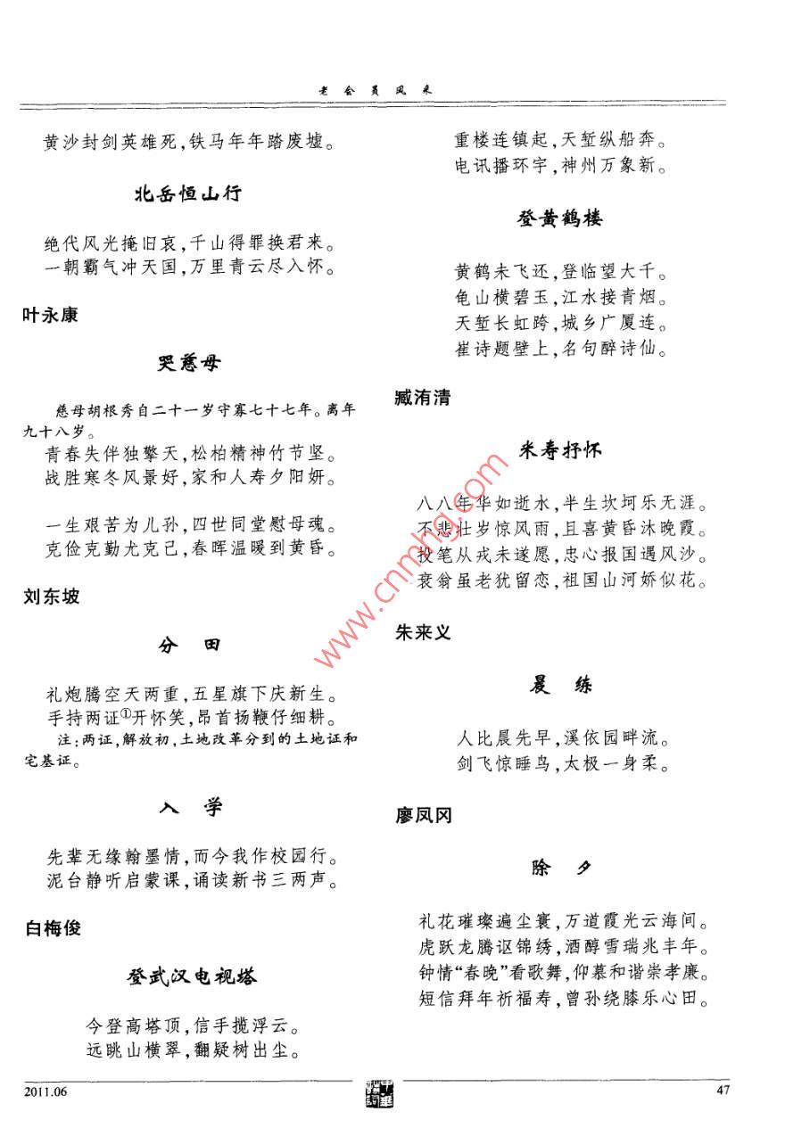 黃沙封劍英雄死,鐵馬年年踏廢墟。重樓連鎮(zhèn)起,天塹縱船奔。電訊播環(huán)宇,神州萬象新。北岳恒山行登黃鶴樓絕代風(fēng)光掩舊哀,千山得罪換君來。朝霸氣沖天國,萬里青云盡入懷。黃鶴未飛還,登臨望大千。龜山橫碧玉,江水接青煙葉永康天塹長虹跨,城鄉(xiāng)廣廈連哭意母崔詩題壁上,名句醉詩仙。慈母胡根秀自二十一歲守寡七十七年。離年臧洧清九十八歲。青春失伴獨擎天,松柏精神竹節(jié)堅。米壽抒懷戰(zhàn)勝寒冬風(fēng)景好,家和人壽夕陽妍。八八年華如逝水,半生坎坷樂無涯。生艱苦為兒孫,四世同堂慰母魂不悲壯歲驚風(fēng)雨,且喜黃昏沐晚霞??藘€克勤尤克已,春暉溫暖到黃昏投筆從戎未遂愿,忠心報國遇風(fēng)沙。劉東坡衰翁雖老猶留戀,祖國山河嬌似花。分田朱來義禮炮騰空天兩重,五星旗下慶新生晨練手持兩證①開懷笑,昂首揚鞭仔細耕注:兩證,解放初,土地改革分到的土地證和人比晨先早,溪依園畔流。宅基證。劍飛驚睡鳥,太極一身柔。入學(xué)廖鳳岡先輩無緣翰墨情,而今我作校園行。泥臺靜聽啟蒙課,誦讀新書三兩聲。除少白梅俊禮花璀璨遍塵寰,萬道霞光云海間?;④S龍騰謳錦繡,酒醇雪瑞兆豐年。登武漢電視塔鐘情“春晩”看歌舞,仰慕和諧崇孝廉。短信拜年祈福壽,曾孫繞膝樂心田。今登高塔頂,信手攬浮云。遠眺山橫翠,翻疑樹出塵