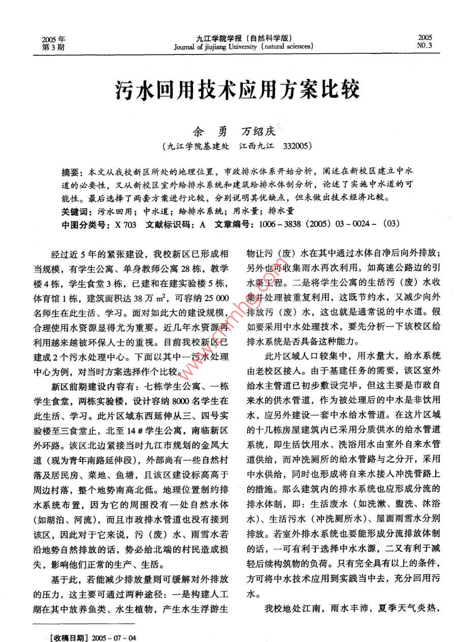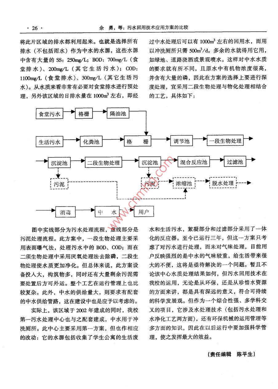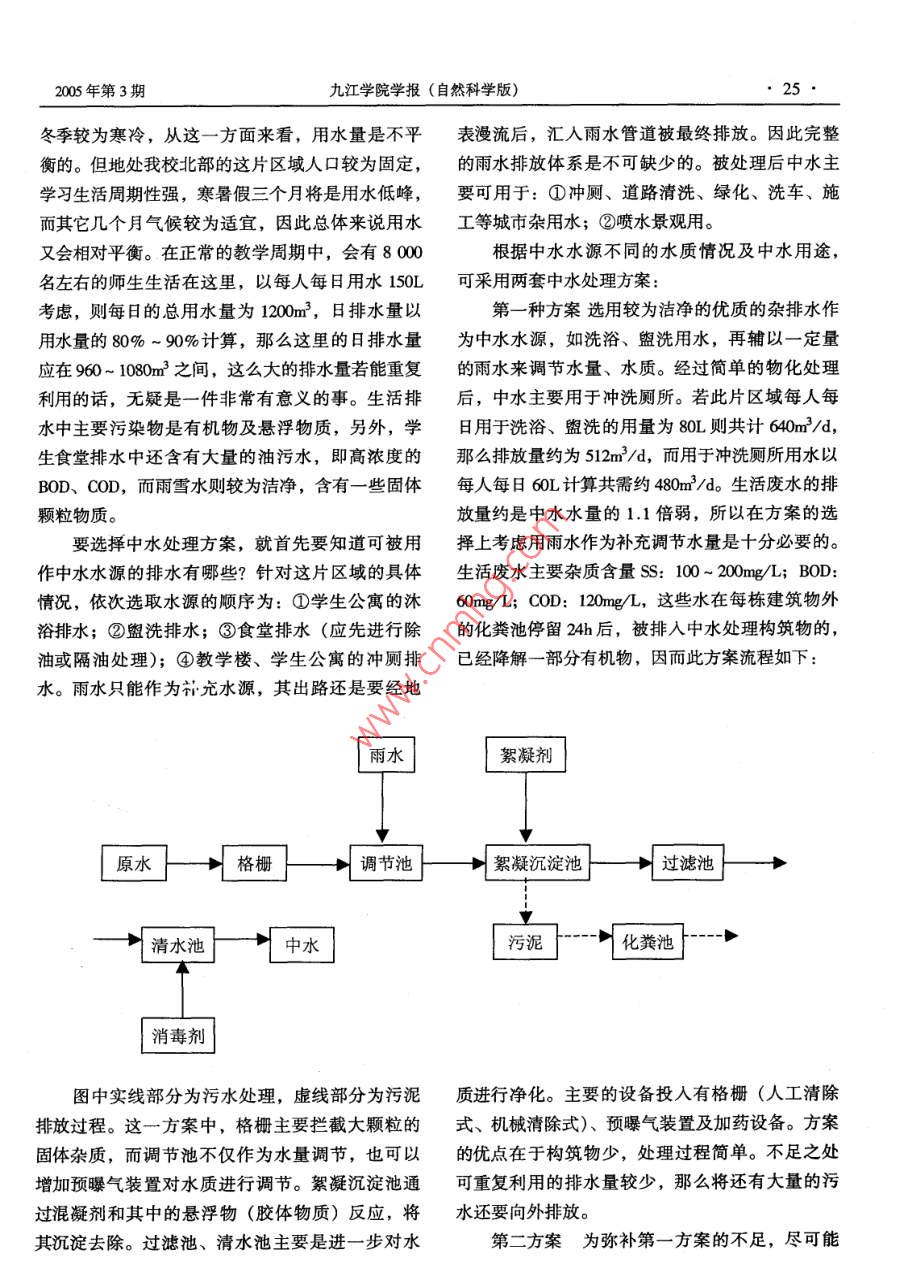 2005年九江學(xué)院學(xué)報(bào)(自然科學(xué)版)Joumal of jiujiang University(natural sciences)污水回用技術(shù)應(yīng)用方案比較余勇萬紹慶(九江學(xué)院基建處江西九江33005)摘要:本文從我校新區(qū)所處的地理位置,市政排水體系開始分析,闡述在新校區(qū)建立中水道的必要性,又從新校區(qū)室外給排水系統(tǒng)和建筑給排水體制分析,論謎了實(shí)施中水道的可能性。最后選擇了兩套方案進(jìn)行比較,分別說明其優(yōu)缺點(diǎn),但未做出技術(shù)經(jīng)濟(jì)比較。關(guān)鍵詞:污水回用;中水道;給排水系統(tǒng);用水量;排水量中圖分類號:X703文獻(xiàn)標(biāo)識碼:A文章編號:1006-3838(2005)03-0024-(03)經(jīng)過近5年的緊張建設(shè),我校新區(qū)已形成相物讓污(廢)水在其中通過水體自凈后向外排放;當(dāng)規(guī)模,有學(xué)生公寓、單身教師公寓28棟,教學(xué)另外也可收集雨水再次利用,如高速公路邊的引樓4棟,學(xué)生食堂3棟,已建和在建實(shí)驗(yàn)樓5棟,水渠工程。二是將學(xué)生公寓的生活污(廢)水收體育館1棟,建筑面積達(dá)38萬m2,可容納2500集并處理被重復(fù)利用,這既節(jié)約水,又減少向外名師生在此生活、學(xué)習(xí)。面對如此大的建設(shè)規(guī)模,排放污(廢)水,這也就是通常說的中水道。假合理使用水資源顯得尤為重要。近幾年水資源再如要采用中水處理技術(shù),要先分析一下該校區(qū)給利用越來越被環(huán)保人士的重視。目前我校新區(qū)已排水系統(tǒng)是否具備這種能力。建成2個(gè)污水處理中心。下面以其中一污水處理此片區(qū)域人口較集中,用水量大,給水系統(tǒng)中心為例,對當(dāng)時(shí)方案選擇作個(gè)比較。由老校區(qū)接入。由于基建任務(wù)的需要,該區(qū)室外新區(qū)前期建設(shè)內(nèi)容有:七棟學(xué)生公寓、一棟給水主管道已初步敷設(shè)完畢,但這主要是市政自學(xué)生食堂,兩棟實(shí)驗(yàn)樓,設(shè)計(jì)容納8000名學(xué)生在來水的供水管道,作為被處理后的中水是非飲用此生活、學(xué)習(xí)。此片區(qū)域東西延伸從三、四號實(shí)水,應(yīng)另外建設(shè)一套中水給水管道。在這片區(qū)域驗(yàn)樓至三食堂止,北至14#學(xué)生公寓,南臨新區(qū)的十幾棟房屋建筑內(nèi)已采用分質(zhì)供水的給水管道外環(huán)路。該區(qū)北邊緊接當(dāng)時(shí)九江市規(guī)劃的金鳳大系統(tǒng),即生活飲用水、洗浴用水由室外自來水管道(現(xiàn)為青年南路延伸段),外部尚有一些自然村道供給,而沖洗廁所的給水管路與之分開,采用落及居民房、菜地、魚塘,且該區(qū)建設(shè)標(biāo)高高于中水供給,同時(shí)也形成將自來水接入沖洗管路上周邊村落,整個(gè)地勢南高北低。地理位置制約排的措施。那么建筑內(nèi)的排水系統(tǒng)也應(yīng)形成分流的水系統(tǒng)布置,因?yàn)樗闹車鷽]有一處自然水體排水體制,即:生活廢水(如洗漱、盥洗、沐浴(如湖泊、河流),而且市政排水管道也沒有接到水)、生活污水(沖洗廁所水)、屋面雨雪水分別該區(qū),因此對于它來說,污(廢)水、雨雪水若排放。若室外排水系統(tǒng)也要能形成分流排放體制沿地勢自然排放的話,勢必給北端的村民造成損的話,一可有利于選擇中水水源,二又有利于減失,影響他們正常的生產(chǎn)、生活。輕后續(xù)構(gòu)筑物的負(fù)荷。只有完全具有以上的條件,基于此,若能減少排放量則可緩解對外排放方可將中水技術(shù)應(yīng)用到實(shí)踐當(dāng)中去,充分回用污的壓力,這主要可通過兩種途徑:一是構(gòu)建人工水。湖在其中放養(yǎng)魚類、水生植物,產(chǎn)生水生浮游生我校地處江南,雨水豐沛,夏季天氣炎熱,稿日期]2005-07-005年第3期九江學(xué)院學(xué)報(bào)(自然科學(xué)版)冬季較為寒冷,從這一方面來看,用水量是不平表漫流后,匯入雨水管道被最終排放。因此完整衡的。但地處我校北部的這片區(qū)域人口較為固定,的雨水排放體系是不可缺少的。被處理后中水主學(xué)習(xí)生活周期性強(qiáng),寒暑假三個(gè)月將是用水低峰,要可用于:①?zèng)_廁、道路清洗、綠化、洗車、施而其它幾個(gè)月氣候較為適宜,因此總體來說用水工等城市雜用水;②噴水景觀用。又會(huì)相對平衡。在正常的教學(xué)周期中,會(huì)有8000根據(jù)中水水源不同的水質(zhì)情況及中水用途,名左右的師生生活在這里,以每人每日用水150L可采用兩套中水處理方案考慮,則每日的總用水量為100m3,日排水量以第一種方案選用較為潔凈的優(yōu)質(zhì)的雜排水作用水量的80%~90%計(jì)算,那么這里的日排水量為中水水源,如洗浴、盥洗用水,再輔以一定量應(yīng)在960~1080m3之間,這么大的排水量若能重復(fù)的雨水來調(diào)節(jié)水量、水質(zhì)。經(jīng)過簡單的物化處理利用的話,無疑是一件非常有意義的事。生活排后,中水主要用于沖洗廁所。若此片區(qū)域每人每水中主要污染物是有機(jī)物及懸浮物質(zhì),另外,學(xué)日用于洗浴、盥洗的用量為80L則共計(jì)640m3/d,生食堂排水中還含有大量的油污水,即高濃度的那么排放量約為512m3/d,而用于沖洗廁所用水以BOD、COD,而雨雪水則較為潔凈,含有一些固體每人每日60L計(jì)算共需約480m3/d。生活廢水的排顆粒物質(zhì)。放量約是中水水量的1.1倍弱,所以在方案的選要選擇中水處理方