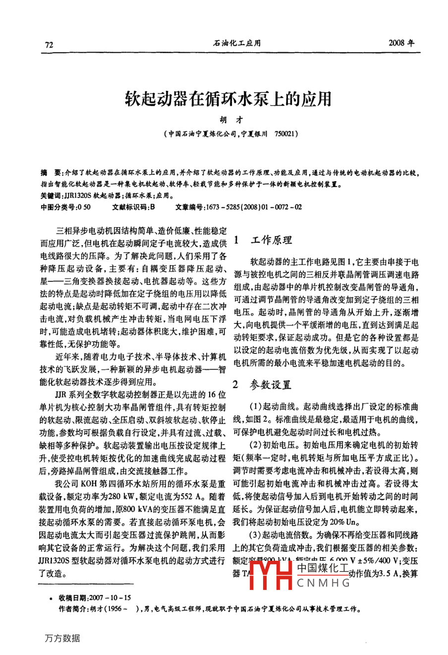 72石油化工應(yīng)用2008年軟起動器在循環(huán)水泵上的應(yīng)用胡才(中國石油寧夏煉化公司,寧夏銀川750021)摘要:介紹了軟起動器在循環(huán)水泵上的應(yīng)用,并介紹了軟起動器的工作原理、功能及應(yīng)用,通過與傳純的電動機(jī)起動器的比較,指出智能化軟起動器是一種集電機(jī)軟起動、軟停車、輕載節(jié)能和多種保護(hù)于一體的新穎電機(jī)控制裝置。關(guān)鍵詞:JR1320s軟起動器;循環(huán)水泵;應(yīng)用。中圖分類號050文獻(xiàn)標(biāo)識碼B文章編號:1673-5285(200801-0072-02三相異步電動機(jī)因結(jié)構(gòu)簡單、造價(jià)低廉、性能穩(wěn)定而應(yīng)用廣泛,但電機(jī)在起動瞬間定子電流較大,造成供1工作原理電線路很大的壓降。為了解決此問題,人們采用了各種降壓起動設(shè)備,主要有:自耦變壓器降壓起動軟起動器的主工作電路見圖1,它主要由串接于電星——三角變換器換接起動、電抗器起動等。這些方源與被控電機(jī)之間的三相反并聯(lián)晶閘管調(diào)壓調(diào)速電路法的特點(diǎn)是起動時(shí)降低加在定子繞組的電壓用以降低組成,由起動器中的單片機(jī)控制改變晶閘管的導(dǎo)通角起動電流;缺點(diǎn)是起動轉(zhuǎn)矩不可調(diào)起動中存在二次沖可通過調(diào)節(jié)晶閘管的導(dǎo)通角改變加到定子繞組的三相擊電流,對負(fù)載機(jī)械產(chǎn)生沖擊轉(zhuǎn)矩,當(dāng)電網(wǎng)電壓下浮電壓。起動時(shí),晶閘管的導(dǎo)通角從開始上升,逐漸增時(shí),可能造成電機(jī)堵轉(zhuǎn);起動器體積龐大維護(hù)困難,可大,向電機(jī)提供一個(gè)平緩漸增的電壓,直到達(dá)到滿足起靠性低,無保護(hù)功能等動轉(zhuǎn)矩要求,保證起動成功。但是它的各種設(shè)置都是近年來,隨著電力電子技術(shù)、半導(dǎo)體技術(shù)、計(jì)算機(jī)以設(shè)定的起動電流倍數(shù)為優(yōu)先級,從而實(shí)現(xiàn)了以起動技術(shù)的飛躍發(fā)展,一種新穎的異步電機(jī)起動器—智電機(jī)所需的最小電流來平穩(wěn)加速電機(jī)起動的目的能化軟起動器技術(shù)逐步得到應(yīng)用。2參數(shù)設(shè)置JR系列全數(shù)字軟起動控制器正是以先進(jìn)的16位單片機(jī)為核心控制大功率晶閘管組件,具有轉(zhuǎn)矩控制起動曲線。起動曲線選擇出廠設(shè)定的標(biāo)準(zhǔn)曲的軟起動限流起動、全壓啟動雙斜坡軟起動軟停止線如圖2。標(biāo)準(zhǔn)曲線是最穩(wěn)定,最適用于電機(jī)的曲線,功能,參數(shù)均可根據(jù)負(fù)載自行設(shè)定,并具有過流、過載、可保護(hù)電機(jī)避免起動時(shí)間過長和電機(jī)過熱。缺相等多種保護(hù)。軟起動裝置輸出電壓按設(shè)定規(guī)律上(2)初始電壓。初始電壓用來確定電機(jī)的初始轉(zhuǎn)升,使受控電機(jī)轉(zhuǎn)矩按優(yōu)化的加速曲線完成起動過程矩(頻率一定時(shí),電機(jī)轉(zhuǎn)矩與所加電壓平方成正比)。后,旁路掉晶閘管組成,由交流接觸器工作調(diào)節(jié)時(shí)需要考慮電流沖擊和機(jī)械沖擊,若設(shè)得太高,則我公司KOH第四循環(huán)水站所用的循環(huán)水泵是重可能引起初始電流沖擊和機(jī)械沖擊過高。若設(shè)得太載設(shè)備額定功率為280kW,額定電流為552A。隨著低,將使起動信號加入后到電機(jī)開始轉(zhuǎn)動之間的時(shí)間裝置用電負(fù)荷的增加,原800kVA的變壓器不能滿足直延長。為保證起動信號加入后,電機(jī)能立即轉(zhuǎn)動起來,接起動循環(huán)水泵的需要。若直接起動循環(huán)泵電機(jī),會我們將起動初始電壓設(shè)定為20%Un因起動電流太大而引起變壓器過流保護(hù)跳閘,從而影(3)起動電流倍數(shù)。為確保不再給變壓器和同線路響其它設(shè)備的正常運(yùn)行。為解決這個(gè)問題,我們采用上的其它負(fù)荷造成沖擊,我們根據(jù)變壓器的相關(guān)參數(shù):JR320s型軟起動器對循環(huán)水泵電機(jī)的起動方式進(jìn)行額定量V±5%/40vV;變壓了改造。中國煤化工CNML動作值為35A換算收稿日期:2007-10-15作者簡介:胡才(1956-),男,電氣高級工程師,現(xiàn)就職于中國石油寧夏煉化公司從事技術(shù)管理工作。胡才軟起動器在循環(huán)水泵上的應(yīng)用流控制在額定電流的23倍以下。(4)起動加速時(shí)間:是指決定電機(jī)電壓從初始值到全壓值斜坡上升時(shí)間設(shè)定為18S(5)最長起動時(shí)間:循環(huán)泵電機(jī)的起動因受工藝要Y(電動機(jī))求限制最長起動時(shí)間不能超過50S。若起動時(shí)間過長,將會導(dǎo)致電機(jī)溫度急劇上升,容易把轉(zhuǎn)子燒壞。3結(jié)束語軟起動器參數(shù)設(shè)置完畢并經(jīng)調(diào)試,循環(huán)泵電機(jī)起動平滑由于起動時(shí)間為20S,滿足生產(chǎn)工藝要求。由步檢測觸發(fā)脈沖電流檢測于起動電流不超過1300A,對供電系統(tǒng)沖擊小,起動0c9。1斗三效果良好,所以解決了過去在啟動循環(huán)泵時(shí)容易造成變壓器保護(hù)裝置過流動作而跳閘,從而導(dǎo)致低壓失電發(fā)生連鎖停機(jī)事故;也解決了直接起動循環(huán)泵造成對顯示鍵盤變壓器和供電系統(tǒng)的沖擊問題。綜上所述該軟起動器具有以下特點(diǎn):圖1基本電路框圖(1)起動轉(zhuǎn)矩電流電壓時(shí)間可按負(fù)載不同靈活設(shè)定,取得最佳的電流沖擊和最佳的轉(zhuǎn)矩控制特性