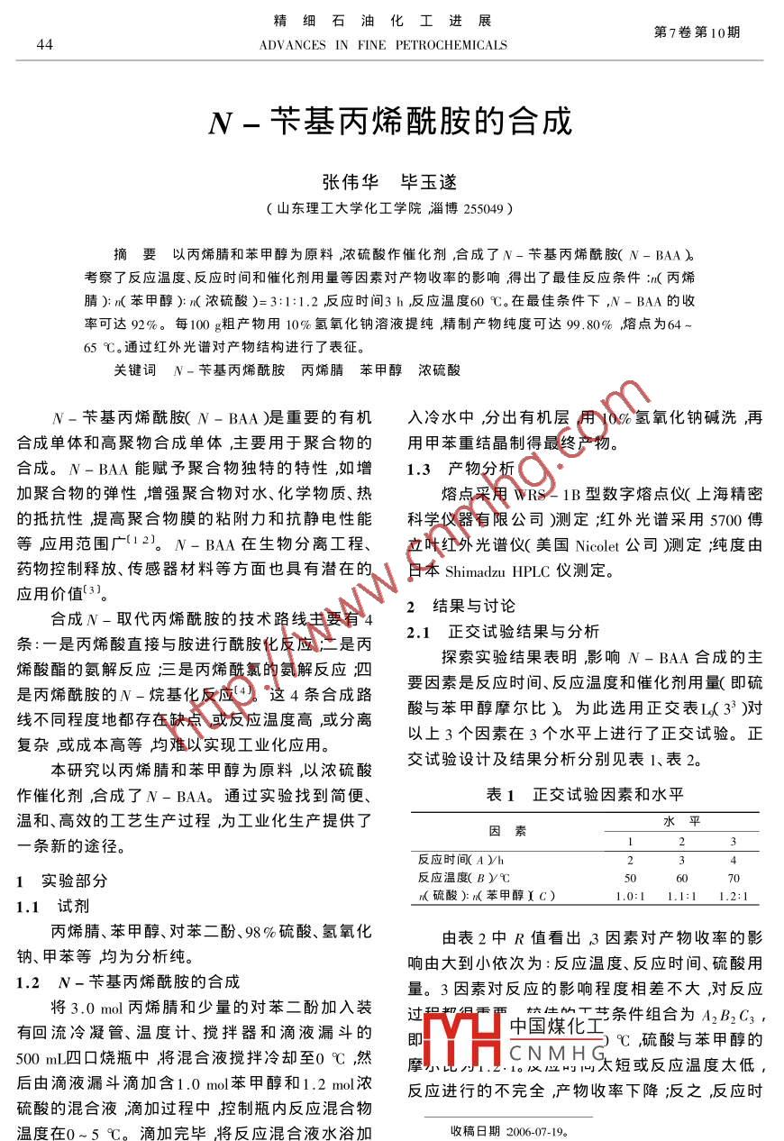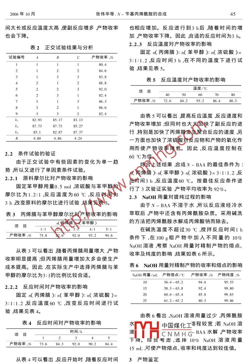 精細石油化工進展第7卷第10期44ADVANCES IN FINE PETROCHEMICALSN-芐基丙烯酰胺的合成張偉華畢玉遂山東理工大學化工學院淄博255049)摘要以丙烯腈和苯甲醇為原料濃硫酸作催化劑,合成了N-芐基丙烯酰胺(N-BAA考察了反應溫度、反應時間和催化劑用量等因素對產(chǎn)物收率的影響得出了最佳反應條件:n(丙烯腈):κ苯甲醇)κ濃硫酸)=3:1:1.2反應時間3h,反應溫度60℃。在最佳條件下,N-BAA的收率可達9%。每100g粗產(chǎn)物用10%氫氧化鈉溶液提純精制產(chǎn)物純度可達99.80%熔點為6465℃。通過紅外光譜對產(chǎn)物結構進行了表征關鍵詞N-芐基丙烯酰胺丙烯腈苯甲醇濃硫酸N-芐基丙烯酰胺(N-BA)是重要的有機入冷水中,分出有機層,用10%氫氧化鈉堿洗再合成單體和高聚物合成單體,主要用于聚合物的用甲苯重結晶制得最終產(chǎn)物。合成。N-BA能賦予聚合物獨特的特性,如增1.3產(chǎn)物分析加聚合物的彈性增強聚合物對水、化學物質(zhì)、熱熔點采用wRS-1B型數(shù)字熔點儀(上海精密的抵抗性提高聚合物膜的粘附力和抗靜電性能科學儀器有限公司)測定;紅外光譜采用5700傅藥物控制釋放、傳感器材料等方面也具有潛在的日本 Shimadzu hplc儀測t公司)測定純度由等應用范圍廣2.N-BAA在生物分離工程、立葉紅外光譜儀(美國Ni應用價值(32結果與討論合成N-取代丙烯酰胺的技術路線主要有條:一是丙烯酸直接與胺進行酰胺化反應匯是丙2.1正交試驗結果與分析探索實驗結果表明影響N-BAA合成的主烯酸酯的氨解反應,是丙烯酰氯的氨解反應四是丙烯酰胺的N-烷基化反應4)。這4條合成路要因素是反應時間、反應溫度和催化劑用量(即硫線不同程度地都存在缺點或反應溫度高或分離酸與苯甲醇摩爾比)為此選用正交表13)對復雜或成本高等均難以實現(xiàn)工業(yè)化應用以上3個因素在3個水平上進行了正交試驗。正本研究以丙烯腈和苯甲醇為原料以濃硫酸交試驗設計及結果分析分別見表1表2。作催化劑合成了N-BAA。通過實驗找到簡便、表1正交試驗因素和水平溫和、高效的工藝生產(chǎn)過程為工業(yè)化生產(chǎn)提供了因素條新的途徑。反應時間(A)h1實驗部分反應溫度(By℃κ(硫酸)κ(苯甲醇IC)1.1試劑丙烯腈、苯甲醇、對苯二酚、98%硫酸、氫氧化由表2中R值看出3因素對產(chǎn)物收率的影鈉、甲苯等均為分析純。響由大到小依次為:反應溫度、反應時間、硫酸用1.2N-芐基丙烯酰胺的合成量。3因素對反應的影響程度相差不大,對反應將30ml丙烯腈和少量的對苯二酚加入裝過都但嚴釅體藝條件組合為A2B2C3有回流冷凝管、溫度計、攪拌器和滴液漏斗的即500mL四口燒瓶中將混合液攪拌冷卻至0℃,然CNMH℃硫酸與苯甲醇的摩小1,.1。應太短或反應溫度太低后由滴液漏斗滴加含1.0mol苯甲醇和1.2mo濃反應進行的不完全產(chǎn)物收率下降;之,反應時硫酸的混合液滴加過程中控制瓶內(nèi)反應混合物溫度在0~5℃。滴加完畢將反應混合液水浴加收稿日期2006-07-19。熱到60它葆蠱應3h。反應結束將反應液倒作者簡介張偉華在讀碩士研究生,主要從事精細有機合成方面的研究2006年10月張偉華等,N-芐基丙烯酰胺的合成45間太長或反應溫度太高使副反應增多產(chǎn)物收率也相應增加。反應進行到3h后,隨著時間的增也會下降。加產(chǎn)物收率下降。因此合適的反應時間為3h。表2正交試驗結果與分析2.2.3反應溫度對產(chǎn)物收率的影響固定κ丙烯腈):n(苯甲醇):n(濃硫酸)=試驗編號產(chǎn)物收率,%3:1:1.2反應時間3h,在不同的溫度下進行試123184.6驗結果見表51232313I表5反應溫度對產(chǎn)物收率的影響22233392.0溫度/℃56789項目產(chǎn)物收率,%7286.688sEt由表5可以看出提高反應溫度反應速度和83.13產(chǎn)物收率增加;但同時也大大加快了副反應的進R87.37行特別是加快了丙烯腈發(fā)生聚合反應的速度,另4.24方面也加快了濃硫酸對反應物和產(chǎn)物的氧化作用而使產(chǎn)物收率降低。因此,反應溫度控制在2.2條件試驗的驗60℃為佳由于正交試驗中有些因素的變化為單一趨綜合上述結果合成N-BA的最佳條件為勢所以又進行了單因素條件試驗。n丙烯腈):κ(苯甲醇)n(濃硫酸)=3:1:1.2反2.2.1原料摩爾比對產(chǎn)物收率的影響應時間3h,反應溫度60℃。按最佳反應條件進固定苯甲醇用量0.5mol濃硫酸與苯甲醇的行了3次驗證實驗產(chǎn)物平均收率為92%摩爾比為1.2:1,反應溫度為60℃,反應時間為2.3NaOH用量對提純過程的影響3h改變原料的摩爾比進行試驗結果見表3由于N-BAA不溶于水所以反應液經(jīng)冷水表3丙烯腈與苯甲醇摩爾比對產(chǎn)物收率的影響萃取后產(chǎn)物中還含有丙烯酰胺雜質(zhì)。采用堿洗κ(丙烯腈):n(苯甲醇)的方法把丙烯酰胺水解成丙烯酸鈉而除去在堿洗溫度不超過30℃,攪拌反應時間1h物收率條件下,在100g粗產(chǎn)物中加入不同量的10%NaOH溶液考察NaOH用量對精制產(chǎn)物的熔點、從表3可以看出隨著丙烯腈用量增大產(chǎn)物收率及純度的影響結果如表6所示。收率明顯提高但丙烯腈用量增加太多會使生產(chǎn)成本提高。因此在實際生產(chǎn)中選擇丙烯腈與苯表6NaOH用量對精制產(chǎn)物的收率和熔點的影響甲醇的摩爾比為3:1的比例比較合適NaOH用量/mL產(chǎn)物熔點/℃產(chǎn)物收率,%產(chǎn)物純度56.4~65.22.2.2反應時間對產(chǎn)物收率的影響固定κ(丙烯腈):n(苯甲醇):n(濃硫酸)3:1:1.2反應溫度60℃,改變反應時間進行試驗結果見表4由