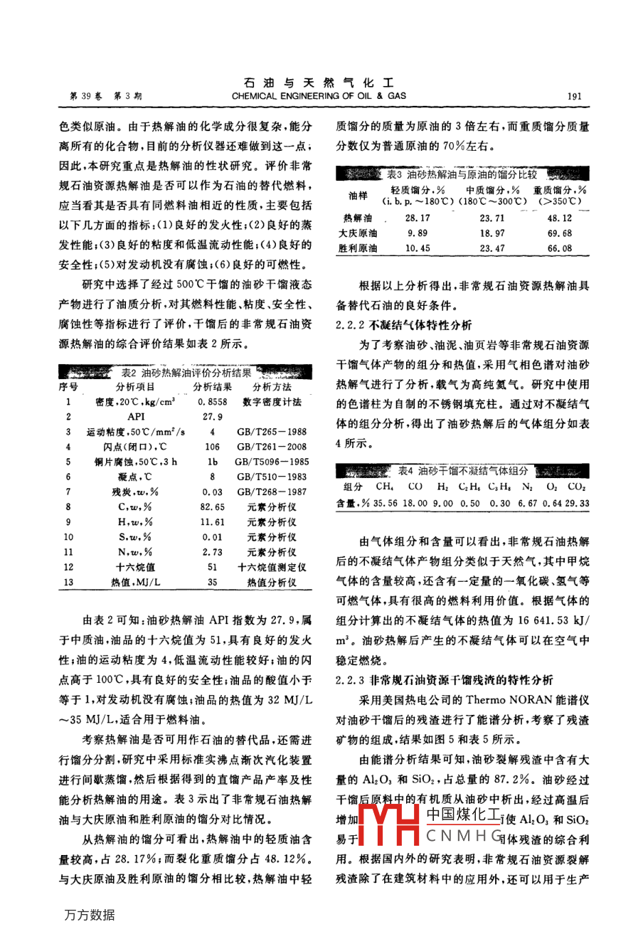 石油與天然氣化工第39裹第3期CHEMICAL ENGINEERING OF OIL GAS非常規(guī)石油資源熱解特性研究李海英12張貴杰2高翔(1.天津大學(xué)環(huán)境科學(xué)與工程學(xué)院2.河北理工大學(xué)冶金與能源學(xué)院)摘要通過自制的熱解裝置對非常規(guī)石油資源油砂、油頁巖及油泥進行了熱解模擬實驗研究,分析了不同熱工條件下熱解產(chǎn)物中油和干餾殘渣的特性、氣體組分和產(chǎn)率。結(jié)果表明,固體產(chǎn)物的產(chǎn)率隨著熱解溫度的升高逐漸下降,油的產(chǎn)率在500℃左右時存在最大值,不凝結(jié)氣體的產(chǎn)率隨著熱解溫度的升高逐漸升高;不同熱解溫度下油氣收率為95%~99.5%其中油的比例為70%~75%;非常規(guī)石油資源的熱解液態(tài)產(chǎn)物具有良好的發(fā)火性、低溫流動性能、良好的安全性等特性,可以達到燃料油的指標要求。關(guān)鍵詞非常規(guī)石油資源熱解特性DOI:10.3969/j.issn.1007-3426.2010.03,003非常規(guī)石油資源包括重質(zhì)油、高粘油、油砂、天我國石油對外依存度還將上升。大量地依靠進口能然瀝青、油頁巖等。據(jù)考察發(fā)現(xiàn),我國重質(zhì)油、油砂、源,必然影響我國的經(jīng)濟發(fā)展,制約我國的發(fā)展進油頁巖等非常規(guī)資源儲量豐富,油頁巖資源儲量僅程,甚至還會威脅到國家的安全。因此,節(jié)能和開發(fā)次于美國、巴西和愛沙尼亞,居世界第4位。油頁巖非常規(guī)能源等石油替代品,必將成為今后應(yīng)對我國資源主要分布于內(nèi)蒙、山東、山西、吉林、黑龍江、陜能源不足的最佳途徑,對非常規(guī)石油資源的開發(fā)利西、遼寧、廣東、新疆等9省,已探明的儲量為311.7用對我國有非常重要的意義?!?03t,預(yù)測儲量約4520×108t。油泥是石油開1實驗采和冶煉過程中產(chǎn)生的固體廢棄物,我國煉油行業(yè)每年排放的油泥量在80×10t以上,而油泥的含油1.1非常規(guī)石油資源特性分析量大多在10%~30%2。油砂是不可流動的石油研究中油砂、油泥、油頁巖三種物料分別取自內(nèi)礦產(chǎn),目前全世界探明的油砂資源有95%集中在加蒙古扎賚特旗、南堡油田、遼寧撫順。為了考察油拿大(。我國油砂點多面廣,且含油率高有的地區(qū)砂油泥油頁巖等非常規(guī)石油資源的熱解特性研油砂含油率高達12%以上,其遠景儲量達百億噸以究中對非常規(guī)石油資源的基本物理化學(xué)性質(zhì)進行了上,勘探前景十分喜人t。研究。實驗物料的工業(yè)分析和元素分析結(jié)果如表1非常規(guī)石油資源以其儲量巨大、分布集中、開發(fā)所示。技術(shù)日趨進步等特點成為世界石油市場的新寵。作通過分析得出,油砂、油頁巖、油泥等非常規(guī)石為發(fā)展中國家的中國,經(jīng)濟的發(fā)展使得能源消耗量油資源中都含有一定量的油氣成分,具有較高的開大幅增加而我國石油資源卻很有限已探明的人均發(fā)利用價值石油可采儲量僅為世界人均水平的7‰。據(jù)統(tǒng)1.2油砂油幣興執(zhí)解實驗計,2006年我國原油凈進口14518×10t,成品油中國煤化工如圖1所示,由熱進口3638×10t,對外依存度高達43%,今后,解爐CNMHG管差壓計、氣體流基金項目:中國博士后科學(xué)基金項目(20080430727)190非常規(guī)石油資源熱解特性研究量計、溫控儀等組成丬表1非常規(guī)石油資源工業(yè)分析與元素分析業(yè)分析,%素分析,%Wad Aad Vad FCad Cad Had Nad Sad不凝結(jié)氣體油砂1.2585.8412.050.8610.162.650.891.02油頁巖7.5059.2630.153.0922.273.100.580.65油泥5.5270.2523.051.1819.502.870.280.70熱解溫度,℃注:Wad為空氣干燥基水分含量;Aad為空氣干燥基灰圖2油砂熱解特性分含量;Vad為空氣干燥基揮發(fā)分含量;FCad為空氣干燥基固定炭含量;Cad為碳元素含量;Had為氫元素含量;Nad為氯元素含量;Sad為硫元素含量不凝結(jié)氣體溫度計流量表熱解溫度,℃溫控器圖3油泥熱解特性鶇頭洗氣瓶定床熱解液收集器熱解反應(yīng)器熱解爐1熱解實驗裝置系統(tǒng)圖非常規(guī)石油資源熱解產(chǎn)物的產(chǎn)率采用稱量法160400一不凝結(jié)氣體究,其中固體和液體的產(chǎn)量直接用天平稱量,氣態(tài)產(chǎn)物的質(zhì)量采用差減法獲得,氣體產(chǎn)物的體積用流量計測定。將實驗裝置的各系統(tǒng)連接調(diào)整溫度控制熱解溫度,℃器中的參數(shù),使整個熱解過程按設(shè)定的程序進行。圖4油頁巖熱解特性通過對油砂油頁巖油泥的熱重實驗得出450℃~存在最大值油砂、油泥、油頁巖的最大油產(chǎn)率分別600℃熱解失重變化率最大,為最佳反應(yīng)溫度段,非達到8.97%、1,11)、2.30%,不凝結(jié)氣體的產(chǎn)率常規(guī)石油資源熱解爐內(nèi)的氣體溫度應(yīng)該維持在隨著熱解溫度的升高逐漸升高。通過比較不同熱解450℃~600℃之間。因此熱解終溫選取450℃條件下油、氣的收率(油氣的回收率占原料中揮發(fā)組600℃,每隔50為一個實驗工況。實驗過程中反分的比例)得出,不同熱解溫度下油氣收率為95%應(yīng)器內(nèi)壓力保持微正壓,實驗以不再產(chǎn)生氣體為熱99.5%,其中液態(tài)油的比例為70%~75%。根據(jù)解終止來控制停留時間,載氣為高純氮氣實驗室的研究結(jié)果,采用干餾工藝從油砂、油泥、油結(jié)果與討論頁巖等非常規(guī)石油資源中提取油的產(chǎn)率和油氣收率2.1熱解溫度對固、氣液產(chǎn)物產(chǎn)率的影響都很高。為了考察不同熱解