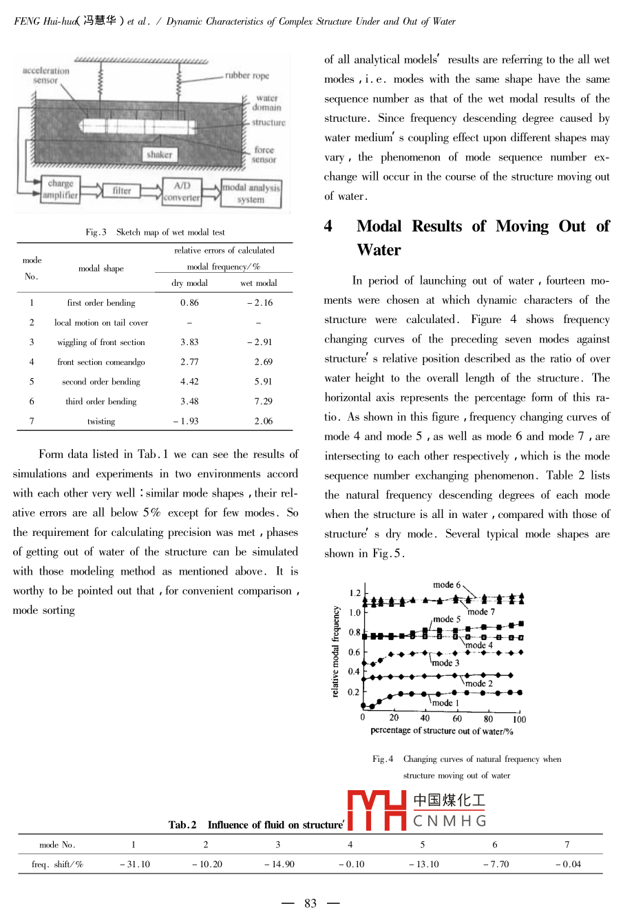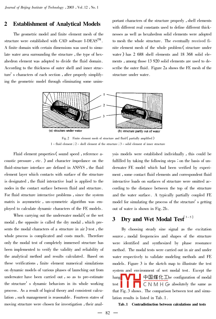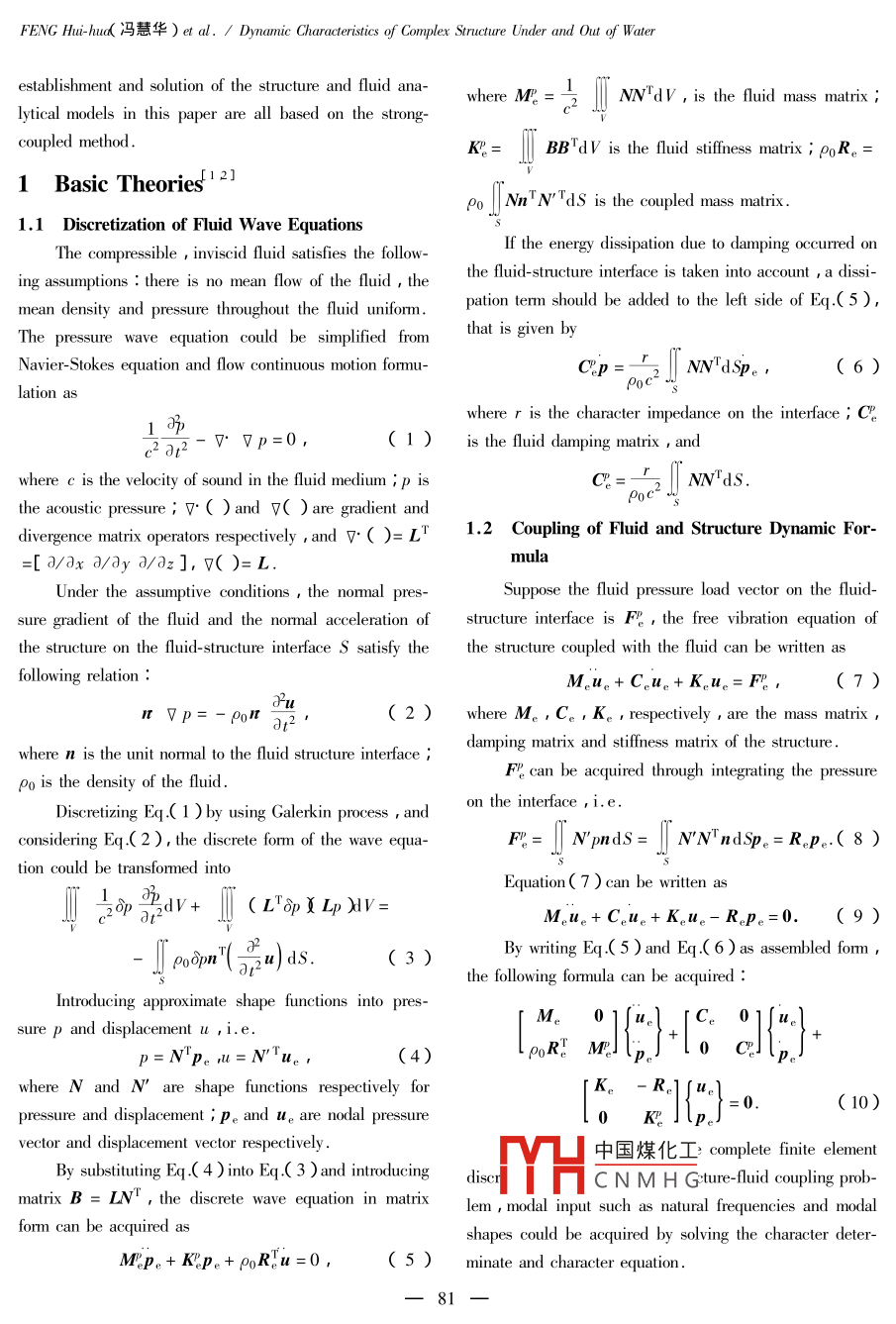 Joural of Beijing Institute of Technology ,2003 , Vol.12 ,No.1Dynamic Characteristics of Complex Structure Underand Out of W aterFENG Hui-hus( 馮慧華),LIAO Ri-dong廖日東),ZU0 Zheng-xing(左正興),RONG Ke-li(榮克林尸( 1.School of Mechanical and Vehicular Engineering , Beiing Institute of Technology , Beijing 100081 , China ;2. Beijing Institute of Structure and Environment Engineering , Beijig 100034 , China )Abstract :To understand the dynamic characteristics of the whole period of a complex structure' s launching out of water ,on the basis of FEM formulations deduced for solving coupled fluid-structure problems with strong- coupled method , FEmodels used to simulate the structure surrounded with fluid domains are established. The modal experiment on the realstructure under shallow water shows great accordance with simulating results. Based on this verification , dynamic charac-ter parameters of all FE models simulating each phase of the structure' s launching out of water are abstracted with unsym-metric algorithm , which can comprehensively descibe the dynamic characters of the structure in its whole working pro-cess. Conclusions drawned from these calculations are scessfully applied in works of evaluating the structure' s perfor-mances and reliabilities.Key words : complex structure ; FEM ; structure-fluid coupling ; dynamic characteristicsCLC number :V414.1 .Document code :AArticle ID : 1004-0579( 2003 )01-0080-05The structure shown in Fig.1 , whose outer shell is aThis method has a relatively brief mathematical format andthin wall cylinder with sections different in thickness , be-the merit of requiring less computation cost ,thus it islongs to a complex revolving compound object. Based onwidely applied. But the precision the weak-coupledthe real working environment , dynamic characteristics ofmethod can reach is not high enough. The strong -coupledthe structure under shallow water and during each phasesmethod establishes motion equations of fluid and structureof launching out of water need to be understood. Owing toindividually , and synthetically solves the combined equa-its scale and dimension , completely relying on experi-tions with some kinds of the latest numerical techniques.ments is not economic ,even unexecutable ,numericalSo it could characterize the motion of fluid more exactly ,simulation techmiques must be introduced into the processand can reflect interaction between fluid and structureof investigation.more actually , therefore dynamic results of structure cou-front sectionmiddle sectionrear sectionpled with fluid acquired through this method are bound tobe close to the realities. In addition , with the developingof computer hardware and software as well as the improve-Fig.1 Contour of the structure to be studiedment of the numerical computing techmiques , consumingCalculating techniques for coupled fluid-structuretoo much of computer system resources , which used to beproblems can be divided into two categories : weak-cou-one of the chief defects of the strong coupled method , ispled method and strong- coupled method. For weak-cou-not prominent any more. It' s absolutely conceivable topled method , the fluid will be simplified so that its actionstud中國煤化工complex problems underon structure can be described as forms of fluid forces.concMYHC N M H G varying parameters. TheReceived 2002-05-21Biographies FENG Hui-hud( 1976 - ), doctoral student , fhbbit @ sina. com ; ZU0 Zheng-xinf 1963 - ) , professor , doctoral adviser.一80--FENG Hui-hud( 馮慧華)et al. / Dymamic Charateritics of Complex Struture Under and Out of Waterestablishment and solution of the structure and fluid ana-where M =- 2NN"dV , is the fluid mass matrix ;lytical models in this paper are all based on the strong-coupled method.K"=BB'dV is the fluid sifness matrix ; poR。=1 Basic Theories'21po |NnTN'TdS is the coupled mass matrix.1.1 Discretization of Fluid Wave EquationsIf the energy dissipation due to damping occurred onThe compressible , inviscid fluid satisfies the follow-ing assumptions : there is no mean flow of the fluid , thethe fluid-structure interface is taken into account , a dissi-mean density and pressure throughout the fluid uniform.pation temn should be added to the left side of Eq.( 5),The pressure wave equation could be simplified fromthat is given byNavier-Stokes equation and flow continuous motion formu-Cp="NN"d$p。,(6)lation aswhere r is the character impedance on the interface ; C。1吊7* Vp=0 ,(1)is the fluid damping matrix , andc2 72where c is the velocity of sound in the fluid medium ip isNN'dS.the acoustic pressure ; V* ( )and 7( ) are gradient anddivergence matrix operators respectively ,and V( )= L'1.2 Coupling of Fluid and Structure Dynamic For-=[ d/ax a/dy 8/az], 7( )= L.mulaUnder the assumptive conditions ,the normal pres-Suppose the fluid pressure load vector on the fluid-sure gradient of the fluid and the normal acceleration ofstructure interface is FR , the free vibration equation olthe structure on the fluid-structure interface S satisfy thethe structure coupled with the fluid can be written asfollowing relation :M。u.+ C。u。+ K。u。= FP,(7)r V p=-ρoIPu(2)where M。,C。, K。, respectively , are the mass matrix ,where n is the unit normal to the fluid structure interface ;damping matrix and stiffness matrix of the structure .FP can be acquired through integrating the pressurepo is the density of the fluid.Discretizing Eq.( 1 ) by using Galerkin process , andon the interface ,i.e.considering Eq.( 2 ) , the discrete form of the wave equa-F"= | N'pndS= | N'NI ndSp。= R。pe.( 8 )tion could be transformed intoEquation( 7 ) can be written as。五-2δp 2dV+ I( LTOpX Lp )IV=Mgue+ C。ue+ K。ue- R。pe=0. .( 9)(子By writing Eq.(5 )and Eq.( 6 ) as assembled form ,popn'u)ds.(3 )the following formula can be acquired :Introducing approximate shape functions into pres-M。sure p and displacement u i.e.l poR!p=N"pe ,l=N'Tue,(4)where N and N' are sha