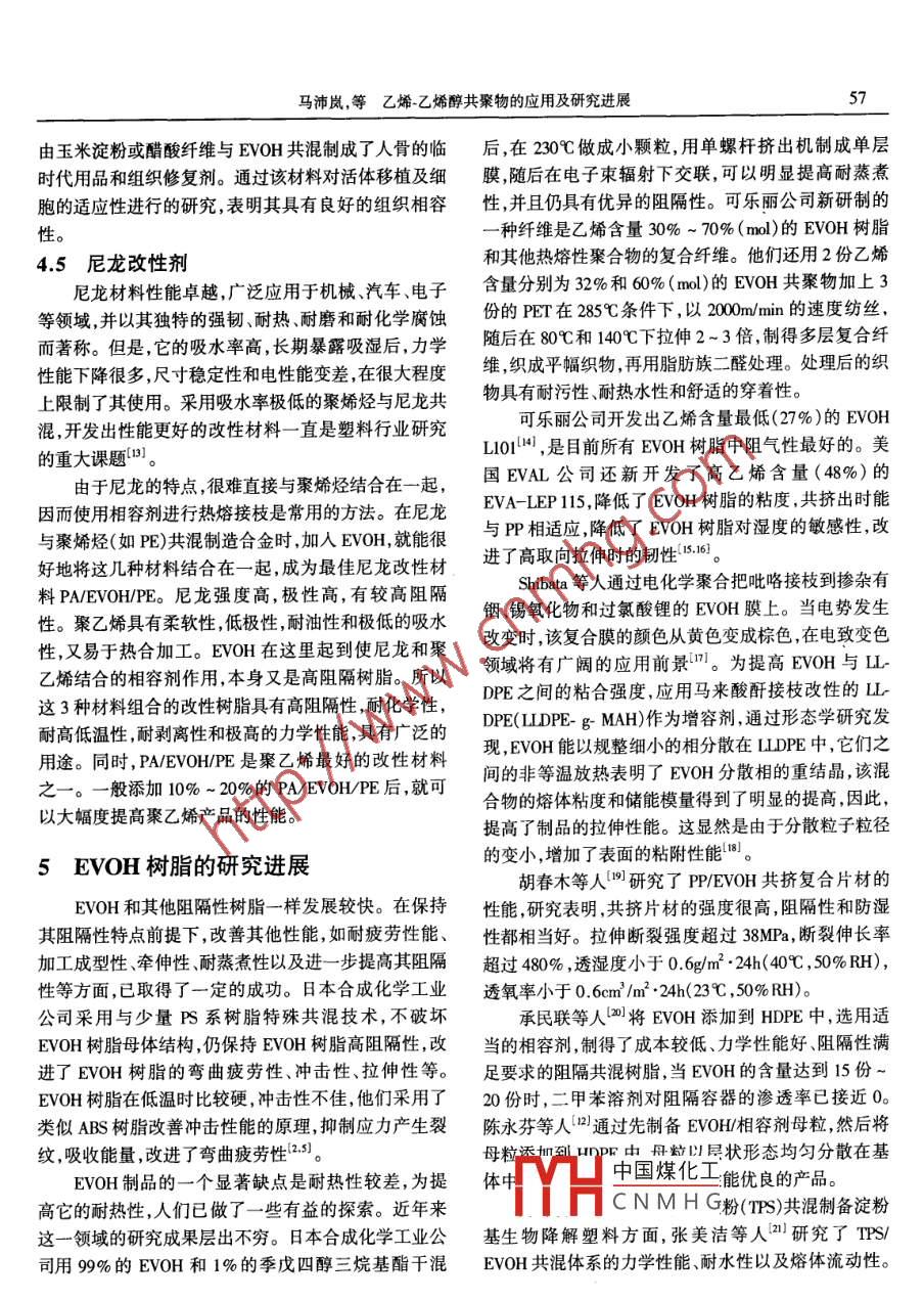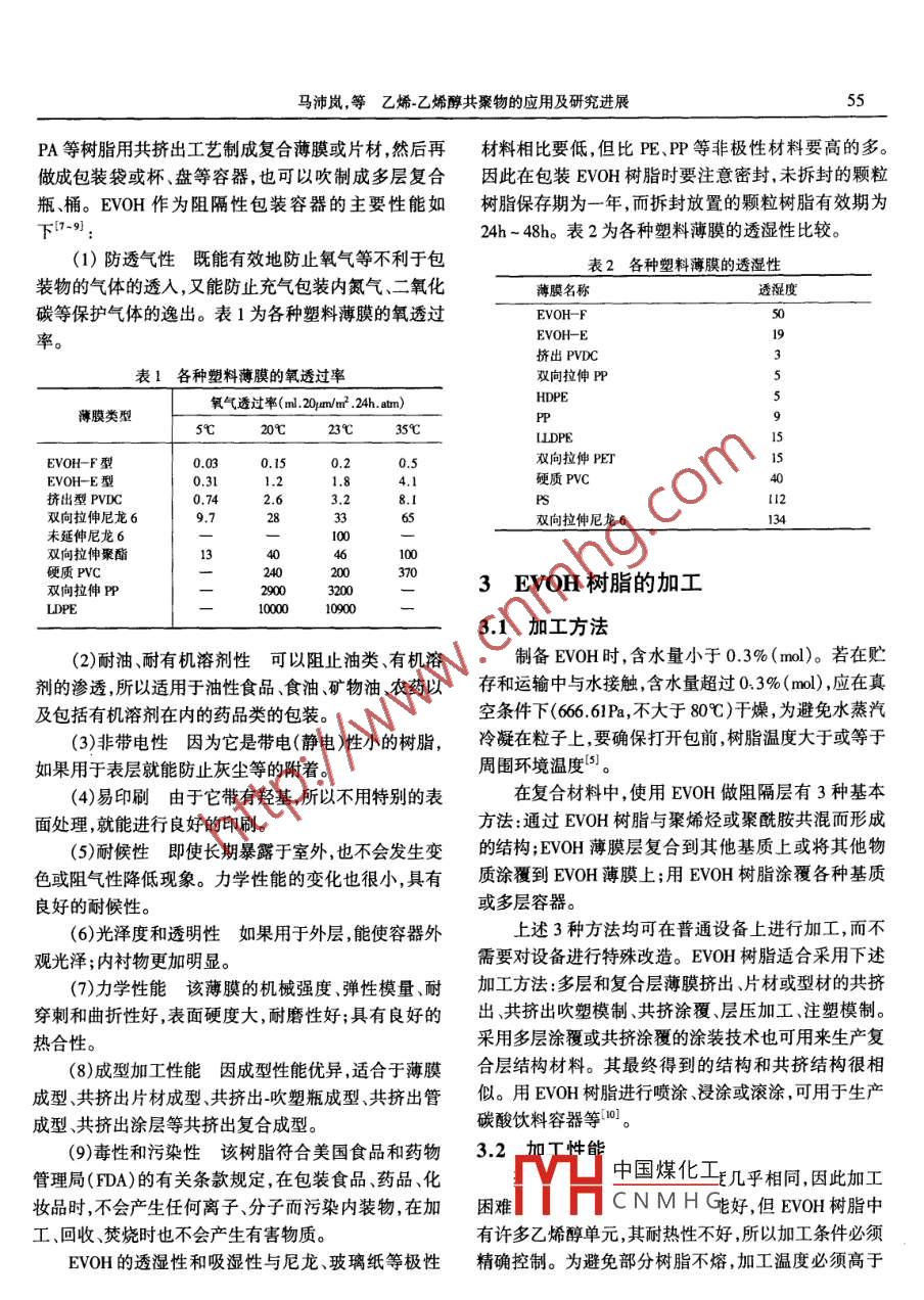 塑料科技No3(Sum. 167)54PLASTICS SCI. & TECHNOLOGYJune 2005文章編號(hào): 105-3360200300505乙烯~乙烯醇共聚物的應(yīng)用及研究進(jìn)展馬沛嵐' ,苑會(huì)林(1.蘭州石化公司石油化工研究院,甘肅蘭州730060;2.北京化工大學(xué)材料科學(xué)與工程學(xué)院,北京100029)摘要:綜述了EVOH樹(shù)脂的制備、性質(zhì)成型加工方法,總結(jié)了EVOH樹(shù)脂的主要用途和研究開(kāi)發(fā)動(dòng)向,介紹了該樹(shù)脂的國(guó)內(nèi)發(fā)展趨勢(shì)。關(guān)鍵詞: EVOH;制 備方法;加工;應(yīng)用中圖分類號(hào): TQ325.12文獻(xiàn)標(biāo)識(shí)碼: A乙烯~乙烯醇共聚物(EV0H)是由乙烯=醋酸乙烯研究所已開(kāi)發(fā)成功了EVOH薄膜,確定了制備EVOH共聚物經(jīng)皂化或部分皂化反應(yīng)而得的醇解產(chǎn)物,其比薄膜的最佳工藝和配方。通過(guò)涂布或共擠制成的例通常為20%~40%的乙烯,60%~80%的乙烯醇,可EVOH復(fù)合膜已應(yīng)用于食品包裝4。江西阿特斯化工以看成是聚乙烯醇(PVA)的改性物,其生產(chǎn)工藝流程有限公司也能提供適合我國(guó)國(guó)情的EVOH薄膜產(chǎn)品,與PVA相似。它與聚偏二氯乙烯(PVDC)和聚酰胺可用于鮮奶、肉類包裝等。江蘇省昆山市華億塑料有(PA)并稱為三大阻隔材料,是-一種集乙烯聚合物的加限公司則獨(dú)家代理進(jìn)口EVOH樹(shù)脂。國(guó)內(nèi)目前尚無(wú)廠工性和乙烯醇聚合物的氣體阻隔性于-體的新型高分家工業(yè)化生產(chǎn)EVOH樹(shù)脂,所需EVOH樹(shù)脂基本靠進(jìn)子合成材料([.2]???。但有不少?gòu)S家已具備了加工EVOH樹(shù)脂的能力。EVOH是高度結(jié)晶體,它的性質(zhì)主要取決于其共聚單體的相對(duì)濃度。一般來(lái)講,當(dāng)乙烯含量增加時(shí),氣1EVOH樹(shù)脂的制備體阻隔性下降,防潮性能改進(jìn),樹(shù)脂更易于加工。工業(yè)生產(chǎn)EVOH樹(shù)脂可分為聚合、醇解兩步15.6)。EVOH最顯著的特點(diǎn)是它對(duì)氣體的阻隔作用,可以有在4MPa - 5MPa的壓力下,以叔丁醇作溶劑,乙烯和醋效地阻止氧氣、二氧化碳和其他氣體的滲透。EVOH酸乙烯發(fā)生自由基共聚反應(yīng),生成乙烯_醋酸乙烯共聚除具有極好的加工性和對(duì)氣味、溶劑等超常的阻隔性物(EVA)。然后以甲醇為溶劑,強(qiáng)堿為催化劑,醇解得外,還有透明性、光澤性、伸縮性、耐磨性和耐候性好、到EVOH。機(jī)械強(qiáng)度高等特點(diǎn)。EVOH薄膜具有高光澤和低濁在制備EVOH樹(shù)脂過(guò)程中,乙烯含量應(yīng)控制在度,因而高度透明。EVOH是阻隔性樹(shù)脂中熱穩(wěn)定性25% ~ 45% (mol)為宜。若乙烯含量大于50% (mol), .最高的,廢料可以再生和再利用5)。20世紀(jì)50年代,美國(guó)杜邦公司首次通過(guò)共聚、醇EVOH不再是阻隔性樹(shù)脂;當(dāng)乙烯含量低于20%解反應(yīng)得到了EVOH。 1972 年,日本可樂(lè)麗公司最早(mol),EVOH中親水基團(tuán)的比例增加,由于吸濕性增實(shí)現(xiàn)了EVOH樹(shù)脂的工業(yè)化生產(chǎn)。目前全球僅有兩家加,降低了阻隔性,透氧系數(shù)也急劇增加。公司生產(chǎn)EVOH樹(shù)脂一日本可樂(lè)麗公司 和日本合成2 EVOH 樹(shù)脂的性能化學(xué)公司,產(chǎn)品牌號(hào)分別為Eval 和Soamol。在國(guó)內(nèi),中國(guó)林業(yè)科學(xué)研究院下屬林產(chǎn)化學(xué)工業(yè)EVqH作為高陽(yáng)隔件材料,和LDPE、LLDPE、PP、中國(guó)煤化工作者簡(jiǎn)介:馬沛嵐(1969-),男,甘肅通渭縣人,工程師,主要YHCNMHG從事聚合物加工改性工作,已發(fā)表論文10余篇。收稿日期: 20-11-23馬沛嵐,等乙烯乙烯醇共聚 物的應(yīng)用及研究進(jìn)展55PA等樹(shù)脂用共擠出工藝制成復(fù)合薄膜或片材,然后再材料相比要低,但比PE、PP等非極性材料要高的多。做成包裝袋或杯、盤等容器,也可以吹制成多層復(fù)合因此在包裝EVOH樹(shù)脂時(shí)要注意密封,未拆封的顆粒瓶、桶。EVOH作為阻隔性包裝容器的主要性能如樹(shù)脂保存期為一.年,而拆封放置的顆粒樹(shù)脂有效期為下[7-9]:24h~ 48h。表2為各種塑料薄膜的透濕性比較。(1)防透氣性既能有效地防止氧氣等不利于包表2_各種塑料薄膜的透濕性裝物的氣體的透人,又能防止充氣包裝內(nèi)氮?dú)?、二氧化薄膜名稱透濕度碳等保護(hù)氣體的逸出。表1為各種塑料薄膜的氧透過(guò)EVOH-F5率。EVOH-E19擠出PVDC3表1各種塑料薄膜的氧透過(guò)率雙向拉伸PP氧氣透過(guò)率(m.20pn/um2 .24h. atm)HDPE薄膜類型C209C23C35CLDPE15EVOH-F型0.030.150.2雙向拉伸PET1SEVOH- E型0.311.1.8硬質(zhì)PVC40擠出型PVDC0.742..2112雙向拉伸尼龍6.7283365134未延伸尼龍600雙向拉伸聚酯4(461024020037290032003 EVOH 樹(shù)脂的加工1000109003.1加工方法(2)耐油、耐有機(jī)溶劑性可 以阻止油類、有機(jī)溶制備EVOH時(shí),含水量小于0.3% (mol)。若在貯劑的滲透,所以適用于油性食品、食油、礦物油、農(nóng)藥以存和運(yùn)輸中與水接觸,含水量超過(guò)0.3% (mol) ,應(yīng)在真及包括有機(jī)溶劑在內(nèi)的藥品類的包裝??諚l件下(666.61Pa,不大于80C)干燥,為避免水蒸汽(3)非帶電性因?yàn)樗?是帶電(靜電)性小的樹(shù)脂,冷凝在粒子上,要確保打開(kāi)包前,樹(shù)脂溫度大于或等于如果用于表層就能防止灰塵等的附著。周圍環(huán)境溫度'5)。(4)易印刷由 于它帶有羥基,所以不用特別的表在復(fù)合材料中,使用EVOH做阻隔層有3種基本面處理,就能進(jìn)行良好的印刷。方法:通過(guò)E