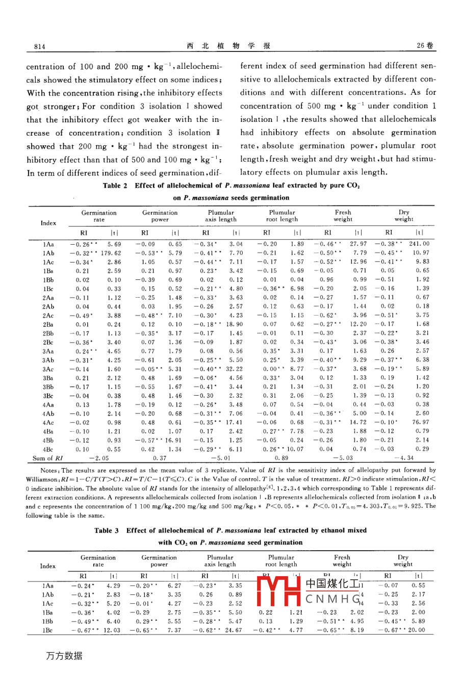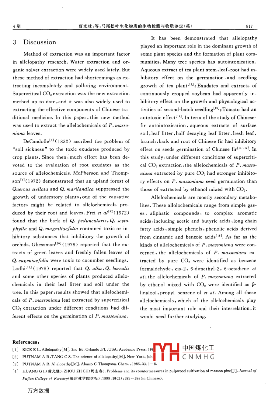 西北植物學(xué)報(bào),2006,26(4):0811-0818Acta Bot. Boreal -Occident. Sin文章編號(hào):1000-4025(2006)04-0811-08馬尾松葉生化物質(zhì)的生物檢測(cè)與物質(zhì)鑒定曹光球',林思祖,胡宗慶?,王愛(ài)萍l,彭亦如(1福建農(nóng)林大學(xué)林學(xué)院,福州350002;2福建林業(yè)職業(yè)技術(shù)學(xué)院,福建南平3530003福建師范大學(xué)化學(xué)與材料學(xué)院,福州摘要:馬尾松是我國(guó)特有的鄉(xiāng)土樹種,長(zhǎng)期林業(yè)生產(chǎn)實(shí)踐表明馬尾松純林連栽會(huì)引起馬尾松生產(chǎn)量下降。本實(shí)驗(yàn)采用超臨界萃取技術(shù)提取馬尾松葉生化物質(zhì),并采用馬尾松種子發(fā)芽試驗(yàn)進(jìn)行生物檢測(cè)及物質(zhì)鑒定。生物檢測(cè)結(jié)果表明,純CO2提取的馬尾松葉生化物質(zhì)以及乙醇和CO2混和提取的馬尾松葉生化物質(zhì)對(duì)馬尾松種子的發(fā)芽具有不同的效應(yīng)??傮w效果而言,純CO2提取的馬尾松葉生化物質(zhì)對(duì)馬尾松種子發(fā)芽率、胚根長(zhǎng)、鮮重和干重具有不同程度的抑制效應(yīng),而對(duì)發(fā)芽勢(shì)及胚軸長(zhǎng)則具有促進(jìn)效應(yīng);乙醇和CO2混和提取的馬尾松葉生化物質(zhì)對(duì)馬尾松種子發(fā)芽率、胚軸長(zhǎng)、鮮重和干重具有不同程度的抑制作用,而對(duì)發(fā)芽勢(shì)及胚根長(zhǎng)則具有促進(jìn)作用。物質(zhì)鑒定結(jié)果表明純CO2提取的馬尾松葉生化物質(zhì)主要是苯甲醛、Cis-2,6-二甲基-2,6-辛二烯等,乙醇和CO2混和提取的馬尾松葉生化物質(zhì)主要是β芳樟醇、苯乙醇等。關(guān)鍵詞:馬尾松;化感作用;生物檢測(cè);GCMS分析;超臨界提取中圖分類號(hào):Q946-33文獻(xiàn)標(biāo)識(shí)碼:ABio-detection and ldentification of Biochemical Substancesin Pinus massoniana leavesCAO Guang-qiu, LIN Si-zu', HU Zong-qing WANG Ai-ping, PENG Yi-ru(I Forestry College. Fujian Agriculture and Forestry University, Fuzhou 350002. China: 2 Fujian Forestry Professional andTechnological College, Nanping, Fujian 353000, China: 3 Chemical and Material College, Fujian Normal University Fuzhou350007. ChinaAbstract: Pinus massoniana is a specific landrace species and long- term production practices of forestry indicate that the continuous cropping of pure P. massoniana forests can result in decreased P. massonianayields. This study adopted Supercritical Fluid Extraction to extract biochemical substances from P.masso-nana leaves and germination test to biologically detect and identify these substances. The results of thebio-detection indicated that the substances extracted only with CO, and the substances extracted with themixture of CO2 and ethanol showed different effects on the germination of P. massoniana seeds. as awhole, the substances extracted only with only CO2 appeared to inhibit the germination rate and radiclelength and fresh and dry weight of P. massoniana seeds to a varying extent but to increase the germinationpotential and hypocotyl length of the seeds and the substances extracted with the mixture of co2 andethanol appeared to inhibit the germination rate and hypocotyl length and fresh and dry weights of P. massoniana seeds but to increase the germination potential and radicle length of the seeds. The results of the i-中國(guó)煤化工收稿日期:20040927;修改稿收到日期:2006-03-基金項(xiàng)目:國(guó)家自然科學(xué)基金項(xiàng)目(3027107)福建省自然科學(xué)基金項(xiàng)目(BCNMHG作者簡(jiǎn)介:曹光球(1974-)男,助理研究員,博士生,主要從事化學(xué)生態(tài)等領(lǐng)域的研究通訊聯(lián)系人。Correspondenceto:LINSI-zu.E-mail:selin53@126.com西北植物學(xué)報(bào)26卷dentification revealed that of the substances extracted only with CO2, the major ones were benzaldehydeand cis-2, 6-Dimethyl-2, 6-octadiene and of the substances extracted with the mixture of CO2 and ethanolthe ma jor ones were B-linalool and phenethyl alcoholKey words: Pinus massoniana; allelopathy GC-MS; Supercritical Fluid ExtractionAllelopathy is one of the most common phe- cals against itself, and according to the results ofnomena in nature. Rice gave the following defini- bioassay, allelochemicals were identified, so as totion of allelopathy " any direct or indirect harmful find out the chemical factor which lead to loweror beneficial effect by one plant (including mi- productivity.croorganisms )on another through the production1 Materials and methodsof chemicalat escape into the envi-ronment"n. Putnam and Tang 2 stated that chemi- 1. 1 Collection and treatment of the materialscals with allelopathic potential were present in virP. massoniana leaf was collected from the puretually all plant tissues, including leaves, flowers, P. massoniana stand in the vicinity of Fujian Agri-fruits, stems, roots, rhizomes and seeds. Allelo- culture and Forestry University, Fujian Provincechemicals were released by processes with China. The samples were dried at room temperavolatilization, root exudation, leaching, and decom- ture in a desiccation. P. massoniana seeds were ofposition [31fered by Fujian Forestry Office.Pinus massoniana recommended as one of the 1. 2 Extraction of the allelochemicals of P.masso-most important timber tree species in China is a nana leafkind of native tree species, it spreads through fifAllelochemicals of P. massoniana leaf were ex-een provinces of southern China. Long-term yield- tracted by the method of supercritical CO2 extrac-ing practice suggested that pure forest of P. masso. tion under orthogonal experiment design. Orthogo-nana had many shortcomings, such as simple nal experiment data and supercritical CO2 extrac-structure, bad ecological quality, weak fire guard- tion condition were showed in Table 1. Firstl