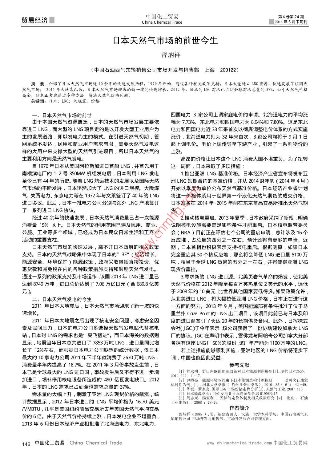 貿(mào)易經(jīng)濟(jì)■中國(guó)化工貿(mào)易第6卷第24期China C hemical Trade2014年8月下旬刊日本天然氣市場(chǎng)的前世今生曾炳祥(中國(guó)石油西氣東輸銷售公司市場(chǎng)開發(fā)與銷售部上海200122)摘要:介紹了日本天然氣市場(chǎng)近40余年的快速發(fā)展歷程,1970年開始,通過各種相關(guān)政策支持,日本大量進(jìn)口LNG資源,快速發(fā)展了該國(guó)天然氣市場(chǎng);2011年大地震以來,日本天然氣市場(chǎng)迎來的新一波的快速增長(zhǎng),2012年,日本的LNG需求已占到全球需求總量的37,由于天然氣價(jià)格高企,日本正考慮通過多種辦法,解決天然氣價(jià)格問題關(guān)鍵詞:日本;LNG;大地震;價(jià)格日本天然氣市場(chǎng)的前世四國(guó)電力3家公司上調(diào)家庭電價(jià)的申請(qǐng)。北海道電力的平均漲由于本國(guó)天然氣資源匱乏,日本的天然氣市場(chǎng)發(fā)展主要依幅為773%、東北電力和四國(guó)電力為894%和780%。這是東北靠進(jìn)口LNG,而大型的LNG項(xiàng)目走的是以開發(fā)大型工業(yè)用戶為電力和四國(guó)電力近33年來首次以徹底調(diào)整電價(jià)體系的方式實(shí)施主的發(fā)展道路,即以發(fā)電為主的模式。在引進(jìn)天然氣初期,管漲價(jià),北海道電力則為32年來首次,3家公司均將于9月1日網(wǎng)系統(tǒng)不發(fā)達(dá),民用和商業(yè)用戶需求有限,需要天然氣發(fā)電這起上調(diào)電價(jià)。電價(jià)上調(diào)傳導(dǎo)至下游產(chǎn)業(yè),引起了一系列物價(jià)的樣的大用戶來支撐大型的天然氣引進(jìn)項(xiàng)目,所以日本天然氣的主要利用方向是天然氣發(fā)電。高昂的價(jià)格讓日本這個(gè)LNG消費(fèi)大國(guó)不堪重負(fù)。為了扭轉(zhuǎn)自1970年日本從美國(guó)阿拉斯加進(jìn)口首船LNG,并首先用于這一局面,日本采取了多項(xiàng)措施南橫濱電廠的1-2號(hào)350MW機(jī)組發(fā)電后,日本利用LNG發(fā)電推出亞洲LNG基準(zhǔn)價(jià)格。日本經(jīng)濟(jì)產(chǎn)業(yè)省宣布將發(fā)布亞至今已有44年的歷史。隨著LNG航運(yùn)技術(shù)的發(fā)展以及國(guó)際天然洲LNG短期合約的基準(zhǔn)價(jià)格,并從2014財(cái)年初(2014年4月)氣市場(chǎng)的不斷發(fā)展,日本逐漸加大了LNG的進(jìn)囗規(guī)模。大阪煤開始以季度為單位公布天然氣基準(zhǔn)價(jià)格。日本經(jīng)濟(jì)產(chǎn)業(yè)省計(jì)劃氣、關(guān)西電力、東京電力等在1972年與文萊簽訂了40年的LNG將這一價(jià)格體系用于世界第一個(gè)液化天然氣期貨的成交價(jià)格。進(jìn)口協(xié)議。此后,日本一批電力公司分別與海外LNG產(chǎn)地簽訂日本準(zhǔn)備在2014年-2015年間在東京商品交易所推出天然氣期了一系列進(jìn)口LNG協(xié)議。貨經(jīng)過40余年的快速發(fā)展,日本天然氣消費(fèi)量已占一次能源2推動(dòng)核電重啟。2013年夏季,日本政府采納了新規(guī),明確消費(fèi)量15%以上。日本夭然氣的利用范圍已遍及民用、商業(yè)、說明核電設(shè)施需要滿足哪些條件才能重啟。日本核電監(jiān)管委員公服、工業(yè)等多個(gè)領(lǐng)域,已經(jīng)成為日本民眾日常生活和工商業(yè)會(huì)(NRA)目前正在評(píng)估七個(gè)公司的重啟申請(qǐng),總計(jì)涉及16個(gè)活動(dòng)的重要支柱。反應(yīng)堆,占總量的四分之一左右。預(yù)計(jì)還將有更多的申請(qǐng)。近日本夭然氣市場(chǎng)旳快速發(fā)展,離不開日本政府的相關(guān)政策期,日本首相也積極表示支持核電重啟。根據(jù)測(cè)算,如果日本支持。日本的天然氣戰(zhàn)略集中體現(xiàn)了日本的”3E″(經(jīng)濟(jì)增長(zhǎng)、完全重啟其50個(gè)核反應(yīng)堆,那么將會(huì)降低LNG進(jìn)口量5100萬(wàn)能源安全、環(huán)境保護(hù))能源政策,政府采取包括直接投資、優(yōu)噸,相當(dāng)于全球LNG貿(mào)易的五分之一左右,并將使得亞洲LNG惠貨款和減免稅在內(nèi)的各種政策措施支持和鼓勵(lì)天然氣發(fā)電。現(xiàn)貨價(jià)重挫。通過一系列的政策支持及市場(chǎng)運(yùn)作,該國(guó)2013年LNG進(jìn)口量已3尋求新的LNG進(jìn)口源。北美頁(yè)巖氣革命的爆發(fā),使北美達(dá)到8749萬(wàn)噸,進(jìn)口總價(jià)達(dá)到了706萬(wàn)億日元(合689.8億美天然氣價(jià)格在2012年降至每百萬(wàn)英熱單位2美元的水平,遠(yuǎn)低元于2008年的10美元比世界其他國(guó)家要低得多。如果政策允許,二、日本天然氣發(fā)電的今生從北美進(jìn)口LNG,將大幅拉低亞洲LNG價(jià)格,日本正在進(jìn)行這2011年日本大地震后,日本天然氣市場(chǎng)迎來了新一波的快方面的努力。2013年9月,美國(guó)能源部有條件批準(zhǔn)了位于馬速增長(zhǎng)。里蘭州 Coe Point的LNG出口項(xiàng)目,該項(xiàng)目此前已與日本及印2011年日本大地震之后出現(xiàn)了核電安全問題,考慮安全因度的進(jìn)口商簽訂了長(zhǎng)達(dá)20年的長(zhǎng)期供貨合同。此外,日揮株式素及民間壓力,日本的電力公司多選擇天然氣發(fā)電站代替核電會(huì)社(JGC)今年表示,該公司獲得了一份協(xié)助建設(shè)加拿大LNG站,日本對(duì)LNG的需求也是突飛猛進(jìn)”。而日本海關(guān)的數(shù)據(jù)則廠的協(xié)議。JGC在聲明中表示,雪佛龍與阿帕奇公司加拿大分部顯示,地震當(dāng)年日本總共進(jìn)口了7853萬(wàn)噸LNG,進(jìn)