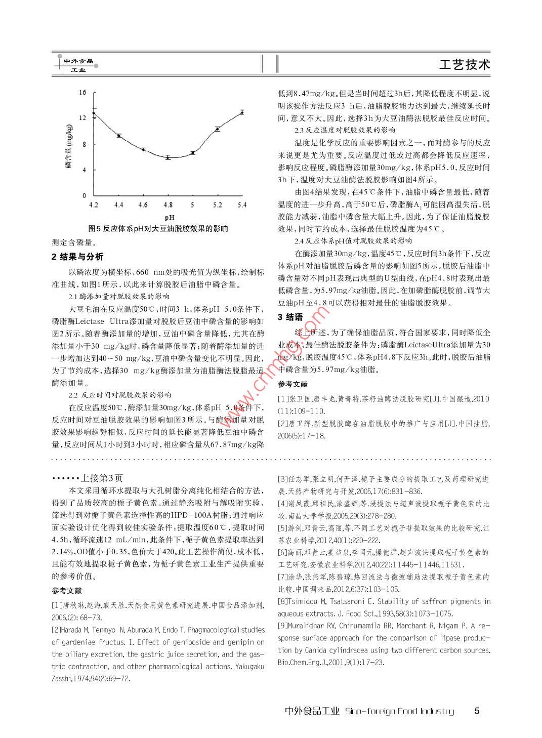 0.05,不顯14%,與理論值2.19%相符合,RSD小于1%,因此可知該模型能夠著,說明使用該方程模擬3因素3水平的分析可行。各實(shí)驗(yàn)因素較好的預(yù)測循環(huán)法提取梔子黃色素的提取率。對響應(yīng)值的影響不是線性關(guān)系,其中A、B、C、A2、B2、C2對Y值33梔子黃色素產(chǎn)品的檢測結(jié)果得影響極顯著(P<0.01)。在所選的各因素水平范圍內(nèi),影響梔子在篩選得到的最佳實(shí)驗(yàn)條件下,進(jìn)行三次平行實(shí)驗(yàn),結(jié)果黃色素提取率的因素按主次順序排列為:C>B>A,其中循環(huán)如表6梔子黃產(chǎn)品提取率大于2%,OD值小于0.35,色價(jià)大于流速對梔子黃色素提取率影響最大。420。該工藝操作簡單,穩(wěn)定可行L得到的梔子黃色素322響應(yīng)面及等高線分析產(chǎn)品品質(zhì)較高,相對有機(jī)溶劑提取有較高的優(yōu)勢各因素對響應(yīng)值的影響直觀的反應(yīng)在響應(yīng)面圖上,而等高4結(jié)語線的形狀可以反應(yīng)各因素交互作用的強(qiáng)弱,等高線趨近橢圓下轉(zhuǎn)第5頁中外食品工業(yè)5n- foreign Food Industru3中外食品工藝技術(shù)低到8.47mg/kg。但是當(dāng)時(shí)間超過3h后,其降低程度不明顯,說明該操作方法反應(yīng)3h后,油脂脫膠能力達(dá)到最大,繼續(xù)延長時(shí)12間,意義不大。因此,選擇3h為大豆油酶法脫膠最佳反應(yīng)時(shí)間3反應(yīng)溫度對脫膠效果的影響溫度是化學(xué)反應(yīng)的重要影響因素之一,而對酶參與的反應(yīng)來說更是尤為重要。反應(yīng)溫度過低或過高都會降低反應(yīng)速率,影響反應(yīng)程度。磷脂酶添加量30mg/kg,體系pH5.0,反應(yīng)時(shí)間3h下,溫度對大豆油酶法脫膠影響如圖4所示。由圖4結(jié)果發(fā)現(xiàn),在45℃條件下,油脂中磷含量最低,隨著42444.64.855.254溫度的進(jìn)一步升高,高于50℃后,磷脂酶A可能因高溫失活,脫膠能力減弱,油脂中磷含量大幅上升。因此,為了保證油脂脫膠圖5反應(yīng)體系pH對大豆油脫膠效果的影效果,同時(shí)節(jié)約成本,選擇最佳脫膠溫度為45℃。測定含磷量24反應(yīng)體系pH值對脫膠效果的影響2結(jié)果與分析在酶添加量30mg/kg,溫度45℃,反應(yīng)時(shí)間3h條件下,反應(yīng)以磷濃度為橫坐標(biāo),660mm處的吸光值為縱坐標(biāo),繪制標(biāo)體系pH對油脂脫膠后磷含量的影響如圖5所示。脫膠后油脂中準(zhǔn)曲線,如圖1所示,以此來計(jì)算脫膠后油脂中磷含量。磷含量對不同pH表現(xiàn)出典型的U型曲線,在pH4.8時(shí)表現(xiàn)出最2.1酶添加量對脫膠效果的影響低磷含量,為5.97mg/kg油脂。因此,在加磷脂酶脫膠前,調(diào)節(jié)大大豆毛油在反應(yīng)溫度50℃,時(shí)間3h,體系pH5.0條件下,豆油pH至4.8可以獲得相對最佳的油脂脫膠效果磷脂酶 Leictase ultra添加量對脫膠后豆油中磷含量的影響如結(jié)語圖2所示。隨著酶添加量的增加,豆油中磷含量降低,尤其在酶綜上所述,為了確保油脂品質(zhì),符合國家要求,同時(shí)降低企添加量小于30mg/kg時(shí),磷含量降低顯著;隨著酶添加量的進(jìn)業(yè)成本,最佳酶法脫膠條件為:磷脂酶 Leictase ultra添加量為30步增加達(dá)到40~50mg/kg,豆油中磷含量變化不明顯。因此,mg/kg,脫膠溫度45℃,體系pH4.8下反應(yīng)3h。此時(shí),脫膠后油脂為了節(jié)約成本,選擇30mg/kg酶添加量為油脂酶法脫脂最適中磷含量為5.97mg/kg油脂。酶添加量參考文獻(xiàn)22反應(yīng)時(shí)間對脫膠效果的影響[1]張衛(wèi)國,唐豐龍黃奇特茶籽油酶法脫膠研究[J.中國釀造,2010在反應(yīng)溫度50℃,酶添加量30mg/kg,體系pH5.0條件下,11:109-110.反應(yīng)時(shí)間對豆油脫膠效果的影響如圖3所示。與酶添加量對脫2]唐衛(wèi)輝.新型脫膠酶在油脂脫膠中的推廣與應(yīng)用[J]中國油脂,膠效果影響趨勢相似,反應(yīng)時(shí)間的延長能顯著降低豆油中磷含2005:17-18.量,反應(yīng)時(shí)間從1小時(shí)到3小時(shí)時(shí),相應(yīng)磷含量從67.87mg/kg降…上接第3頁[3]任志軍,張立明,何開澤梔子主要成分的提取工藝及藥理研究進(jìn)本文采用循環(huán)水提取與大孔樹脂分離純化相結(jié)合的方法,展天然產(chǎn)物研究與開發(fā)200517(6:831-836得到了品質(zhì)較高的梔子黃色素通過靜態(tài)吸附與解吸附實(shí)驗(yàn),[4]謝鳳霞,邱祖民,涂盛輝,等浸提法與超聲波提取梔子黃色素的比篩選得到對梔子黃色素選擇性高的HPD-100A樹脂;通過響應(yīng)較.南昌大學(xué)學(xué)報(bào),2005293):278-280.面實(shí)驗(yàn)設(shè)計(jì)優(yōu)化得到較佳實(shí)驗(yàn)條件:提取溫度60℃,提取時(shí)間[5]游劍,鄧青云,高麗,等不同工藝對梔子苷提取效果的比較研究江4.5h,循環(huán)流速12mL/min,此條件下,梔子黃色素提取率達(dá)到蘇農(nóng)業(yè)科學(xué),201201220-22且能有效地提取梔子黃色素,為梔子黃色素工業(yè)生產(chǎn)提供重要工藝研究安徽農(nóng)業(yè)科學(xué),20124022:11445-124415素的2.14%,OD值小于0.35,色價(jià)大于420。此工藝操作簡便,成本低,[6]高麗鄧青云,姜益泉,李國元操德群超聲波法提取梔子黃的參考價(jià)值。門]涂華,張燕軍,陳碧瓊熱回流法與微波輔助法提取梔子黃色素的參考文獻(xiàn)比較中國調(diào)味品,2012,6(37):103-1051])秋琳趙海,戚天勝天然食用黃色素研究進(jìn)展中國食品添加劑,[8 Tsimidou M. Tsat saron E. Stability of saffron pigments in006,(2:68-73.cts.J. Food Sci,1993,58(3)