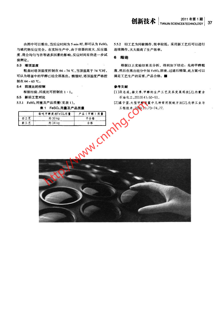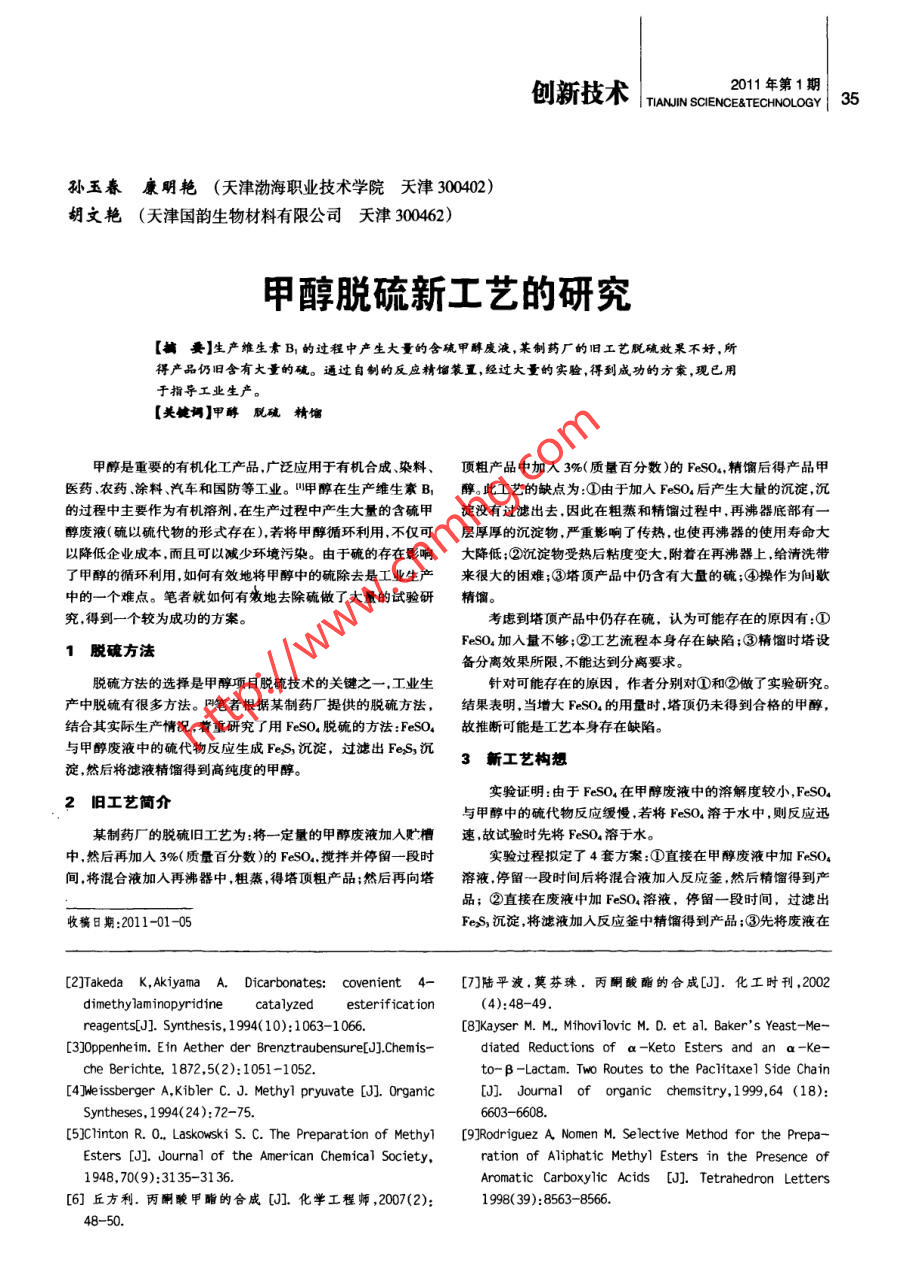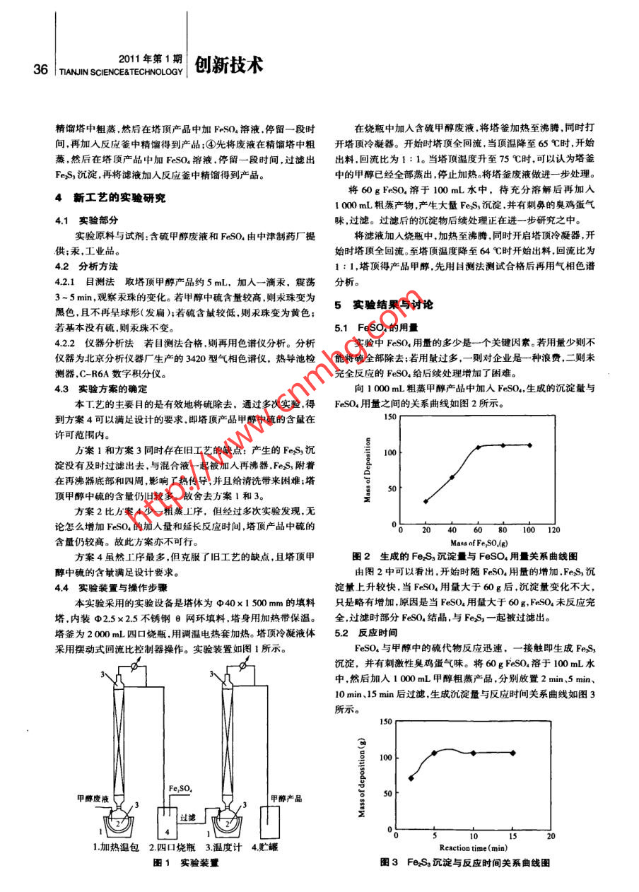創(chuàng)新技術(shù)2011年第1期| TIANJIN SCIENCE&TECHNOLOGY 3孫玉春康明艷(天津渤海職業(yè)技術(shù)學(xué)院 天津300402)胡文艷(天津國韻生物材料有限公司 天津 300462)甲醇脫硫新工藝的研究[摘要]生產(chǎn)維生素B,的過程中產(chǎn)生大量的含硫甲醇廢液,某制藥廠的舊工藝脫硫效果不好,所得產(chǎn)品仍舊含有大量的硫。通過自制的反應(yīng)精餾裝置,經(jīng)過大量的實驗,得到成功的方案,現(xiàn)已用于指導(dǎo)工業(yè)生產(chǎn)。[關(guān)鍵訶]甲醇脫硫精餾甲醇是重要的有機化工產(chǎn)品,廣泛應(yīng)用于有機合成、染料、頂粗產(chǎn)品中加入3%(質(zhì)量百分數(shù))的FeSO.,精餾后得產(chǎn)品甲醫(yī)藥、農(nóng)藥.涂料、汽車和國防等工業(yè)。甲醉在生產(chǎn)維生素B, .醇。此工藝的缺點為:①由于加人FeSO。后產(chǎn)生大量的沉淀,沉的過程中主要作為有機溶劑,在生產(chǎn)過程中產(chǎn)生大量的含硫甲淀沒有過濾出去,因此在粗蒸和精餾過程中.再沸器底部有一醇廢液(硫以硫代物的形式存在),若將甲醇循環(huán)利用,不僅可層厚厚的沉淀物,嚴重影響了傳熱.也使再沸器的使用壽命大以降低企業(yè)成本.而且可以減少環(huán)境污染。由于硫的存在影響大降 低;②沉淀物受熱后粘度變大,附著在再沸器上,給清洗帶了甲醇的循環(huán)利用,如何有效地將甲醇中的硫除去是工業(yè)生產(chǎn)來很大的困難 ;③塔頂產(chǎn)品中仍含有大量的硫;④操作為間歇中的-個難點。筆者就如何有效地去除硫做了大量的試驗研精餾。.究,得到一個較為成功的方案??紤]到塔頂產(chǎn)品中仍存在硫,認為可能存在的原因有:①FeSO.加入量不夠;②工藝流程本身存在缺陷;③精餾時塔設(shè)1脫硫方法備分離效果所限,不能達到分離要求。脫硫方法的選擇是甲醇項目脫硫技術(shù)的關(guān)鍵之- - .工業(yè)生針對可能存在的原因,作者分別對①和②做了實驗研究。產(chǎn)中脫硫有很多方法。唣者根據(jù)某制藥廠提供的脫硫方法,結(jié)果表明,當(dāng)增大FeSO,的用量時.塔頂仍未得到合格的甲醇,結(jié)合其實際生產(chǎn)情況,著重研究了用FeSO.脫硫的方法:FeSO.故推斷可能是工藝本身存在缺陷。與甲醇廢液中的硫代物反應(yīng)生成FeS,沉淀,過濾出FeS,沉3新工藝構(gòu)想淀,然后將濾液精餾得到高純度的甲醇。實驗證明:由于FeSO,在甲醇廢液中的濱解度較小, FeSO..2舊工藝簡介與甲醇中的硫代物反應(yīng)緩慢.若將FeSO.溶于水中,則反應(yīng)迅某制藥廠的脫硫舊工藝為:將- -定量的甲醇廢液加入貯槽速,故試驗時先將FeSO。 溶于水。中,然后再加入3%(質(zhì)量百分數(shù))的FeSO.,攪拌并停留一段時實驗過程擬定了4套方案:①直接在甲醇廢液中加FeSO4間,將混合液加入再沸器中,粗蒸,得塔頂粗產(chǎn)品;然后再向塔溶液,停留一段時間后將混合液加入反應(yīng)釜,然后精餾得到產(chǎn)品;②直接在廢液中加FeSO。溶液,停留一段時間,過濾出收稿日期:2011-01-05FeS,沉淀,將濾液加入反應(yīng)釜中精餾得到產(chǎn)品;③先將廢液在[2]Takeda K,Akiyama A. Dicarbonates: covenient 4-[7]陸平波,莫芬珠。丙鬧酸酯的合成[J].化工時刊,2002dimethylaminopyridinecatalyzed esterif ication(4):48-49. .reagents[J]. Synthesis, 1 994(10):1063-1066.[8]Kayser M. M.. Mihovilovic M. D. et al. Baker's Yeast-Me-[3)oppenheim. Ein Aether der Brenztraubensure[J1.Chemis-diated Reductions of a-Keto Esters and an a -Ke-che Berichte, 1 872,5(2):1051-1052.to- β -Lactam. TwO Routes to the Paclitaxe1 Side Chain[4]weissberger A,Kibler C. J. Methy1 pryuvate [J]. Organic[J]. Journal of organic chemsitry,1999,64 (18): .Syntheses, 1994(24):72-75.6603-6608.[5]Clinton R.0.. Laskowski S. C. The Preparation of Methy1 [9]Rodriguez A Nomen M. Selective Method for the Prepa-Esters [J]. Journal of the American Chemical Society,ration of Aliphatic Methy1 Esters in the Presence of1948,70(9):31 35-31 36.Aromatic Carboxylic Acids [J]. Tetrahedron Letters6]丘方利.丙闌酸甲酯的合成[J]. 化學(xué)工程師,2007(2):1998(39):8563-8566.48-50.2011年第1期,創(chuàng)新技術(shù).36 TANJIN SCIENCE&TECHNOLOGY精餾塔中粗蒸.然后在塔頂產(chǎn)品中加FeSO,溶液.停留-段時在燒瓶中加入含硫甲醇廢液,將塔爸加熱至沸騰.同時打間,再加入反應(yīng)爸中精餾得到產(chǎn)品;④先將廢液在精餾塔中粗開塔頂冷凝器。開始時塔頂全回流,當(dāng)頂溫降至65 C時,開始蒸,然后在塔頂產(chǎn)品中加FeS0。溶液.停留一段時間,過濾出出料.回流比為1: 1。當(dāng)塔頂溫度升至75 C時,可以認為塔釜FeSs沉淀,再將濾液加入反應(yīng)釜中精餾得到產(chǎn)品。中的甲醇已經(jīng)全部蒸出,停止加熱。將塔釜廢液做進-步處理。將60gFeSO.溶于100 mL水中,待充分溶解后再加入4新工藝的實驗研究1 000 mL粗蒸產(chǎn)物,產(chǎn)生大量FeS,沉淀.并有刺鼻的臭雞蛋氣4.1 實驗部分味,過濾。過濾后的沉淀物后續(xù)處理正在進一步研究之中。實驗原料與試劑:含硫甲醇廢液和FeSO。由中津制藥廠提將濾液加入燒瓶中.加熱至沸騰,同時開啟塔頂冷凝器,開供;汞,工業(yè)品。始時塔頂全回流。至塔頂溫度降至64 C時開始出料,回流比為4.2 分析方法1:1,塔頂?shù)卯a(chǎn)品甲醇.先用目測法測試合格后再用氣相色譜4.2.1目測法 取塔頂甲醇產(chǎn)品約5mL, 加入一滴汞,震蕩分析。3~ 5 min,觀察汞珠的變化。若甲醇中硫含量較高.則求珠變?yōu)?竇驗結(jié)果與討論黑色,且不再星球形(發(fā)扁);若硫含量較低.則采珠