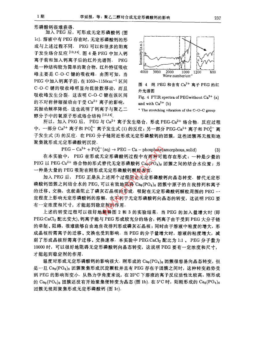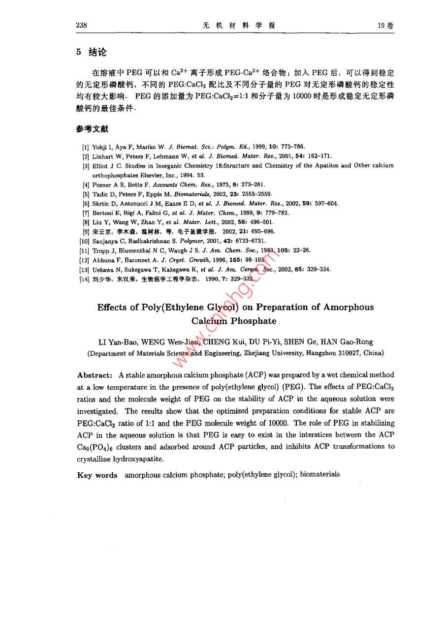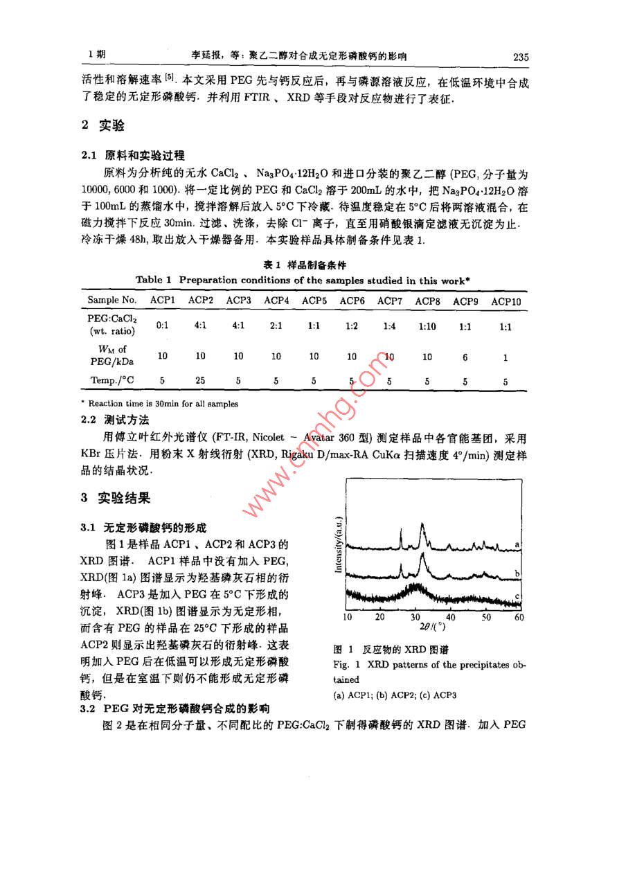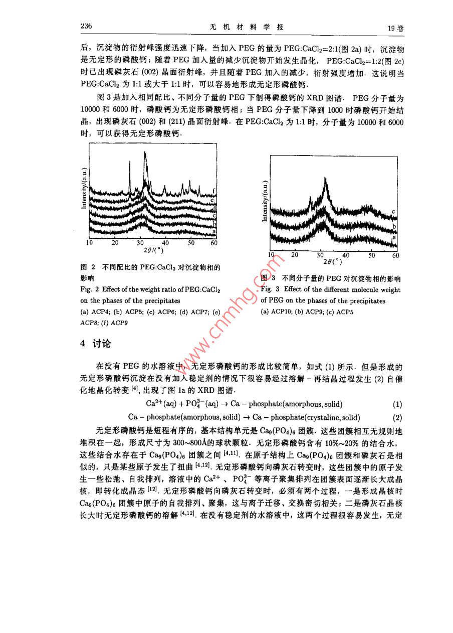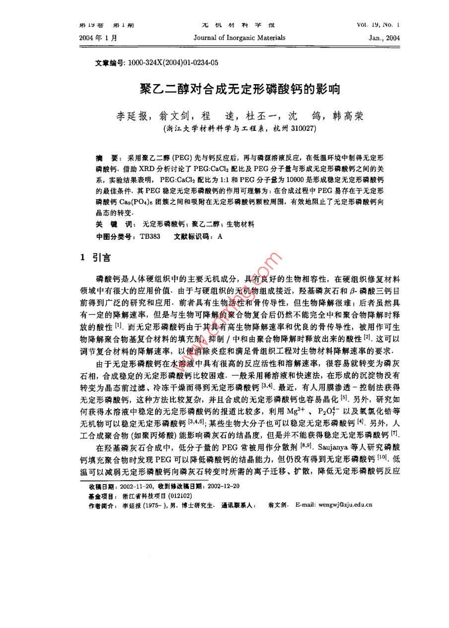 男11期報 vol.19,No.I2004年1月 Journal of Inorganic MaterialsJan.,2004文章編號:1000-324(204)01-0234-0聚乙二醇對合成無定形磷酸鈣的影響李延報,翁文劍,程逵,杜丕一,沈鴿,韓高榮(浙江大學(xué)材料科學(xué)與工程系,杭州310027摘要:采用聚乙二醇(PEG)先與鈣反應(yīng)后,再與磷源溶液反應(yīng),在低溫環(huán)境中制得無定形磷酸鈣.借助XRD分析討論了 PEG CaCl22配比及PEG分子量與形成無定形磷酸鈣之間的關(guān)系,實驗結(jié)果表明, PEG CaCl22配比為1:1和PG分子量為10000是形成穩(wěn)定無定形磷酸鈣的最佳條件,其PEG穩(wěn)定無定形磷酸鈣的作用可理解為:在合成過程中PEG易存在于無定形磷酸鈣Ca(PO4)團簇之間和吸附在無定形磷酸鈣顆粒周圍,有效地阻止了無定形磷酸鈣向晶態(tài)的轉(zhuǎn)變關(guān)鍵詞:無定形磷酸鈣聚乙二醇生物材料中圖分類號:TB383文獻標識碼:A1引言磷酸鈣是人體硬組織中的主要無機成分,具有良好的生物相容性,在硬組織修復(fù)材料領(lǐng)域中有很大的應(yīng)用價值.由于與硬組織的無機物組成接近,羥基磷灰石和B磷酸三鈣目前得到廣泛的研究和應(yīng)用前者具有生物活性和骨傳導(dǎo)性,但生物降解很難;后者雖然具有一定的降解速率,但是與生物可降解的聚合物復(fù)合后仍然不能完全中和聚合物降解時釋放的酸性而無定形磷酸鈣由于其具有高生物降解速率和優(yōu)良的骨傳導(dǎo)性,被用作可生物降解聚合物基復(fù)合材料的填充劑,抑制/中和由聚合物降解時釋放出來的酸性2.這可以調(diào)節(jié)復(fù)合材料的降解速率,以便消除炎癥和滿足骨組織工程對生物材料降解速率的要求由于無定形磷酸鈣在水溶液中具有很高的反應(yīng)活性和溶解速率,很容易就轉(zhuǎn)變?yōu)榱谆沂?合成穩(wěn)定的無定形磷酸鈣比較困難一般采用稀溶液和快速法,在形成的沉淀物沒有轉(zhuǎn)變?yōu)榫B(tài)前過濾、冷凍干燥而得到無定形磷酸鈣34最近,有人用膜滲透一控制法獲得無定形磷酸鈣,這種方法比較復(fù)雜,并且合成的無定形磷酸鈣也容易晶化另外,研究如何獲得水溶液中穩(wěn)定的無定形磷酸鈣的報道比較多,利用Mg2+、P2O以及氧氯化鋯等無機物可以穩(wěn)定無定形磷酸鈣3,46:某些生物大分子也可以穩(wěn)定無定形磷酸鈣另外,人工合成聚合物(如聚丙烯酸)能影響磷灰石的結(jié)晶度,但是并不能獲得穩(wěn)定無定形磷酸鈣在羥基磷灰石合成中,低分子量的PEG常被用作分散劑[8 Saujanya等人研究磷酸鈣填充聚合物時發(fā)現(xiàn)PEG可以降低磷酸鈣的結(jié)晶能力,但仍沒有得到無定形磷酸鈣低溫可以減弱無定形磷酸鈣向磷灰石轉(zhuǎn)變時所需的離子遷移、擴散,降低無定形磷酸鈣反應(yīng)收稿日期:2002-11-20,收到修改稿日期:2002-12-20基金項目:浙江省科技項目(012102)作者簡介:李延報(1975-),男,博士研究生,通訊聯(lián)系人:翁文劍,e-mail: wengwjzju.cdu.cn1期李延報,等:聚乙二醇對合成無定形磷酸鈣的影響235活性和溶解速率.本文采用PEG先與鈣反應(yīng)后,再與磷源溶液反應(yīng),在低溫環(huán)境中合成了穩(wěn)定的無定形磷酸鈣并利用FTIR、XRD等手段對反應(yīng)物進行了表征2實驗2.1原料和實驗過程原料為分析純的無水CaCl2、Na3PO412H2O和進口分裝的聚乙二醇(PEG,分子量為10000.將一定比例的PEG和CaCl溶于00mL的水中,把 NagPO4412H2O溶于100mL的蒸餾水中,攪拌溶解后放入5C下冷藏待溫度穩(wěn)定在5后將兩溶液混合,在磁力攪拌下反應(yīng)30min.過濾、洗滌,去除C-子,直至用硝酸銀滴定濾液無沉淀為止冷凍干燥48h,取出放入干燥器備用.本實驗樣品具體制備條件見表1表1樣品制備條件 Table 1 Preparation conditions of the samples studied in this work" Sample No. ACP1 ACP2 ACP3 ACP4 ACP5 ACP6 ACP7 ACP8 ACP9 ACP10 PEGCaCl220:14:14:12:11:1:21:41:101:11:1 (wt. ratio) WM ofPE/kDa10101010101010106 Temp.525555555515 .Reaction time is 30min for all samples2.2測試方法用立葉紅外光譜儀(f-ir, NicoletAvatar60型)測定樣品中各官能基團,采用Kr壓片法.用粉末X射線射(XRD Rigaku/ma-RA CuKa掃描速度4/min)測定樣品的結(jié)晶狀況3實驗結(jié)果3.1無定形磷酸鈣的形成圖1是樣品ACP1、ACP2和ACP3的R圖譜.ACP1樣品中沒有加入PEG,XRD(圖1a)圖譜顯示為羥基磷灰石相的衍射峰ACP3是加入PEG在5C下形成的沉淀,XRD(圖1b)圖譜顯示為無定形相,102030405060而含有PEG的樣品在25°C下形成的樣品20()ACP2則顯示出羥基磷灰石的衍射峰.這表圖1反應(yīng)物的XRD圖譜明加入PEG后在低溫可以形成無定形磷酸 Fig. 1 XRD patterns of the precipitates ob-鈣,但是在室溫下則仍不能形成無定形磷tained酸鈣 (a)ACP1: (b)ACP2; (e)ACP33.2PEG對無定形磷酸鈣合成的影響圖2是在相同分子量、不同配比的PEG:CaCl下制得磷酸鈣的XRD圖譜.加入pEG236無機材料學(xué)報19卷后,沉淀物的衍射峰強度迅速下降,當(dāng)加入PEG的量 PEG為 CaCl22=21(2a)時,沉淀物是無定形的磷酸鈣;隨著PEG加入量的減少沉淀物開始發(fā)生晶化, PEG CaCl22=1:2(圖2c)時已出現(xiàn)磷灰石(002)晶面衍射峰,并且隨著PEG加入的減少,衍射強度增加這說明當(dāng)PEGCaCl2為1:1或大于1:1時,可以容易地形成無定形磷酸鈣圖3是加入相同配比、不同分子量的PEG下制得磷酸鈣的XRD圖譜PEG分子量為100006000時,磷酸鈣為無定形磷酸鈣相;當(dāng)PEG分子量下降到1000時磷酸鈣開始結(jié)晶,出現(xiàn)磷灰石(002)和(211)晶面衍射峰.在 PEG CaCl22為1:1時,分子量為10000和6000時,可以獲得無定形磷酸鈣20()102030