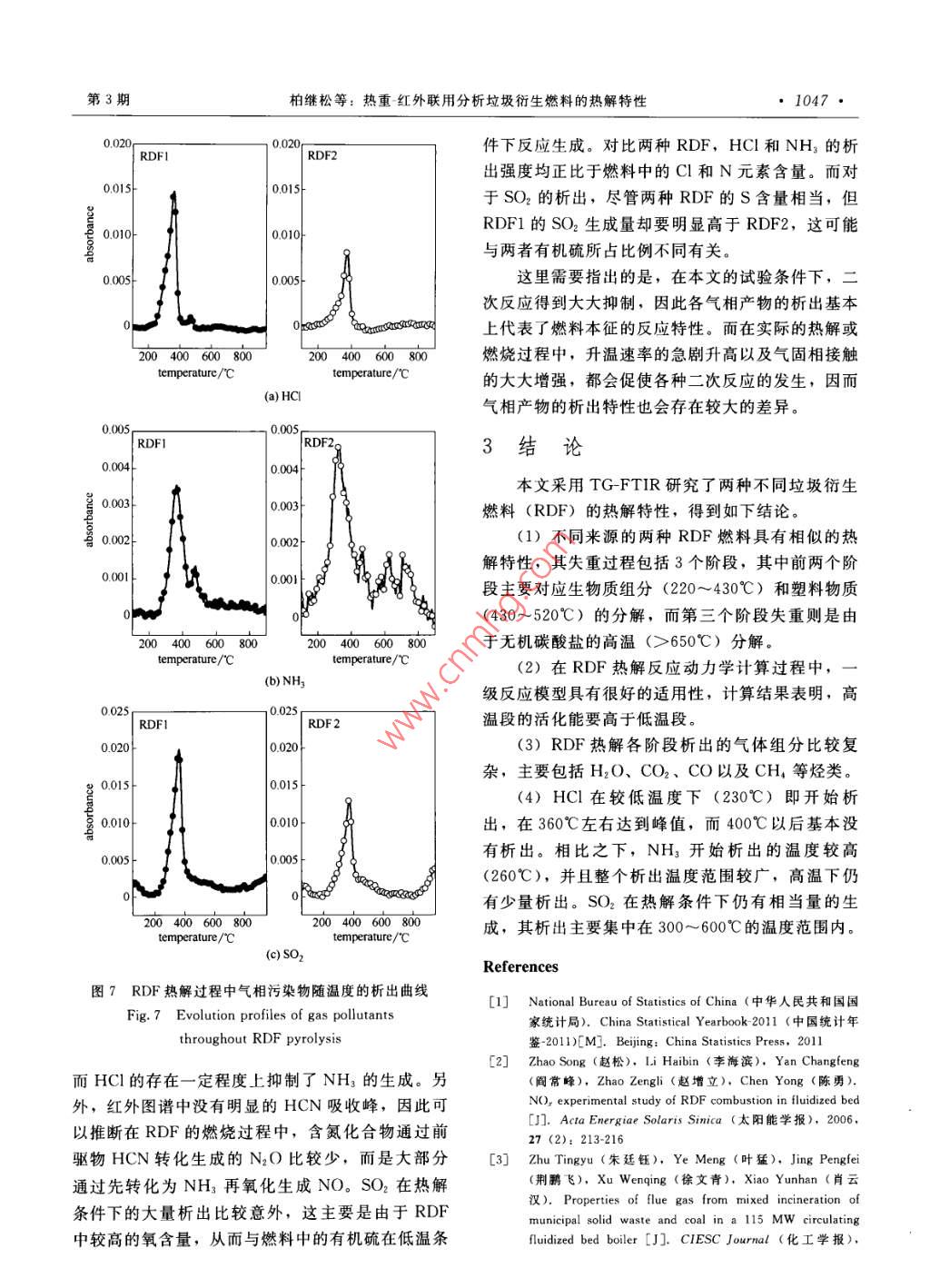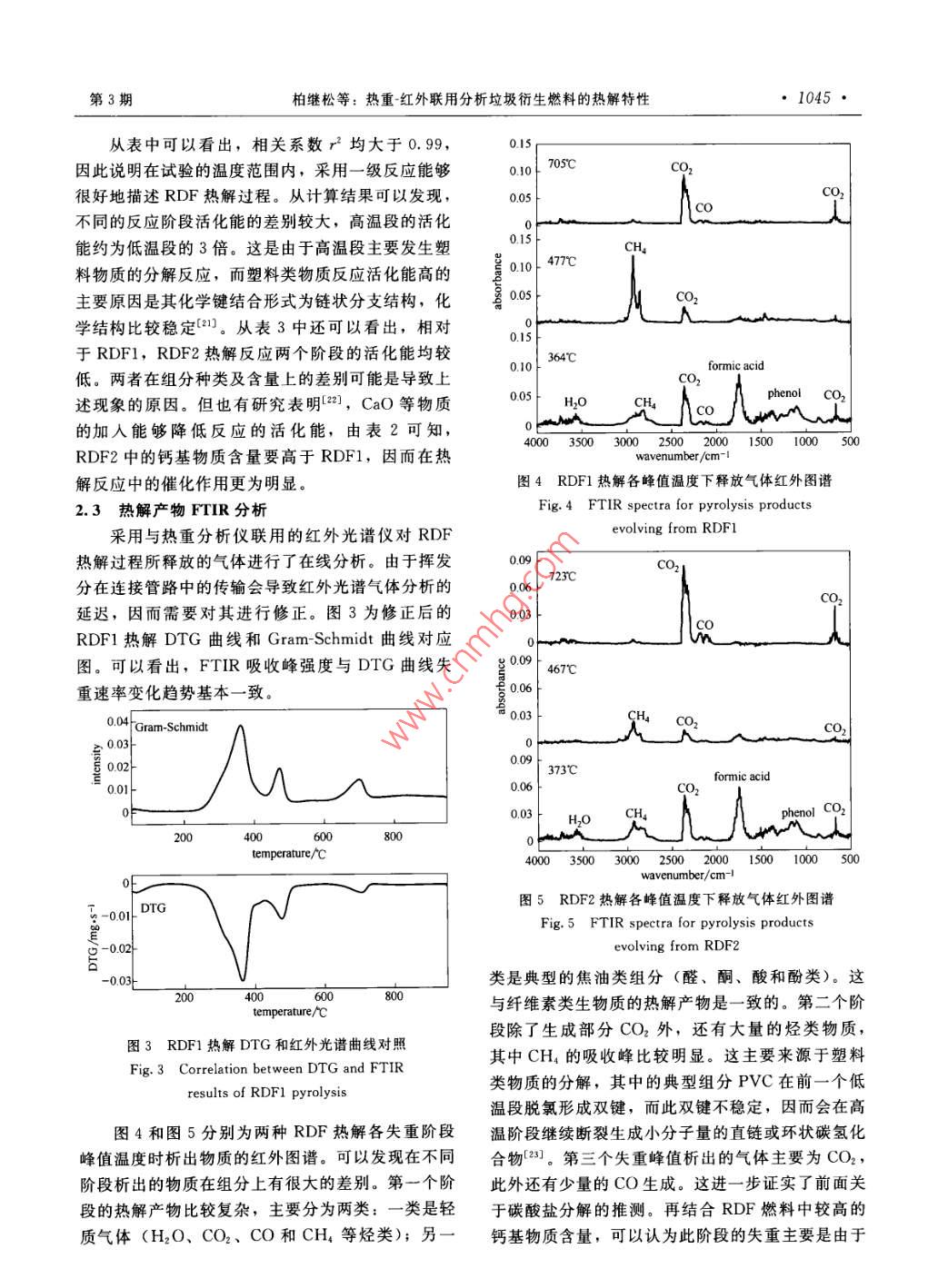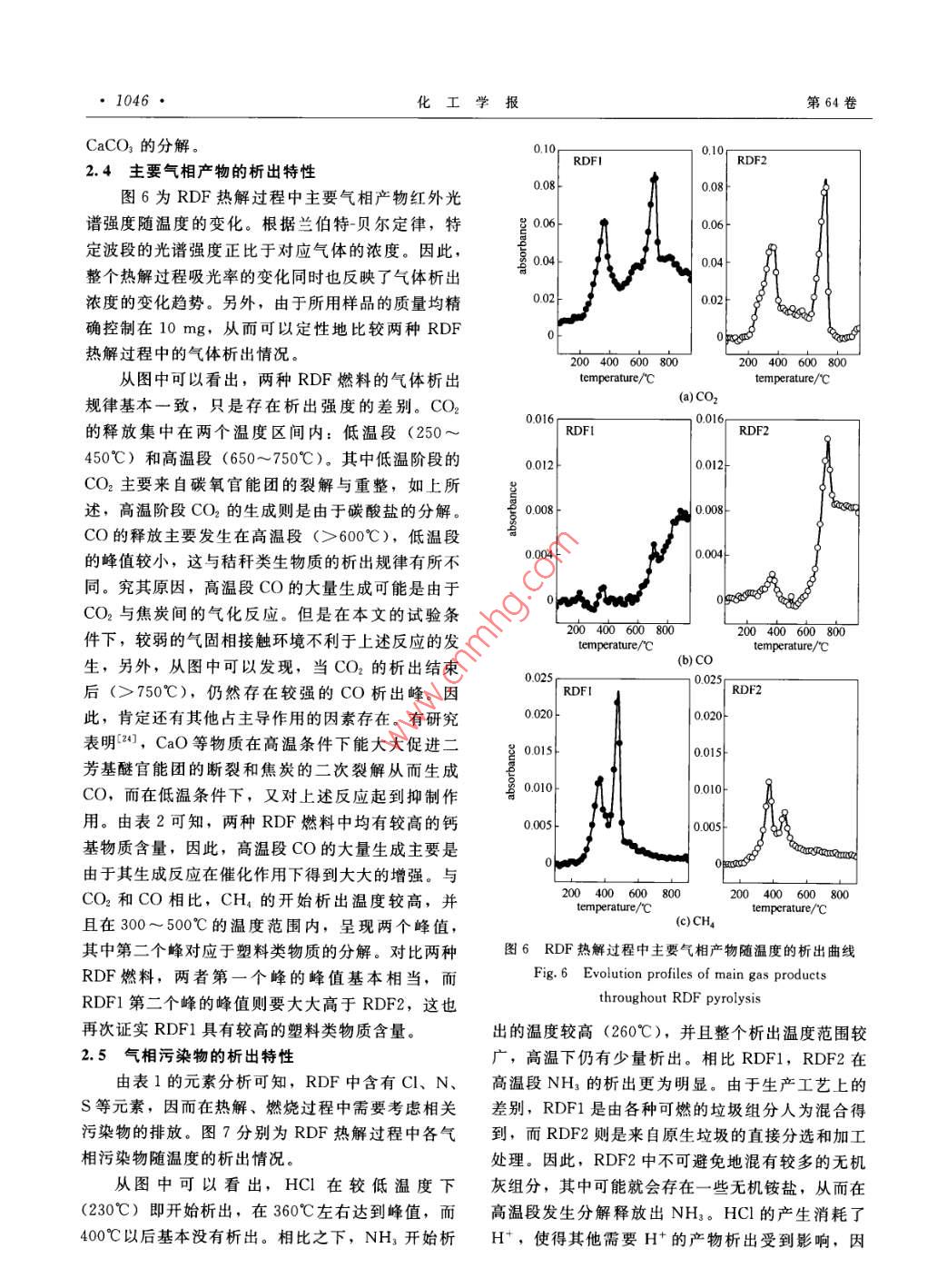 第64卷第3期化工學(xué)報(bào)Vol. 64 No. 32013年3月CIESC JournalMarch 201研究論文 資熱重-紅外聯(lián)用分析垃圾衍生燃料的熱解特性柏繼松,余春江,吳鵬,方夢(mèng)樣,駱仲泱(能源清沽利用國(guó)家重點(diǎn)實(shí)驗(yàn)室(浙江大學(xué)), 浙江杭州310027)摘要:利用熱重紅外分析儀(TG-FTIR)研究了兩種不同垃圾衍生燃料(RDF) 的熱解特性。研究發(fā)現(xiàn),盡管兩種RDF的來(lái)源不同,但卻具有相似的熱解特性,其熱解過(guò)程主要分為3個(gè)階段:生物質(zhì)組分(220~430C)、塑料類物質(zhì)(430~520C)以及無(wú)機(jī)碳酸鹽(>650C)的分解。利用Coats-Redfern法,求得了RDF熱解前兩個(gè)階段的表觀動(dòng)力學(xué)參數(shù),計(jì)算結(jié)果表明高溫段的反應(yīng)活化能要高于低溫段。通過(guò)FTIR對(duì)RDF熱解析出的氣體進(jìn)行了在線分析,發(fā)現(xiàn)兩種RDF熱解過(guò)程中的氣相產(chǎn)物析出規(guī)律基本一致,析出的氣體主要包括H2O、CO3、CO以及CH,等烴類。HCI 在低溫階段(230~400C) 即析出完畢。相比之下,NH開(kāi)始析出的溫度較高(260C),并且整個(gè)析出溫度范圍較廣,高溫下仍有少量析出。SO2 在熱解條件下仍有相當(dāng)量的生成,其析出主要集中在300~600C的溫度范圍內(nèi).關(guān)鍵詞:垃圾衍生燃料;熱重紅外聯(lián)用:熱解;動(dòng)力學(xué)參數(shù);氣相產(chǎn)物DOI: 10. 3969/j. issn. 0438- 1157. 2013. 03. 036中圖分類號(hào): X705文獻(xiàn)標(biāo)志碼: A文章編號(hào): 0438-1157 (2013) 03- 1042-07TG-FTIR analysis on pyrolysis characteristics of refuse-derived fuelBAI Jisong, Y∪Chunjiang, WU Peng, fang Mengxiang, LUO Zhongyang(State Key Laboratory of Clean Energy Urilization,Zhejiang University, Hangzhou 310027, Zhejiang, China)Abstract: The pyrolysis characteristics of two different kinds of refuse derived fuels (RDF) wereinvestigated using thermogravimetric analysis Fourier transform infrared spectrometer (TG-FTIR). Iwas found that the pyrolysis characteristics of two RDFs were similar. The pyrolysis process could bedivided into three main stages, corresponding to the decomposition of biomass components (220一 430C),plastic substances (430- 520°C) and carbonates (> 650°C). The Coats-Redfern method was used toanalyze the apparent kinetic parameters of the first two stages, and the results showed that the activationenergy was higher for the middle- temperature stage than for the low-temperature stage. By FTIR analysis,it was found that the major volatile gases released from the two RDFs were similar, mainly includingH2O,CO2, CO,CH, and other hydrocarbons. The release of gaseous pollutants was paid specialattention. The emission of HCI is completed at the low temperature stage (230- - -400C). In contrast, therelease of NH3 begins at 260C and goes through a much wider temperature range, and there is still a smallamount of NH: release at much higher temperature. In pyrolysis condition investigated, it was surprised todetect large amount of SO2, mainly released in the temperature range of 300- -600C.Key words: refuse-derived fuel; TG-FTIR; pyrolysis; kinetic parameters; gas products2012- -05 - 22收到初稿,2012-07-06收到修改稿。Received date: 2012-05- 22.聯(lián)系人:余春江。第一作者:柏繼松(1985),男,博士研Corresponding author: YU Chunjiang, chunjiang@ zju, edu. cn究生。Foundation item: supported by the National Natural Science基金項(xiàng)目:國(guó)家自然科學(xué)基金項(xiàng)目(50976102); 中央高校基Foundation of China (50976102). the Fundamental Research Funds本科研業(yè)務(wù)費(fèi)專項(xiàng)資金項(xiàng)目;國(guó)際科技合作項(xiàng)目(2011DFA61060).for the Central Universities and the International Science &Technology Cooperation Progratn of China (2011DFA61060).第3期柏繼松等:熱重紅外聯(lián)用分析垃圾衍生燃料的熱解特性●1043.引言通過(guò)兩種不同的工藝生產(chǎn)得到。其中RDF1由各垃圾組分人為混合得到,其工藝目標(biāo)為制取特定性質(zhì)目前,城市生活垃圾對(duì)環(huán)境造成的危害日益嚴(yán)的衍生燃料,而RDF2則是由原生垃圾采用- -種特重。在我國(guó),歷年積存垃圾已高達(dá)60多億噸,殊工藝直接分選和加工處理而來(lái),其工藝重點(diǎn)在于2010年全國(guó)垃圾清運(yùn)量已達(dá)1.58億噸甲。熱處理垃圾分選回收利用。兩種RDF燃料的典型組分主方法是垃圾處理及資源化利用的一種重要技術(shù),減要包括廢紙板、織物、木屑以及塑料類物質(zhì)。燃料容減量程度高,同時(shí)還能實(shí)現(xiàn)能源的回收利用,因的工業(yè)分析和元素分析(均基于收到基)以及發(fā)熱此逐漸成為最有前景的垃圾處理技術(shù)(27]。垃圾術(shù)量分析結(jié)果見(jiàn)表1。其中工業(yè)分析按照國(guó)家標(biāo)準(zhǔn)生燃料(RDF) 是將原生垃圾進(jìn)行分選去除不可(GB/T 212- -2001),C、 H、N含量分析采用長(zhǎng)沙燃成分,并經(jīng)干燥、破碎以及壓縮成型等工藝而得開(kāi)元儀器元素分析儀(5E-CHN2000), 全S含量到的商品化燃料,具有高熱值、便于儲(chǔ)藏和運(yùn)輸?shù)确治霾捎眉t外測(cè)硫儀(5E-IRSI), 全CI含量則通優(yōu)點(diǎn)(8-9]。過(guò)高溫水解,再用離子色譜測(cè)量吸收溶液中的氯離熱解作為一種熱處理技術(shù),對(duì)深入研究燃燒和子含量得到。氣化過(guò)程具有重要意義。前人對(duì)各種垃圾組分(廢從表1可見(jiàn),兩種RDF燃料都具有揮發(fā)分和紙、木屑、塑料等)的熱解特性已有大量研含氧量高以及低灰分等典型生物質(zhì)燃料的特點(diǎn),但究([0.14], 并大多認(rèn)為它