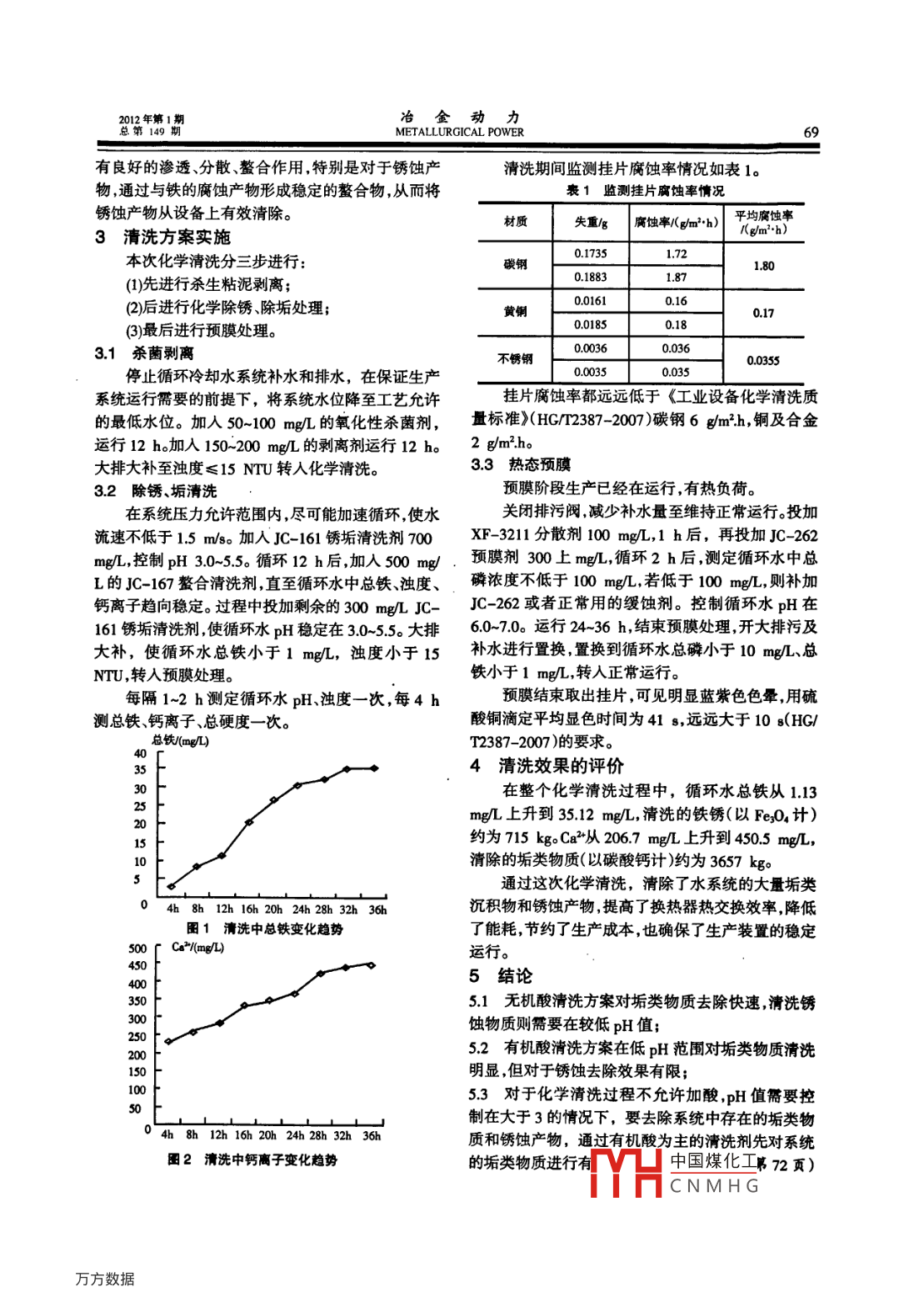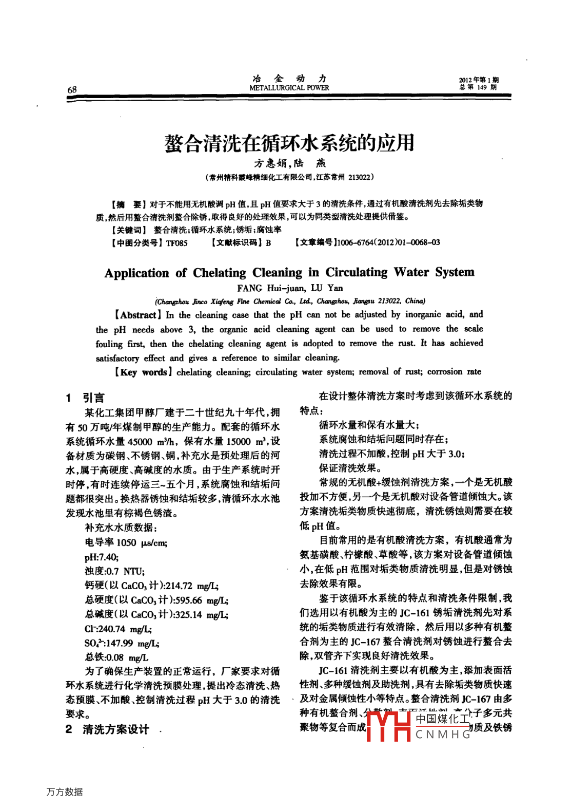 冶金動力2012年第1METALLURGICAL POWER總第149螯合清洗在循環(huán)水系統(tǒng)的應(yīng)用方惠娟,陸燕(常州精科霞峰精細(xì)化工有限公司江蘇常州213022)【摘要】對于不能用無機酸調(diào)pH值且pH值要求大于3的清洗條件,通過有機酸清洗劑先去除垢類物質(zhì)然后用整合清洗劑鰲合除銹,取得良好的處理效果,可以為同類型清洗處理提供借鑒?!娟P(guān)鍵詞】螯合清洗;循環(huán)水系統(tǒng);銹垢;腐蝕率【中圖分類號】TF085【文獻(xiàn)標(biāo)識碼】B【文章編號】006-6764(2012)01-0068-03Application of Chelating Cleaning in Circulating Water SystemFANG Hui-juan, LU Yan(Changzhou Jinco Xiafeng Fine Chemical Co, Ltd, Changzhou, Jiangsu 213022, China)[Abstract]In the cleaning case that the ph can not be adjusted by inorganic acid, andthe ph needs above 3, the organic acid cleaning agent can be used to remove the scalefouling first, then the chelating cleaning agent is adopted to remove the rust. It has achievedsatisfactory effect and gives a reference to similar cleaning.I Key words] chelating cleaning; circulating water system; removal of rust; corrosion rate1引言在設(shè)計整體清洗方案時考慮到該循環(huán)水系統(tǒng)的某化工集團(tuán)甲醇廠建于二十世紀(jì)九十年代,擁特點:有50萬噸年煤制甲醇的生產(chǎn)能力。配套的循環(huán)水循環(huán)水量和保有水量大;系統(tǒng)循環(huán)水量45000m沿h,保有水量15000m3,設(shè)系統(tǒng)腐蝕和結(jié)垢問題同時存在;備材質(zhì)為碳鋼、不銹鋼銅,補充水是預(yù)處理后的河清洗過程不加酸控制pH大于30;水,屬于高硬度、高堿度的水質(zhì)。由于生產(chǎn)系統(tǒng)時開保證清洗效果。時停,有時連續(xù)停運三~五個月,系統(tǒng)腐蝕和結(jié)垢問常規(guī)的無機酸+緩蝕劑清洗方案,一個是無機酸題都很突出。換熱器銹蝕和結(jié)垢較多清循環(huán)水水池投加不方便另一個是無機酸對設(shè)備管道傾蝕大。該發(fā)現(xiàn)水池里有棕褐色銹渣。方案清洗垢類物質(zhì)快速徹底,清洗銹蝕則需要在較補充水水質(zhì)數(shù)據(jù):低p值。電導(dǎo)率1050μcm;目前常用的是有機酸清洗方案,有機酸通常為H:7.40氨基磺酸、檸檬酸、草酸等,該方案對設(shè)備管道傾蝕濁度07NTU;小,在低pH范圍對垢類物質(zhì)清洗明顯,但是對銹蝕鈣硬(以CaCO計):21472mg/去除效果有限。總硬度(以CaCO3計):59566mg/L;鑒于該循環(huán)水系統(tǒng)的特點和清洗條件限制,我總堿度(以CaCO3計):32514mg/L們選用以有機酸為主的JC-161銹垢清洗劑先對系Ch:240.74mg/統(tǒng)的垢類物質(zhì)進(jìn)行有效清除,然后用以多種有機螯SO2:14799mg/合劑為主的JC-167鰲合清洗劑對銹蝕進(jìn)行鰲合去總鐵008mgL除,雙管齊下實現(xiàn)良好清洗效果為了確保生產(chǎn)裝置的正常運行,廠家要求對循JC-161清洗劑主要以有機酸為主,添加表面活環(huán)水系統(tǒng)進(jìn)行化學(xué)清洗預(yù)膜處理,提出冷態(tài)清洗、熱性劑、多種緩蝕劑及助洗劑,具有去除垢類物質(zhì)快速態(tài)預(yù)膜、不加酸控制清洗過程pH大于30的清洗·及對金屬傾蝕性小等特點整合清洗劑JC-167由多要求。種有機螯合劑、中國煤化」子多元共2清洗方案設(shè)計聚物等復(fù)合而成CNMHG質(zhì)及鐵銹2012年第1期冶金動力總第149期METALLURGICAL POWER有良好的滲透、分散、螯合作用,特別是對于銹蝕產(chǎn)清洗期間監(jiān)測掛片腐蝕率情況如表1。物,通過與鐵的腐蝕產(chǎn)物形成穩(wěn)定的螯合物,從而將1監(jiān)測掛片腐蝕率情況銹蝕產(chǎn)物從設(shè)備上有效清除。材質(zhì)失重/g腐蝕率爪gm2-)平均腐蝕率3清洗方案實施本次化學(xué)清洗分三步進(jìn)行0.17351.72碳鋼180(1)先進(jìn)行殺生粘泥剝離;0.1883187(2)后進(jìn)行化學(xué)除銹除垢處理;001610.16黃銅0.17(3)最后進(jìn)行預(yù)膜處理001850.183.1殺菌剝離不銹鋼00355停止循環(huán)冷卻水系統(tǒng)補水和排水,在保證生產(chǎn)000350035系統(tǒng)運行需要的前提下,將系統(tǒng)水位降至工藝允許掛片腐蝕率都遠(yuǎn)遠(yuǎn)低于《工業(yè)設(shè)備化學(xué)清洗質(zhì)的最低水位。加入50-100mgL的氧化性殺菌劑,量標(biāo)準(zhǔn)》(HG/m2387-200)碳鋼6gmh,銅及合金運行12h加入150-200mg/L的剝離劑運行12h2gm2ho大排大補至濁度≤15NrU轉(zhuǎn)入化學(xué)清洗。3.3熱態(tài)預(yù)膜32除銹、垢清洗預(yù)膜階段生產(chǎn)已經(jīng)在運行,有熱負(fù)荷。在系統(tǒng)壓力允許范圍內(nèi),盡可能加速循環(huán),使水關(guān)閉排污閥減少補水量至維持正常運行。投加流速不低于1.5m。加入JC-16l銹垢清洗劑700XF-3211分散劑100mg/L,1h后,再投加JC-262控制pH30-55。循環(huán)12h后,加入500mg/,預(yù)膜劑300.上me,循環(huán)2h后,測定循環(huán)水中總L的JC-167整合清洗劑,直至循環(huán)水中總鐵、濁度、磷濃度不低于100mg/L,若低于100mg/L,則補加鈣離子趨向穩(wěn)定。過程中投加剩余的300mg/L,JC-C-262或者正常用的緩蝕劑??刂蒲h(huán)水pH在161銹垢清洗劑使循環(huán)水pH穩(wěn)定在30-55大排60-70。運行24-36h,結(jié)束預(yù)膜處理,開大排污及大補,使循環(huán)水總鐵小于1mgL,濁度小于15補水進(jìn)行置換置換到循環(huán)水總磷小于10mgL、總NTU,轉(zhuǎn)人預(yù)膜處理。鐵小于1mg/L轉(zhuǎn)入正常運行。每隔1~2h測定循環(huán)水pH濁度一次,每4h預(yù)膜結(jié)束取出掛片,可見明顯藍(lán)紫色色暈,用硫測總鐵鈣離子、總硬度一次。酸銅滴定平均顯色