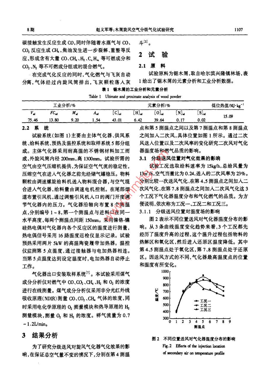 第30卷第8期太陽能學(xué)報Vol.30, No.82009年8月ACTA ENERGLAE SOLARIS SINICAAug.,2009文章編號: 02540096(2009)08-1106-05木屑旋風(fēng)空氣分級氣化試驗研究趙義軍,孫紹增,田洪明,凌峰,肖難(哈爾濱工業(yè)大學(xué)燃燒工程研究所,哈爾濱10001)摘要:基于生物質(zhì)空氣氣化機理,結(jié)合氣流床氣化工藝的優(yōu)點,參考旋風(fēng)分離器的設(shè)計原理,提出了生物質(zhì)旋風(fēng)空氣分級氣化工藝。對不同的位置加人二次風(fēng)和改變二次風(fēng)率進行了試驗研究。研究結(jié)果表明,分級氣化能夠改善燃氣品質(zhì)。在還原區(qū)加入二次風(fēng)有利于提高燃氣熱值和氣化效率,在氧化區(qū)加入二次風(fēng)有利于減少燃氣中焦油的含量。燃氣熱值、氣體產(chǎn)率氣化效率和碳轉(zhuǎn)化率隨著二次風(fēng)率的增加而增加。關(guān)鍵詞:旋風(fēng);分級;氣化;生物質(zhì)中圖分類號: TQ038.1文獻標(biāo)識碼: A通過一一個錐體連接,如圖1所示。進料口布置在氣0引言化器的上部,生物質(zhì)燃料顆粒由氣流攜帶通過進料生物質(zhì)氣化是生物質(zhì)利用的一種很有前途的方口切向進 人氣化器,經(jīng)過干燥和熱解,生物質(zhì)內(nèi)部結(jié)式。氣化器是生物質(zhì)氣化工藝中最核心的設(shè)備,目構(gòu)在吸熱的不可逆 條件下發(fā)生熱分解反應(yīng),析出揮前國內(nèi)生物質(zhì)氣化器的形式以固定床和流化床為發(fā)份。熱解過程在氧化性氣氛中完成,熱解反應(yīng)的主。生物質(zhì)旋風(fēng)氣化器是氣流床氣化方式的一種。同時伴隨著揮發(fā)份的燃燒反應(yīng),這樣在固體顆粒周英國卡迪夫大學(xué)、瑞典呂勒奧大學(xué)、美國俄克拉何馬圍形 成揮發(fā)份燃燒火焰的包圍狀態(tài),部分氧氣滲透州立大學(xué)等在生物質(zhì)旋風(fēng)氣化方面做了大量科學(xué)研到固體顆粒表面與固定碳反應(yīng)。氧化反應(yīng)放出熱究。研究表明生物質(zhì)旋風(fēng)氣化,能通過組織氣固兩量,為物料的熱解、干燥和還原區(qū)的吸熱反應(yīng)提供必相旋流空氣動力場完成生物質(zhì)氣化過程,同時能有要的熱量。同時在高溫環(huán)境下,熱解氣中的焦油會效降低燃氣中堿金屬含量,防止氣化器內(nèi)結(jié)渣1-4)。發(fā)生二次裂解。進入還原區(qū)后,生成的CO2與固定分級送風(fēng)氣化方式是改善氣化效果,提高燃氣品質(zhì)的重要手段。中科院廣州能源研究所和山東大煙氣出口學(xué)分別對流化床氣化器和固定床氣化器采用了分級送風(fēng)方式,試驗結(jié)果表明可燃氣中焦油含量明顯降接觸器低,燃氣熱值顯著提高[s.6。←二次風(fēng)(1)本文基于生物質(zhì)空氣氣化機理,結(jié)合氣流床氣一二次風(fēng)(2)化工藝的優(yōu)點,參考旋風(fēng)分離器的設(shè)計原理,提出了生物質(zhì)旋風(fēng)空氣分級氣化工藝,得到了該新型氣化器分級送風(fēng)氣化的規(guī)律,為今后進- -步的研究提供i灰了重要的理論依據(jù)。溫控儀溫度巡檢儀1旋風(fēng)空氣氣化原理 ,圖1旋風(fēng)空氣分級氣化器實驗 系統(tǒng)圖旋風(fēng)氣化器的主體部分包括外旋風(fēng)簡和內(nèi)旋風(fēng)Fig.1 The schemaic diagram of the cyclone air staged gasifer筒(也稱為中心管、上升管)。外旋風(fēng)簡和灰斗之間收稿日期: 208-01-24基金項目:黑龍江省自然科學(xué)基金(1307396)通訊作者:孫紹增(1963- -),男,博士生導(dǎo)師,主要從事煤粉燃燒和生物質(zhì)能利用方面的研究。umsxhi.edu.o8期趙義軍等:木屑旋風(fēng)空氣分級氣化試驗研究1107碳接觸發(fā)生反應(yīng)生成Co,同時伴隨著水蒸氣與Co、斗則。CO2反應(yīng)生成CH,焦油發(fā)生進-一步裂解、重整等反2試驗應(yīng),形成含有大量CO、CH、H、C, H.等可燃成分和CO2、N2等不可燃成分組成的混合燃氣。2.1原料在完成氣化反應(yīng)的同時,,氣化燃氣與飛灰自動試驗原料為鋸木屑,取自哈爾濱興隆鎮(zhèn)林場,表分離,氣體經(jīng)過內(nèi)旋風(fēng)簡排出,飛灰顆粒落入灰1給出了鋸木屑的元素分析和工業(yè)分析數(shù)據(jù)。表1鋸木屬的工業(yè)分析和元素分析Table I Utimate and proximate analysis of wood powder工業(yè)分析/%元素分析/%低位熱值/MJ+kg"'FCMAa[C] [H][o]a[N]。[S]。15.09 !75.46 .13.809.20.1.5443.016.4239.64 .0.170.022.2系統(tǒng)點和第5測溫點之間以及第7測溫點和第8測溫點試驗系統(tǒng)(如圖1)主要由主體氣化器、供風(fēng)系之間加入二次風(fēng),具體位置如圖1所示。通過二次統(tǒng)、給料系統(tǒng)預(yù)熱及溫控系統(tǒng)和取樣系統(tǒng)5部分組風(fēng)送人位置以及二次風(fēng)率的變化研究二次風(fēng)對氣化成。主體氣化器采用耐高溫的不銹鋼材料加工而器溫度場和燃氣品質(zhì)的影響。成,外旋風(fēng)簡內(nèi)徑200mm,高1300mm。試驗所需的3.1分級送風(fēng)位 對氣化效果的影響空氣由空氣壓縮機提供,為保證空氣氣流的穩(wěn)定性,試驗工況選取給料速率為l5kg/h, 總給風(fēng)量為壓縮空氣在進入氣化器之前先經(jīng)儲氣罐穩(wěn)壓。物料13m'/h,空氣當(dāng)量比為0.24,送人的二次風(fēng)率為23%。顆粒由調(diào)速螺旋給料機送入物料混合器,與空氣混分別比較- -次送風(fēng)氣化在第4.5測溫點之間加入二合進入氣化器,給料量由調(diào)速電機控制。在尾部煙次風(fēng)氣化在第7.8測溫點之間加入二次風(fēng)氣化這3道布置引風(fēng)機,通過調(dià
