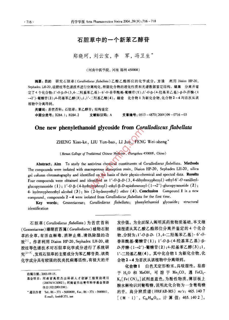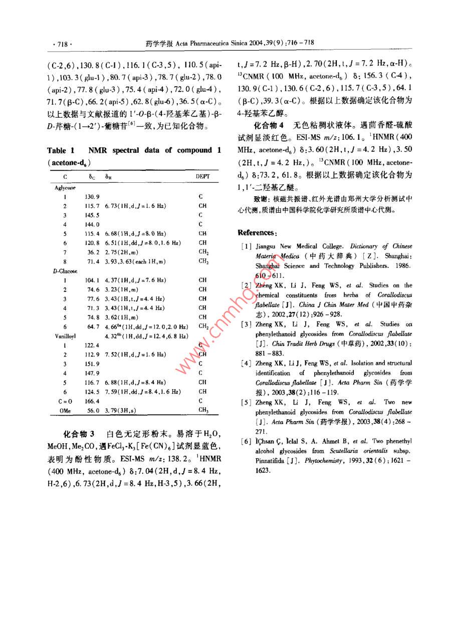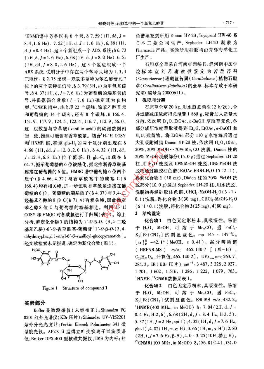 716藥學(xué)學(xué)報(bào) Acta Pharmaceutica Sinica2004,39(9):716-718石膽草中的一個(gè)新苯乙醇苷鄭曉珂,劉云寶,李軍,馮衛(wèi)生(河南中醫(yī)學(xué)院,河南鄭州450008)摘要:目的研究石膽草( Corallodiscus flabellata)乙酸乙酯部位的化學(xué)成分。方法利用 Diaion HP-20Sephadex凵H20,硅膠柱等色譜技術(shù)進(jìn)行分離純化,根據(jù)化合物的理化性質(zhì)和光譜數(shù)據(jù)鑒定結(jié)構(gòu)。結(jié)果分離并鑒定了4個(gè)化合物:1·04βD(3,4二羥基苯乙基)60-香草?;咸擒?1);1·O-9-(4羥基苯乙基)βD芹糖-(L→2)葡糖苷(2);4羥基苯乙醇(3);,1’·二羥基乙醚(4)。結(jié)論化合物1為新化合物,化合物2-4均首次從該植物中分離得到。關(guān)鍵詞:苦苣苔科;石膽草;苯乙醇背;結(jié)構(gòu)鑒定中圖分類號(hào):R284.1;R284.2文獻(xiàn)標(biāo)識(shí)碼:A文章編號(hào):0513-4870(2004)09-0716-03One new phenylethanoid glycoside from Corallodiscus flabellataZHENG Xiao-ke, LIU Yun-bao, LI Jun, FENG Wei-shengHenan College of Traditiona Chinese Medicine, Zhengzhou 450008, ChiAbstract:Aim to study the antivirus chemical constituents of Corallodiscus flabellata. MethodsThe compounds were isolated with macroporous absorption resin, Diaion HP-20, Sephadex LH-20, silicagel column chromatography and identified on the basis of their physio-chemical and spectral data. ResultsFour compounds were obtained and identified as 1-0-B-D-(3, 4-dihydroxyphenyl )-ethyl-6-0-vanilloylglucopyranoside(1); 1'-0-B-(4-hydroxyphenyl)-ethyl-B-D-apiofuranosyl-(1-2)-glucopyranNside(2);compound, compounds 2-4 were isolated from Corallodiscus flabellata for the first time ound 1 is a new4. hydroxyphenethyl alcohol (3) bis(2-hydroxyethyl)ether(4). Conclusion CompKey words: Gesneriaceae; Corallodiscus flabellata: phenylethanoid glycoside; structuralidentification石膽草( Corallodiscus flabellata)為苦苣苔科發(fā)價(jià)值。為全面深人闡明其藥效物質(zhì)基礎(chǔ),本文繼( Gesneriaceae珊瑚苣苔屬( Corallodiscus)植物石膽續(xù)報(bào)道從其乙酸乙酯部位分離并鑒定的4個(gè)化合草的全草,有活血解毒、消腫止痛、清熱除濕的功物,分別為:1·0BD(3,4·二羥基苯乙基)60效{。作者利用 Diaion HP20, Sephadex LH20,硅香草酰基葡糖苷(1);l·OB-(4羥基苯乙基)β膠柱等色譜技術(shù)對(duì)石膽草化學(xué)成分進(jìn)行了系統(tǒng)研D芹糖(1→2)葡糖苷(2);4羥基苯乙醇(3);1究2-”,發(fā)現(xiàn)石膽草的主要成分為苯乙醇苷類該類1二羥基乙醚(4)。其中化合物1為新化合物,化化學(xué)成分具有較強(qiáng)的抗炎抗病毒活性,有極大的開合物2~4為首次從該植物中分離得到?;衔?白色無定形粉末,具吸濕性。易溶收稿日期:200309-15于H2O和MeOH,可溶于Me2CO,遇FeCl2基金項(xiàng)日:河南省高校杰出科研人才創(chuàng)新工程資助項(xiàng)目K[Fe(CN)6]試劑顯藍(lán)色,為酚性物質(zhì)薄層板上(2003KY(XO02);河南省杰出青年科學(xué)基金資助項(xiàng)目(0212001200)酸水解檢識(shí)到葡萄糖,說明此化合物為一含葡萄糖通訊作者Tel:86-371-568069,fax:86-371-568001,的苷。高分辨質(zhì)譜( HRFAB-Ms)m/:465.1407[(M-1)-,C2H2O1,計(jì)算值:465.1402]。鄭曉珂等:石膽草中的一個(gè)新苯乙醇苷717HNMR譜中芳香區(qū)共6個(gè)氫,87.59(1H,d,J=色譜填充劑所用 Diaion HP20, Toyupearl HW40系84,1.6Hz),7.52(1H,d,J=1.6Hz),6.88(1H,日本三菱公司生產(chǎn), Sephadex Li20凝膠為d,J=8.4Hz)這3個(gè)氫組成一個(gè)ABX系統(tǒng);86.73 Pharmacia產(chǎn)品。實(shí)驗(yàn)所用硅膠均由青島海洋化工(1H,d,J=1.6H),6.68(1H,d,J=8.0Hz),6.51廠生產(chǎn)(IH,dd,J=8.0,1,6H),這3個(gè)氫也組成-個(gè)石膽草全草采自河南省西峽縣,經(jīng)河南中醫(yī)學(xué)ABX系統(tǒng),說明分子中存在兩個(gè)苯環(huán)且均為1,3,4院標(biāo)本室劉若庸教授鑒定為苦苣苔科三取代。δ2.75出現(xiàn)一雙氫多重峰為苯乙醇苷元7( Gesneriaceae)珊瑚苣苔屬( Corallodiscus)植物石膽位上的兩個(gè)氫特征信號(hào),8379(3H,s)為甲氧基信草( Corallodiscus abellata)的全草,標(biāo)本存放于本研號(hào),84.37(IH,d,J=7.6Hz)為葡萄糖的端基氫信究室(編號(hào)為200001號(hào),并根據(jù)偶合常數(shù)(J=7.6Hx)確定其為β構(gòu)1提取與分離型。"CNMR譜中,共出現(xiàn)22個(gè)碳峰除苯乙醇苷元石膽草全草20kg,用水煎煮兩次(2h/次),合和葡萄糖的14個(gè)碳外,還有8個(gè)碳峰,δ166.4,并濾液減壓濃縮得總浸膏1860g,浸膏加入適量水151.9,147.9,124.5,122.4,116.7,12.9,56.0,分散,依次用E2O,EOAc,n-BuOH萃取至無色,各這一組數(shù)據(jù)與香草酸( vanillic acid)的碳譜數(shù)據(jù)相部分減壓濃縮萃取液得到E2O, EIOAc,n-BuOH和致,推測(cè)可能含有香草?;?。結(jié)合 H-H COSY H2O,殘留物。將EOAc部分110g水溶解后通過和HNMR譜,確定gH的兩個(gè)氫分別出現(xiàn)在8大孔吸附樹脂 Diaion HP20柱依次用H2O,10%,466(1H,dd,y=12.0,2.0H2),δ4.32(1H,d,20%,30%MeOH…70%Me2CO洗脫,Dion柱的」=124,6.8Hz)位于低場(chǎng),且guC6出現(xiàn)在820%MeOH洗脫部分(15.0g)通過 Sephadex LH2064.7,提示葡萄糖的6位被?;瘬?jù)此推斷香草?;?用H2O洗脫及10%MeOH洗脫,10%MeOH洗連接在葡萄糖的6位。HMBC譜中葡萄糖6位兩個(gè)脫物通過硅膠柱色譜( EtOAc-EtOH-H2O15:2:1)質(zhì)子(84.64.32)與香草酰基中的羰基C(6得到化合物1(18mg), Diaion柱的30%MeOH洗166.4)均有相關(guān)峰,進(jìn)一步證明香草?;B接在葡脫部分(10.0g)通過 Sephadex LH20柱,用水洗脫萄糖的6位。葡萄糖的端基質(zhì)子(δ4.37)與3,4-二洗脫物再經(jīng)硅膠柱色譜,CHCl3-MeOH-H2O(3:1羥基苯乙醇的8位C(871.4)有相關(guān)崢,因此確定0.1)