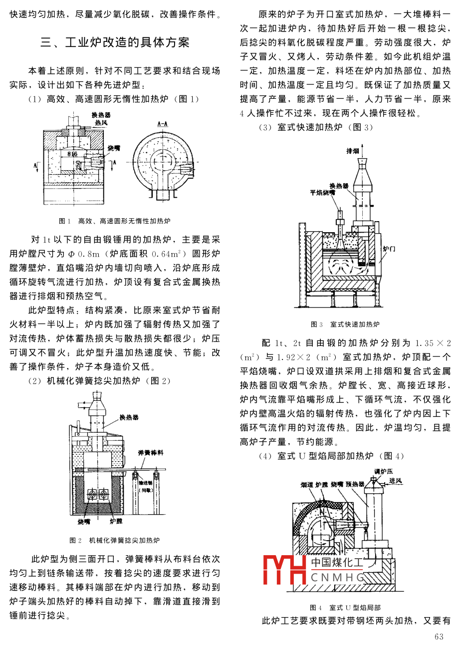 鍛壓技術(shù)2003年第4期爐窯的節(jié)能環(huán)保系統(tǒng)改造長(zhǎng)春客車(chē)廠(130062)劉振汪亞?wèn)|萬(wàn)文孫榮川摘要介紹了對(duì)廠內(nèi)工業(yè)爐旳節(jié)能環(huán)保系統(tǒng)的改造,不但實(shí)現(xiàn)了節(jié)能降耗,而且大大改善了工廠的生態(tài)環(huán)境關(guān)鍵詞節(jié)能環(huán)保改造Transformation of stove s energy-saving and environment-protective systemChangchun Car Company Liu Zhen Wang Yadong Wan Wen Sun RongchuanAbstract The transformation of the stoves energy-saving and environment-protective system is introduced, andit can improve the environment condition of factory.Keywords Energy-saving Environment-protection Transformation連榮昌爐業(yè)有限公司新開(kāi)發(fā)的適合高熱值煤氣、對(duì)、引言不同爐型和工藝要求采用不同火焰形狀和流速的各種新型高效、低噪聲天然氣燒嘴,達(dá)到高效節(jié)能與長(zhǎng)春客車(chē)廠借助于能源的改變——天然氣代替環(huán)保要求原來(lái)的重油,對(duì)全廠的鍛工和鑄鋼分廠的全部工業(yè)(2)800℃以上中、高溫爐全部采用榮昌爐業(yè)公爐進(jìn)行全面系統(tǒng)的節(jié)能、環(huán)保技術(shù)改造。司高效、高壽多功能復(fù)合式金屬換熱器專(zhuān)利產(chǎn)品。改造前,全廠的所有重油加熱爐和熱處理爐燃此種換熱器不僅適應(yīng)高、低煙氣高效余熱回收,而燒不好,爐型與結(jié)構(gòu)落后,普遍沒(méi)有余熱回收設(shè)督且有噴射排煙功能,可調(diào)節(jié)爐壓,省掉了一般爐子和自動(dòng)控制系統(tǒng)。不僅能源浪費(fèi)嚴(yán)重,而且環(huán)保條要通過(guò)下煙道和煙囪等龐大設(shè)備,此換煙器可直接件惡劣,加熱和熱處理質(zhì)量都無(wú)法保證。放在爐上通過(guò)調(diào)節(jié)排煙閥板來(lái)調(diào)節(jié)爐內(nèi)壓力,從而通過(guò)這次能源的改變,長(zhǎng)舂客車(chē)廠與大連昌榮改善了爐型結(jié)構(gòu)、節(jié)省了大量耐火材料。特別是能爐業(yè)有限公司相結(jié)合,采用集成節(jié)能、環(huán)保技術(shù),使煙氣直接進(jìn)入換熱器,預(yù)熱的空氣直接進(jìn)入燒嘴對(duì)全廠各種爐窯進(jìn)行逐臺(tái)分析,針對(duì)不同的工藝要減少煙氣與預(yù)熱好的空氣沿途熱量損失求和生產(chǎn)對(duì)象,結(jié)合實(shí)際進(jìn)行系統(tǒng)規(guī)劃,全面改造(3)1200℃以下的爐子盡量采用蓄熱少的輕質(zhì)新上的這些爐子全部投產(chǎn)達(dá)標(biāo)。在技術(shù)水平、產(chǎn)品耐火材料,特別是周期加熱的爐襯盡量采用各種纖質(zhì)量、節(jié)能、環(huán)保等方面均達(dá)到國(guó)內(nèi)領(lǐng)先水平,使維氈、毯結(jié)構(gòu)。減少爐子的惰性,減少爐子蓄熱損鍛工車(chē)間與鑄鋼熱處理車(chē)間的環(huán)境也達(dá)到國(guó)內(nèi)一流失與散熱損失水平(4)熱處理爐既要爐溫可控,爐內(nèi)溫度場(chǎng)達(dá)到定均勻度,又要空氣、煤氣按定比燃燒,穩(wěn)定爐二、工業(yè)爐改造的原則內(nèi)氣氛。保證工件熱處理質(zhì)量。模鍛加熱爐與彈簧捻尖力中國(guó)煤化工采用機(jī)構(gòu)化連續(xù)加熱,(1)用先進(jìn)的燃燒設(shè)備,全部爐子分別采用大料坯在CNMHG定溫的要求。(5)對(duì)一般自由鍛室式加熱爐,爐型結(jié)構(gòu)要緊男,35歲,工程師湊,針對(duì)不同爐型采用不同的爐膛結(jié)構(gòu)形狀與不同收稿日期的平焰或直焰燒嘴和預(yù)熱器安裝形式,達(dá)到高效快速均勻加熱,盡量減少氧化脫碳,改善操作條件。原來(lái)的爐子為開(kāi)口室式加熱爐,一大堆棒料次一起加進(jìn)爐內(nèi),待加熱好后開(kāi)始一根一根捻尖,工業(yè)爐改造的具體方案后捻尖的料氧化脫碳程度嚴(yán)重。勞動(dòng)強(qiáng)度很大,爐子又冒火、又烤人,勞動(dòng)條件差。如今此機(jī)組爐溫本著上述原則,針對(duì)不同工藝要求和結(jié)合現(xiàn)場(chǎng)一定,加熱溫度一定,料坯在爐內(nèi)加熱部位、加熱實(shí)際,設(shè)計(jì)出如下各種先進(jìn)爐型時(shí)間、加熱溫度一定且均勻。既保證了加熱質(zhì)量又(1)高效、高速圓形無(wú)惰性加熱爐(圖1)提高了產(chǎn)量,能源節(jié)省一半,人力節(jié)省一半,原來(lái)?yè)Q熱器4人操作忙不過(guò)來(lái),現(xiàn)在兩個(gè)人操作很輕松。(3)室式快速加熱爐(圖3)燒嘴換熱器平焰燒嘴圖1高效、高速圓形無(wú)惰性加熱爐對(duì)1t以下的自由鍛錘用的加熱爐,主要是采用爐膛尺寸為φ0.8m(爐底面積0.64m2)圓形爐爐門(mén)膛溥壁爐,直焰嘴沿爐內(nèi)墻切向噴λ,沿爐底形成循環(huán)旋轉(zhuǎn)氣流進(jìn)行加熱,爐頂設(shè)有復(fù)合式金屬換熱器進(jìn)行排煙和預(yù)熱空氣。此爐型特點(diǎn):結(jié)構(gòu)緊湊,比原來(lái)室式爐節(jié)省耐火材料一半以上;爐內(nèi)既加強(qiáng)了輻射傳熱又加強(qiáng)了圖3室式快速加熱爐對(duì)流傳熱,爐體蓄熱損失與散熱損失都很少;爐壓配1t、2t自由鍛的加熱爐分別為1.35×2可調(diào)又不冒火;此爐型升溫加熱速度快、節(jié)能;改(m2)與1.92×2(m)室式加熱爐,爐頂配一個(gè)善了操作條件,爐子本身造價(jià)又低。平焰燒嘴,爐口設(shè)雙道拱采用上排煙和復(fù)合式金屬(2)機(jī)械化彈簧捻尖加熱爐(圖2)換熱器回收煙氣余熱。爐膛長(zhǎng)、寬、高接近球形,爐內(nèi)氣流靠平焰嘴形成上、下循環(huán)氣流,不僅強(qiáng)化換熱器爐
