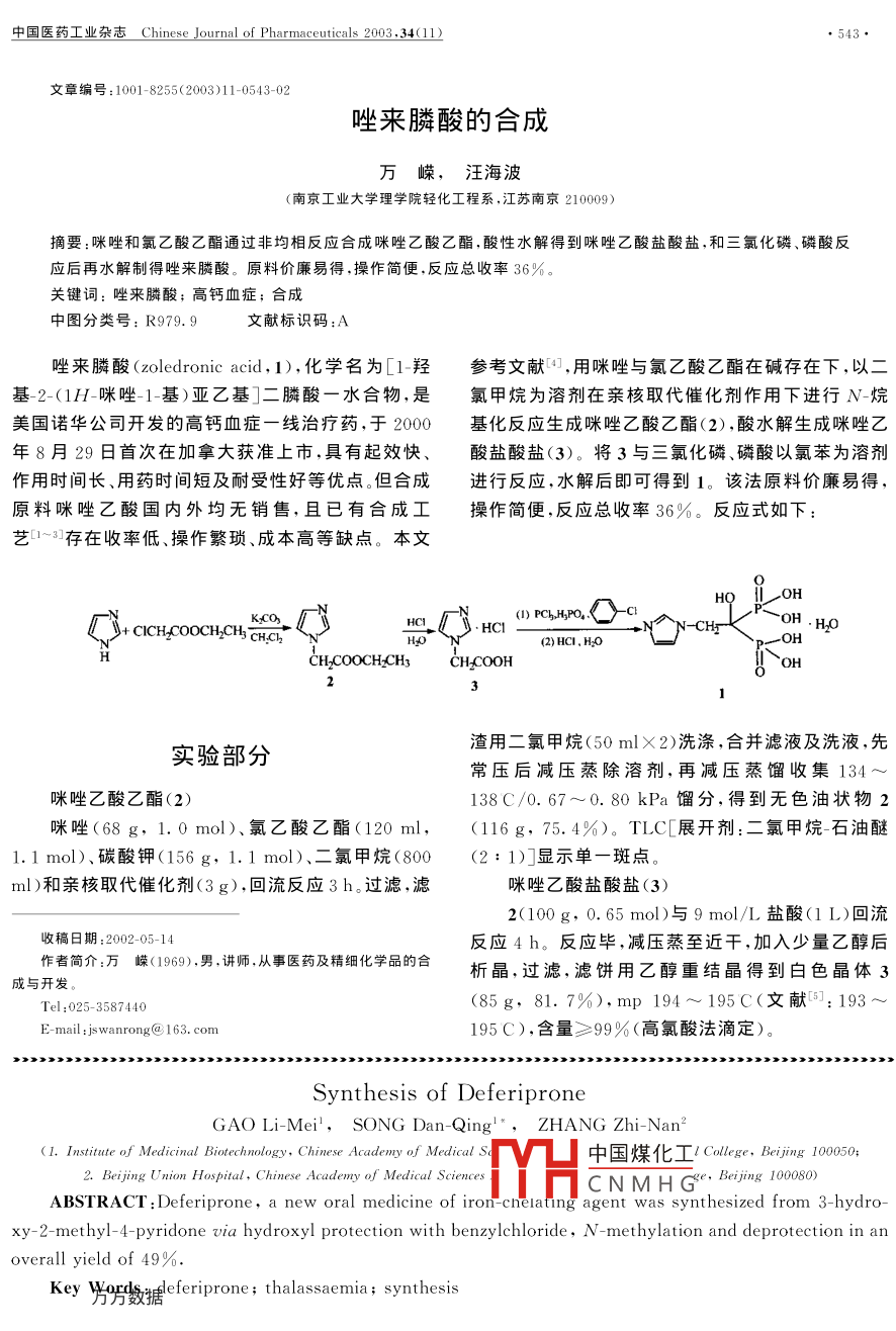 中國醫(yī)藥工業(yè)雜志Chinese Journal of Pharmaceuticals 2003.34(11)●543●文章編號:1001-8255(2003)11-0543-02唑來膦酸的合成萬嶸,汪海波(南京工業(yè)大學(xué)理學(xué)院輕化工程系,江蘇南京210009)摘要:咪唑和氯乙酸乙酯通過非均相反應(yīng)合成咪唑乙酸乙酯,酸性水解得到咪唑乙酸鹽酸鹽,和三氯化磷、磷酸反應(yīng)后再水解制得唑來膦酸。原料價廉易得.操作簡便,反應(yīng)總收率36%。關(guān)鍵詞:唑來膦酸;高鈣血癥;合成中圖分類號: R979. 9文獻(xiàn)標(biāo)識碼:A唑來膦酸(zoledronic acid,1),化學(xué)名為[1-羥參考文獻(xiàn)[4],用咪唑與氯乙酸乙酯在堿存在下,以二基-2-(1H-咪唑- 1基)亞乙基]二膦酸- -水合物,是氯甲烷為溶劑在親核取代催化劑作用下進(jìn)行N-烷美國諾華公司開發(fā)的高鈣血癥-線治療藥,于2000 .基化反應(yīng)生成咪唑乙酸乙酯(2),酸水解生成咪唑乙年8月29日首次在加拿大獲準(zhǔn)上市,具有起效快、酸鹽酸鹽(3)。將3與三氯化磷、磷酸以氯苯為溶劑作用時間長、用藥時間短及耐受性好等優(yōu)點。但合成進(jìn)行反應(yīng),水解后即可得到1。該法原料價廉易得,原料咪唑乙酸國內(nèi)外均無銷售,且已有合成工操作簡便,反應(yīng)總收率36%。反應(yīng)式如下:藝[~3]存在收率低、操作繁瑣、成本高等缺點。本文HQOHK_CO,CyHC() PC,Hro.(_)-a:N- -CH5. H20H2O.(2)HCI. H2OHCH2COOCHLCH3CHCO0H23渣用二氯甲烷(50 mlX2)洗滌,合并濾液及洗液,先實驗部分常壓后減壓蒸除溶劑,再減壓蒸餾收集134~咪唑乙酸乙酯(2)138C/0.67~0. 80 kPa餾分,得到無色油狀物2咪唑(68 g,1. 0 mol)、氯乙酸乙酯(120 ml,(116 g, 75. 4%)。TLC[展開劑:二氯甲烷石油醚1.1 mol)、碳酸鉀(156 g, 1.1 mol)、二氯甲烷(800(2:1)]顯示單一斑點。ml )和親核取代催化劑(3g),回流反應(yīng)3h。過濾,濾咪唑乙酸鹽酸鹽(3)2(100g, 0.65 mol)與9 mol/L鹽酸(1 L)回流收稿日期:2002 05-14.反應(yīng)4 h。反應(yīng)畢,減壓蒸至近干,加入少量乙醇后作者簡介:萬嶸(1969),男. 講師,從事醫(yī)藥及精細(xì)化學(xué)品的合析晶,過濾,濾餅用乙醇重結(jié)晶得到白色晶體3成與開發(fā)。Tel :025- 3587440(85g,81. 7%),mp 194~ 195C(文獻(xiàn)印]: 193 ~E- mail :jswanrong@ 163. com195 C),含量≥99% (高氯酸法滴定)。Synthesis of DeferiproneGAO Li-Mei,SONG Dan- Qing'*ZHANG Zhi-Nan2(1. Institute of Medicinal Biotechnology, Chinese Academy of Medical S中國煤化工1 College, Beijing 100050;2 Beijing Union Hospital,Chinese Academy of Medical Sciences .MHCNMHG*. Brjin 100ABSTRACT:Deferiprone, a new oral medicine of iron-cnelauing agent was synthesized from 3- -hydro-xy- 2- methyl-4- pyridone via hydroxyl protection with benzylchloride, N- methylation and deprotection in anoverall yield of 49%.Key Weferiprone ; thalassaemia; synthesis●544●中國醫(yī)藥工業(yè)雜志Chinese Journal of Pharmaceuticals 2003 .34(11)唑來膦酸(1)大學(xué)學(xué)報(自然科學(xué)版), 1987 , 26<6):723-727.3(80g, 0.5 mol)、磷酸(40ml, 0. 6 mol)、三氯[2] Gil s, Zaderenzo P, Cruz F, et al. lmidazol-1-ylalka-化磷(80 ml, 0. 9 mol)和氯苯(240 ml),于100C反noic acids as extrinsic HNMR probes for the determi-nation of intracellular pH,extracellular pH and cell .應(yīng)2 h。分液除去氯苯,加入9 mol/L鹽酸(240 ml,volume[J ]. Bioorg Med Chem ,1994,2(5):305-314.2.16 mol),回流3h。反應(yīng)畢加入活性炭脫色,濾液鄭志兵,謝云德,李松.2-(1- 咪唑基)乙酸的新法合冷卻后加入丙酮(1500ml),析晶后過濾,得白色粉成[J].中國醫(yī)藥工業(yè)雜志.2003.34(10):494.末狀粗品,用水重結(jié)晶后干燥至恒重,得白色晶體1汪海波.反應(yīng)型阻燃劑四氯對苯二酚衍生物的合成及(84.8 g, 58. 5%),mp 237~239C(文獻(xiàn)[6]:收率在不飽和樹脂中的應(yīng)用[J].精細(xì)化工,2000,17:729-41%,mp 239C),含量≥99%(HPLC歸一化法)。732.元素分析(C;HpN2O,Pe●H.O)實測值(理論值)/%:C20. 71(20. 70), H 4. 15(4. 17),N 9. 56(9.66),P 21. 35(21.proved and convenient procedure for the synthesis of35)。HNMR(0. 01 mol/L NaOH的D.O溶液)8:4.30(t,1-substituted imidazoles[J]. Chem Pharm Bull, 1983,2H,CH2) ,6.72(s,1H,"CH),7. 08(s,1H, 'CH),7.58(s,1H,31(4):1213- 1221."CH)。[6] Jaeggi KA, Widler L. Preparation of substitutedheterocyclylalkylidenediphos phonic acid as calcium參考文獻(xiàn):metabolism regulators [P]. US: 4939130, 1990- 07-03.[1]陳安齊,廖聯(lián)安.N-1-烷基咪唑衍生物的合成[J].廈門(CA 1991,114:P62355)Synthesis of Zoledronic AcidWAN Rong,WANG Hai-Bo(Dept. of Light Chemical Engineering, College of Sciences, Nanjing University of Technology, Nanjing 210009)ABSTRACT:Zoledronic acid was synthesized from imidazole and ethyl chloroacetate by heterogeneousreaction and hydrolysis to give imidazol- 1 -acetic acid hydrochloride which reacted with phosphorus trichlo-ride and phosphoric acid followed by hydrolysis with an overall yield of 36%.Key Words : zoledronic acid; hypercalcemia of malignancy (HCM); synthesis消息世界制藥原料中國展(CPhIChina2003)吸引全球目光由歐洲博聞有限公司和中國醫(yī)藥保健品進(jìn)出口商會主辦、上海博華國際展覽有限公司協(xié)辦的“2003年世界制藥原料中國展(CPhI China 2003)”將于2003年12月8日至10日在上海光大會展中心隆重登場?,F(xiàn)已有來自美國、法國、英國、德國、日本等20多個國家的近100家企業(yè)確認(rèn)參展,其中如Roquette、BimSiframGroup、DSM、Slovenia、EDQM等著名企業(yè)已連續(xù)幾屆參展,另外有近30%的海外展商為首次來華參展。國內(nèi)的石家莊制藥集團(tuán).華北制藥集團(tuán)、哈藥集團(tuán).東北制藥總廠和廈門邁克制藥集團(tuán)等龍頭企業(yè)都加大