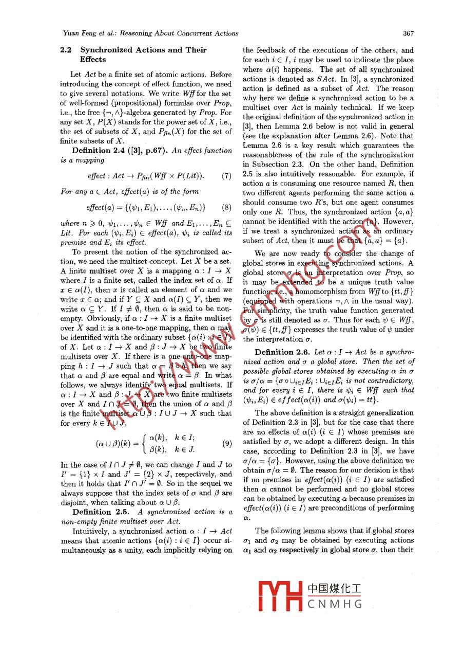 May 2004, Vol. 19, No.3, pp.364- 373J. Comput. Sci. & Technol.Process Algebra Approach to Reasoning About ConcurrentActionsYuan Feng and Ming Sheng YingState Key Laboratory of Inteligent Technology and Systemns, Department of Compuler Science and TechnologyTainghua University, Beijing 100084, P.R. ChinaE-mail: fengy99g@mails.tsinghua. edu.cnReceived February 27, 2001; revised July 8, 2002.Abstract A reasonable Lransition rule is proposed for synchronized actions and some equatioual properties ofbisimilarity and weak bisirnilarity in the process algebra for reasoning about concurrent actious are presented.Keywords process, global storc, constraint set, bisimulation1 Introductiongence and that of concurrency theory in theoreti-cal computer science. The reasoning problem con-Reasoning about actions is a very active research sidered by Chen and De Giacomol3) is the modelfield in artificial intelligence. The major thesis ischecking which is different from the typical onespecifying and reasoning about dynamic systersmentioned above. They introduced a modal logicwhich may evolve in perforning actions. Various Mμ which is suitable to describe of properties offormal methods for this purpose have been pro- states in a dynamic system. The model checking isposed, e.g., see [i, 2]. The typical methodology of then to verify whether a formula in Mu is true inspeifying dynamic systems is to introduce a set of a state of a given system. The main result in [3)] isfacts whose values change as the system evolves and a linear reduction of model checking in Mu to thethe cffects of actions on these facts. This allows usone in standard pu-calculus.to describe state transitions resulting from execut-As usual, a structured operational sermnantics ofing certain actions, see [1] for details. The typical' the process algebra in [3] was introduced as a tran-reasoning problem in the field is logical implica sition system. The major diference between thistion. More explicitly, we introduce a certain logic transition system and the transitional semantics ofwhich is suitable to the describe dynamic systemsprevious process algebras is that in the former aand then with this logic we deduce some properties state is a configuration consisting of a process andof states of the system under consideration from a a global store, whereas in the latter a state is merelyset of hypotheses about the system.a process. Coping with global stores in most transi-Chen and De Giacomols! presented a new ap-tions is quite easy, but the global store in the tran-proach to reasoning about actions by employ-sitions caused by performing synchronized (concur-ing some modelling tools from process algebrasA.rent) actions deserves a careful treatment. In [3],They constructed an algebra of proceses in which the rule for synchronized actions is given as folowseach process is accompanied by a global store char-acterizing certain facts about the current states.Sym: (n.,0)當(dāng)(0%,1) (02,0) (吆咀This provides us with a formal method of speci-(pl1lp2,0) of(I'p2,o°)fying concurrent actions and allows u8 to organizeactions within suitable control structures such as where σ' may be chosen a8 any global store ob-sequential and parallel compositions and nondeter-tained by executing the synchronized action 01 UQ2ministic choice. The method of specifying systems of a1 and a2 in σ, and it is completely indepen-adopted in this approach may be seen as a combi- dent of the global stores σ1 and 02. This is obvi-nation of process algebra and the typical method of ously unreasonable. One of the aims of this paperspecifying systems in the area of reasoning about is to overcome this objection by introducing theactions, and this establishes a bridge between thenotion of composition of global stores and present-area of reasoning about actions in artificial intelli- ing a more reasonable rule for synchronized actions.*CorrespondenceThis work was supported by the National Natural Science Foundation of China (Grant No.60273003) and the KeyGrant Project of Chinese Ministry of Education.中國(guó)煤化工MYHCNMHGYuan Feng et al: Reasoning About Concurrent Actions365A bisimulation equivalence between processes was cussed in the previous process algebras, which willintroduced in [3], but algebraic properties of this be briefly presented in Subsection 2.3. A globalequivalence were ignored because the main purpose store is intended to describe certain properties ofwas to give a reduction from model checking in Mp the current state, and it may change as the systemto model checking in standard pu-calculus. As an evolves. To describe the change of a global store,addendum, various algebraic properties of bisimu- the notion of update of global store is introduced inlation in the process algebra in [3] are exploited in Subsection 2.1. The evolution of a system happensthis paper.in performing an action. We assume a set of atomicThe issue of equivalent descriptions is very im- actions. A synchronized (concurrent) action exe-portant for the representation of and reasoning on cuted by a system composed of several (concurrent)dynamic systems. In the context of process alge- subsysterms is usully treated as a certain combina-bras, the equivalence of the two descriptions of the tion of some atomic actions. In [3], a synchronizedsame system has been well investigated and vari- action is defined as a set of atomic action, but inous tools have been implemented for verifying the this paper we need a slightly generalized conceptequivalences. A question that naturally arises is of synchronized action. In Subsection 2.2, a syn-when the two descriptions of a dynamic system can chronized action is defined as a multiset of atomicbe considered equivalent. We adopt here the most actions, and its effect on a global store is discussed.popular notion of equivalence that has been pro-posed in the process algebra: bisimulation equiva- 2.1 Updates of Global Storeslence. Roughly speaking, two systems 