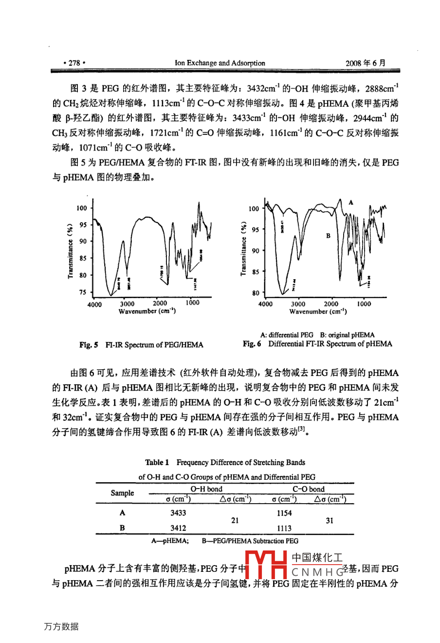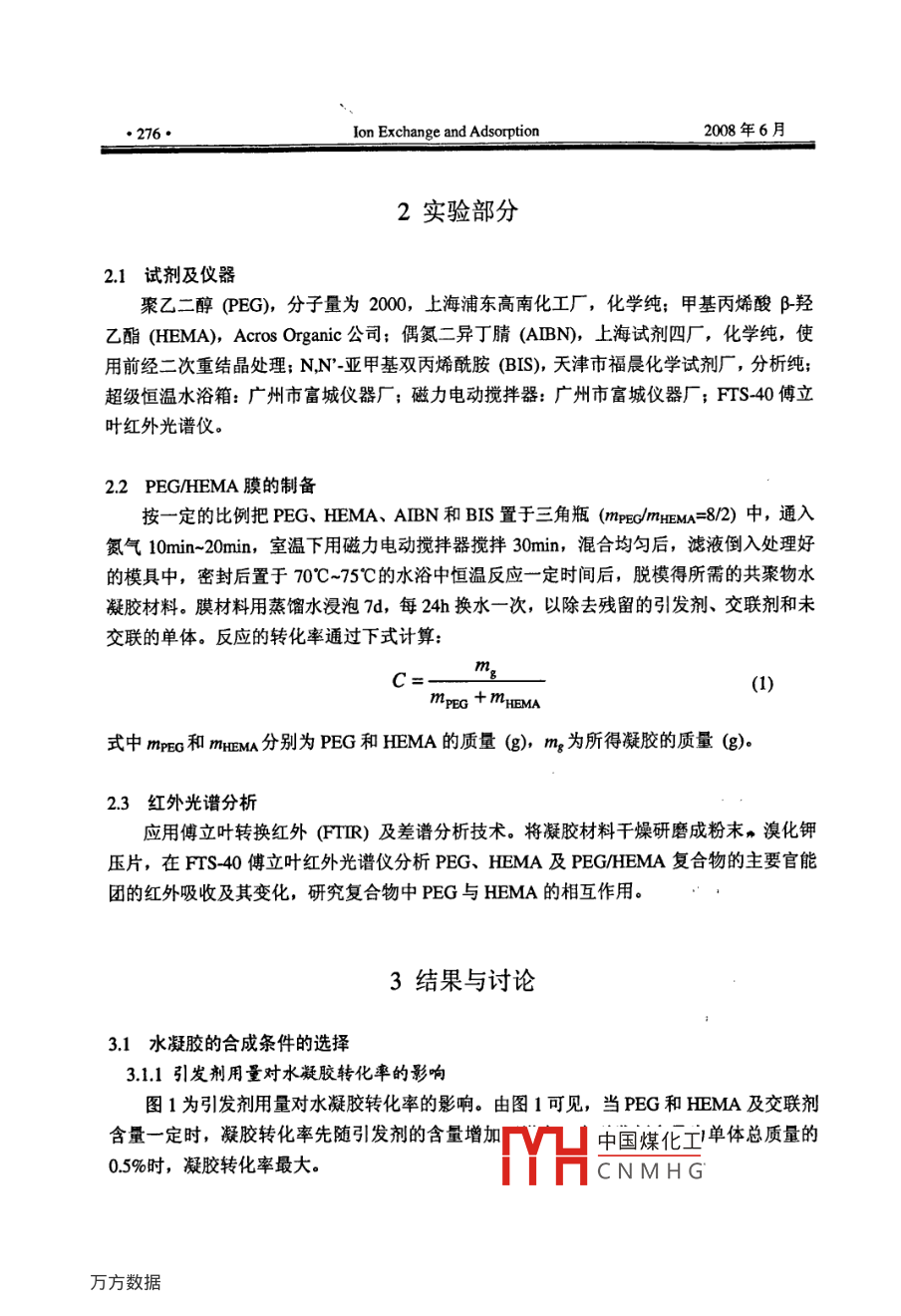 離子交換與吸附, 2008, 24(3): 275 ~ 279ION EXCHANGE AND ADSORPTION文章編號: 1001-5493(2008)03-0275-05聚乙二醇/甲基丙烯酸β羥乙酯水凝膠的合成及其表征王迎軍1譚幗馨1,2張姝江1關(guān)燕霞21華南理工大學(xué)材料學(xué)院生物材料研究所,廣州5106412廣東工業(yè)大學(xué)輕工化工學(xué)院,廣州510006摘要:以偶氮二異丁腈(AIBN) 為引發(fā)劑,N,N"-亞 甲基雙丙烯酰胺(BIS) 為交聯(lián)劑,采用自由基聚合法合成了聚乙二醇(PEG)/甲 基丙烯酸B_羥乙酯(HEMA)水凝膠.應(yīng)用傅立葉轉(zhuǎn)換紅外光譜(FT-IR)研究了水凝膠分子間的相互作用,結(jié)果表明PEG和HEMA間存在較強(qiáng)的分子間氫鍵.關(guān)鍵詞:水凝膠; PEG; HEMA;氫鍵中圖分類號: TQ317.3文獻(xiàn)標(biāo)識碼: A1引.言水凝膠是在水中溶脹并保持大量水分而又不溶解的聚合物,由于網(wǎng)絡(luò)中充斥有大量的水分,使得材料具備了-一種流體的性質(zhì),與充盈有大量水性液體的機(jī)體組織極其相似。利用這一特點(diǎn), 以水凝膠負(fù)載軟骨細(xì)胞通過關(guān)節(jié)鏡注入軟骨缺損區(qū),可以最大限度地減少創(chuàng)傷,符合現(xiàn)代微創(chuàng)手術(shù)的要求,且不受軟骨缺損形狀、大小和深度的限制;與預(yù)制成形的多孔支架相比,軟骨細(xì)胞和基質(zhì)在水凝膠中分布更為均勻,不受材料厚度的影響,凝膠化后可以減少細(xì)胞從多孔支架的溢出。聚乙二醇(PEG) 具有高親水性和生物相容性,具有抑制蛋白質(zhì)吸附和細(xì)胞黏連的性能,在PEG基材上不會發(fā)生生物相互作用,當(dāng)PEG凝膠用于組織工程材料時,細(xì)胞可懸浮在聚合物水溶液中,光聚合細(xì)胞均勻分散在水凝膠支架內(nèi),此類光聚合可離體或原位進(jìn)行。PEG已被FDA批準(zhǔn)可用于人體"。因此, PEG水凝膠材料有望用于生物功能的基材。Dong-anWang等[合成了新型的可生物降解的PhosPEG-dMA水凝膠,證明丙烯?;腜EG衍生物對細(xì)胞和組織無毒副作用,可在軟骨修復(fù)方面具有良好的應(yīng)用前景。●收稿日期: 200年5月14日 聯(lián)系電話: 020826159,中國煤化工項(xiàng)目基金:國家重點(diǎn)基礎(chǔ)研究發(fā)展項(xiàng)目(200SCB623902). 廣東省自然.MYHC N M H C4學(xué)基金團(tuán)隊項(xiàng)目(04205786),國家自然科學(xué)基金項(xiàng)目(50502015)作者簡介:王迎軍(1954-),女河北人教授,博土. Email: imwangyj@scutedu.cn●276●Ion Exchange and Adsorption2008年6月2實(shí)驗(yàn)部分2.1試劑及儀器聚乙二醇(PEG),分子量為2000,上海浦東高南化工廠,化學(xué)純;甲基丙烯酸β_羥乙酯(HEMA), Acros Organic公司;偶氮二異丁腈(AIBN),上海試劑四廠, 化學(xué)純,使用前經(jīng)二次重結(jié)晶處理; N,N"-亞甲基雙丙烯酰胺(BIS), 天津市福晨化學(xué)試劑廠,分析純;超級恒溫水浴箱:廣州市富城儀器廠:磁力電動攪拌器:廣州市富城儀器廠; FTS-40 傅立葉紅外光譜儀。2.2 PEG/HEMA 膜的制備按一定的比例把PEG、HEMA、AIBN和BIS置于三角瓶(mpec/mHEM=8/2) 中,通入氮?dú)?0min~20min,室溫下用磁力電動攪拌器攪拌30min,混合均勻后,濾液倒入處理好的模具中,密封后置于70"C~75C的水浴中恒溫反應(yīng)一定時間后, 脫模得所需的共聚物水凝膠材料。膜材料用蒸餾水浸泡7d,每24h換水一次,以除去殘留的引發(fā)劑、交聯(lián)劑和未交聯(lián)的單體。反應(yīng)的轉(zhuǎn)化率通過下式計算:mg(1)mpec + mHEMA式中mpEc和mHEMA分別為PEG和HEMA的質(zhì)量(g), mg 為所得凝膠的質(zhì)量(g)●2.3紅外光譜分析應(yīng)用傅立葉轉(zhuǎn)換紅外(FTIR)及差譜分析技術(shù)。將凝膠材料千燥研磨成粉末,溴化鉀壓片,在FTS-40傅立葉紅外光譜儀分析PEG、HEMA及PEG/HEMA復(fù)合物的主要官能團(tuán)的紅外吸收及其變化,研究復(fù)合物中PEG與HEMA的相互作用。3結(jié)果與討論3.1水凝膠的合 成條件的選擇3.1.1引發(fā)劑用量對水凝膠轉(zhuǎn)化率的影響圖1為引發(fā)劑用量對水凝膠轉(zhuǎn)化率的影響。由圖1可見,當(dāng)PEG和HEMA及交聯(lián)劑含量一定時,凝膠轉(zhuǎn)化率先隨引發(fā)劑的含量增加中國煤化工單體總質(zhì)量的0.5%時,凝膠轉(zhuǎn)化率最大. .*YHCNMHG'第24卷第3期離子交換與吸附●277●0.95 10.95 .0.9. 0.85 tM 0.85#0.80.8.0.750.75-00.0.8 T0.70.51152 2.5AIBN (%)BIS (%)Fig. 1 Influence of AIBN PercentageFig. 2 Influence of BIS Percentageon Conversion of the Hydrogels3.1.2交聯(lián)劑用 量對水凝膠轉(zhuǎn)化率的影響為了使線性分子HEMA交聯(lián),在反應(yīng)體系中加入雙官能團(tuán)單體NN'-亞甲基雙丙烯酰胺,考察交聯(lián)劑用量對凝膠轉(zhuǎn)化率的影響。由圖2可見,當(dāng)PEG與HEMA比例、引發(fā)劑用量、反應(yīng)時間- -定時,凝膠轉(zhuǎn)化率隨交聯(lián)劑的含量增大而增大。當(dāng)交聯(lián)劑用量大于1.5%時,凝膠轉(zhuǎn)化率基本不隨交聯(lián)劑的增加而變化。但用量大于單體總質(zhì)量的2.0%時,凝膠力學(xué)強(qiáng)度大大降低,脆性增加,不符合軟骨修復(fù)水凝膠材料的力學(xué)要求。3.2紅外譜圖表征結(jié)果為了揭示PEG和HEMA分子間相互作用的形成機(jī)制,通過FT-IR分析了PEG、HEMA和PEG/HEMA復(fù)合物的主要官能團(tuán)的紅外吸收。100100 tN色9530 t90M.1so tVI10 t/氫80304000300020001000 5001000Wavenumber (cm')中國煤化工Fig.3 FT-IR Spectrum of PEGMHCNMHGHEMA●278●lon Exchange and Adsorption2008年6月圖3是PEG的紅外譜圖,其主要特征峰為: 3432cm' 的-OH伸縮振動峰,2888cm:'的CH2烷烴對稱伸縮峰,113cm' 的