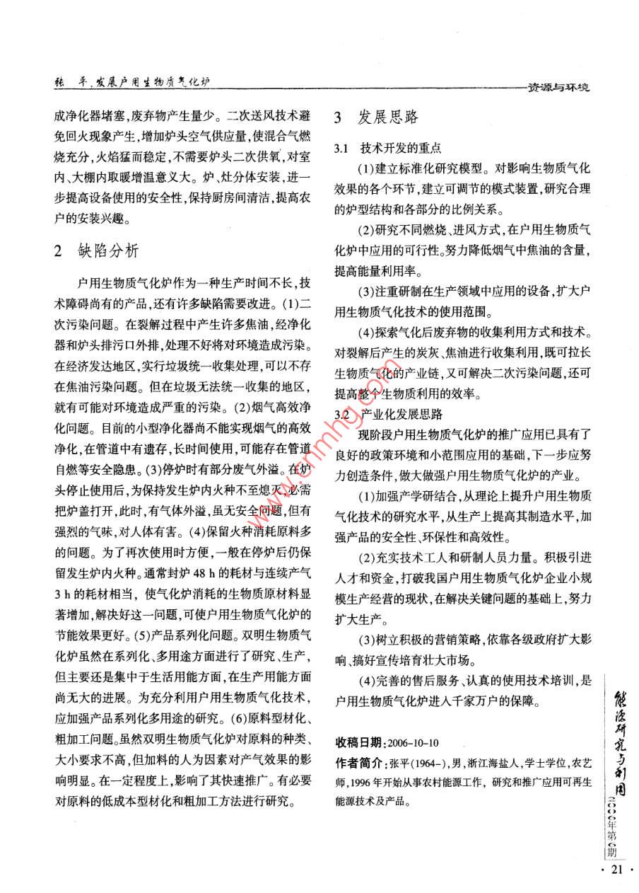 資源與環(huán)境發(fā)展戶用生物質(zhì)氣化爐張平(浙江省海鹽縣農(nóng)村能源工作站,浙江海鹽314300)摘要:討論了戶用生物質(zhì)氣化爐的爐體、爐膛、氣體回流裝置及凈化器的結(jié)構(gòu)設(shè)計和技術(shù)特點,分析了推廣使用存在的問題,并提出了戶用生物質(zhì)氣化爐的產(chǎn)業(yè)化發(fā)展思路。關(guān)鍵詞:生物質(zhì)氣化爐;可再生能源;農(nóng)村能源Abstract :The paper discussed the structure design of household biomass gasifier and analyzedthe technical charactrstics of gasifier body , gasifer chamber,gas purifier and gas circumfuence e-quipment.In the meantime ,it showed the present problems during daily popularization and put for-ward useful development strategy to industrialize household biomass gasifiersl.Key words:biomass gasifier;renewable energy ;rural energy中圖分類號:TK6文獻標識碼:B文章編號: 1001- 5523(2006)06- -0020 -02在《中共中央國務(wù)院關(guān)于推進社會主義新農(nóng)村加滿原料可連續(xù)產(chǎn)氣3h,滿足一般農(nóng)戶- -天的生建設(shè)的若干意見》中,明確提出“要大力開發(fā)節(jié)約資活用能需求的特點。設(shè)備操作簡單,只需稍加培訓,源和保護環(huán)境的農(nóng)業(yè)技術(shù),重點推廣廢棄物綜合利即可使用自如。用技術(shù)、相關(guān)產(chǎn)業(yè)鏈接技術(shù)和可再生能源開發(fā)利用生物質(zhì)氣化爐的發(fā)生爐爐體采用雙層結(jié)構(gòu),避技術(shù)。制定相應(yīng)的財稅鼓勵政策,組織實施生物質(zhì)免了爐膛使用隔熱材料而降低使用壽命的缺陷,減工程,推廣秸稈氣化、固化成型、發(fā)電、養(yǎng)畜等技術(shù),輕了設(shè)備重量。爐膛中心供氧和中心高溫燃燒技開發(fā)生物質(zhì)能源和生物質(zhì)基材料,培育生物質(zhì)產(chǎn)術(shù),保證了熱裂解在爐膛中心區(qū)域發(fā)生,既提高了業(yè)”。原料氣化率,又保護內(nèi)膽不至高溫而降低使用壽命我國是一個農(nóng)業(yè)大國,每年產(chǎn)生農(nóng)作物秸稈(預(yù)計使用壽命可達15年)。采用風冷或水冷加風8.7億t,其中2.8億t用于能源消費,占農(nóng)村能源消冷或水冷技術(shù),進一步降低內(nèi)外殼的溫度,使外殼費總量的70%。大量秸稈的廢棄和焚燒現(xiàn)象已持續(xù)始終處于低溫(一般不高于45 C)的狀態(tài)。其氣體回能多年。合理有效地利用這些資源,是- -件利國利民、流保護裝置,解決了爐頭?;鸷?因爐內(nèi)短時間內(nèi)研具很大社會、經(jīng)濟、生態(tài)效益的大事。戶用型生物質(zhì)繼續(xù)產(chǎn)氣,產(chǎn)生高壓放炮損壞設(shè)備的問題。其爐膛究氣化爐的推出,使大面積使用可再生能源技術(shù)成為氣道的設(shè)置,截留了煙氣中大部分的灰分,減輕了可能,具有良好的市場前景。凈化器、管道因灰分造成堵塞的壓力,延長其清潔1生物質(zhì)氣化爐技術(shù)特點周期。其爐膛無爐柵設(shè)計,使氣化爐對原料的種類和大小無特殊要求,所有塊狀或粉狀的裂解剩余物戶用生物質(zhì)氣化爐具有氣化率達70%、常壓產(chǎn)都可自動降落至爐底,出爐灰方便,減輕農(nóng)戶對原刷氣、隨產(chǎn)隨用、無貯氣裝置、爐體結(jié)構(gòu)合理、外殼無料預(yù)處理的工作量,增加推廣的容易性。干式凈化20●高溫、產(chǎn)氣穩(wěn)定、燃燒時無煙無味、火焰穩(wěn)定、- - 次器設(shè)計,對煙氣中焦油的去除效果較好,且不易造張平,發(fā)展戶用生物質(zhì)氣化爐-資源與環(huán)境成凈化器堵塞,廢棄物產(chǎn)生量少。二次送風技術(shù)避3發(fā)展思路免回火現(xiàn)象產(chǎn)生,增加爐頭空氣供應(yīng)量,使混合氣燃3.1技術(shù)開發(fā)的重點燒充分,火焰猛而穩(wěn)定,不需要爐頭二次供氧,對室內(nèi)、大棚內(nèi)取暖增溫意義大。爐、灶分體安裝,進一(1)建立標準化研究模型。對影響生物質(zhì)氣化步提高設(shè)備使用的安全性,保持廚房間清潔,提高農(nóng)效果的各個環(huán)節(jié),建立可調(diào)節(jié)的模式裝置,研究合理的爐型結(jié)構(gòu)和各部分的比例關(guān)系。戶的安裝興趣。(2)研究不同燃燒、進風方式,在戶用生物質(zhì)氣2缺陷分析化爐中應(yīng)用的可行性。努力降低煙氣中焦油的含量,提高能量利用率。戶用生物質(zhì)氣化爐作為- -種生產(chǎn)時間不長 ,技(3)注重研制在生產(chǎn)領(lǐng)域中應(yīng)用的設(shè)備,擴大戶術(shù)障礙尚有的產(chǎn)品,還有許多缺陷需要改進。(1)二用生物質(zhì)氣化技術(shù)的使用范圍。次污染問題。在裂解過程中產(chǎn)生許多焦油,經(jīng)凈化(4)探索氣化后廢棄物的收集利用方式和技術(shù)。器和爐頭排污口外排處理不好將對環(huán)境造成污染。對裂解后產(chǎn)生的炭灰 焦油進行收集利用,既可拉長在經(jīng)濟發(fā)達地區(qū),實行垃圾統(tǒng)- -收集處理,可以不存生物質(zhì)氣化的產(chǎn)業(yè)鏈,又可解決二次污染問題,還可在焦油污染問題。但在垃圾無法統(tǒng)一收集的地區(qū),提高整個生物質(zhì)利用的效率。就有可能對環(huán)境造成嚴重的污染。(2)煙氣高效凈3.2產(chǎn)業(yè)化發(fā)展思路化問題。目前的小型凈化器尚不能實現(xiàn)煙氣的高效現(xiàn)階段戶用生物質(zhì)氣化爐的推廣應(yīng)用已具有了凈化,在管道中有遺存,長時間使用,可能存在管道良好的政策環(huán)境 和小范圍應(yīng)用的基礎(chǔ),下一一步應(yīng)