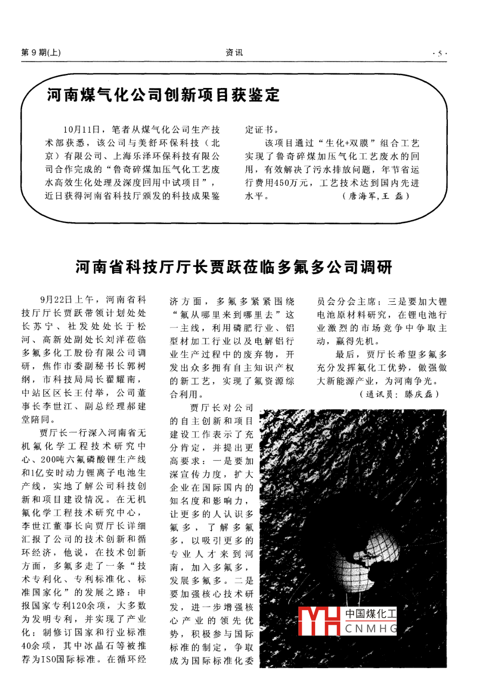 第9期(上)資訊河南煤氣化公司創(chuàng)新項(xiàng)目獲鑒定10月11日,筆者從煤氣化公司生產(chǎn)技定證書。術(shù)部獲悉,該公司與美舒環(huán)??萍?北該項(xiàng)目通過“生化+雙膜”組合工藝京)有限公司、上海樂澤環(huán)??萍加邢薰珜?shí)現(xiàn)了魯奇碎煤加壓氣化工藝廢水的回司合作完成的“魯奇碎煤加壓氣化工藝廢用,有效解決了污水排放問題,年節(jié)省運(yùn)水高效生化處理及深度回用中試項(xiàng)目”,行費(fèi)用450萬元,工藝技術(shù)達(dá)到國內(nèi)先進(jìn)近日獲得河南省科技廳頒發(fā)的科技成果鑒水平。(唐海軍,王磊)河南省科技廳廳長賈躍蒞臨多氟多公司調(diào)研9月22日上午,河南省科濟(jì)方面,多氟多緊緊圍繞員會(huì)分會(huì)主席;三是要加大鋰技廳廳長賈躍帶領(lǐng)計(jì)劃處處‘氟從哪里來到哪里去”這電池原材料研究,在鋰電池行長蘇寧、社發(fā)處處長于松主線,利用磷肥行業(yè)、鋁業(yè)激烈的市場競爭中爭取主河、高新處副處長劉洋蒞臨型材加工行業(yè)以及電解鋁行動(dòng),贏得先機(jī)。多氟多化工股份有限公司調(diào)業(yè)生產(chǎn)過程中的廢棄物,開最后,賈廳長希望多氟多研,焦作市委副秘書長郭樹發(fā)出眾多擁有自主知識(shí)產(chǎn)權(quán)充分發(fā)揮氟化工優(yōu)勢,做強(qiáng)做綱,市科技局局長翟耀南,的新工藝,實(shí)現(xiàn)了氟資源綜大新能源產(chǎn)業(yè),為河南爭光。中站區(qū)區(qū)長王付舉,公司董合利用。(通訊員:滕慶磊)事長李世江、副總經(jīng)理郝建.賈廳長對(duì)公司堂陪同。的自主創(chuàng)新和項(xiàng)目賈廳長一行深入河南省無建設(shè)工作表示了充機(jī)氟化學(xué)工程技術(shù)研究中分肯定,并提出更心、200噸六氟磷酸鋰生產(chǎn)線高要求:一-是要加和1億安時(shí)動(dòng)力鋰離子電池生深宣傳力度,擴(kuò)大產(chǎn)線,實(shí)地了解公司科技創(chuàng)企業(yè)在國際國內(nèi)的新和項(xiàng)目建設(shè)情況。在無機(jī)知名度和影響力,氟化學(xué)工程技術(shù)研究中心,讓更多的人認(rèn)識(shí)多.李世江董事長向賈廳長詳細(xì)氟多,了解多氟匯報(bào)了公司的技術(shù)創(chuàng)新和循多,以吸引更多的環(huán)經(jīng)濟(jì),他說,在技術(shù)創(chuàng)新專業(yè)人才來到河方面,多氟多走了一條“技南,加入多氟多,術(shù)專利化、專利標(biāo)準(zhǔn)化、標(biāo)發(fā)展多氟多。二是準(zhǔn)國家化”的發(fā)展之路:申要加強(qiáng)核心技術(shù)研報(bào)國家專利120余項(xiàng),大多數(shù)發(fā),進(jìn)一步增強(qiáng)核中國煤化工為發(fā)明專利,并實(shí)現(xiàn)了產(chǎn)業(yè)心產(chǎn)業(yè)的領(lǐng)先優(yōu)化:制修訂國家和行業(yè)標(biāo)準(zhǔn)勢,積極參與國際YHCNMHG40余項(xiàng),其中冰晶石等被推標(biāo)準(zhǔn)的制定,爭取薦為IS0國際標(biāo)準(zhǔn)。在循環(huán)經(jīng)成為國際標(biāo)準(zhǔn)化委