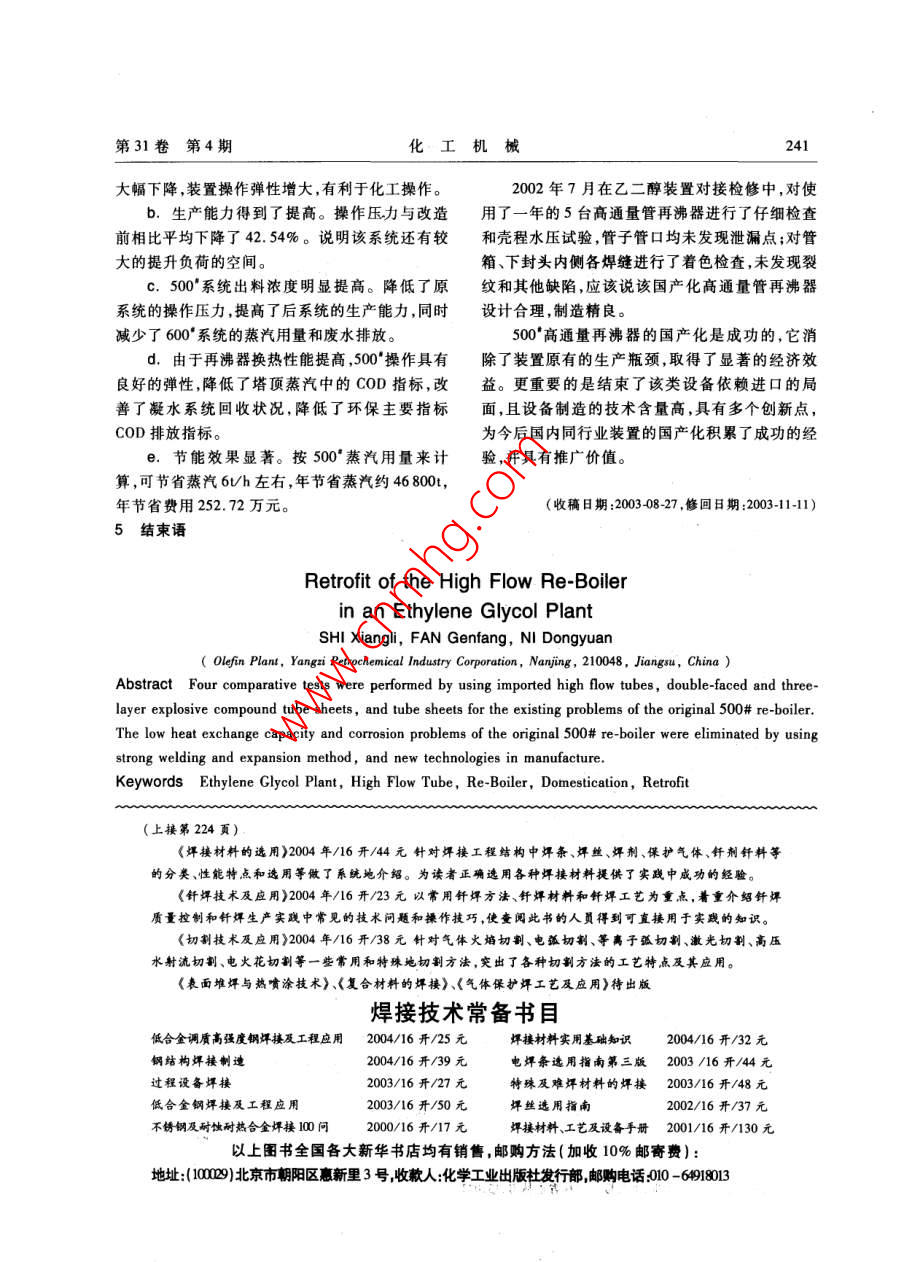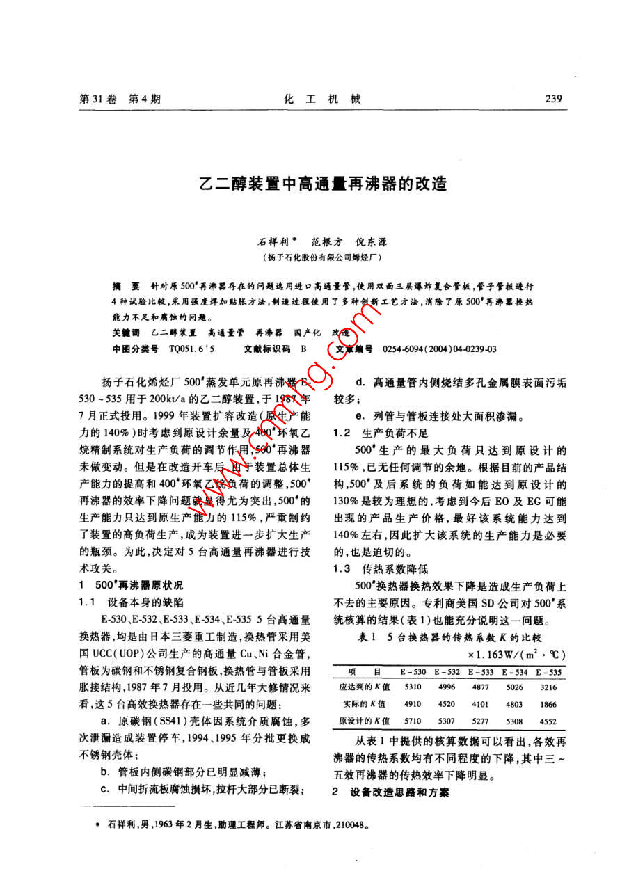 第31卷第4期化工機(jī)乙二醇裝置中高通量再沸器的改造石祥利·范根方倪東源(揚(yáng)子石化股份有限公司烯烴廠)犢要針對原500°再沸器存在的問題選用進(jìn)口高通量管,使用雙面三層爆炸復(fù)合管板,管子管板進(jìn)行4種試驗(yàn)比較,采用強(qiáng)度焊加貼脹方法,制造過程使用了多種創(chuàng)新工藝方法,消除了原500°再沸器換熱能力不足和腐蝕的問題。關(guān)詞乙二醇裝置高通量管再沸器國產(chǎn)化改造中圖分類號(hào)TQ051.65文獻(xiàn)標(biāo)識(shí)碼B文章編號(hào)02546094(2004)04023903揚(yáng)子石化烯烴廠500蒸發(fā)單元原再沸器Ed.高通量管內(nèi)側(cè)燒結(jié)多孔金屬膜表面污垢530~535用于200kta的乙二醇裝置,于1987年較多7月正式投用。1999年裝置擴(kuò)容改造(原生產(chǎn)能.列管與管板連接處大面積滲漏。力的140%)時(shí)考慮到原設(shè)計(jì)余量及400°環(huán)氧乙1.2生產(chǎn)負(fù)荷不足烷精制系統(tǒng)對生產(chǎn)負(fù)荷的調(diào)節(jié)作用,500再沸器500生產(chǎn)的最大負(fù)荷只達(dá)到原設(shè)計(jì)的未做變動(dòng)。但是在改造開車后,由于裝置總體生115%,已無任何調(diào)節(jié)的余地。根據(jù)目前的產(chǎn)品結(jié)產(chǎn)能力的提高和400環(huán)氧乙烷負(fù)荷的調(diào)整,500構(gòu)500°及后系統(tǒng)的負(fù)荷如能達(dá)到原設(shè)計(jì)再沸器的效率下降問題就顯得尤為突出,500°的130%是較為理想的,考慮到今后EO及EG可能生產(chǎn)能力只達(dá)到原生產(chǎn)能力的115%,嚴(yán)重制約出現(xiàn)的產(chǎn)品生產(chǎn)價(jià)格,最好該系統(tǒng)能力達(dá)到了裝置的高負(fù)荷生產(chǎn),成為裝置進(jìn)一步擴(kuò)大生產(chǎn)140%左右,因此擴(kuò)大該系統(tǒng)的生產(chǎn)能力是必要的瓶頸。為此,決定對5臺(tái)高通量再沸器進(jìn)行技的,也是迫切的術(shù)攻關(guān)。1.3傳熱系數(shù)降低1500再沸器原狀況500換熱器換熱效果下降是造成生產(chǎn)負(fù)荷上1.1設(shè)備本身的缺陷不去的主要原因。專利商美國SD公司對500°系E530、E532、E533、E534、E5355臺(tái)高通量統(tǒng)核算的結(jié)果(表1)也能充分說明這一問題。換熱器,均是由日本三菱重工制造,換熱管采用美表15臺(tái)換熱器的傳熱系數(shù)K的比較國UCC(UOP)公司生產(chǎn)的高通量Cu、N合金管,1.163W/(m2·℃)管板為碳鋼和不銹鋼復(fù)合鋼板換熱管與管板采用項(xiàng)目E-530E-532E-533E-534E-535脹接結(jié)構(gòu),1987年7月投用。從近幾年大修情況來應(yīng)達(dá)到的K值531049948750263216看,這5臺(tái)高效換熱器存在一些共同的問題:實(shí)際的K值49104520410148031866a.原碳鋼(Ss41)殼體因系統(tǒng)介質(zhì)腐蝕,多原設(shè)計(jì)的K值57105307527753084552次泄漏造成裝置停車,1994、1995年分批更換成從表1中提供的核算數(shù)據(jù)可以看出,各效再不銹鋼殼體;沸器的傳熱系數(shù)均有不同程度的下降,其中三b.管板內(nèi)側(cè)碳鋼部分已明顯減薄五效再沸器的傳熱效率下降明顯。C.中間折流板腐蝕損壞拉桿大部分已斷裂;2設(shè)備改造思路和方案石祥利,男,1963年2月生,助理工程師。江蘇省南京市,210048。240化工機(jī)械2004年經(jīng)研究,制定改造各效再沸器的思路和方案:直度和公差,管孔內(nèi)壁的粗糙度達(dá)到32um。加a.由中國寰球工程公司按140%原生產(chǎn)能工管板孔坡口時(shí),制作了專用限位器,管板孔用通力對50°的再沸器進(jìn)行了核算,證實(shí)換熱器的能規(guī)和止規(guī)檢查,并測量了管板孔的起橋距,控制管力不足,重新進(jìn)行設(shè)計(jì)??壮叽缯`差在GB1510-89允許范圍。b.通過對國內(nèi)乙二醇裝置調(diào)研及相關(guān)資料e.管子與管板進(jìn)行各種連接形式試驗(yàn),確檢索決定仍采用美國UOP的高通量管(引進(jìn)),定了強(qiáng)度焊加貼脹的工藝,貼脹力由液壓脹管器提高換熱效率,降低阻力??刂?。強(qiáng)度焊采用兩遍氬弧焊焊接,每次氬弧焊c.采用進(jìn)口UOP高通量管,其他由國內(nèi)設(shè)后進(jìn)行氣密試驗(yàn)檢查。脹管采用液壓脹管,在正計(jì)制造,可大大降低設(shè)備制作費(fèi)用。式脹管前進(jìn)行了貼脹試驗(yàn),根據(jù)實(shí)測貼緊力、拉脫d.考慮到原再沸器在使用中的腐蝕情況,試驗(yàn)和解剖分析的情況,選定脹緊力。脹后進(jìn)行同時(shí)考慮銅鎳合金管子管板的結(jié)合可靠性,決定水壓試驗(yàn)。改動(dòng)原日本三菱重工僅單面復(fù)合不銹鋼的管板結(jié)t.制定完整的焊接工藝規(guī)范,進(jìn)行焊接工藝構(gòu)采用殼程側(cè)管板復(fù)合不銹鋼管箱側(cè)復(fù)合蒙乃評(píng)定,焊口全部著色檢查合格。為提高焊接質(zhì)量爾合金基層用16Mn鋼雙面三層爆炸復(fù)合的新和可靠性,對0cl!N9殼體與16Mn管板異種鋼結(jié)構(gòu)。焊接、高通量管與管板復(fù)合層 Monel400異種鋼焊管子與管板連接方式通過對強(qiáng)度脹、脹接,用進(jìn)口焊絲和國產(chǎn)焊絲進(jìn)行了焊接試樣對比,后密封焊、強(qiáng)度焊、強(qiáng)度焊焊后貼脹4種方法,分最后選用進(jìn)口焊絲。別進(jìn)行了試驗(yàn)比較,編制了焊接工藝評(píng)定報(bào)告書g.殼體組對嚴(yán)格控制質(zhì)量,避免強(qiáng)力組對經(jīng)過UOP專家確認(rèn),采用強(qiáng)度焊加貼脹的方法。降低組對應(yīng)力,對所有法蘭面焊環(huán)、法蘭頸襯套及t.殼體管箱與下封頭