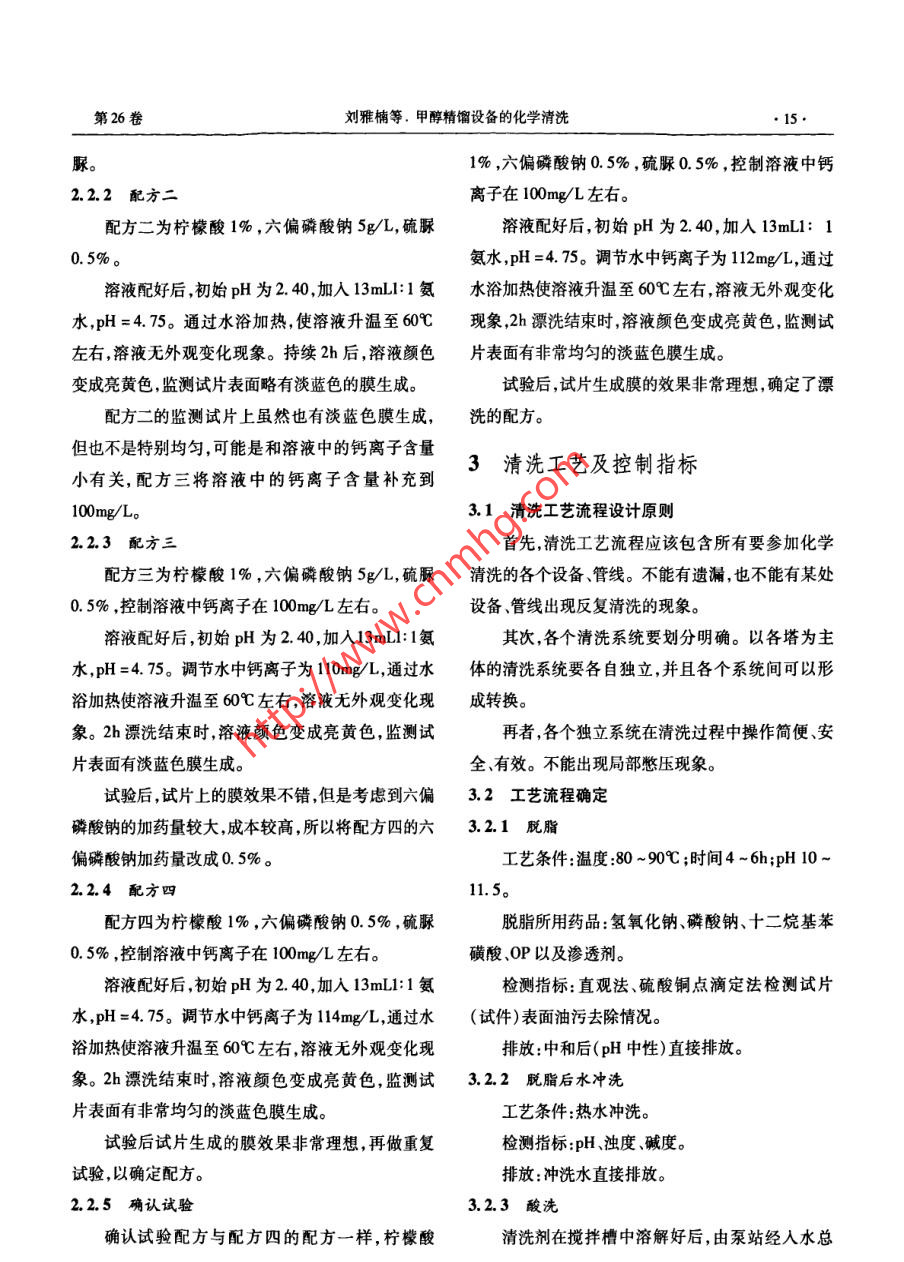 清洗世界第26卷第2期實(shí)用技術(shù)Cleaning World2010年2月文章編號:1671 - 8909(2010)02 -0011 -06甲醇精餾設(shè)備的化學(xué)清洗劉雅楠,張巍,陳麗 杰(大化集團(tuán)有限責(zé)任公司研究院遼寧大連116032)摘要:分析了某化工廠甲醇精餾設(shè)備垢組成研制了相應(yīng)的復(fù)合型緩蝕劑,并設(shè)計(jì)了一種復(fù)配清洗劑和清洗工藝,其碳鋼A3的腐蝕率低于2. 65mm/a。將復(fù)配的清洗劑和相應(yīng)的復(fù)合緩蝕劑應(yīng)用于該設(shè)備的清洗,取得了很好的效果。關(guān)鍵詞:甲醇;精餾設(shè)備;酸洗;緩蝕劑;復(fù)合清洗劑;碳鋼中圖分類號:TK172文獻(xiàn)標(biāo)識碼:BChemical cleaning for rectification equipment of methanolLIU Yanan , ZHANG Wei , CHEN Ljie .( Research Institute of Dahua Group Co. ,Ltd. , Dalian , Liaoning, 116032 ,China)Abstract : The composition of scale on recitifcation equipment of methanol on chemical plant was ana-lysed. Cleaning agent, corrosion inhibitor and technical process were designed. The corrosion rate ofthe carbon steel A3 in the cleaning agent with the corrosion inhibitor was less than 2. 65mm/a. Goodeffectiveness was obtained in application to the equipment.Key words: methanol ;etification equipment ;pickling;orrosion inhibitor;composite cleaning agent;carbon steel在甲醇精餾過程中,溫度控制對甲醇的品質(zhì)和等,在加工制造、保存、運(yùn)輸和安裝過程中,其內(nèi)表面收率起著非常重要的作用,每個(gè)塔的換熱設(shè)備工作上均沾有不少污物。這些污物如不及時(shí)清除,會污狀態(tài)決定了各自處在是否適宜的操作溫度下工作。染半成品和成品。輕則影響產(chǎn)品的色澤和濁度;重由于換熱器在加工、制造、保存運(yùn)輸和安裝過程中則,雜質(zhì)中的某些組分同產(chǎn)品發(fā)生化學(xué)反應(yīng),生成其不可避免地在傳熱面上粘有污物,特別是油污和灰它物質(zhì)。如將該成品作為其他產(chǎn)品的原料,將會進(jìn)塵,大大降低了設(shè)備的傳熱效率。因此,必須對換熱-步出現(xiàn)很多工藝上的問題。因此,上述設(shè)備和管器換熱面進(jìn)行化學(xué)清洗,使設(shè)備處在良好的狀態(tài)下線一定要進(jìn)行化學(xué)清洗。運(yùn)行,以保證將分餾塔的溫度控制在最佳范圍內(nèi),從1酸洗緩蝕劑的選擇而確保產(chǎn)品的品質(zhì)和收率。甲醇精餾系統(tǒng)的分離器、閃蒸罐、塔與塔之間的由于接受清洗的設(shè)備在空氣中暴露時(shí)間過長,聯(lián)接管線、換熱器的殼程、回流槽、儲罐及外送管線同時(shí)又位于沿海,致使其金屬表面上形成了比較致收稿日期:2009 -06-11作者簡介:劉雅楠( 1980-) ,男,遼寧大連人,工程師,主要從事水處理研究工作。●12.清冼世界第2期密的銹蝕層。為了更好完成清洗任務(wù),保證設(shè)備的式中,W一酸洗前腐蝕試片 質(zhì)量,g;良好狀態(tài),在清洗前的準(zhǔn)備工作中做了酸洗緩蝕劑、W一-酸洗后腐蝕試片 質(zhì)量,g;漂洗過程中所用緩釋劑的選擇試驗(yàn)。采用化學(xué)清洗T--酸洗總時(shí)間,h;常用無機(jī)酸和有機(jī)酸作為清洗主劑。無機(jī)酸有硫酸F一- -試片總面積,m2。(H2SO,)、鹽酸( HC1)、硝酸(HNO,)等。有機(jī)酸有需要注意的是,根據(jù)HG/T 2387- -2007 ,碳鋼的氨基磺酸(NH2SO,H).乙酸( CH,COOH)、檸檬酸腐蝕率不能大于6g/(m2●h) ,腐蝕量小于72g/m2。(H,CgH,O, . H,.0)等。1.3酸洗主劑選擇1.1試驗(yàn)設(shè)備由于在清洗的設(shè)備中,主要的設(shè)備材質(zhì)有碳鋼、試驗(yàn)設(shè)備由電池?cái)嚢杵?檢測掛片,溫度計(jì),燒銅和不銹鋼,而且以碳鋼為主,同時(shí)由于在清洗系統(tǒng)杯及pH計(jì)組成,見圖1。中有少量閥[ ]的閥芯為銅材質(zhì),因此選擇了銹片(事前經(jīng)過處理過的碳鋼試片,在潮濕環(huán)境中長時(shí)間自然銹蝕) A3(標(biāo)準(zhǔn)碳鋼試片)、不銹鋼H62(銅標(biāo)準(zhǔn)5試片)四種試片為試驗(yàn)用片進(jìn)行同步試驗(yàn),使選擇的酸洗緩蝕劑在酸洗過程中對這些設(shè)備加以保護(hù)。1-電池?cái)嚢杵?2-檢測掛片;3-溫度計(jì);4- 燒杯:5--pH 計(jì)配制質(zhì)量分?jǐn)?shù)為5%的鹽酸、硫酸、硝酸、氨基磺圖1清洗劑選擇試驗(yàn)設(shè)備示 意酸和2%的檸檬酸清洗劑,在室溫下分別放入銹片、1.2腐蝕率計(jì)算A3試片、H62和不銹鋼試片進(jìn)行酸洗溶垢及腐蝕對金屬腐蝕率K計(jì)算公式如下:比試驗(yàn)。每個(gè)溶液取10mL試樣,用1mol/LNaOH溶K=W-w.液滴定酸度。試驗(yàn)結(jié)果見表1-5。表中L,W,K為T.F經(jīng)過分析后選擇的三種緩蝕劑的代號。表15%鹽酸酸洗試驗(yàn)結(jié)果緩蝕劑酸洗始末腐蝕率/(mm.al)酸洗現(xiàn)象鹽酸質(zhì)量分?jǐn)?shù)/%A3H62不銹鋼0.5%L5.2~4.92.091. 351.81溶液中有黑色小顆粒。銹片上的銹約除去90%1. 0%W4.4~4.20.990. 481.48溶液呈淡草綠色,銹片上的銹約除去90%0. 25% K4.9~4.873. 35基本上無變化,銹片上的銹約除去90%注:清洗時(shí)間均為4h,表2 -表4均相同。表25% 硫酸酸洗試驗(yàn)結(jié)果腐蝕率(mm.a')硫酸質(zhì)量分?jǐn)?shù)/%0. 5%L5.3~4.82.36.031.23溶液中有黑色小顆粒。銹片上的銹除去85%4.0-3.70.111.09溶液有紅色顆粒,銹片、A3和H62試片上有氣泡。銹片上的銹約除去85%5.2-4.91.021.06溶液變成紅色。結(jié)束時(shí)不銹鋼試片有油污。銹片上的銹約除去85%第26卷劉雅楠等.甲醇精餾設(shè)備的化學(xué)清洗●13.表35% 硝酸酸洗試驗(yàn)結(jié)果酸洗始末.腐蝕率/(mm●a")緩蝕劑.酸洗液現