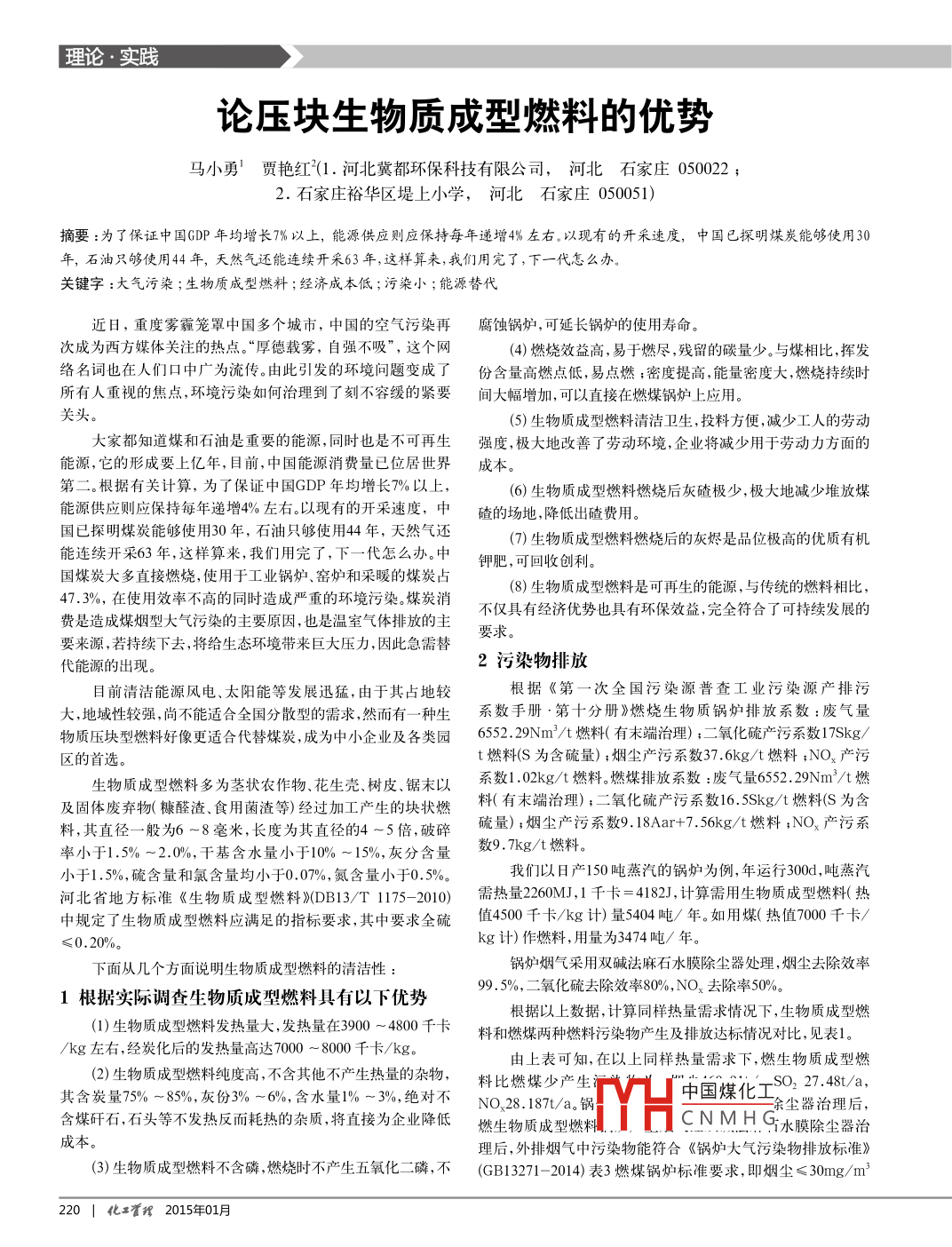 理論·實踐論壓塊生物質(zhì)成型燃料的優(yōu)勢馬小勇賈艷紅(1.河北冀都環(huán)??萍加邢薰?河北石家莊050022;2.石家莊裕華區(qū)堤上小學(xué),河北石家莊050051)摘要:為了保證中國GDβ年均増長γ%以上,能源供應(yīng)則應(yīng)倸持毎年遞増4%左右。以現(xiàn)有的開采速度,中國已探眀煤炭能夠使用30年,石油只夠使用44年,天然氣還能連續(xù)開采63年,這樣算來,我們用完了,下一代怎么辦。關(guān)鍵字:大氣污染;生物質(zhì)成型燃料;經(jīng)濟成本低;污染小;能源替代近日,重度霧霾籠罩中國多個城市,中國的空氣污染再腐蝕鍋爐,可延長鍋爐的使用壽命。次成為西方媒體關(guān)注的熱點。“厚德載霧,自強不吸”,這個網(wǎng)4)燃燒效益高,易于燃盡,殘留的碳量少。與煤相比,揮發(fā)絡(luò)名詞也在人們口中廣為流傳。由此引發(fā)的環(huán)境問題變成了份含量高燃點低,易點燃;密度提高,能量密度大,燃燒持續(xù)時所有人重視的焦點,環(huán)境污染如何治理到了刻不容緩的緊要間大幅增加,可以直接在燃煤鍋爐上應(yīng)用。關(guān)頭。(5)生物質(zhì)成型燃料清潔衛(wèi)生,投料方便,減少工人的勞動大家都知道煤和石油是重要的能源,同時也是不可再生強度,極大地改善了勞動環(huán)境,企業(yè)將減少用于勞動力方面的能源,它的形成要上億年,目前,中國能源消費量已位居世界成本第二。根據(jù)有關(guān)計算,為了保證中國GDP年均增長7%以上(6生物質(zhì)成型燃料燃燒后灰碴極少,極大地減少堆放煤能源供應(yīng)則應(yīng)保持毎年遞增↓%左右。以現(xiàn)有的開采速度,中碴的場地,降低出碴費用。國已探明煤炭能夠使用30年,石油只夠使用44年,天然氣還(⑦)生物質(zhì)成型燃料燃燒后的灰燼是品位極高的優(yōu)質(zhì)有機能連續(xù)開采63年,這樣算來,我們用完了,下一代怎么辦。中鉀肥,可回收創(chuàng)利國煤炭大多直接燃燒,使用于工業(yè)鍋爐、窯爐和采暖的煤炭占47.3%,在使用效率不高的同時造成嚴(yán)重的環(huán)境污染。煤炭消(8)生物質(zhì)成型燃料是可再生的能源,與傳統(tǒng)的燃料相比,不僅具有經(jīng)濟優(yōu)勢也具有環(huán)保效益,完全符合了可持續(xù)發(fā)展的費是造成煤煙型大氣污染的主要原因,也是溫室氣體排放的主要來源,若持續(xù)下去,將給生態(tài)環(huán)境帶來巨大壓力,因此急需替要求代能源的出現(xiàn)2污染物排放目前清潔能源風(fēng)電、太陽能等發(fā)展迅猛,由于其占地較根據(jù)《第一次全國污染源普査工業(yè)污染源產(chǎn)排污大,地域性較強,尚不能適合全國分散型的需求然而有一種生系數(shù)手冊·第十分冊》燃燒生物質(zhì)鍋爐排放系數(shù):廢氣量物質(zhì)壓塊型燃料好像更適合代替煤炭,成為中小企業(yè)及各類園655.29Nm3/t燃料(有末端治理);二氧化硫產(chǎn)污系數(shù)17Skg/區(qū)的首選。t燃料S為含硫量);煙塵產(chǎn)污系數(shù)37.6kg/t燃料;NO3產(chǎn)污生物質(zhì)成型燃料多為莖狀農(nóng)作物、花生殼樹皮、鋸末以系數(shù)1.02kg/t燃料燃煤排放系數(shù)廢氣量655.29Nm/t燃及固體廢棄物(糠醛渣食用菌渣等)經(jīng)過加工產(chǎn)生的塊狀燃料(有末端治理);二氧化硫產(chǎn)污系數(shù)16.5g/t燃料(S為含料,其直徑一般為6-8毫米,長度為其直徑的4-5倍,破碎硫量);煙塵產(chǎn)污系數(shù)9.8Aar+7.56kg/t燃料;NO3產(chǎn)污系率小于1.5%-2.0%,干基含水量小于10%-15%,灰分含量數(shù)9.7kg/t燃料。小于1.5%,硫含量和氯含量均小于0.07%,氮含量小于0.5%我們以日產(chǎn)150噸蒸汽的鍋爐為例,年運行300d,噸蒸汽河北省地方標(biāo)準(zhǔn)《生物質(zhì)成型燃料》DB13/T1175-2010)需熱量2260MJ,1千卡=4182J,計算需用生物質(zhì)成型燃料(熱中規(guī)定了生物質(zhì)成型燃料應(yīng)滿足的指標(biāo)要求,其中要求全硫值4500千卡/kg計量5404噸/年。如用煤(熱值7000千卡/kg計)作燃料,用量為3474噸/年。下面從幾個方面說明生物質(zhì)成型燃料的清潔性:鍋爐煙氣采用雙堿法麻石水膜除塵器處理,煙塵去除效ξ1根據(jù)實際調(diào)查生物質(zhì)成型燃料具有以下優(yōu)勢99.5%,二氧化硫去除效率80%,NO3去除率50%。根據(jù)以上數(shù)據(jù),計算同樣熱量需求情況下,生物質(zhì)成型燃(1)生物質(zhì)成型燃料發(fā)熱量大,發(fā)熱量在3900~4800千卡料和燃煤兩種燃料污染物產(chǎn)生及排放達(dá)標(biāo)情況對比,見表/kg左右,經(jīng)炭化后的發(fā)熱量高達(dá)7000~8000千卡/kg由上表可知,在以上同樣熱量需求下,燃生物質(zhì)成型燃(2)生物質(zhì)成型燃料純度高,不含其他不產(chǎn)生熱量的雜物,料比燃煤少產(chǎn)生其含炭量75%-85%,灰份3%-6%,含水量1%-3%,絕對不NO28.187/a。鍋中國煤化工502741余塵器治理后,含煤矸石,石頭等不發(fā)熱反而耗熱的雜質(zhì),將直接為企業(yè)降低燃生物質(zhì)成型燃CNMHGi水膜除塵器治成本。理后,外排煙氣中污染物能符合《鍋爐大氣污染物排放標(biāo)準(zhǔn)》(3)生物質(zhì)成型燃料不含磷,燃燒時不產(chǎn)生五氧化二磷,不(GB13271-2014)表3燃煤鍋爐標(biāo)準(zhǔn)要求,即煙塵≤30mg/m3220|化x霍#2015年01月表1不同燃料的污染物產(chǎn)生及排放情況對比表煙氣量產(chǎn)生量排放量去除率煙塵5738mg/m3203.19t/a29mg/m1.0l6t/a99.5%燃生物質(zhì)鍋爐35.415×106(年產(chǎn)蒸汽45000t)519mg/m318.377t/a(S取0.2104mg/m3.675t/a15930mg/m' 664 1t/a(SAarlk20)80mg/m2'32t/a燃