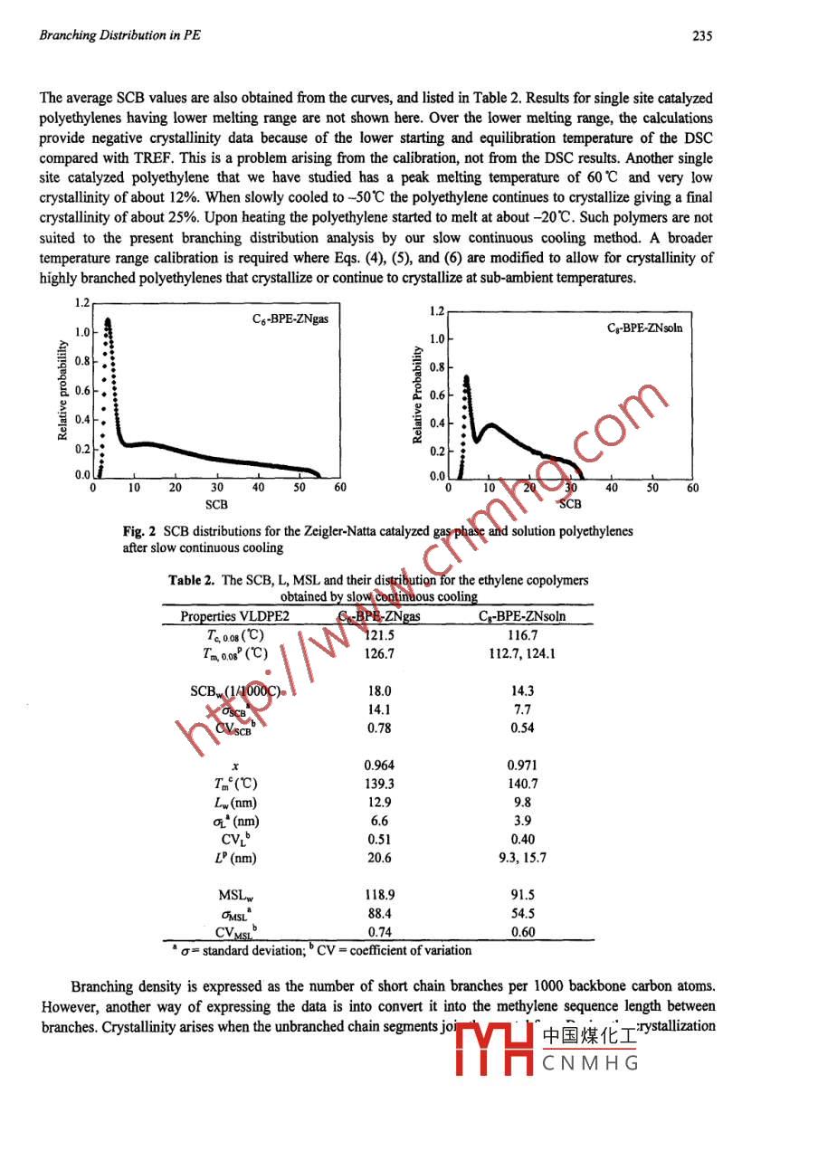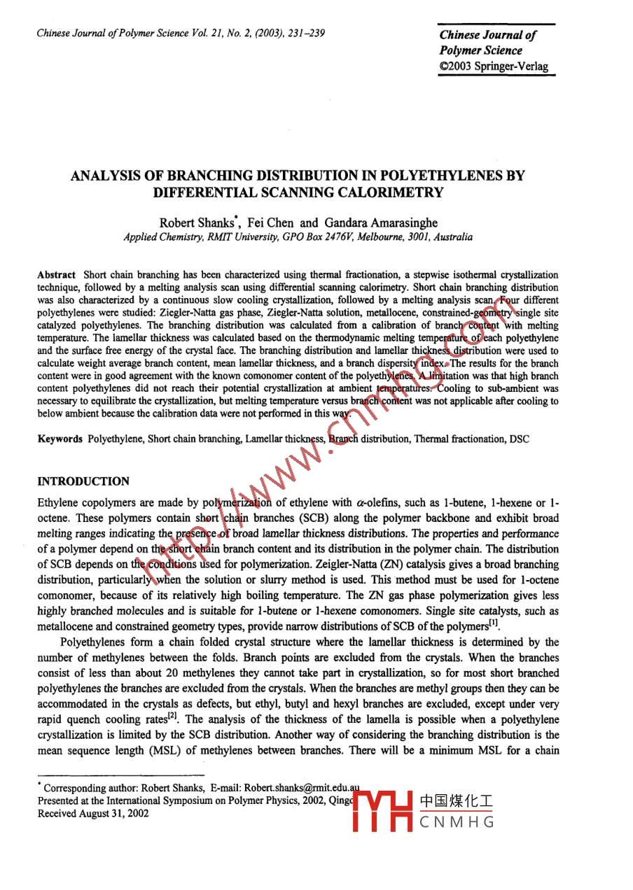 Chinese Journal of Polymer Science Vol. 21, No. 2, (2003), 231-239Chinese Journal ofPolymer Science92003 Springer-VerlagANALYSIS OF BRANCHING DISTRIBUTION IN POLYETHYLENES BYDIFFERENTIAL SCANNING CALORIMETRYRobert Shanks', Fei Chen and Gandara AmarasingheApplied Chemistry, RMIT University, GPO Box 2476V, Melbourne, 3001, AustraliaAbstract Short chain branching has been characterized using thermal fractionation, a stepwise isothermal crystallizationtechnique, followed by a melting analysis scan using differential scanning calorimetry. Short chain branching distributionwas also characterized by a continuous slow cooling crystallization, followed by a melting analysis scan. Four differentpolyethylenes were studied: Zicgler-Natta gas phase, Ziegler-Natta solution, metallocene, constrained-geometry single sitecatalyzed polyethylenes. The branching distribution was calculated from a calibration of branch content with meltingtemperature. The lamellar thickness was calculated based on the thermodynamic melting temperature of each polyethyleneand the surface free energy of the crystal face. The branching distribution and lamellar thickness distribution were used tocalculate weight average branch content, mean lamellar thickness, and a branch dispersity index. The results for the branchcontent were in good agreement with the known comonomer content of the polyethylenes. A limitation was that high branchcontent polyethylenes did not reach their potential crystallization at ambient temperatures. Cooling to sub-ambient wasnecessary to equilibrate the crystallization, but melting temperature versus branch content was not applicable after cooling tobelow ambient because the calibration data were not performed in this way.Keywords Polyethylene, Short chain branching, Lamellar thickness, Branch distribution, Thermal fractionation, DSCINTRODUCTIONEthylene copolymers are made by polymerization of ethylene with a-olefins, such as 1-butene, 1-hexene or 1-octene. These polymers contain short chain branches (SCB) along the polymer backbone and exhibit broadmelting ranges indicating the presence of broad lamellar thickness distributions. The properties and performanceof a polymer depend on the short chain branch content and its distribution in the polymer chain. The distributionof SCB depends on the conditions used for polymerization. Zeigler-Natta (ZN) catalysis gives a broad branchingdistribution, particularly when the solution or slurry method is used. This method must be used for 1-octenecomonomer, because of its relatively high boiling temperature. The ZN gas phase polymerization gives lesshighly branched molecules and is suitable for 1-butene or 1-hexene comonomers. Single site catalysts, such asmetallocene and constrained geometry types, provide narrow distributions of SCB of the polymerslPolyethylenes form a chain folded crystal structure where the lamellar thickness is determined by thenumber of methylenes between the folds. Branch points are excluded from the crystals. When the branchesconsist of less than about 20 methylenes they cannot take part in crystallization, so for most short branchedpolyethylenes the branches are excluded from the crystals. When the branches are methyl groups then they can beaccommodated in the crystals as defects, but ethyl, butyl and hexyl branches are excluded, except under veryrapid quench cooling rates4. The analysis of the thickness of the lamella is possible when a polyethylenecrytallization is limited by the SCB distribution. Another way of considering the branching distribution is themean sequence length MSL) of methylenes between branches. There will be a minimum MSL for a chain'Corresponding author: Robert Shanks, E-mail: Robert.shanks@rmit.edu.aPresented at the Intermational Symposium on Polymer Plhysics, 2002, Qing中國煤化工Received August 31, 2002YHCNMHG232R Shanks et al.segment to join a particular lamella.The widely used method to analyze short chain branch distibution of ethylene copolymers is temperaturerising elution fractionation (TREF)P. Since TREF requires long fractionation times with solvent, an altermativefaster and more definitive method is preferred. Thermal fractionation (TF) (segregation) as an alternative tool forqualitative SCB distribution analysis of ethylene copolymers has recently been reported4. Thermal fractionationcan segregate molecules with intramolecular branch distributionsl. 5, whereas TREF can only separateintermolecular branch distributions. TF provides a visual way of studying the branch distribution, whereas foranalysis of the distribution it is not necessary to have segregated fractions. In the present research, a simplifednew method, very slow continuous cooling, that can be used as an altermative for comonomer distributionanalysis with enough accuracy and minimum time using differential scanning calorimetry (DSC) is proposed. Inaddition, this method can be used as an alternative method to obtain lamellar thickness distribution for somebranched polyethylenes. Another DSC method for segregation of the crystals of a polymer is successive self-nucleation/annealinglo. Other experimental methods, which have been used to determine the lamellar thicknessdistribution, are transmission electron microscopy", small angle X-ray sattering and atomic force microscopy'8.DSC has previously been used to measure lamellar thickness distributions using the Thomson-Gibbsequation9. A constraint is that the polyethylene crystals must not rearrange during the DSC scan. In thisresearch, the polyethylene has been cooled very slowly to ensure that the formed crystals are stable. Anotherlimitation is that copolymers cannot reach the equilibrium melting temperature. They are restricted by the molefraction of branches in addition to the need to use realistic crystallization temperatures. The thermodynamicmelting temperature of the ethylene copolymers is the quantity applicable to copolymers that is used in themethod presented.Polyethylenes show both a